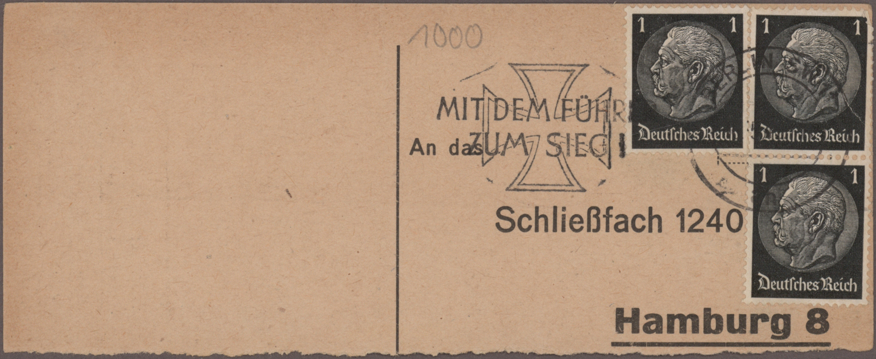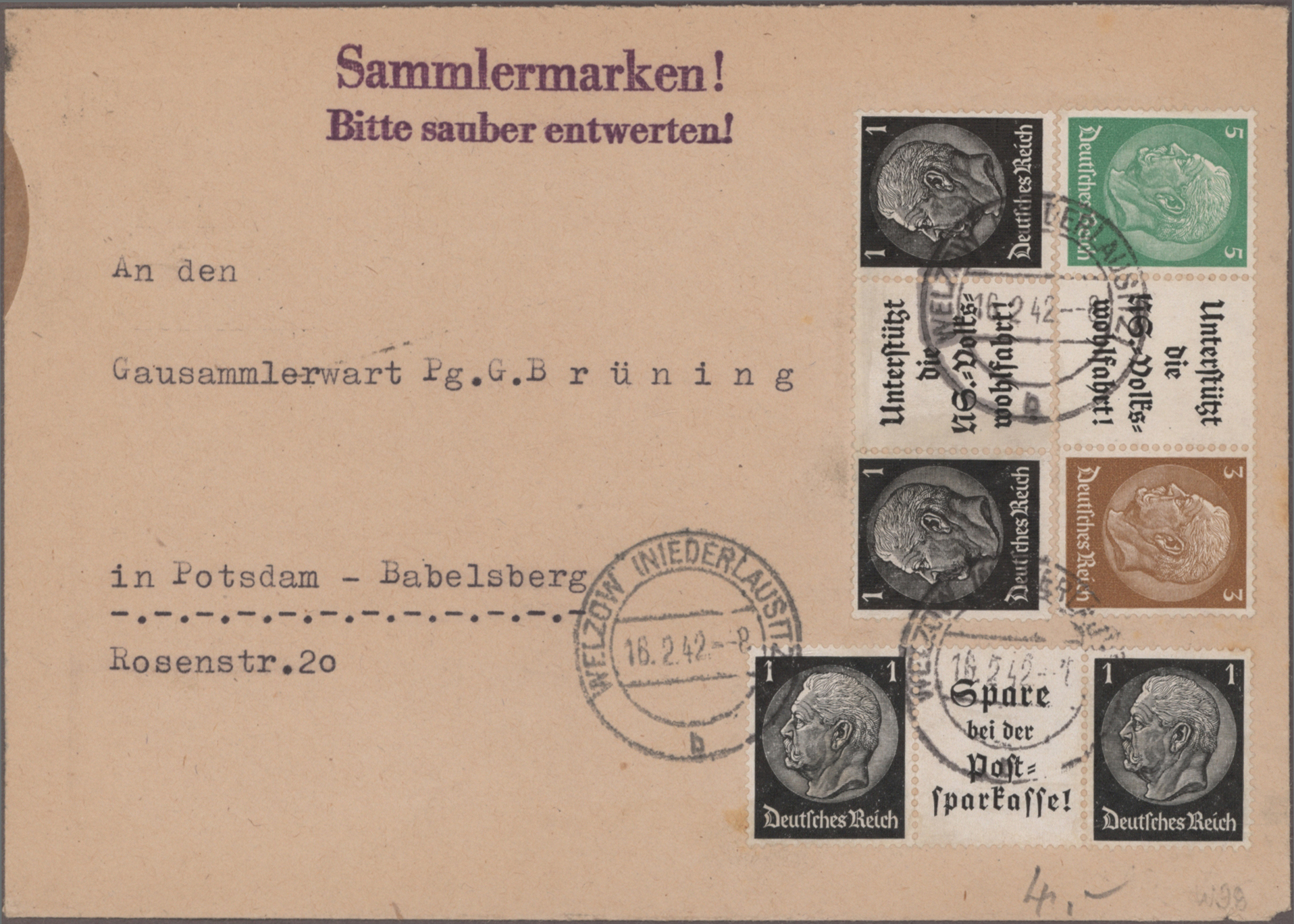 1942/1943, LIEBESGABEN-KARTENABSCHNITTE (mit abgetrenntem Coupon), Bestand von ca. 2.150 Stück mit Frankaturen Hindenburg und Hitler sowie etwas