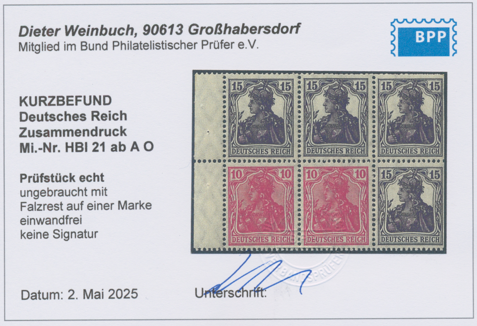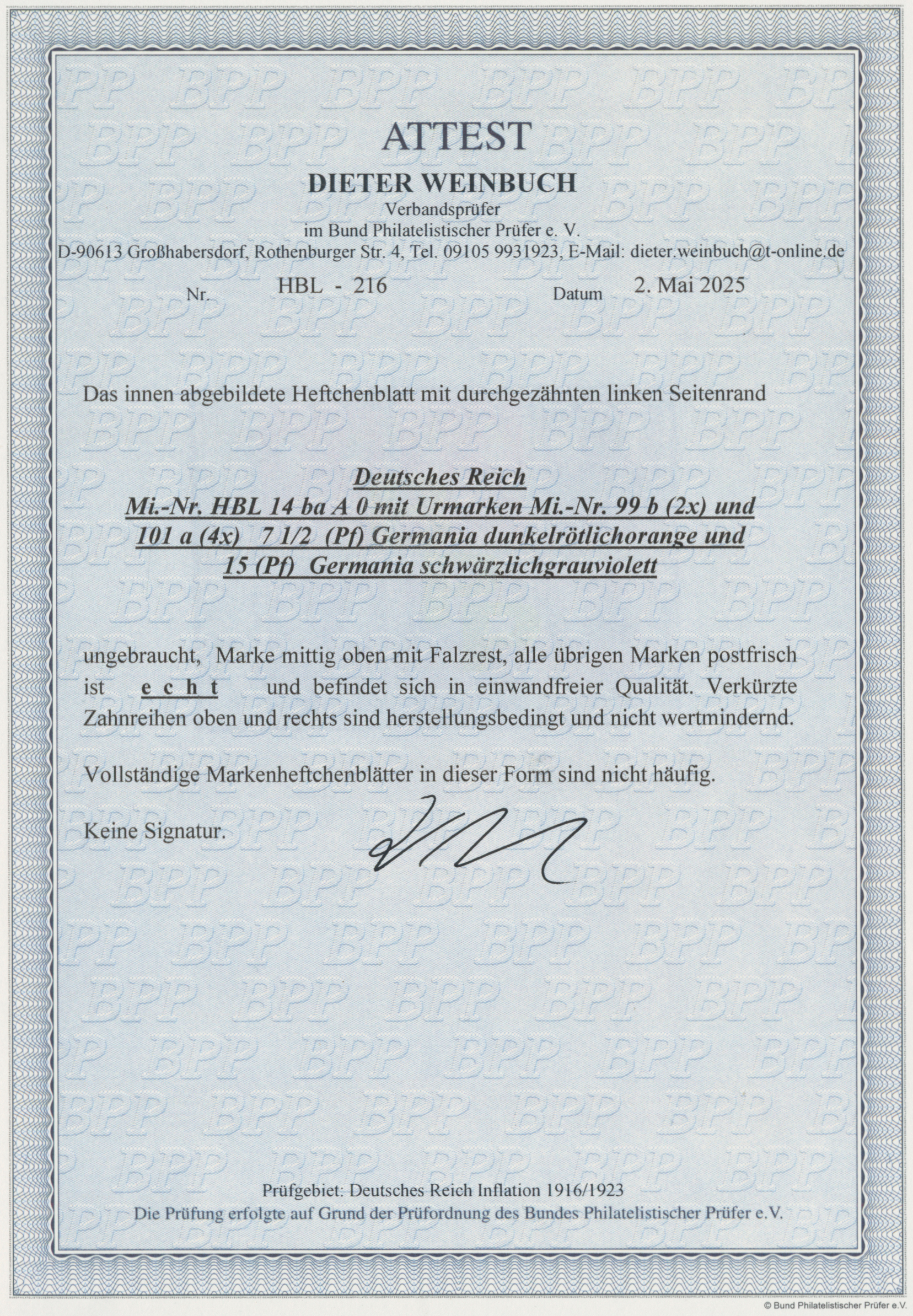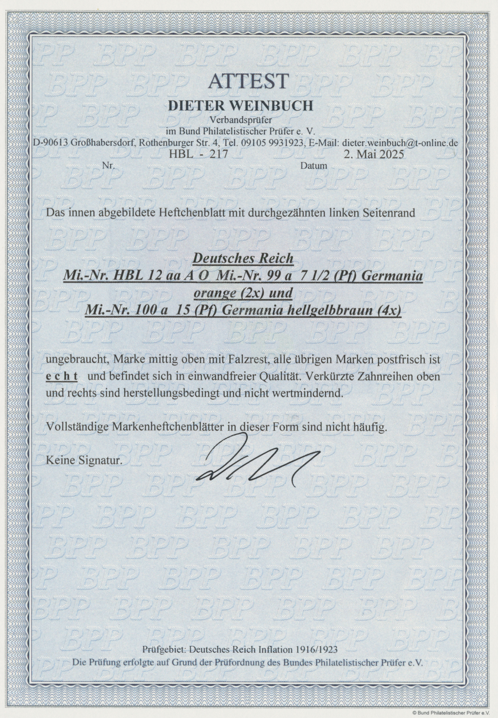 1916/19, Lot mit Germania-Heftchenblatt 12 aa A, 14 ba A, 21 aa A, 21 ab A (alle ungebraucht mit Attest bzw. Befund) sowie 21 ab A in