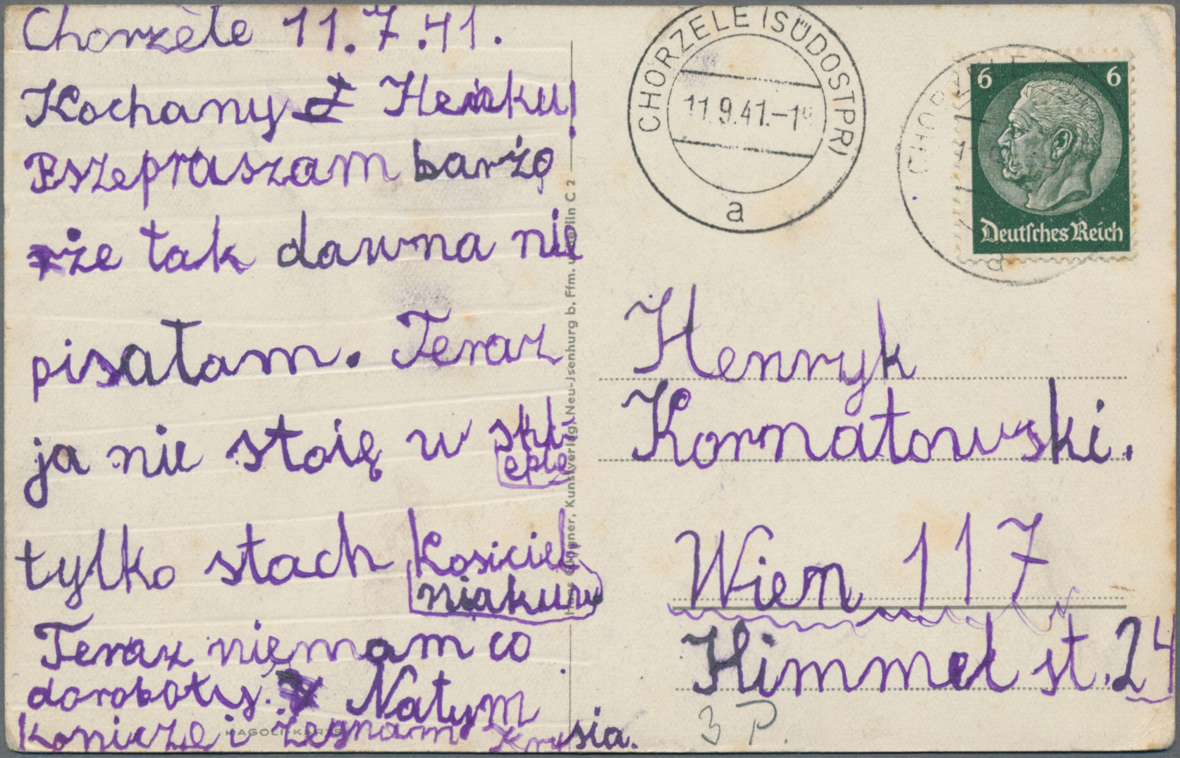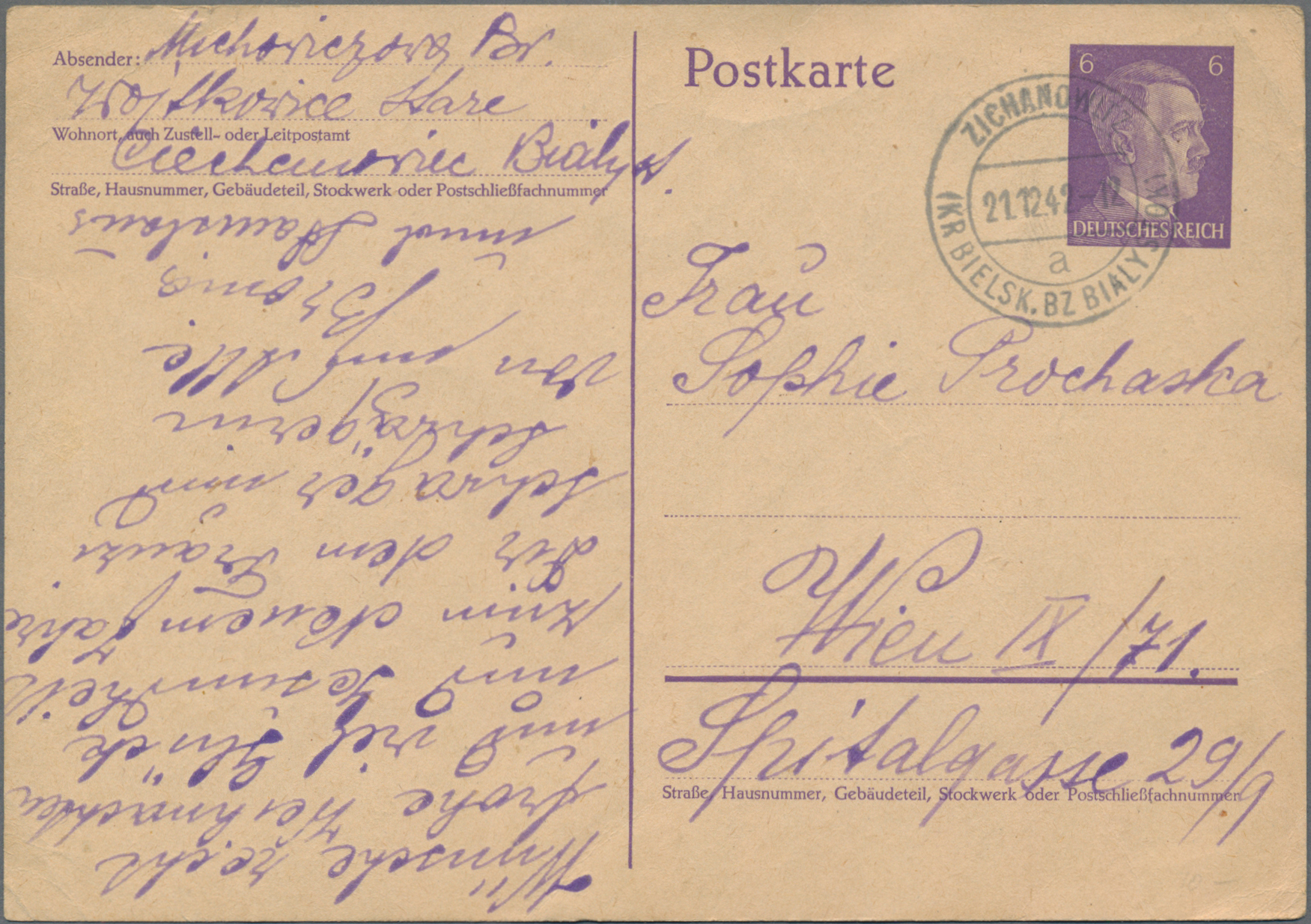 1941/1945, Lot von fünf Bedarfskarten mit u.a. Stempel "ZICHANOWITZ BIALSTOK", "CHORZELE (SÜDOSTPR)", "PRASCHNITZ (SÜDOSTPR)", ferner zwei Vorderseiten