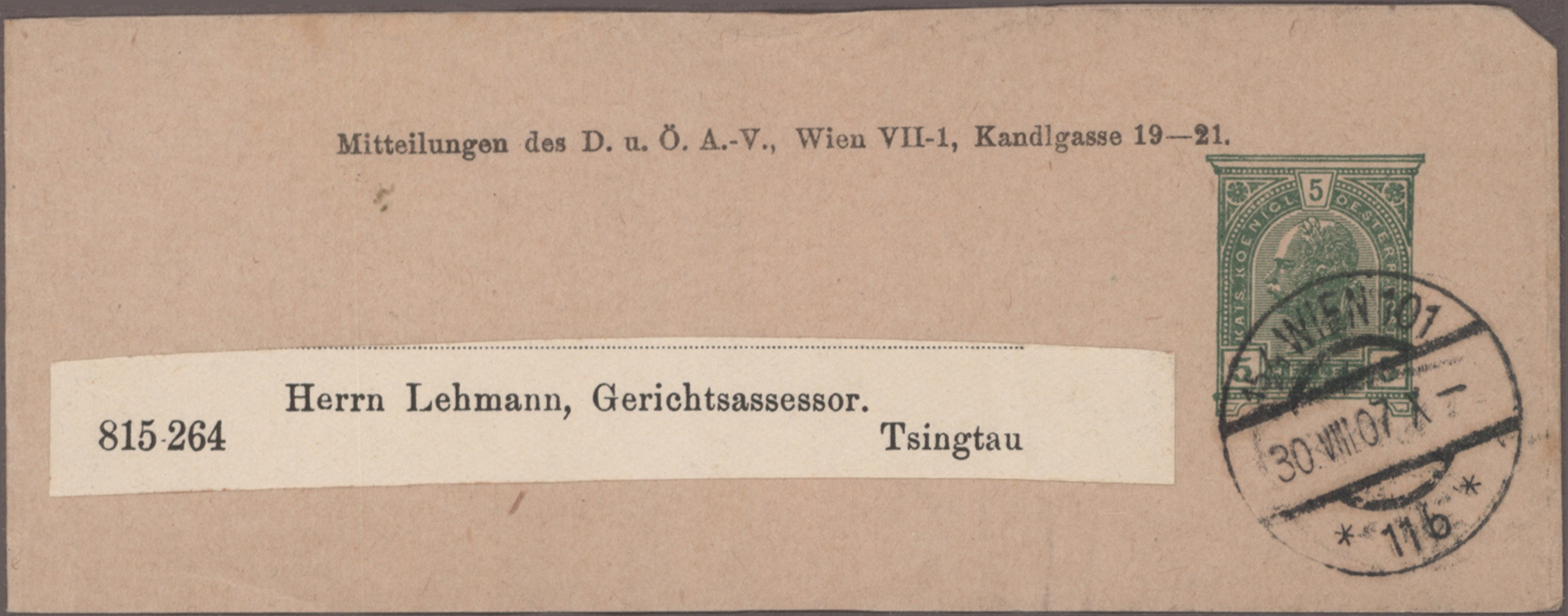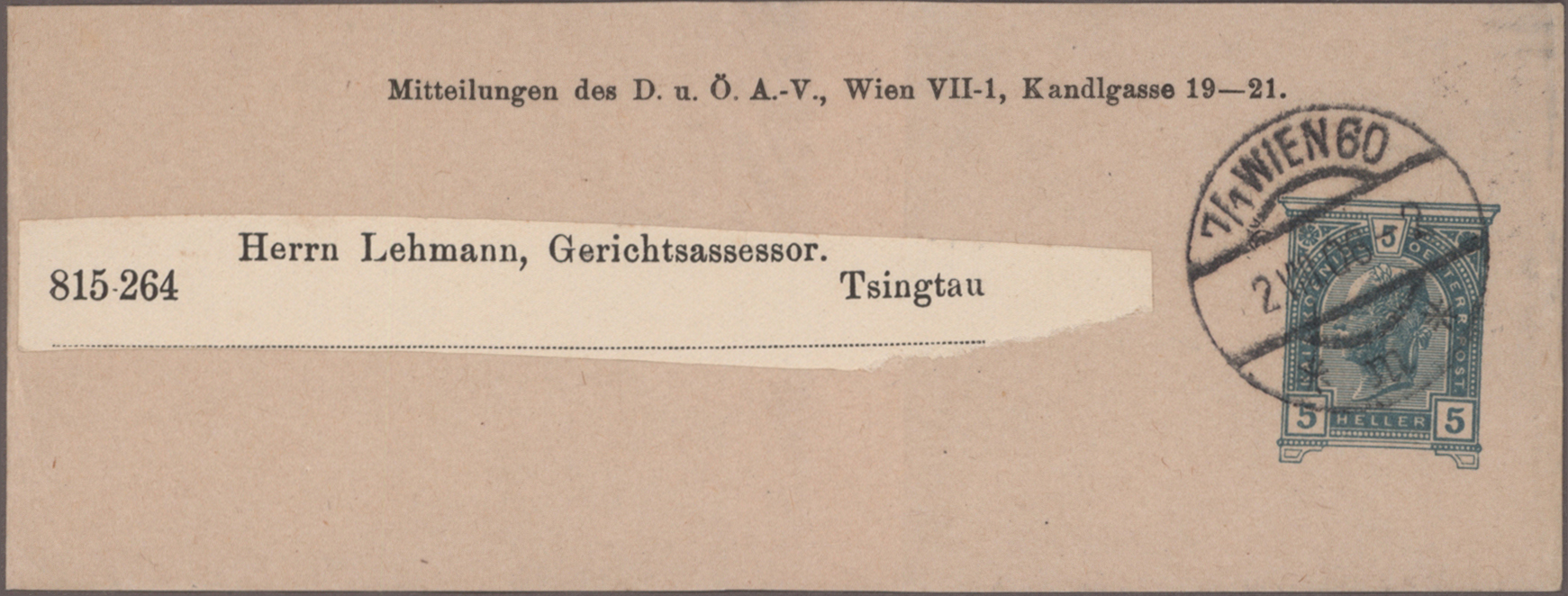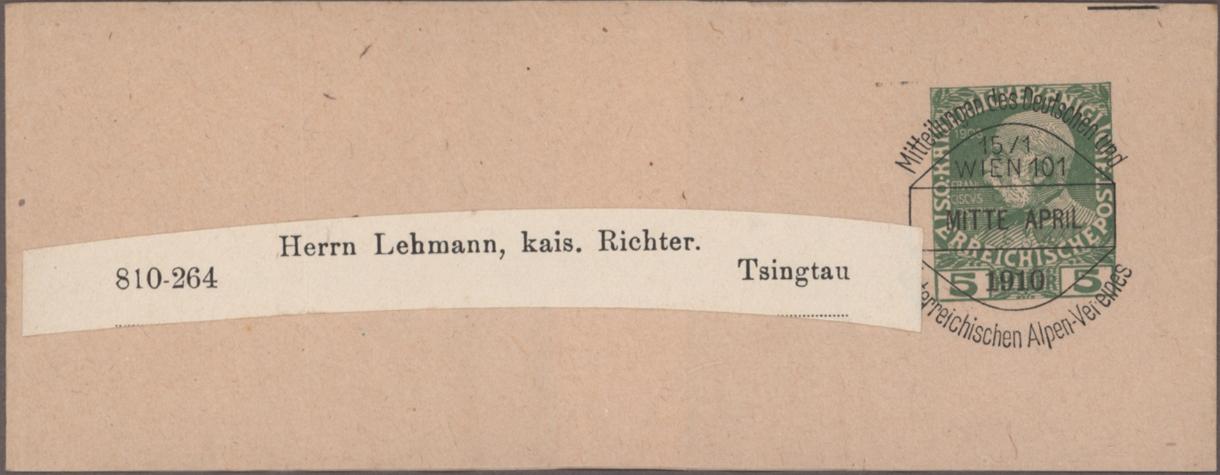 1905/1912, Partie von ca. 116 eingehenden Privat-Ganzsachenstreifbändern des Deutsch-Österreichischen Alpenvereins, alle adressiert an Herrn Lehmann in Tsingtau, zunächst Gerichtsassessor, später dann kaiserlicher Richter.