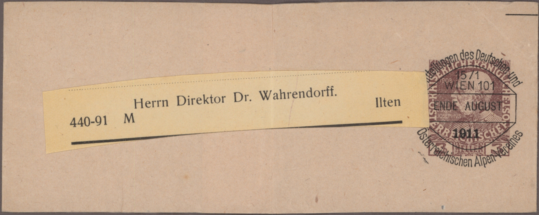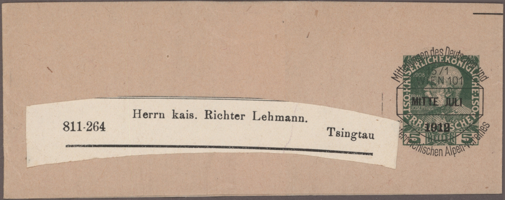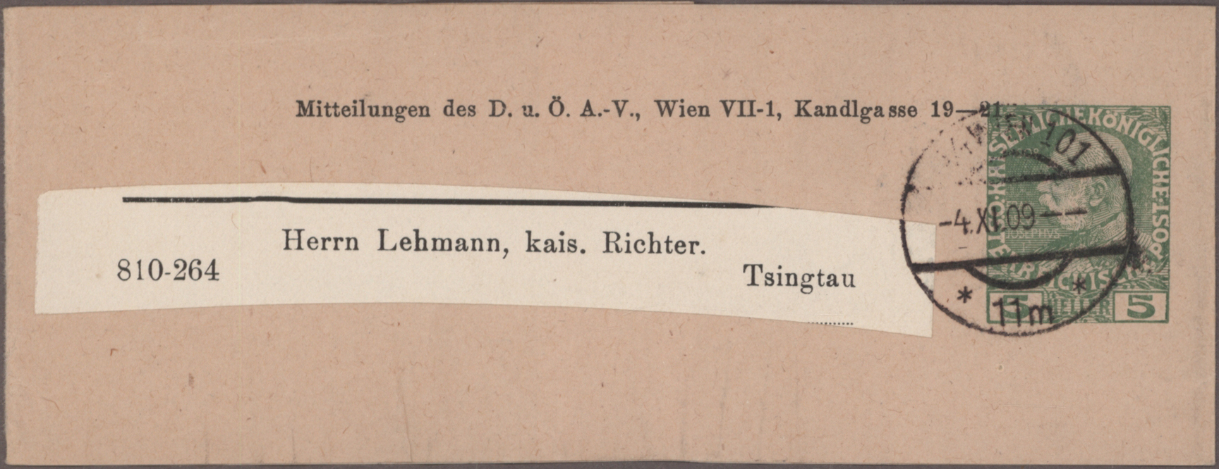 1905/1912, Partie von ca. 116 eingehenden Privat-Ganzsachenstreifbändern des Deutsch-Österreichischen Alpenvereins, alle adressiert an Herrn Lehmann in Tsingtau, zunächst Gerichtsassessor, später dann kaiserlicher Richter.