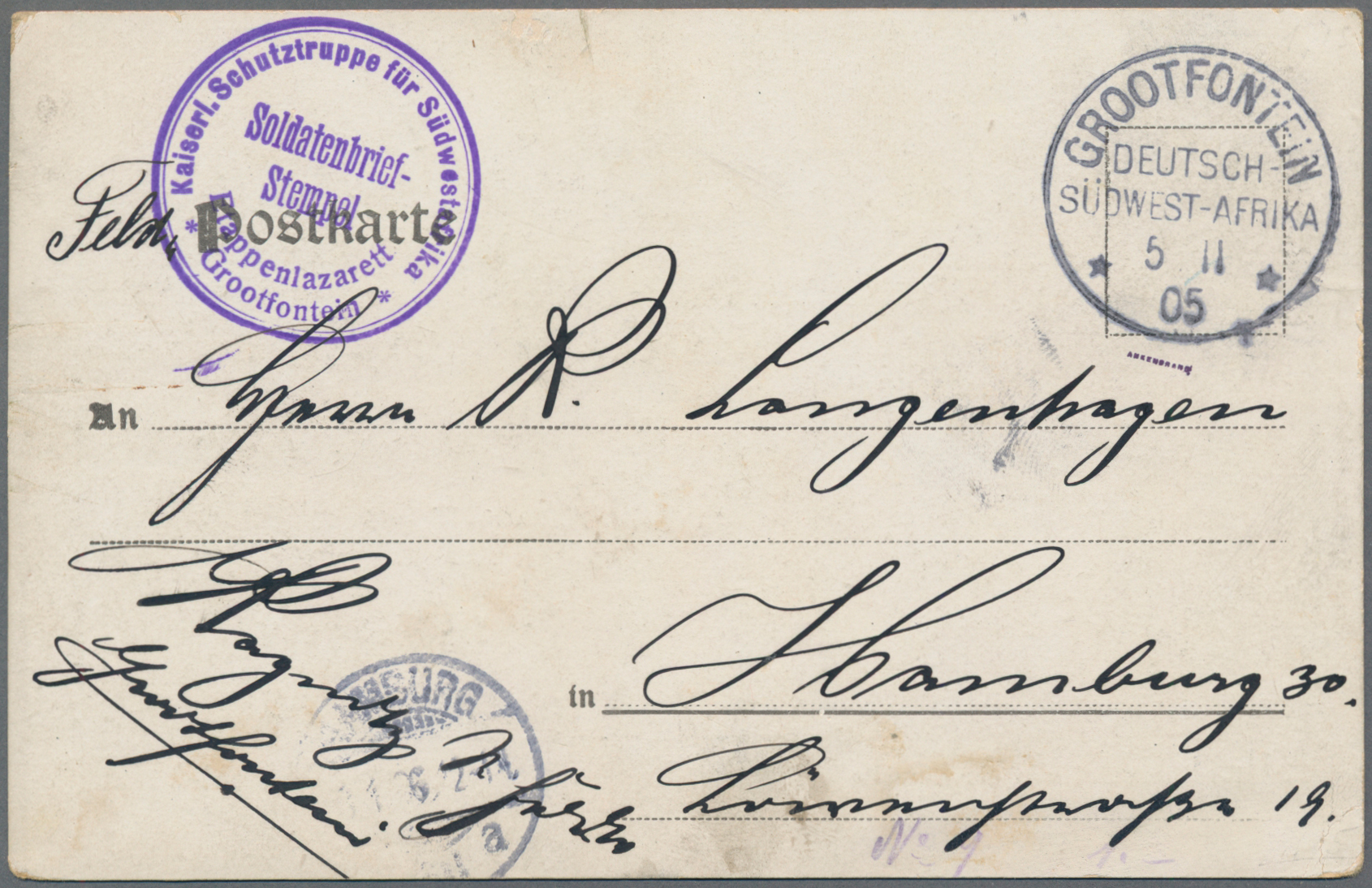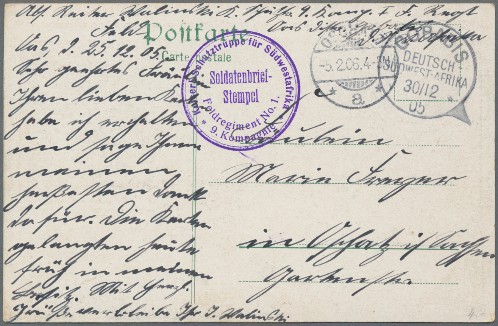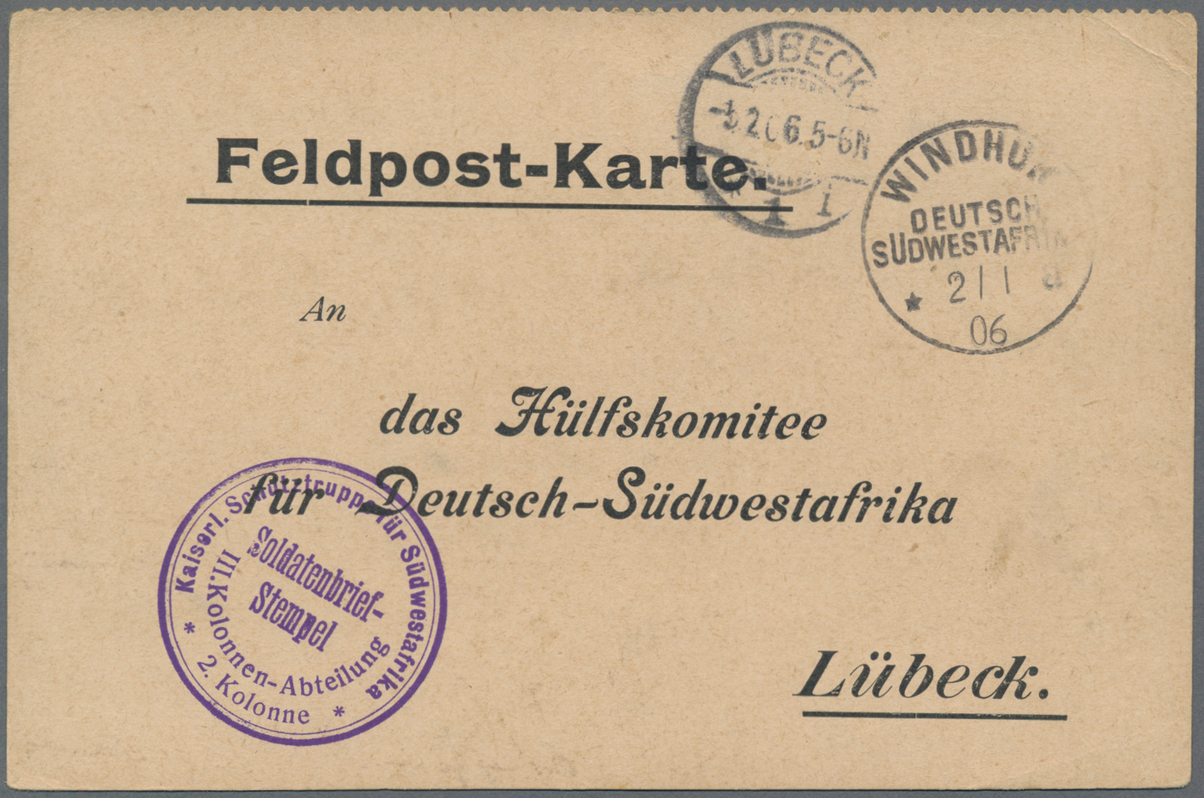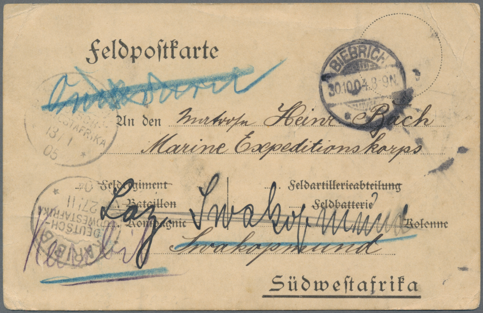 1904/1906, 12 Feldpostkarten, davon 10 sogenannte "Liebesgaben-Karten" und zwei Karten, 1 x aus Berlin 1905 mit Nachporto/verweigert und "Entlastet" -Stempel und aus Biebrich 1904 an einen Matrosen des Marine-Expedtionscorps (wohl S.M.S. Habicht) ins Lazarett Swakopmund und von dort weitergesandt nach Karibib.