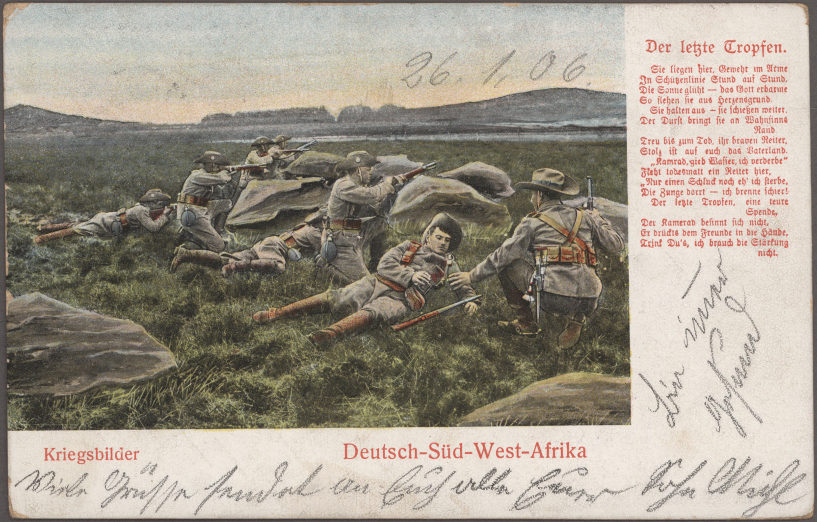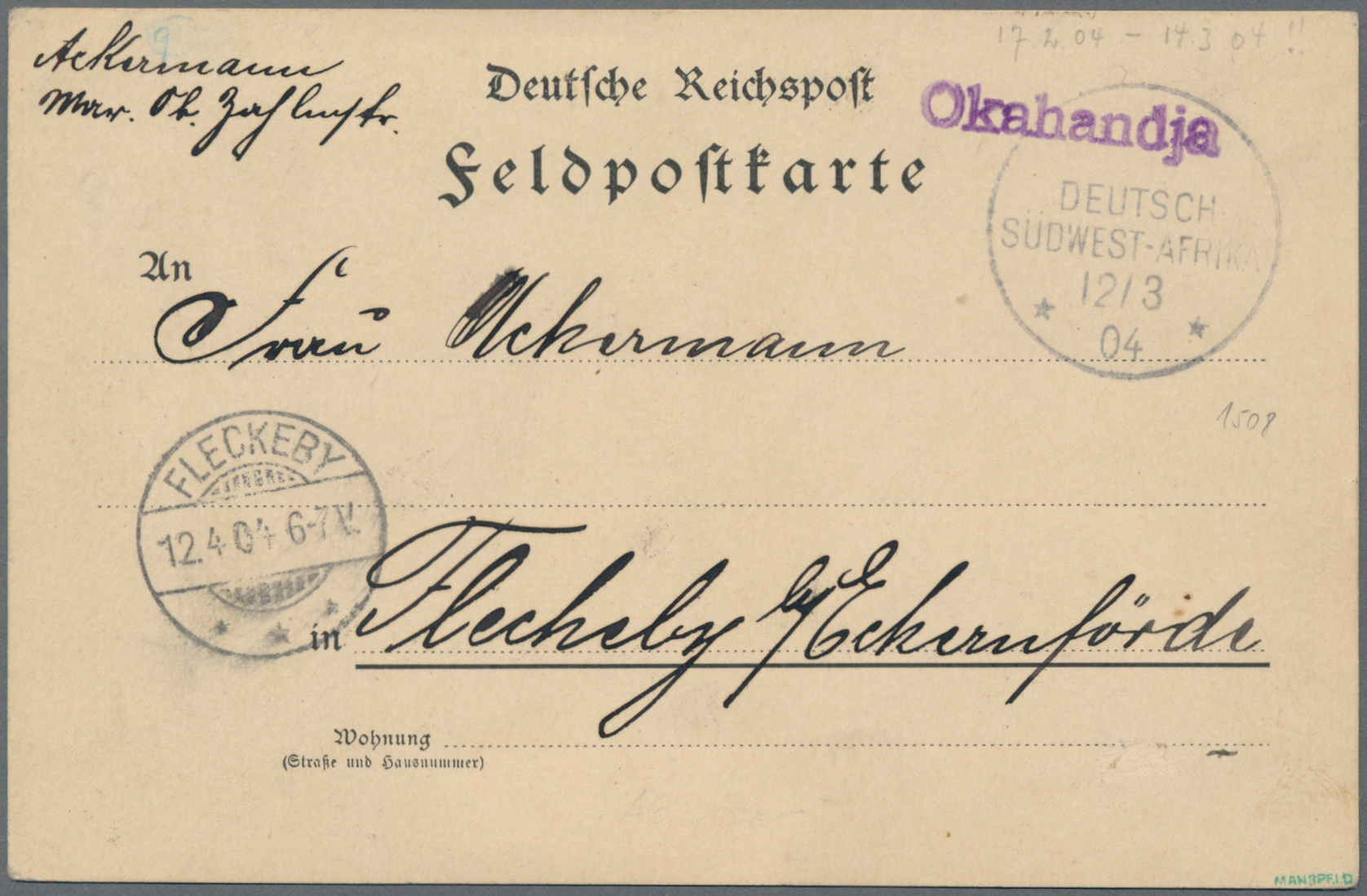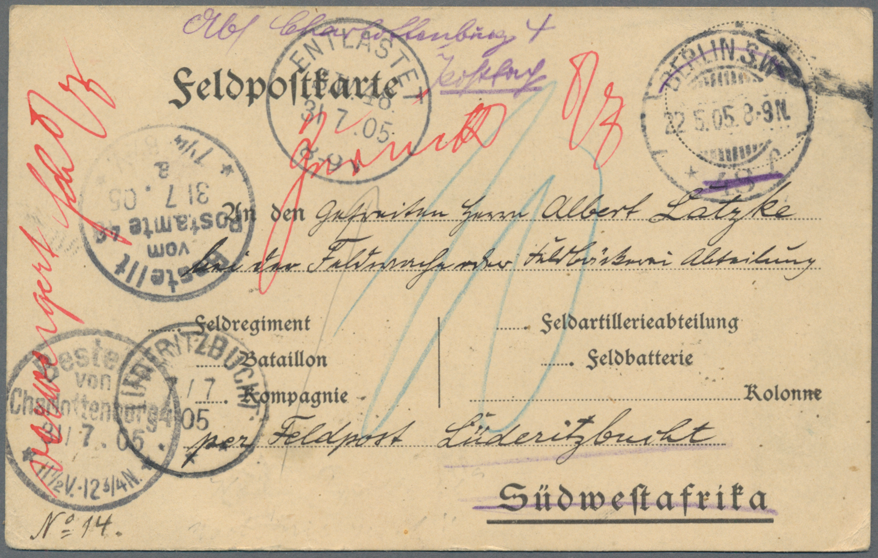 1904/1906, 12 Feldpostkarten, davon 10 sogenannte "Liebesgaben-Karten" und zwei Karten, 1 x aus Berlin 1905 mit Nachporto/verweigert und "Entlastet" -Stempel und aus Biebrich 1904 an einen Matrosen des Marine-Expedtionscorps (wohl S.M.S. Habicht) ins Lazarett Swakopmund und von dort weitergesandt nach Karibib.
