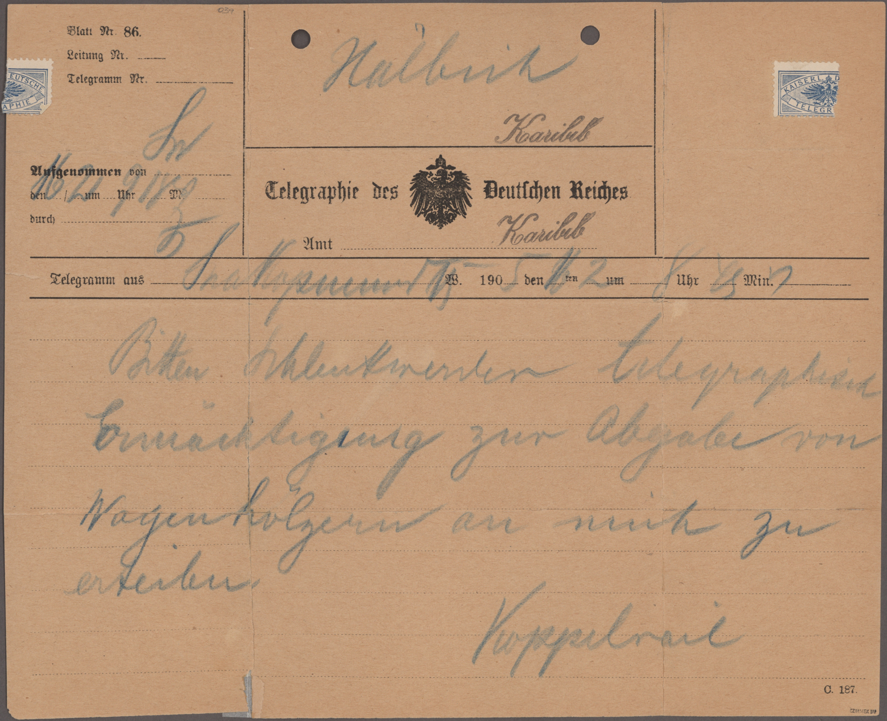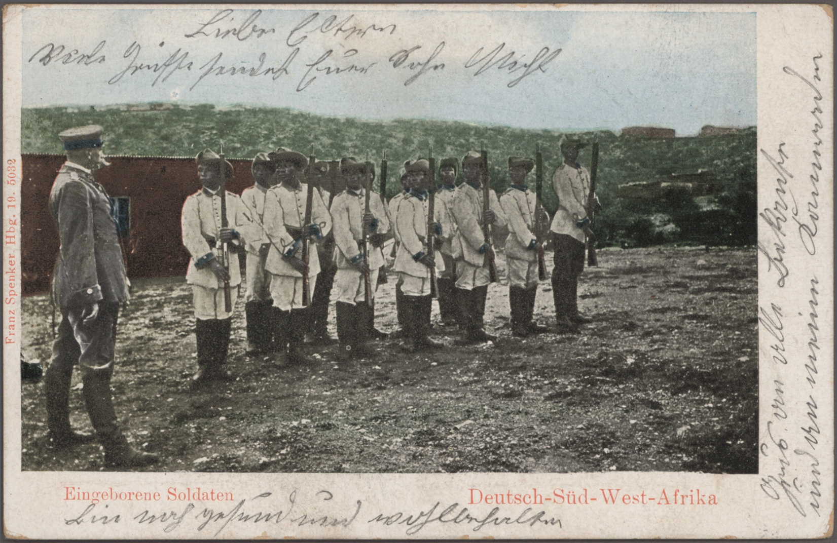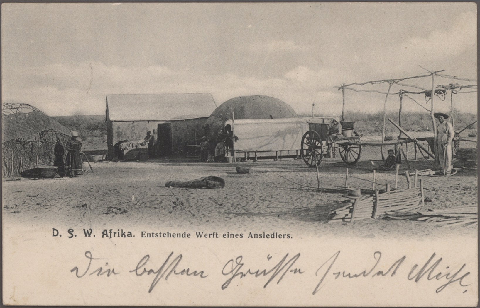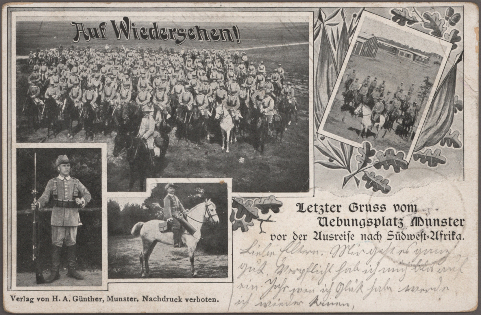 1904/1906, 12 Feldpostkarten, davon 10 sogenannte "Liebesgaben-Karten" und zwei Karten, 1 x aus Berlin 1905 mit Nachporto/verweigert und "Entlastet" -Stempel und aus Biebrich 1904 an einen Matrosen des Marine-Expedtionscorps (wohl S.M.S. Habicht) ins Lazarett Swakopmund und von dort weitergesandt nach Karibib.