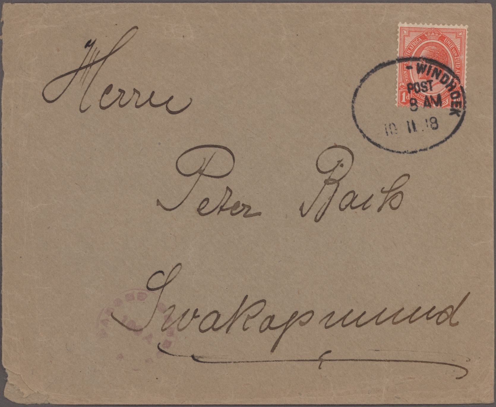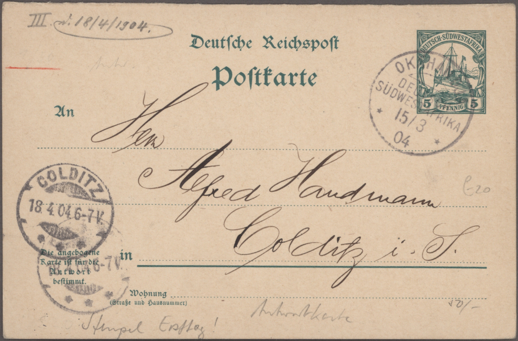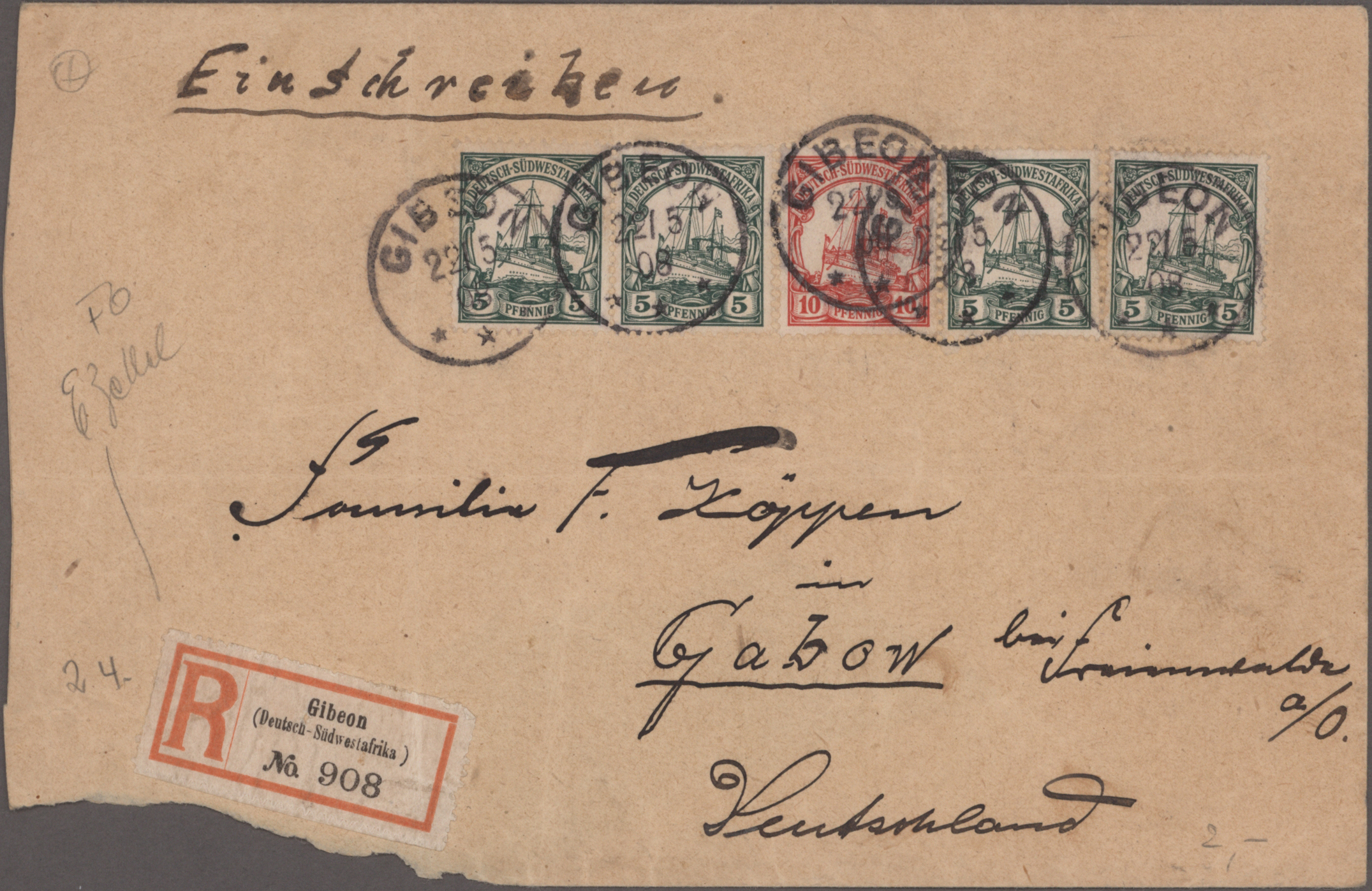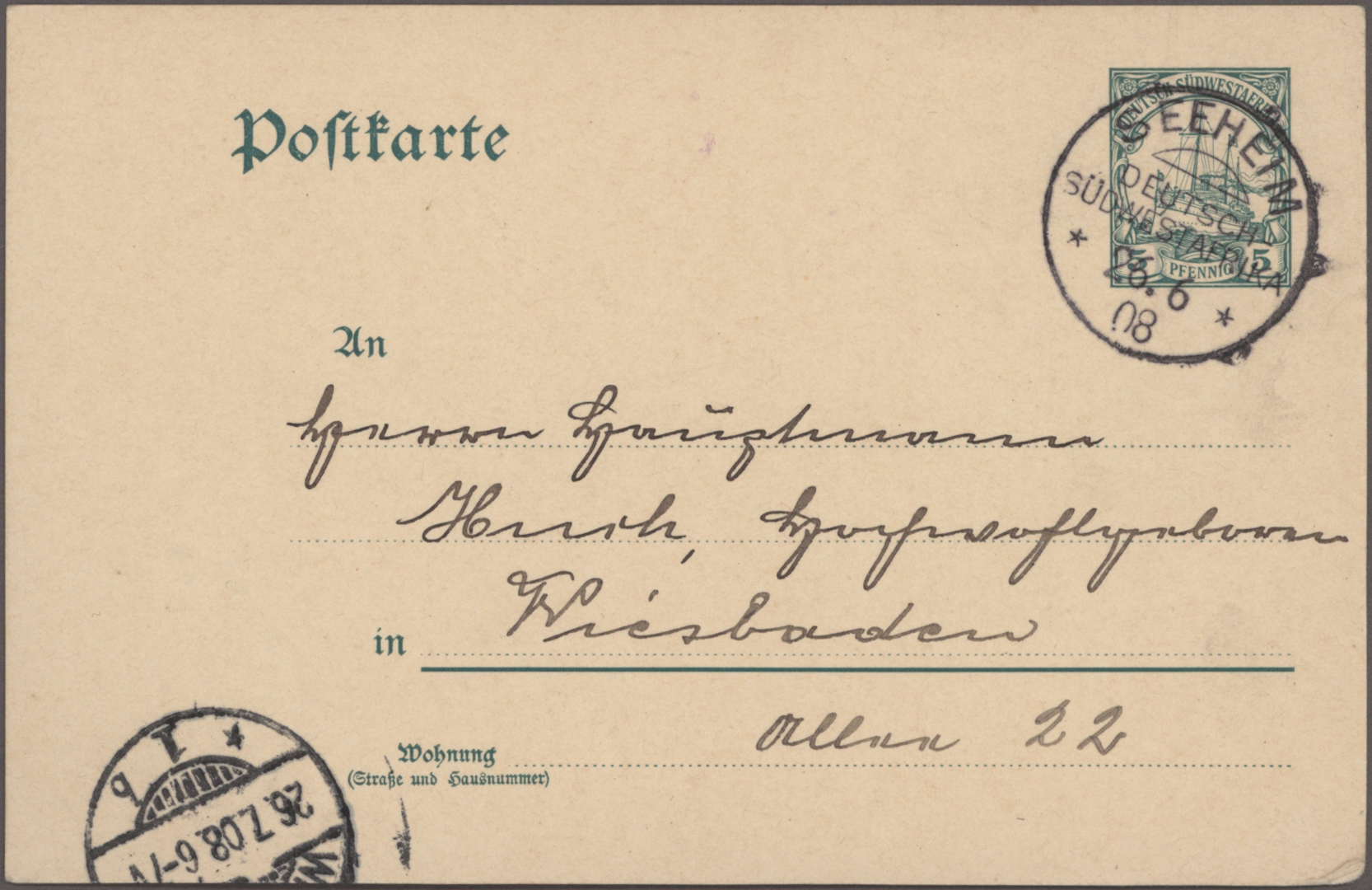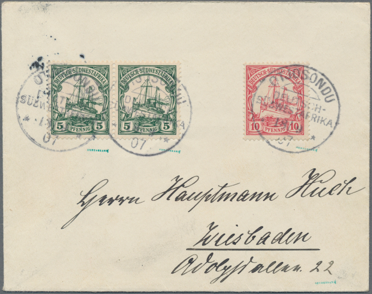 1898/1914, 22 Belege mit einigen Ansichtskarten, dabei Karte nach Kamerun und Brief mit 5 Pf (Paar) und 10 Pf Kaiseryacht mit Stempel "OTJOSONDDU D-SWA" nach Wiesbaden etc. Teils etwas unterschiedlich erhalten, jedoch interessantes Los.