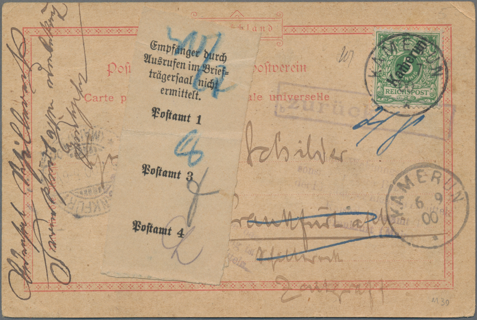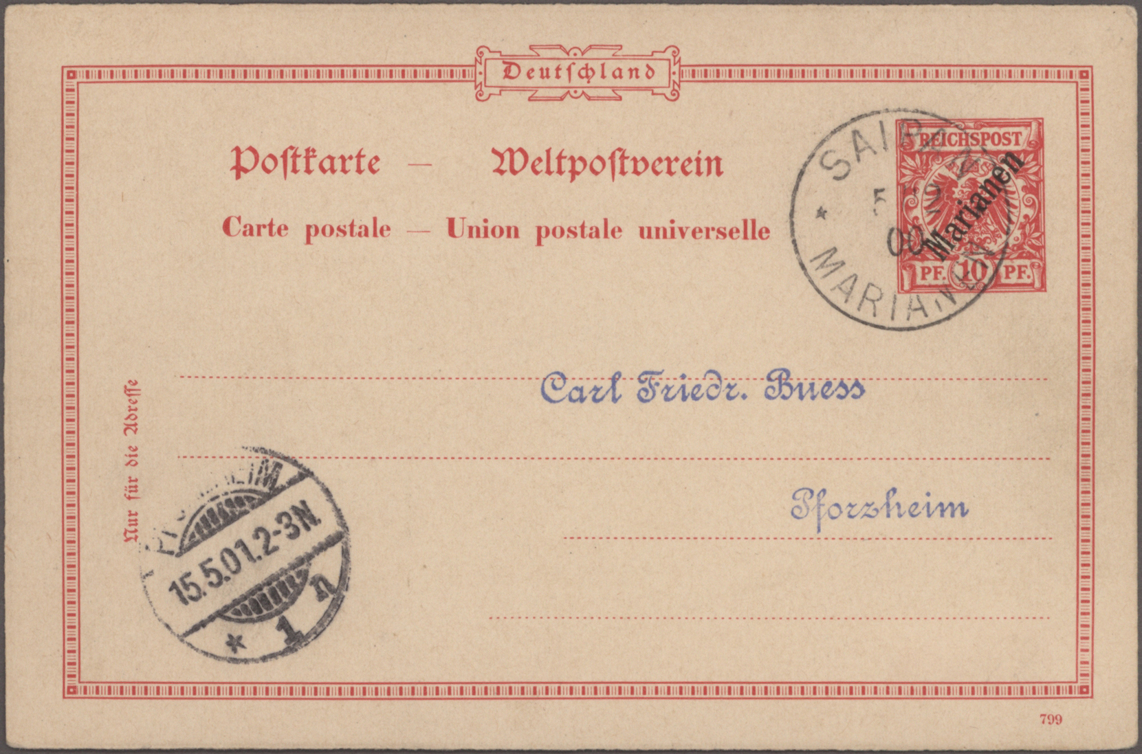 1899/1907, Lot von fünf nach Deutschland gelaufenen Ganzsachenkarten, dabei Vorläuferkarte 10 Pfg. Krone/Adler mit Text, sowie vier Karten P1, P2, P5 und P8 ohne Text, alle mit Ankunftsstempel.