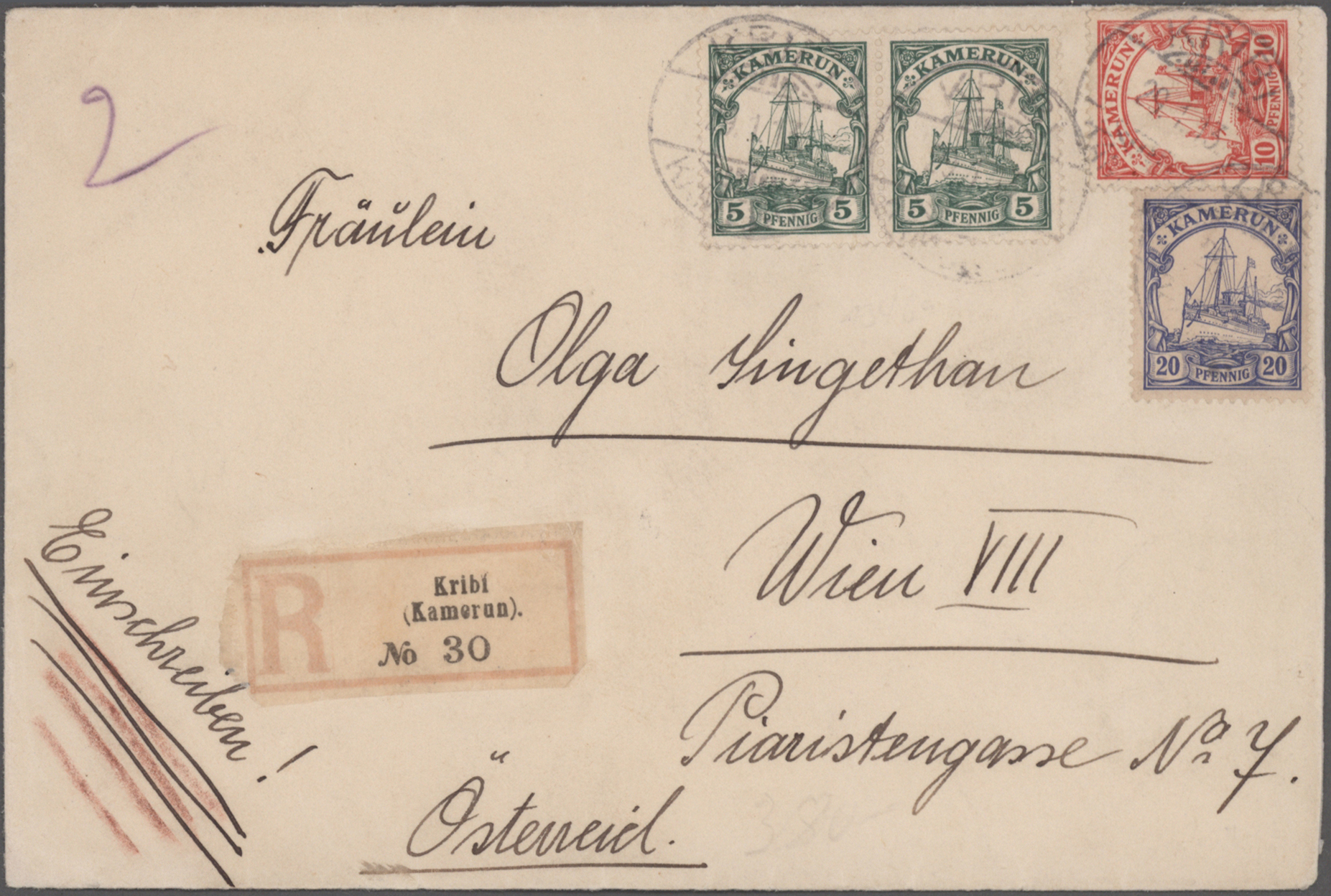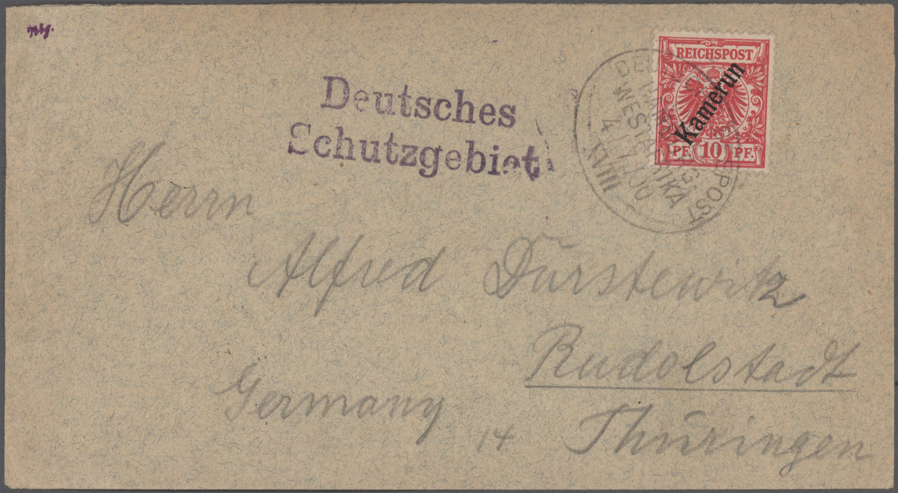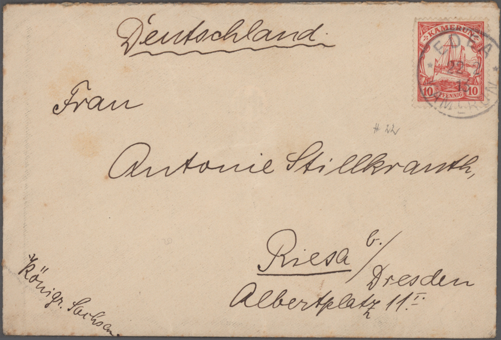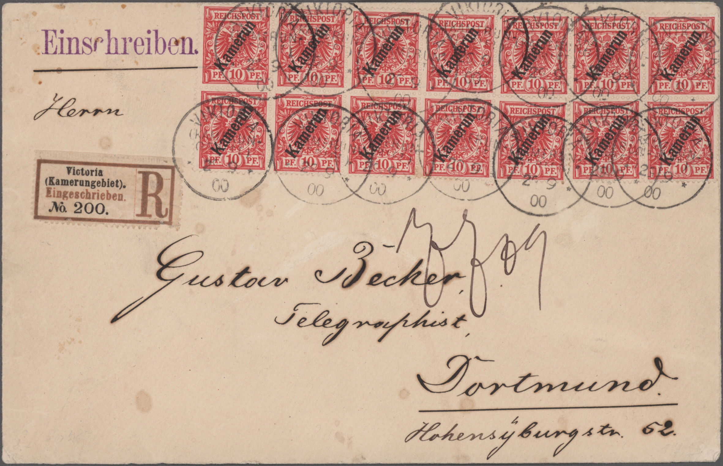 1898/1912, Partie von neun Briefen und Karten, dabei Kamerun MiNr. 3d im 14er-Block (!) auf R-Brief (Attest Jäschke-Lantelme BPP), Schiffpost, farbige Stempel, etc.
