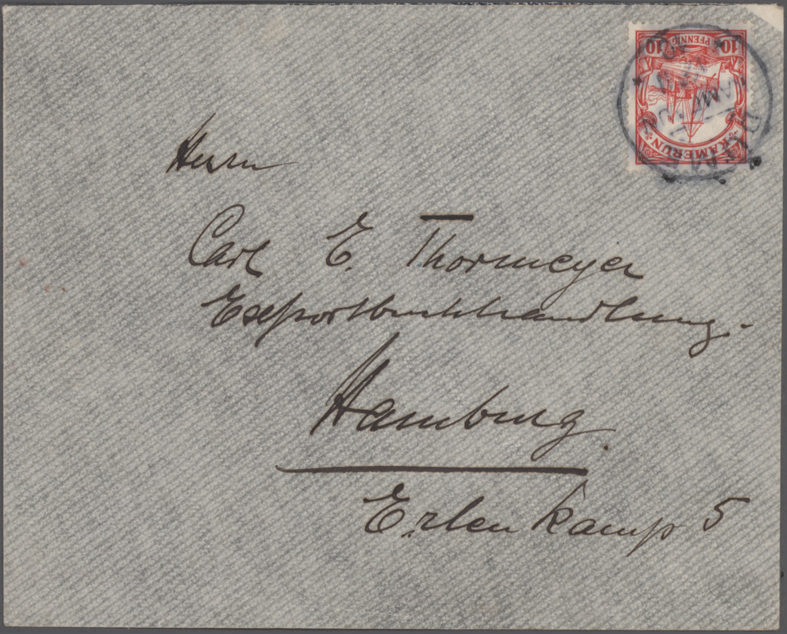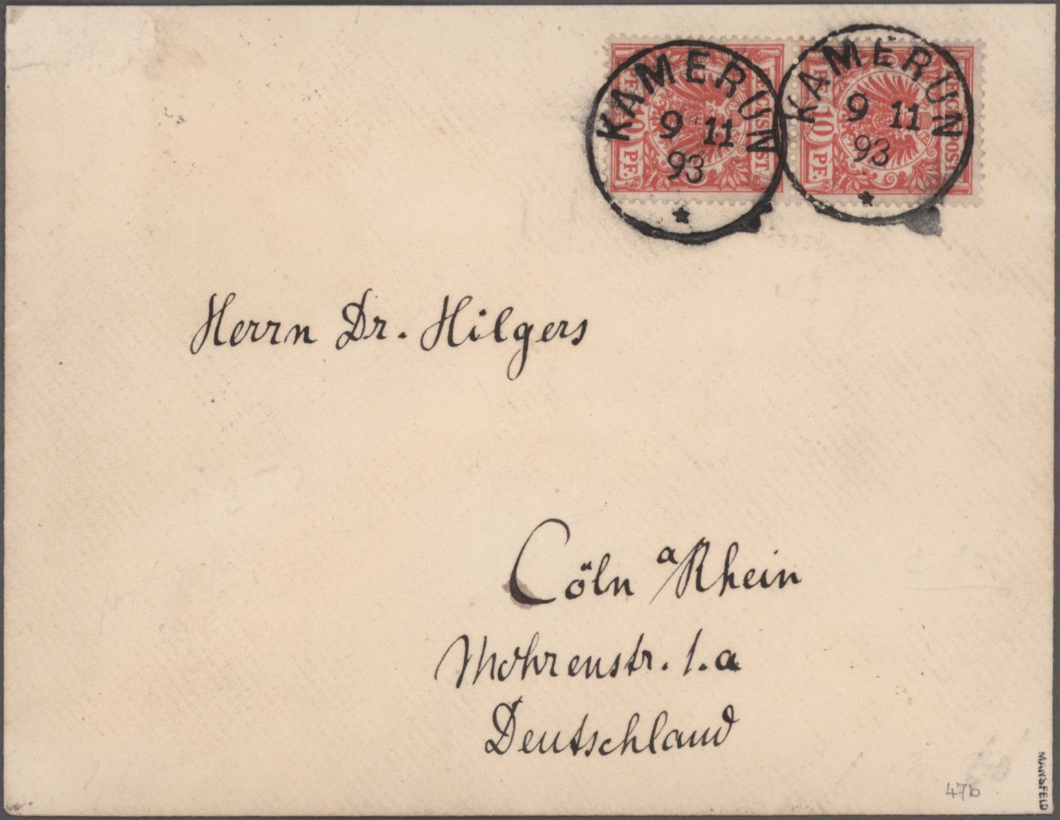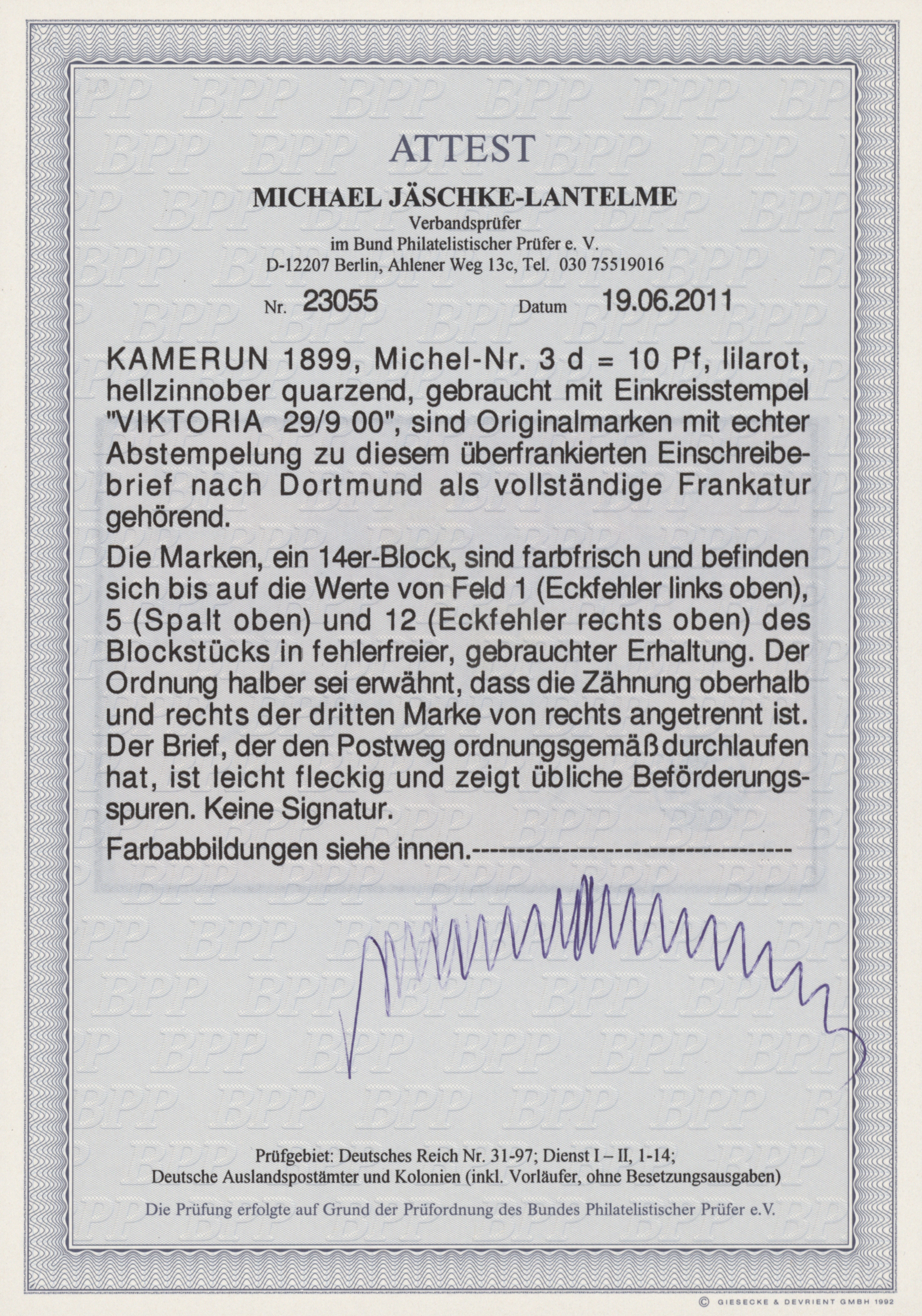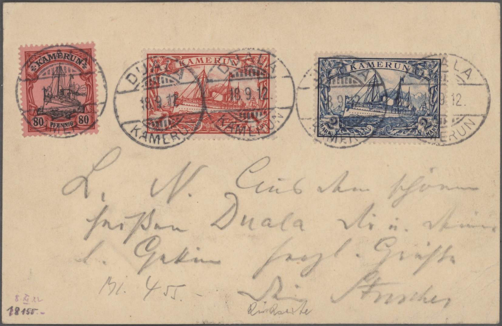 1898/1912, Partie von neun Briefen und Karten, dabei Kamerun MiNr. 3d im 14er-Block (!) auf R-Brief (Attest Jäschke-Lantelme BPP), Schiffpost, farbige Stempel, etc.
