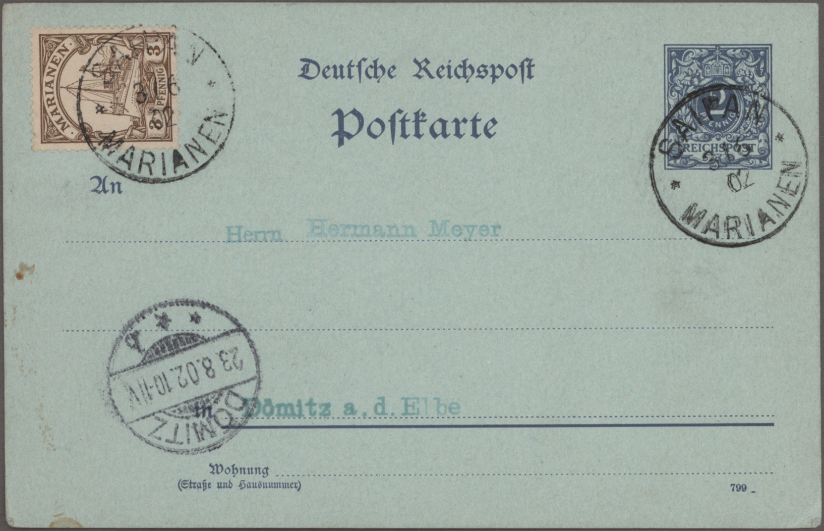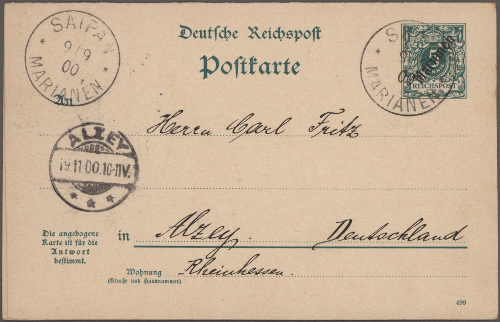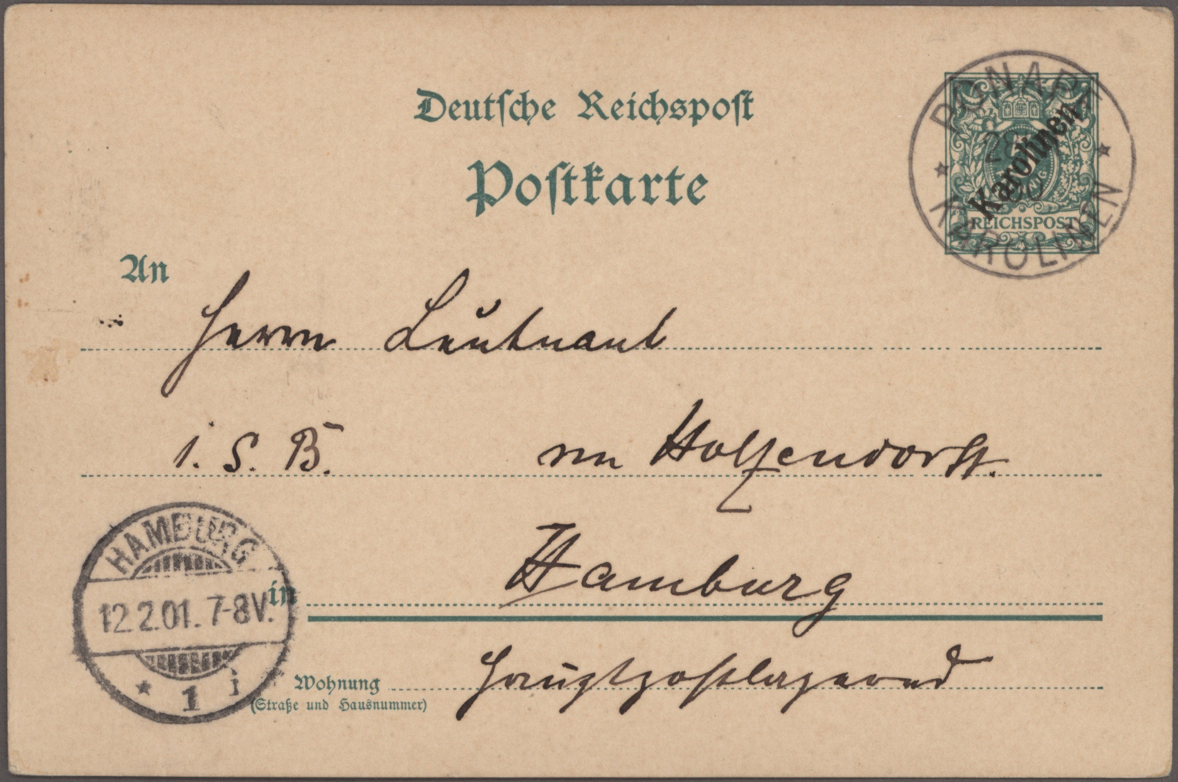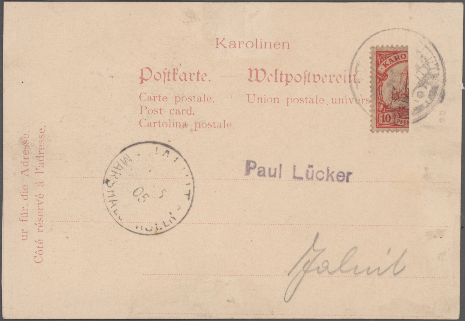 1900/1910 (ca.), 8 Belege, dabei Post von den Schiffen Planet, Habicht und Cormoran, Einschreibebrief von "Jap" (Yap) und schöne Ansichtskarten.