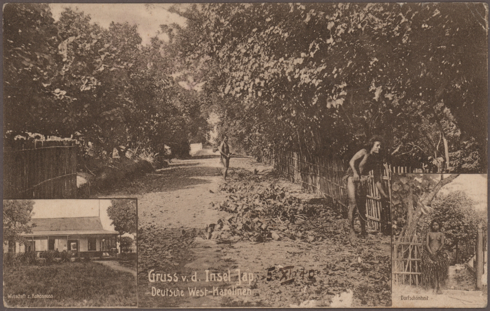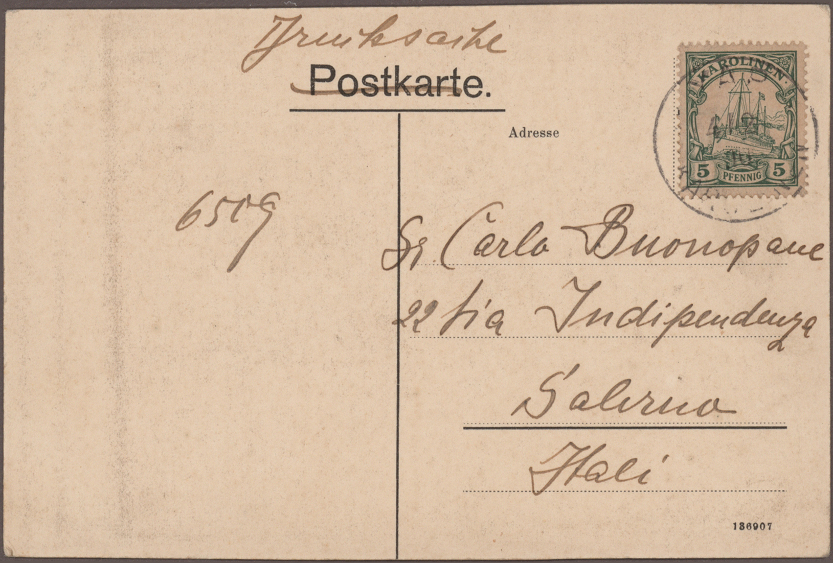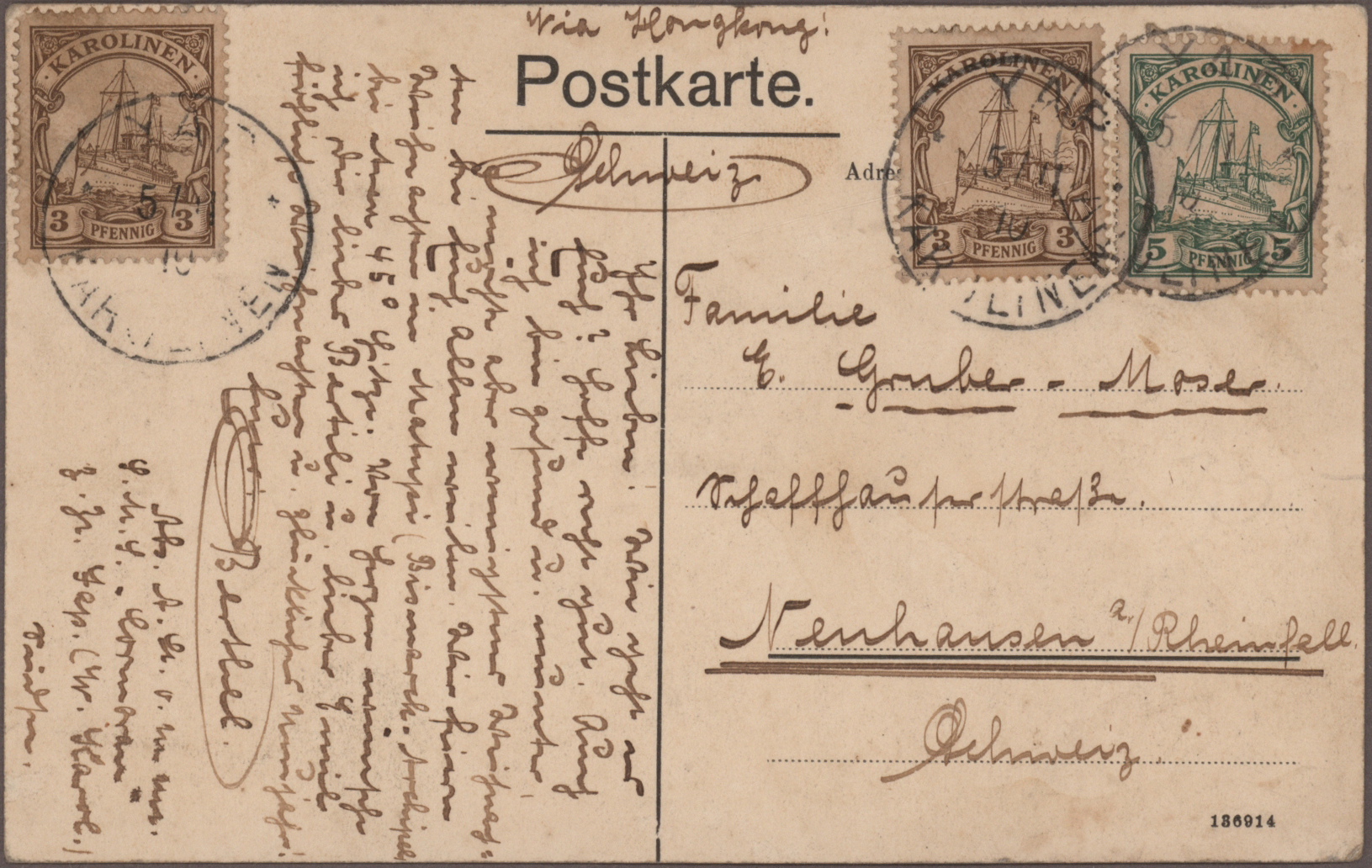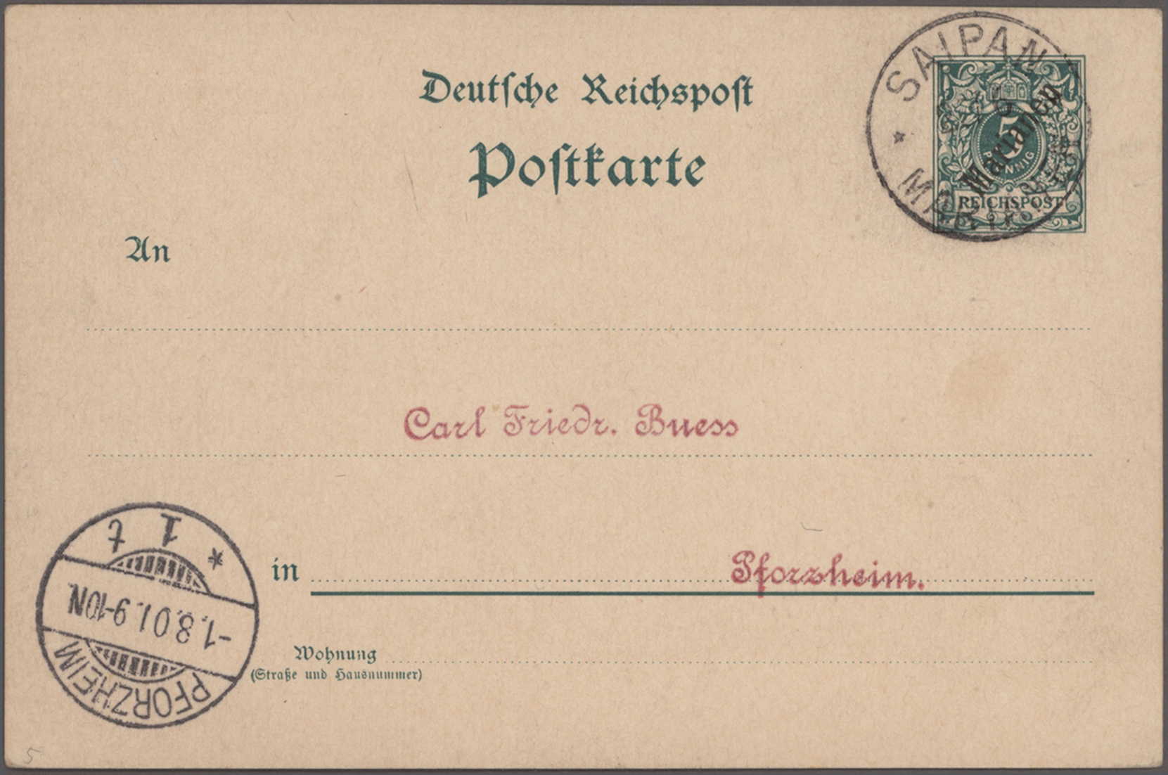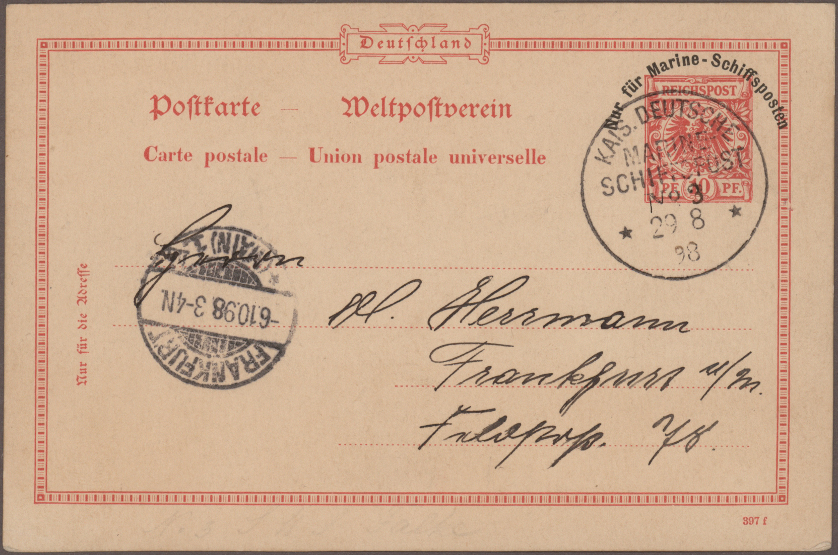 1900/1910 (ca.), 8 Belege, dabei Post von den Schiffen Planet, Habicht und Cormoran, Einschreibebrief von "Jap" (Yap) und schöne Ansichtskarten.