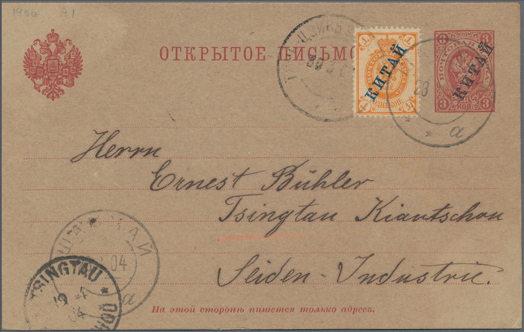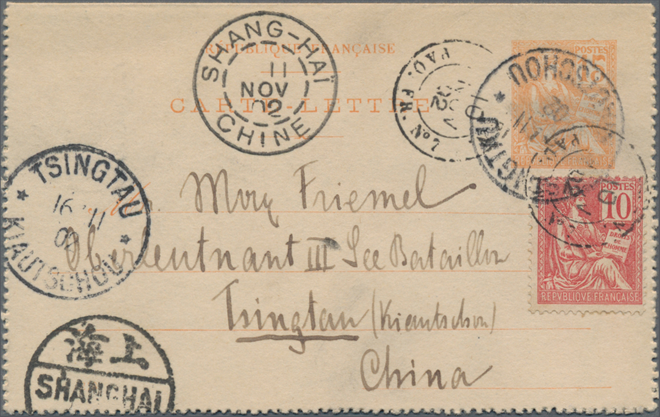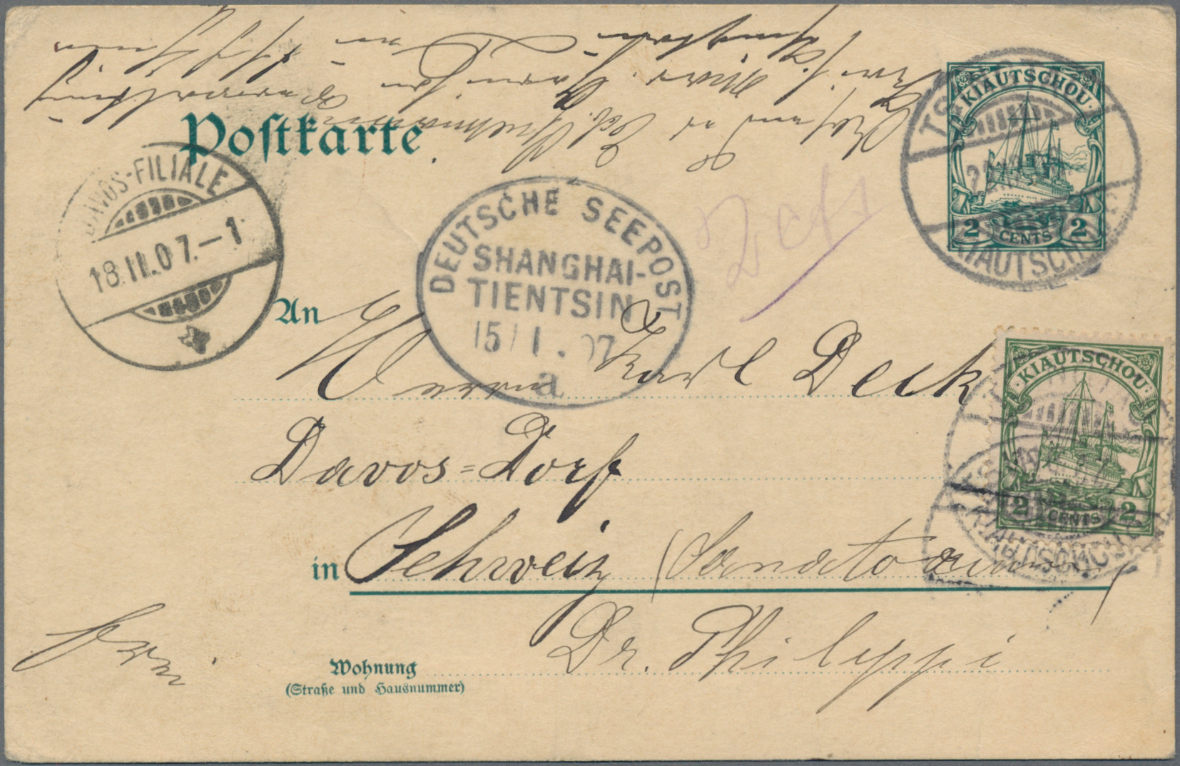 1902/1921, 8 Belege, dabei Ganzsache 10 Pf 1903 ab TSANGKOU nach Shanghai mit LOCAL POST-Stempel, Stempel "DEUTSCHE SEEPOST SHANGHAI-TIENTSIN" als Transitstempel in die Schweiz, Eingangspost aus Frankreich und Shanghai (russ. Post) etc., teils etwas unterschiedlich erhalten, jedoch interessant.