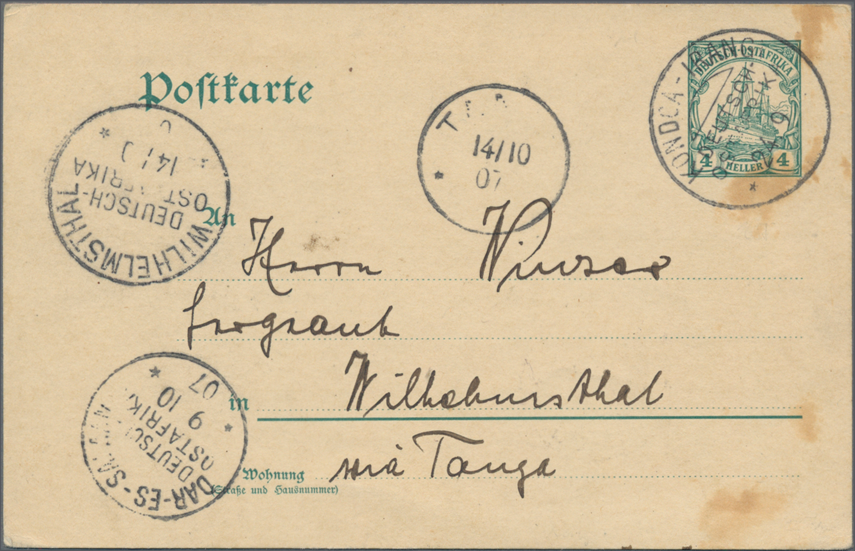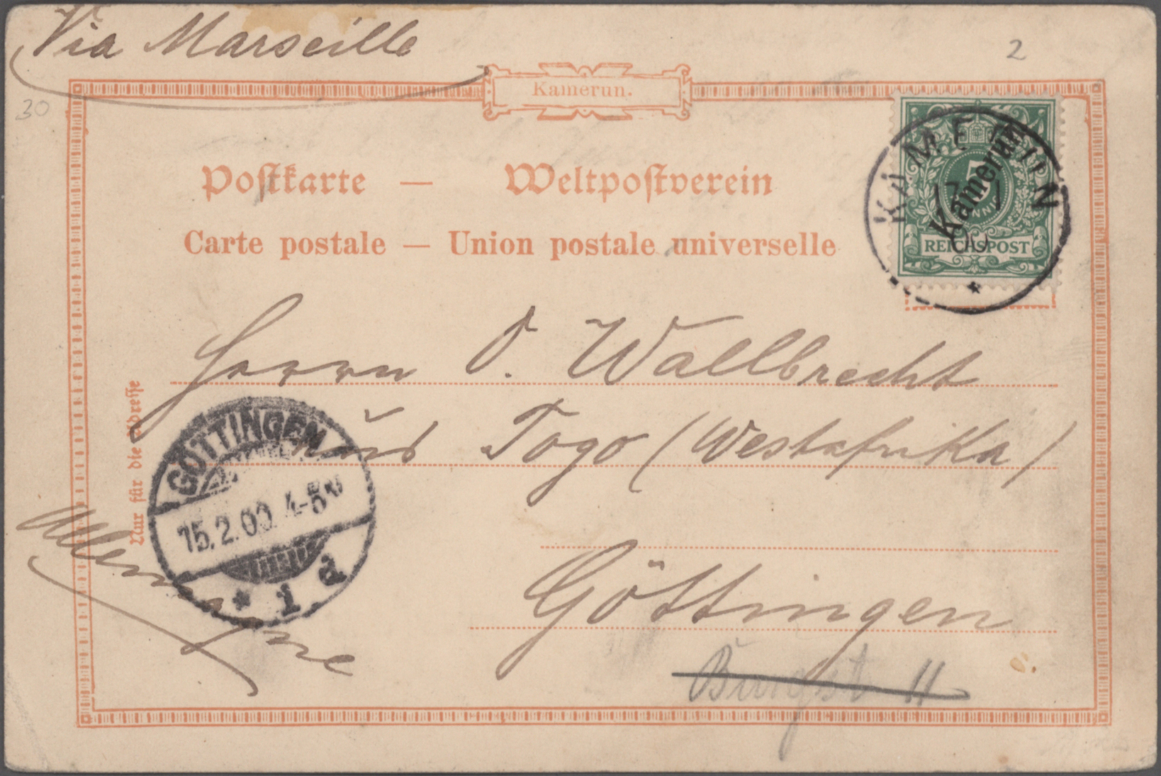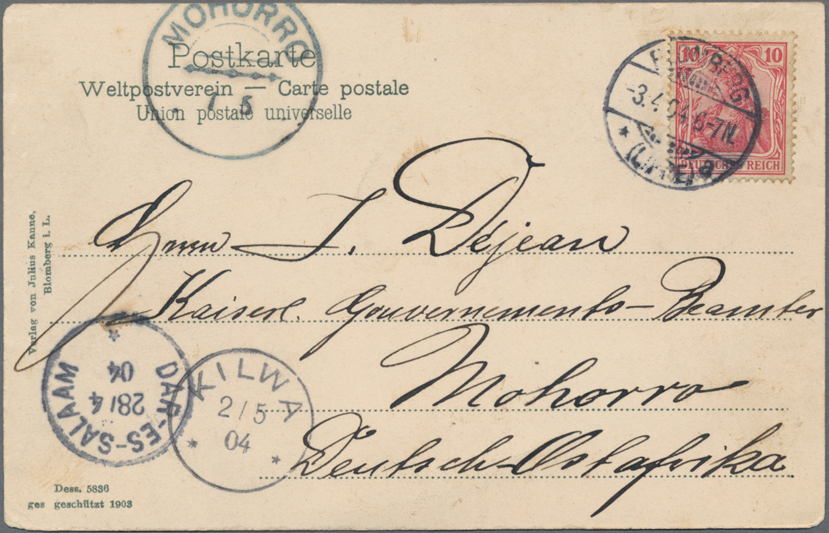 1899/1912, Post innerhalb der Kolonie: 11 Belege mit etwas Eingangspost, die Routen innerhalb der Kolonie aufzeigen. Eine Eingangskarte (AK) aus Blomberg i. L. ist gerichtet an Jean Dejan (Schreiber in Mohorro). Teils etwas unterschiedlich erhalten, jedoch interessant.