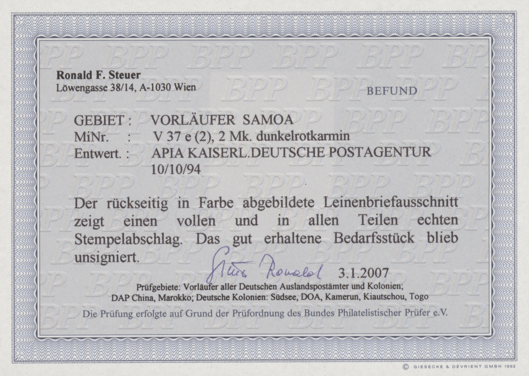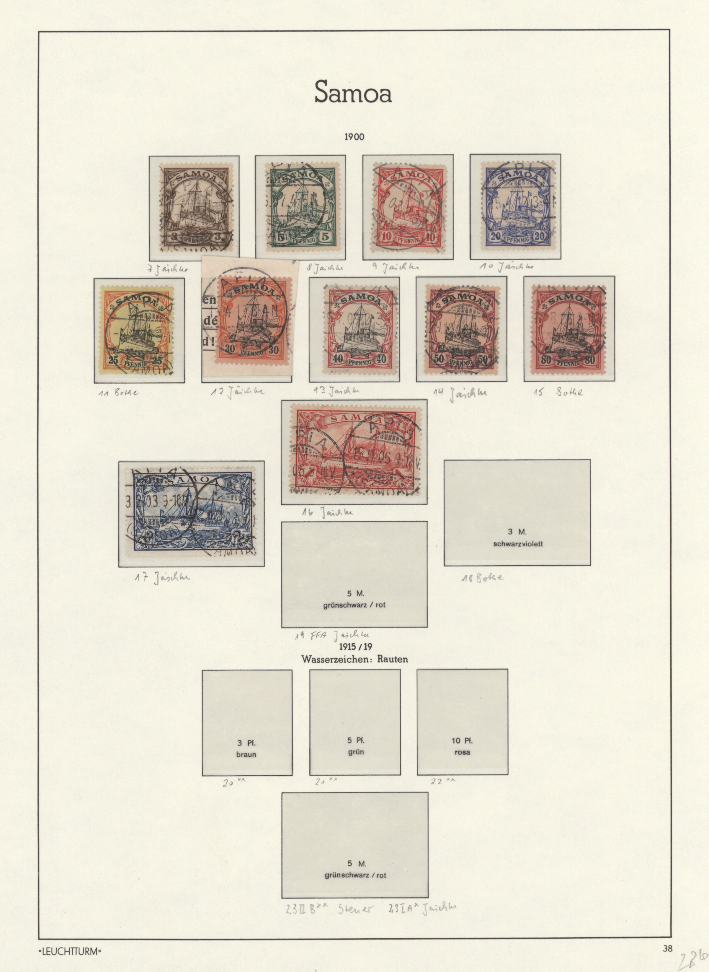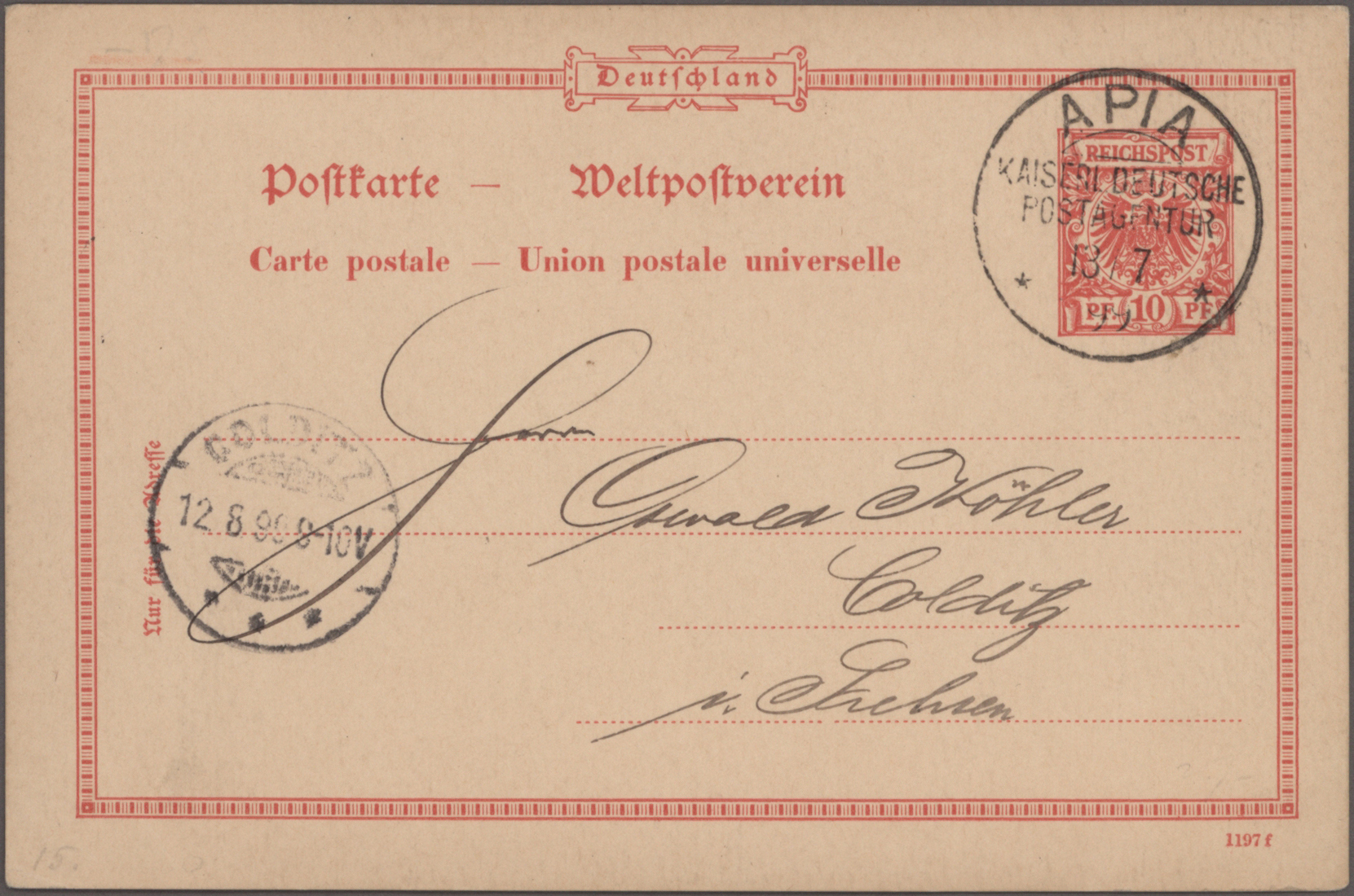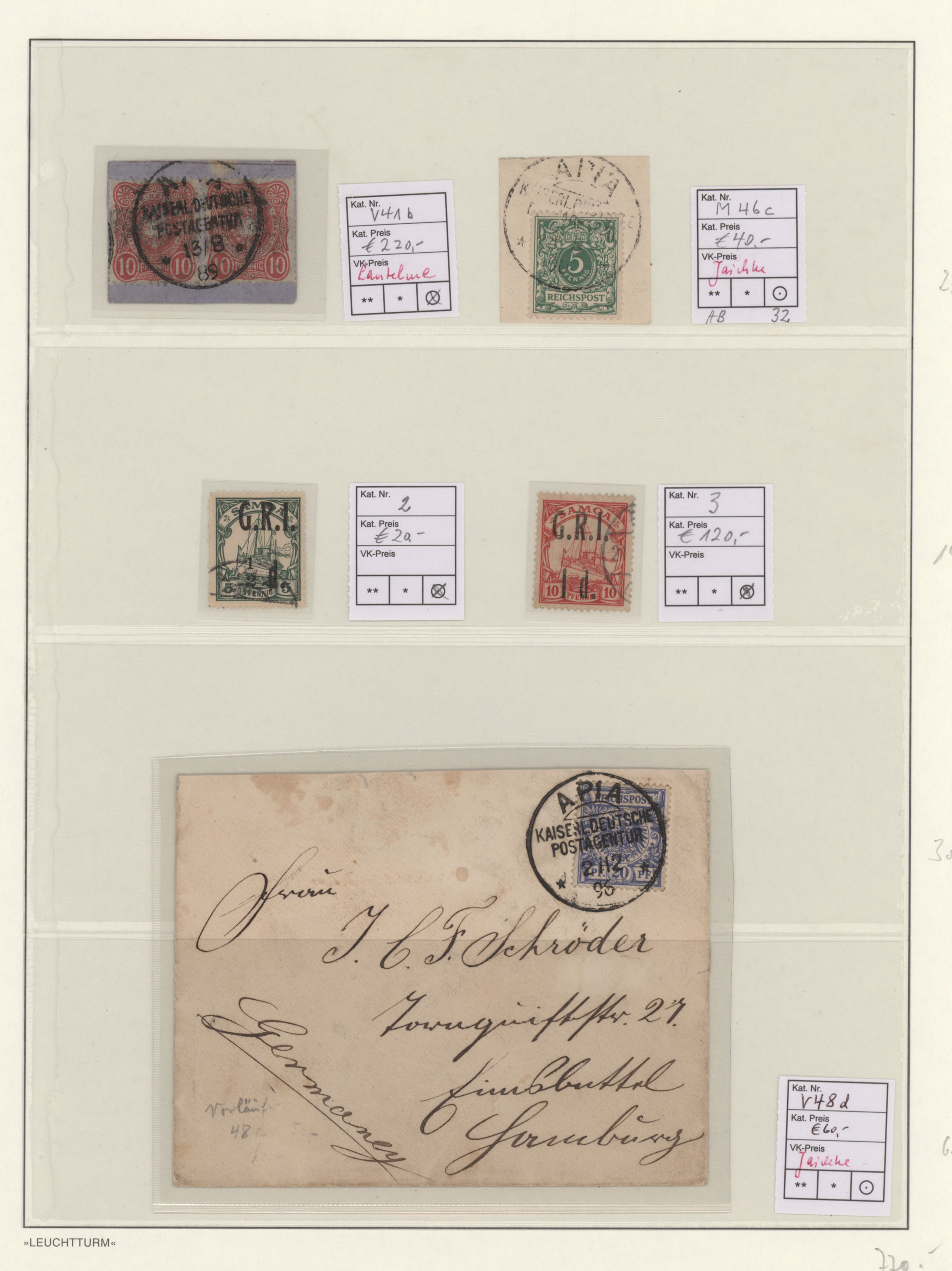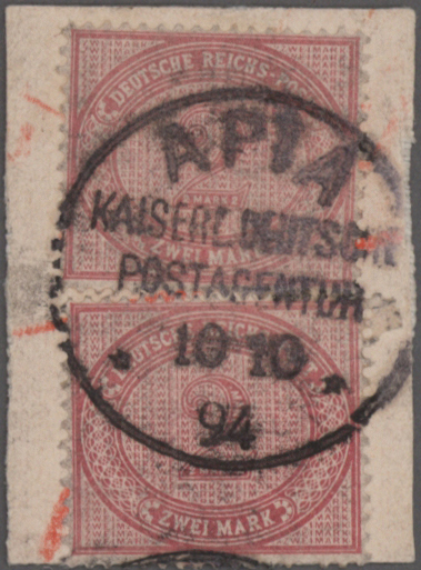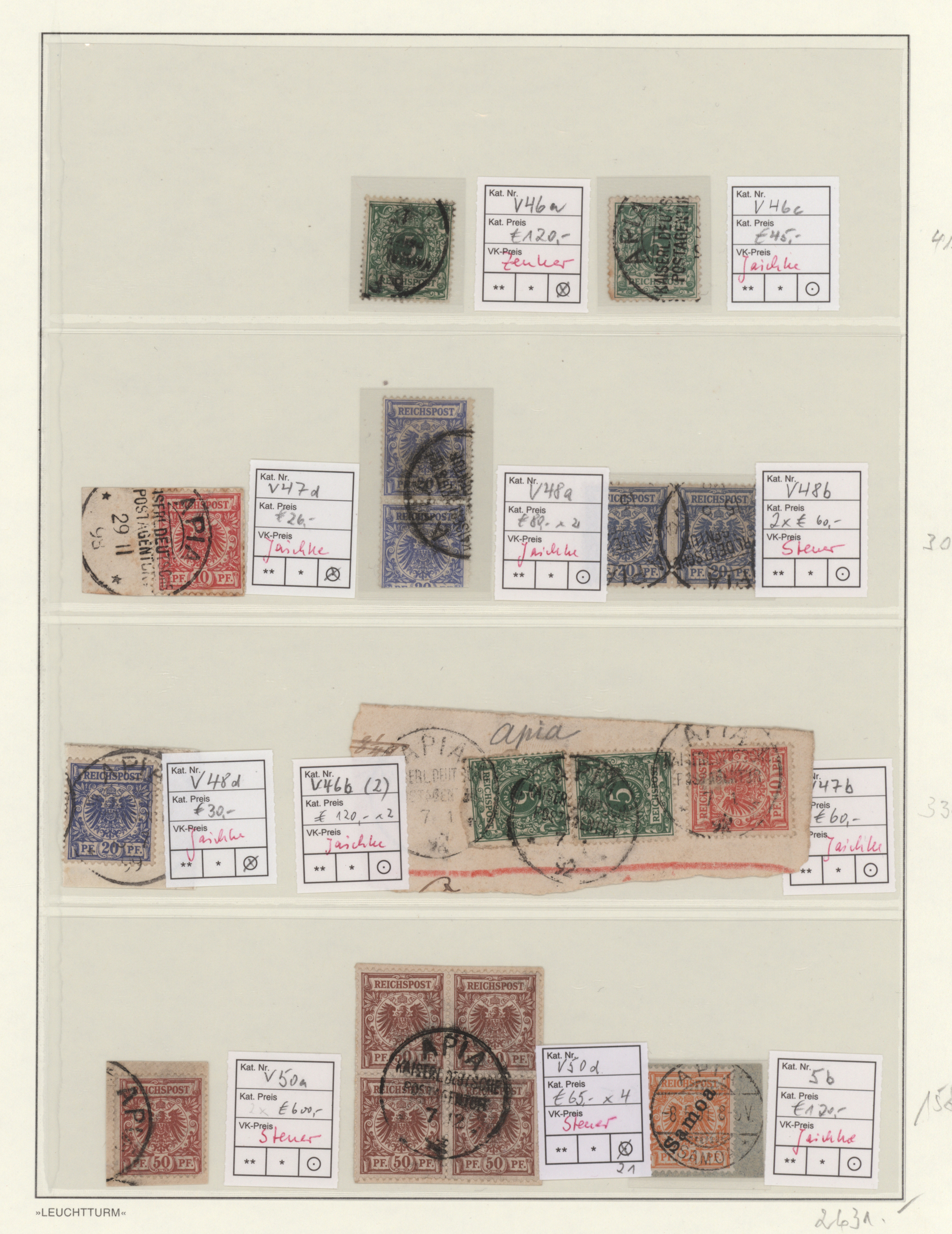 1903/1908, nette kleine Stempel-Spezialpartie mit 13 Marken NSW+Fiji, je entwertet mit deutschem Stempel "APIA" (von Schiffspostbriefen), ebenso Germania 5 Pfg. und 10 Pfg., ferner 1 Mark Schiffszeichnung mit reichsdeutscher Entwertung (Berlin?), usw.