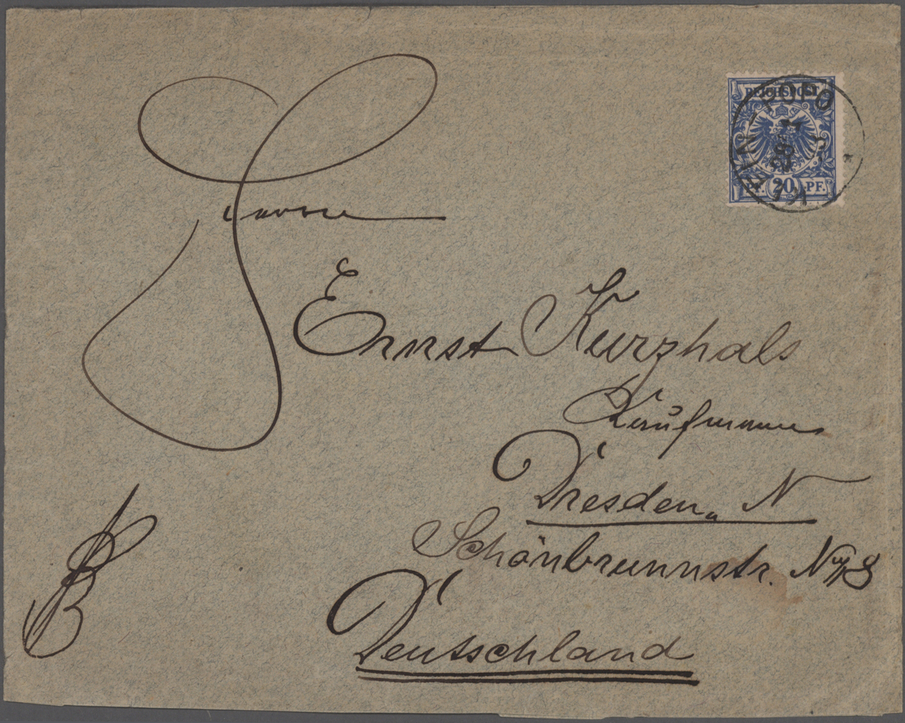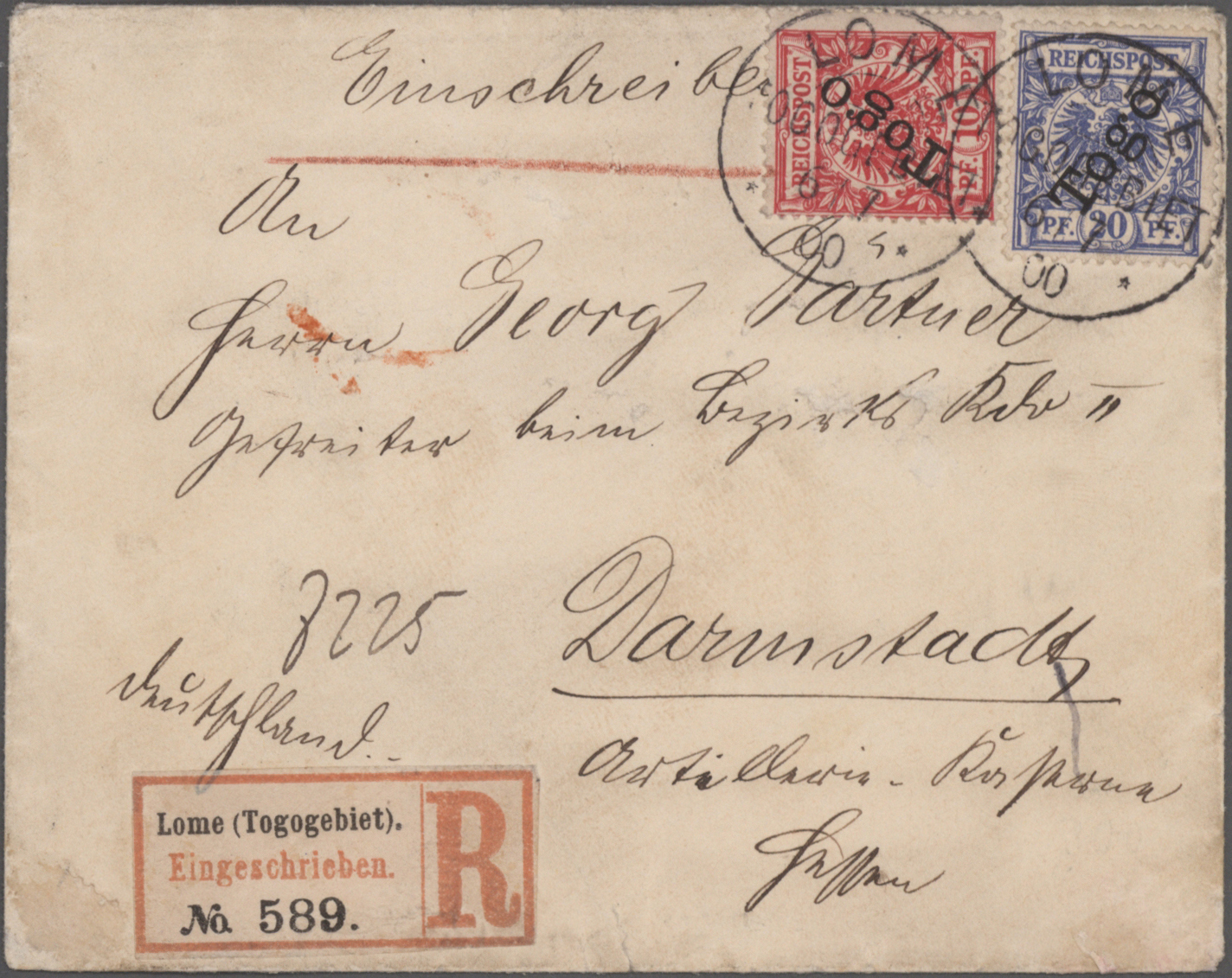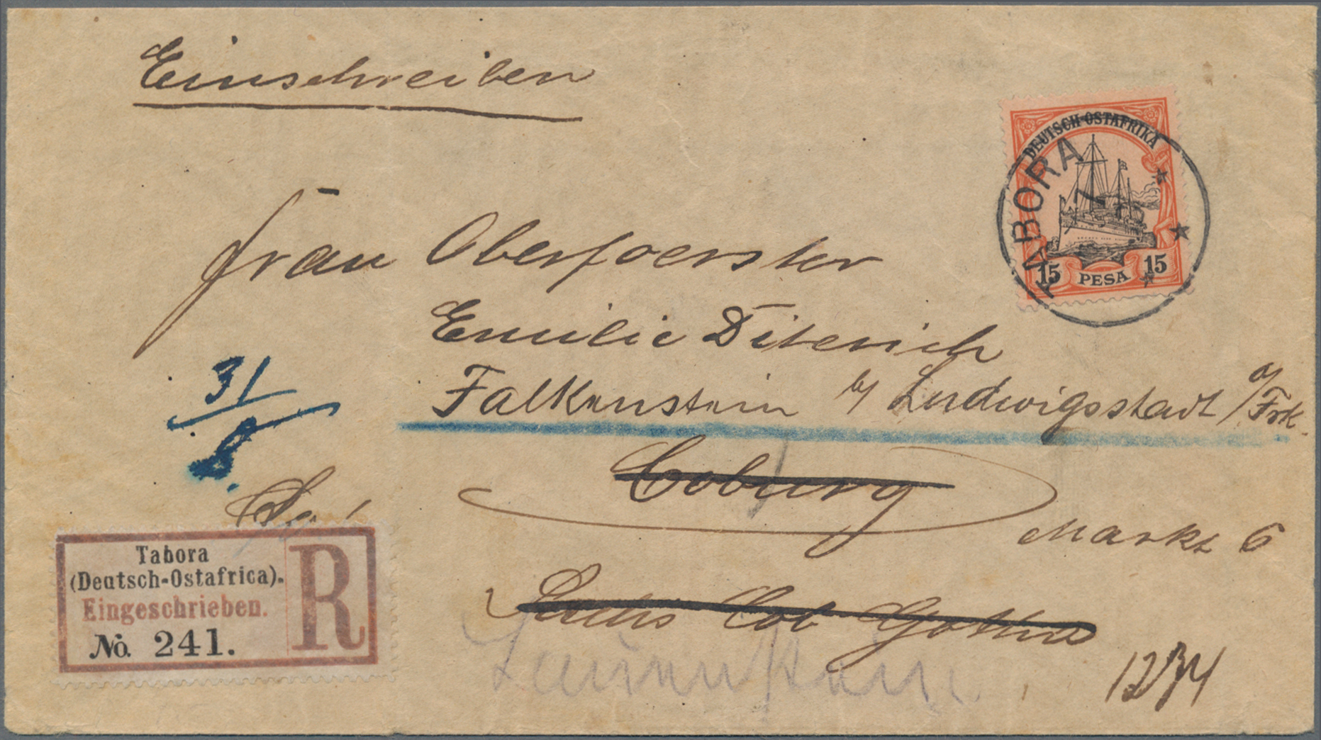 1896/1911, Postgebühren inkl. deren Änderungen: 13 Belege, dabei 5 Einschreibebriefe (1x Großformat von dem 2 Marken abgefallen sind), Ganzsachen, Postkarten, auch eine Postkarte aus Deutschland und ein Dienstpostbrief, innerhalb der Kolonie gelaufen. Eine Liste der Stücke mit Beschreibung der Tarife etc. ist beigefügt.
