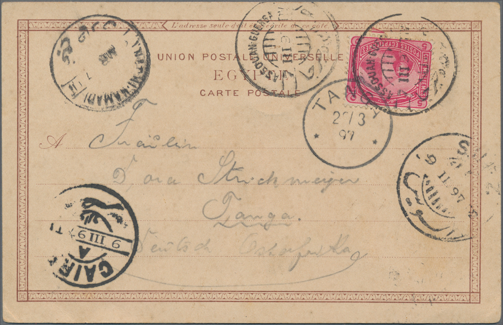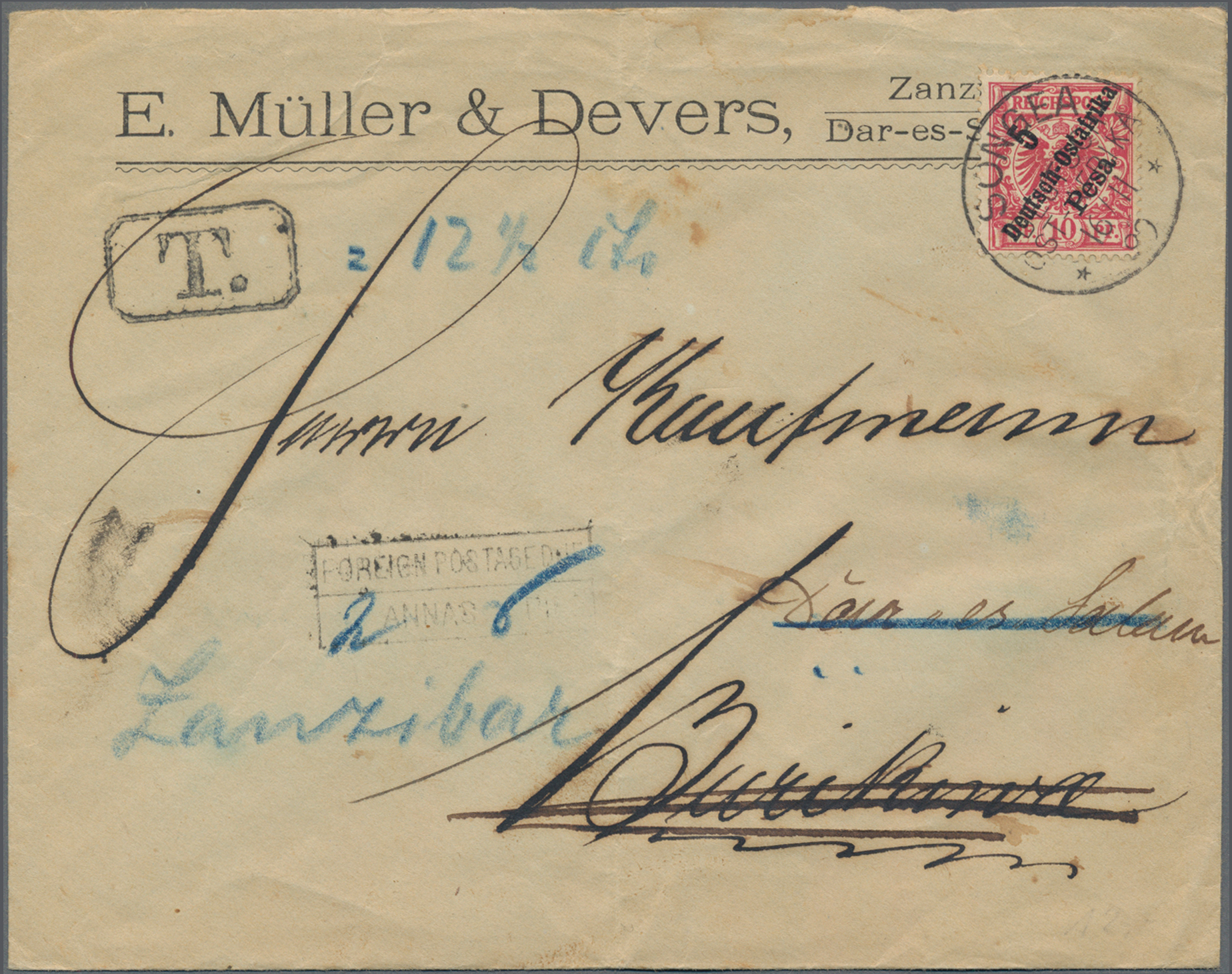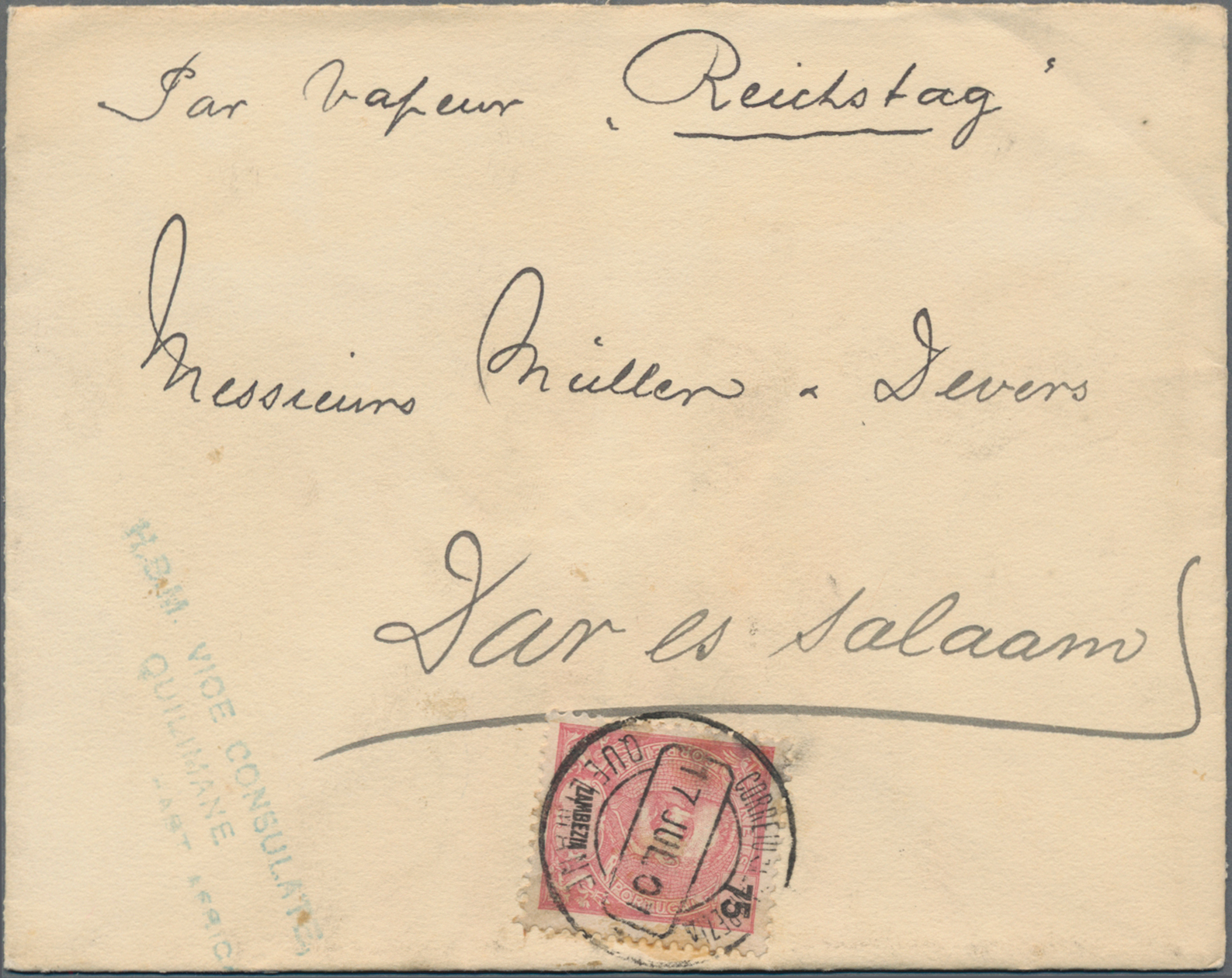 1896/1911, Postgebühren inkl. deren Änderungen: 13 Belege, dabei 5 Einschreibebriefe (1x Großformat von dem 2 Marken abgefallen sind), Ganzsachen, Postkarten, auch eine Postkarte aus Deutschland und ein Dienstpostbrief, innerhalb der Kolonie gelaufen. Eine Liste der Stücke mit Beschreibung der Tarife etc. ist beigefügt.