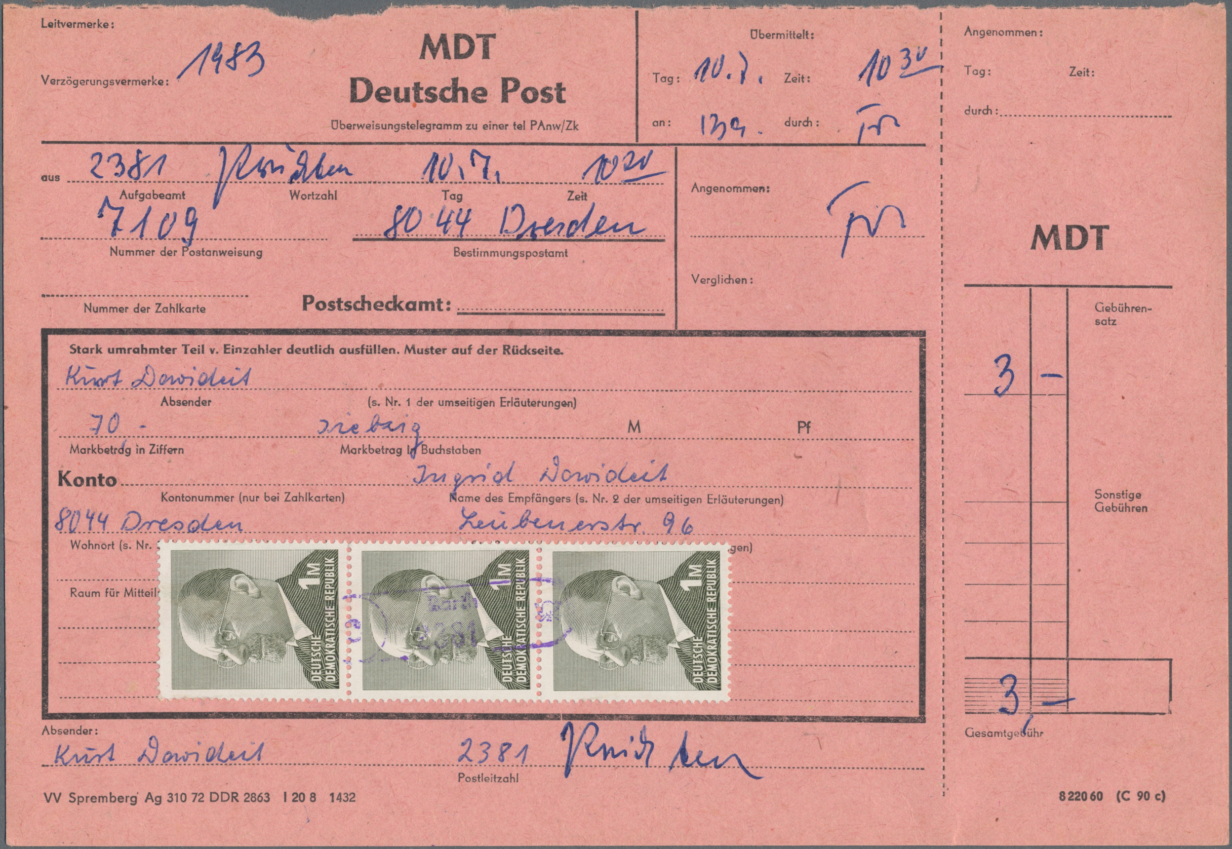 1973/1987, Lot von 27 Bedarfsbelegen meist des Geldverkehrs, dabei 16 (meist unfrankierte) Postanweisungen sowie acht frankierte Überweisungstelegramme, hier mit MiNr. 937 MeF
