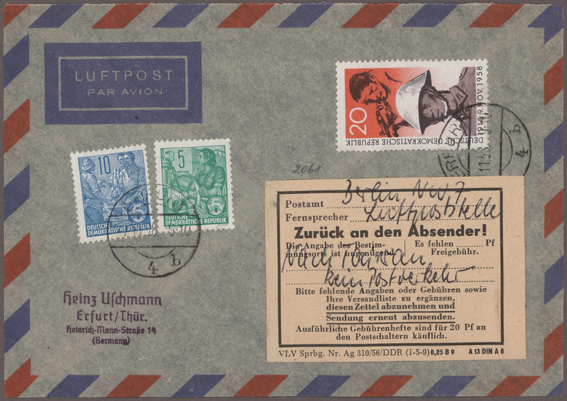 1958, 20 Pfg. Oktoberrevolution "Pappchinese", Lot von zwölf Briefen und Karten mit Stempeldaten 7.11. (3), 8.11. (5), 9.11., 17.11., 20.11., 21.11. (je einmal), dabei