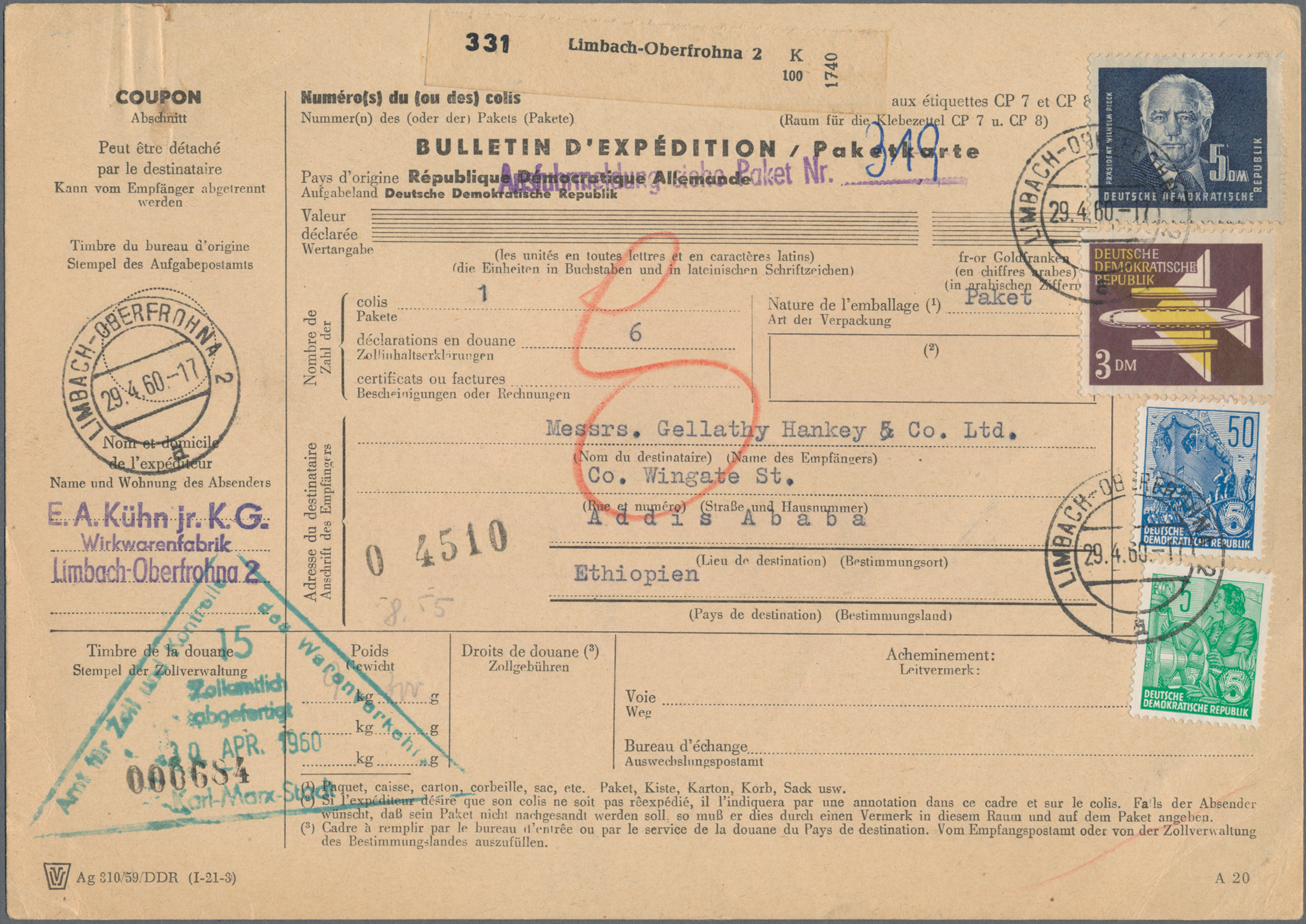 1956/1960, Partie von 21 vollständigen Paketkarten nach Äthiopien, alle frankiert mit Markwerten Pieck 1 DM bis 5 DM, übliche Bedarfsspuren. (Ex. Germenis)