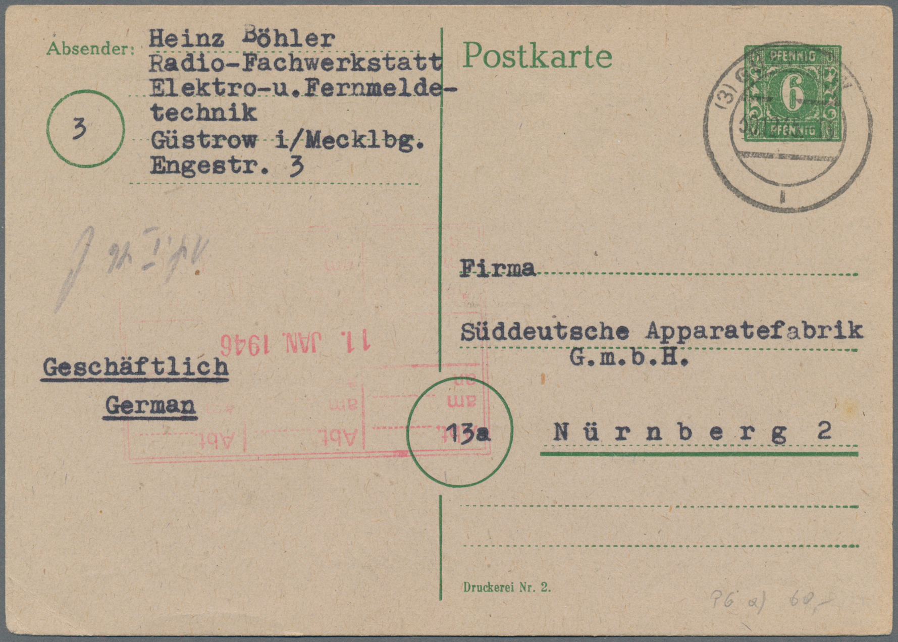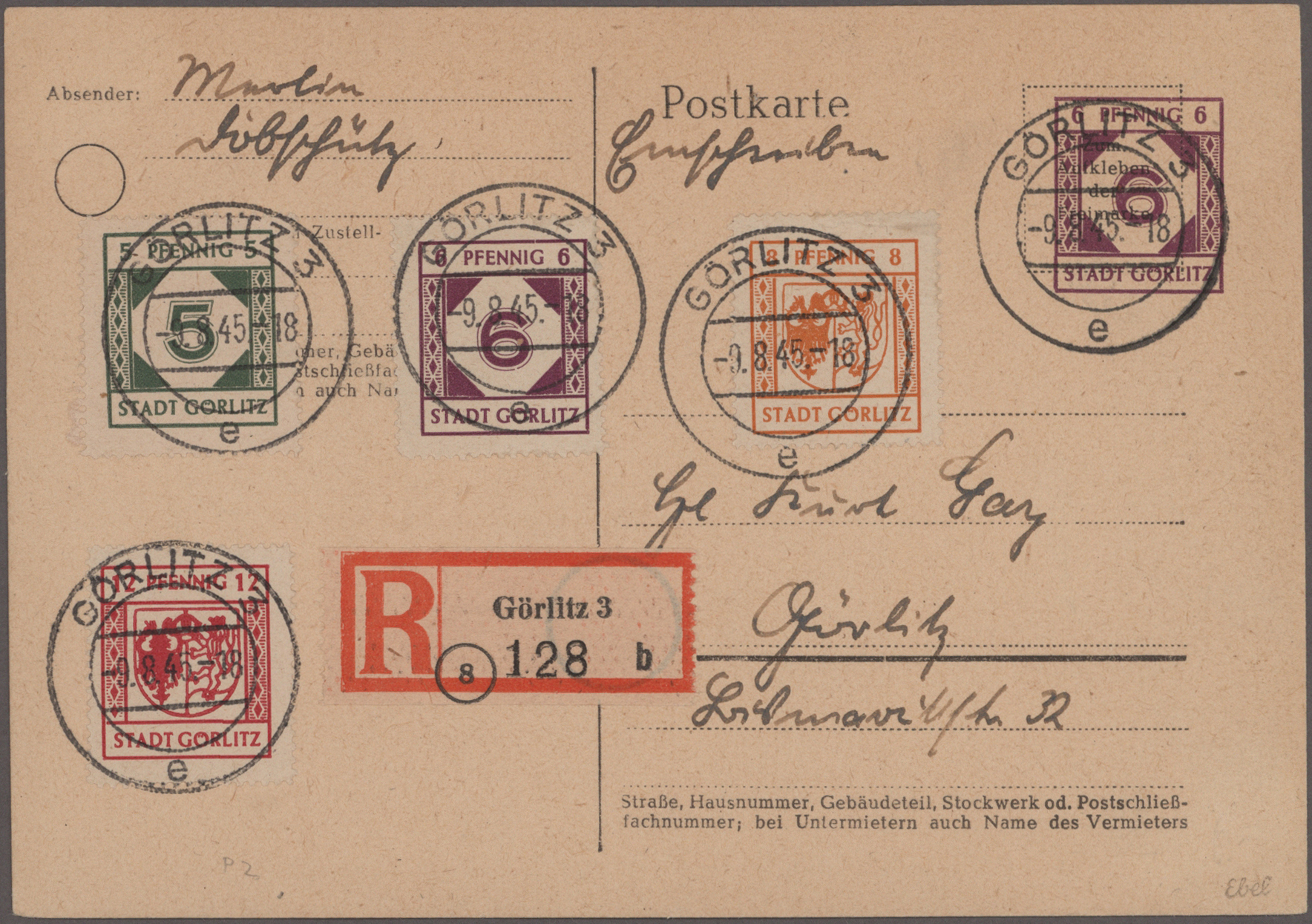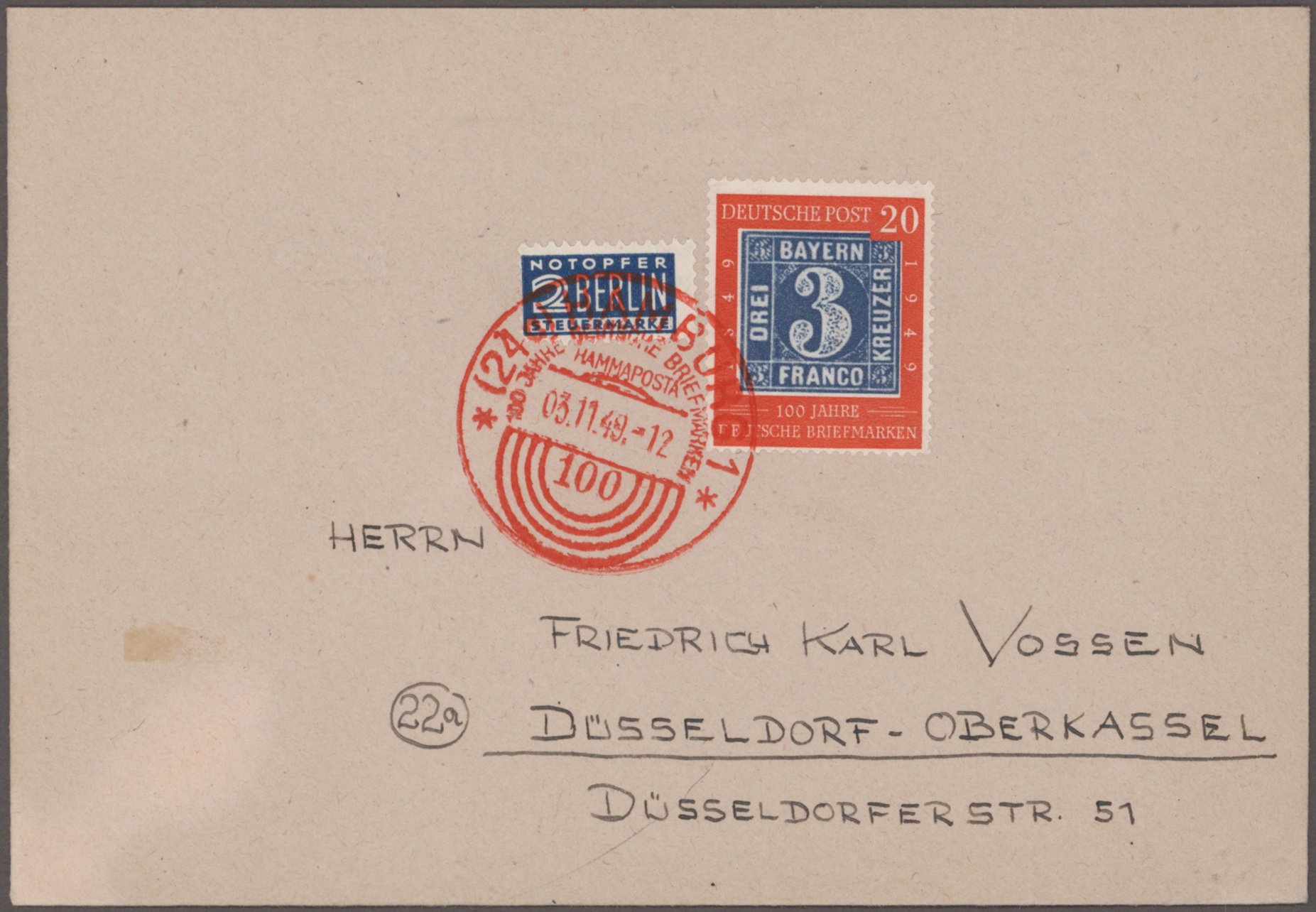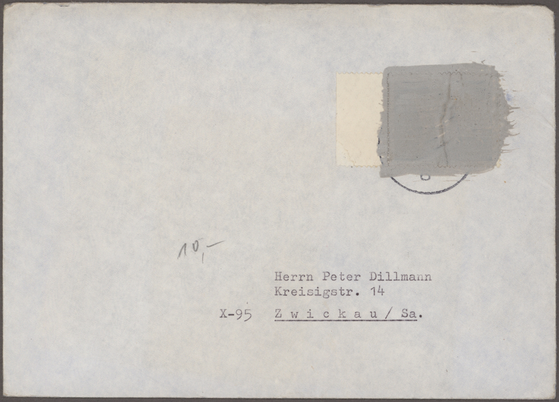 1945/1948, Partie von zehn Belegen mit Frankaturen Kontrollrat, Bizone, SBZ, Schwarzaufdruck, u.a. Ganszachenkarte als Zehnfach, 50 Pfg. Arbeiter P OR dgz., etc. Ein nettes Los!