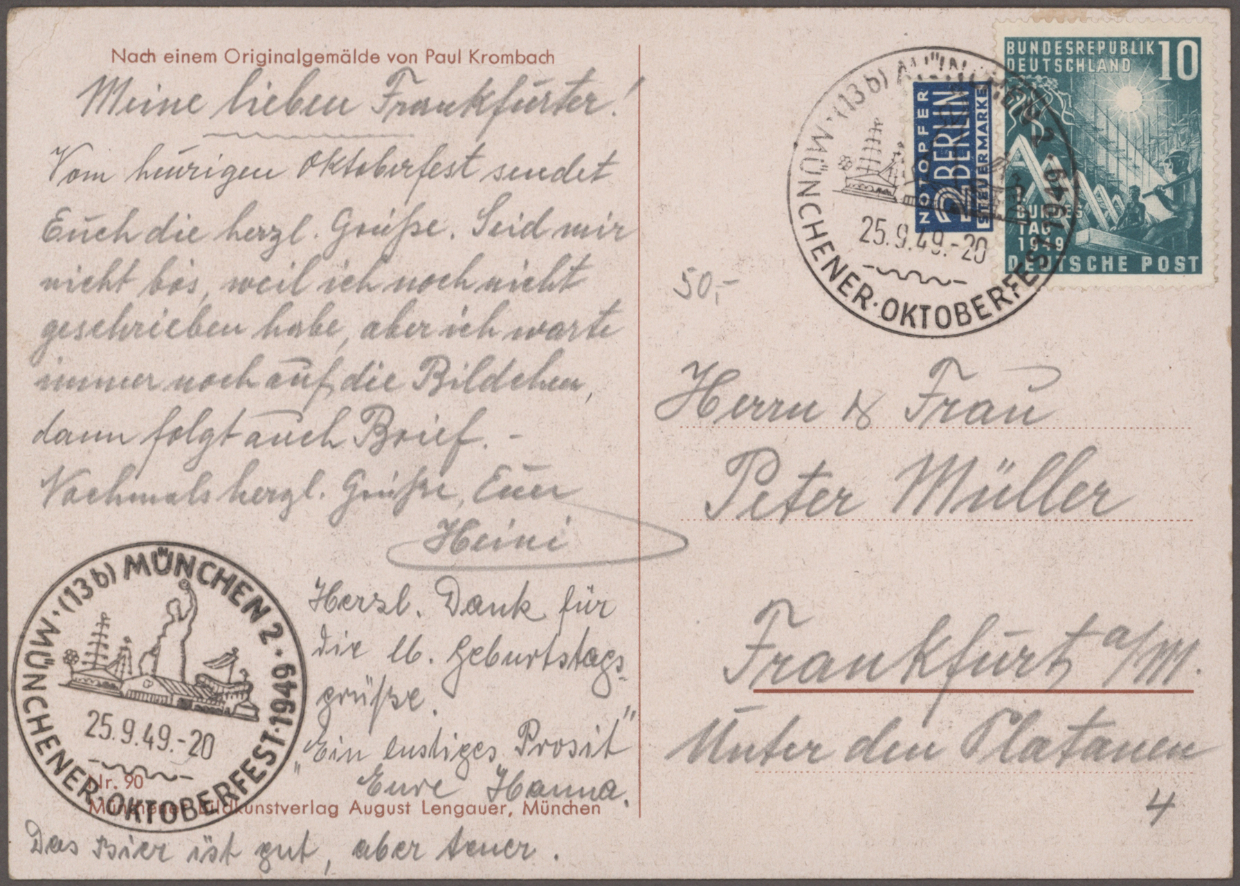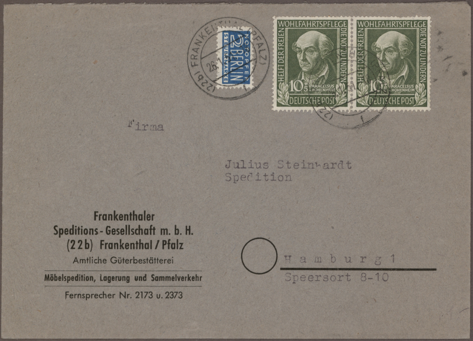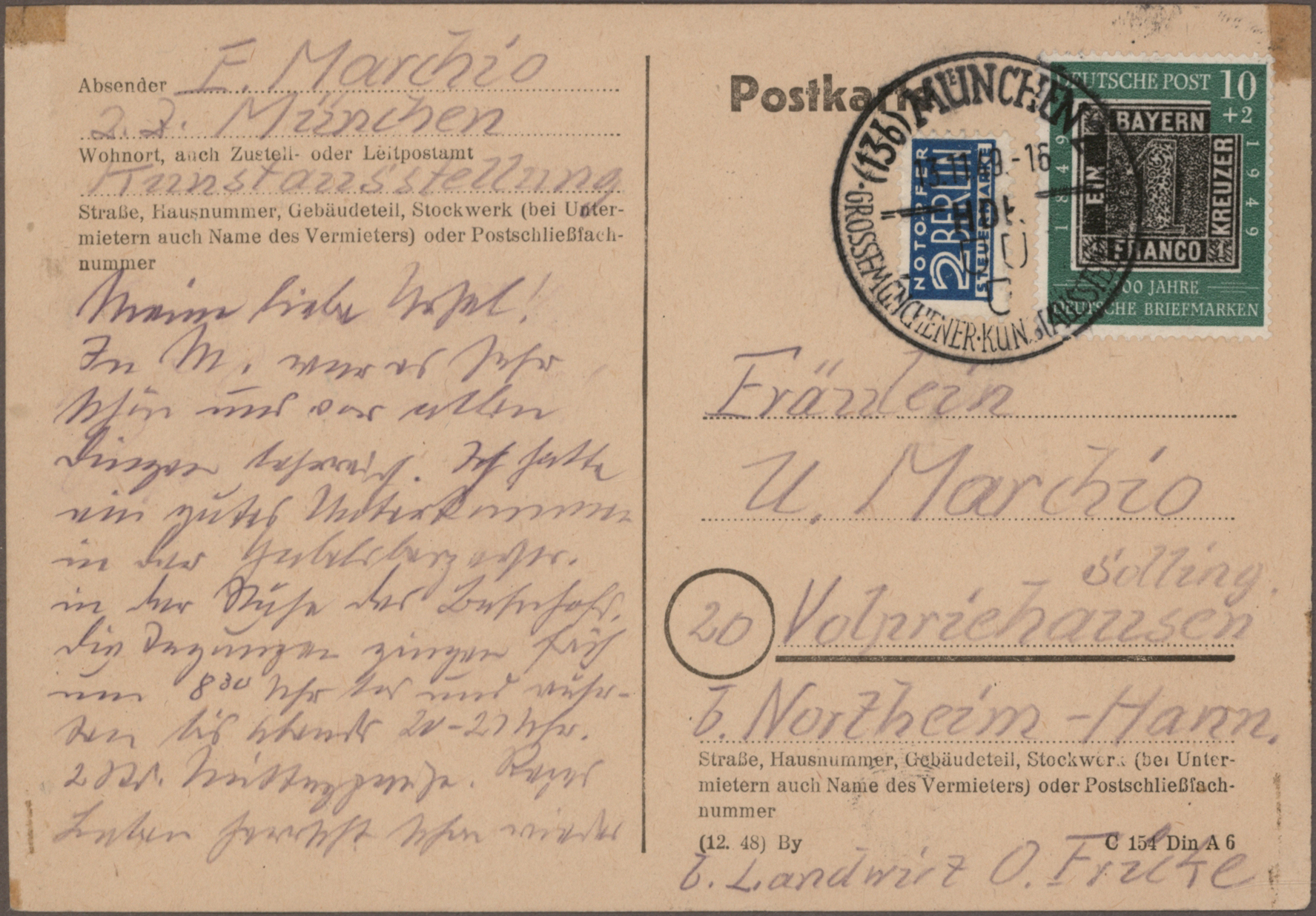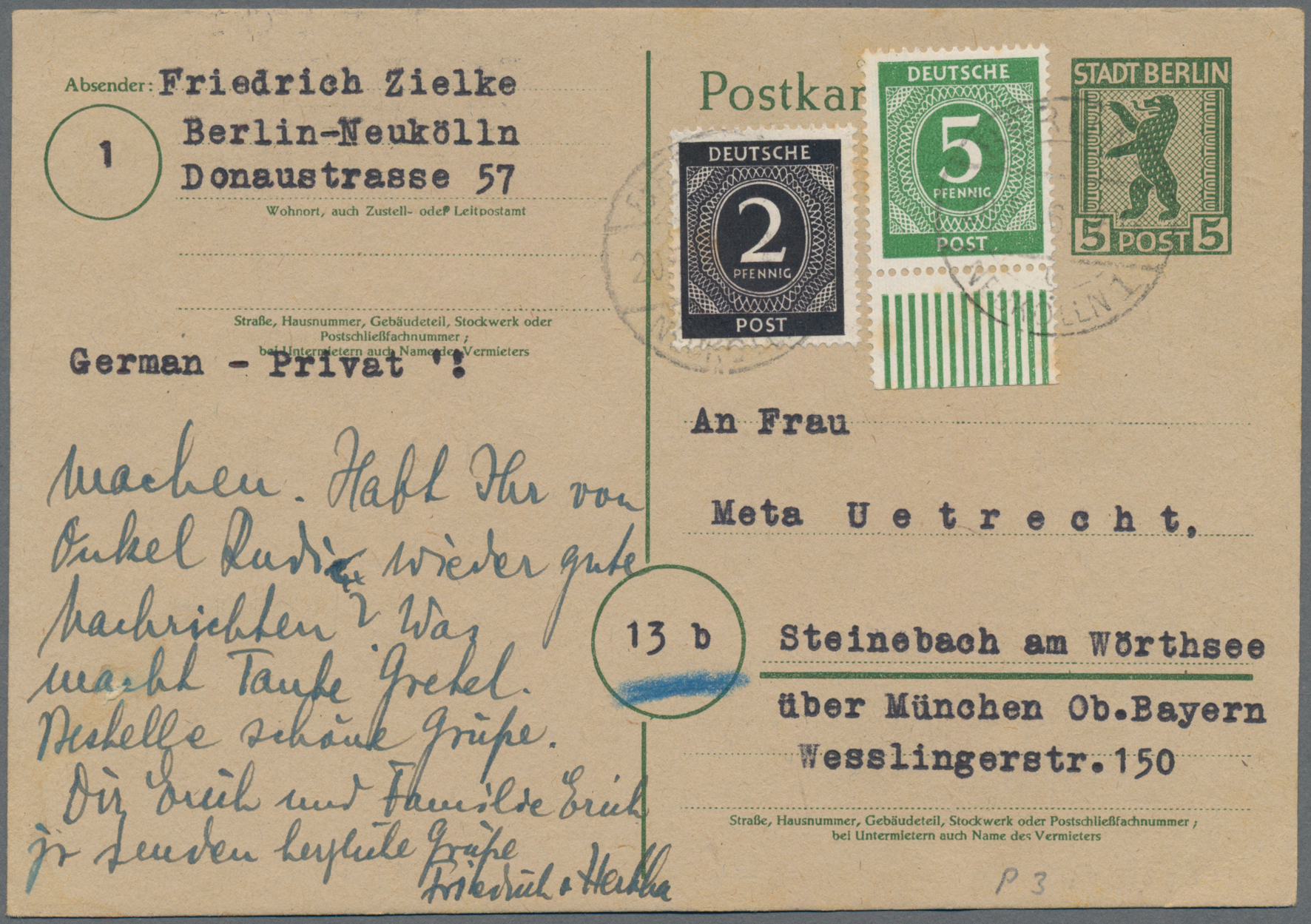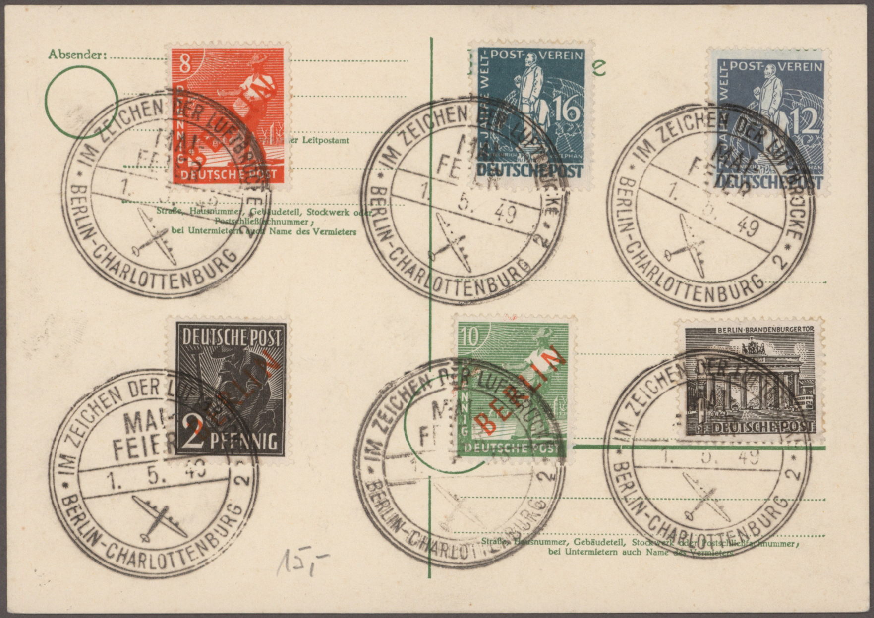 1945/1948, Partie von zehn Belegen mit Frankaturen Kontrollrat, Bizone, SBZ, Schwarzaufdruck, u.a. Ganszachenkarte als Zehnfach, 50 Pfg. Arbeiter P OR dgz., etc. Ein nettes Los!