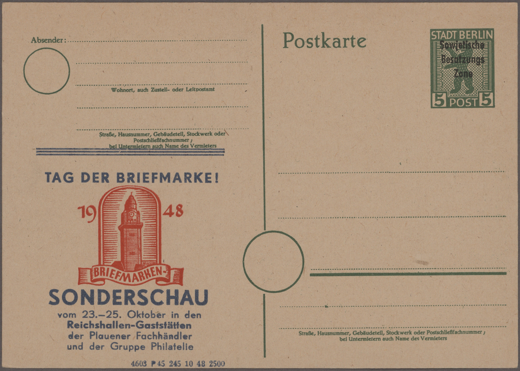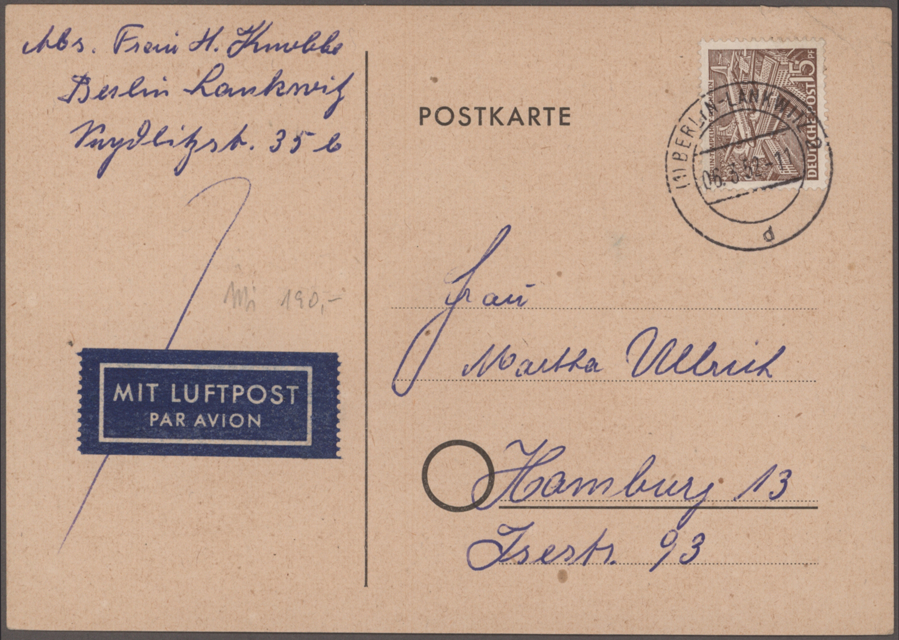 1946/1990, umfangreiche Sammlung von ca. 690 amtlichen Ganzsachenkarten mit privaten Zudrucken, meist ungebraucht bzw. blanko gestempelt, ab etwas SBZ/All.Besetzung, guter Teil frühe Ausgaben mit Pieck und Ulbricht, 10 Pfg. Große Bauwerke, 10 Pfg. grün und 10 Pfg. orange Kleine Bauwerke, alles in guter Vielfalt und Sortierung gesammelt. Ein empfehlenswertes Objekt in durchweg sauberer Erhaltung!