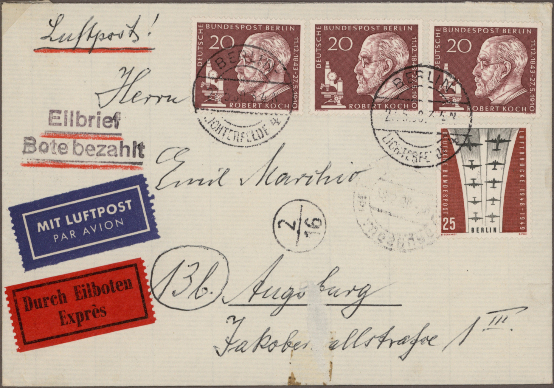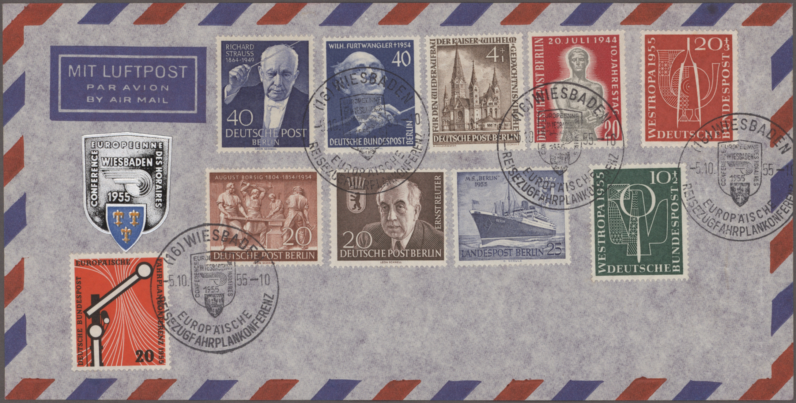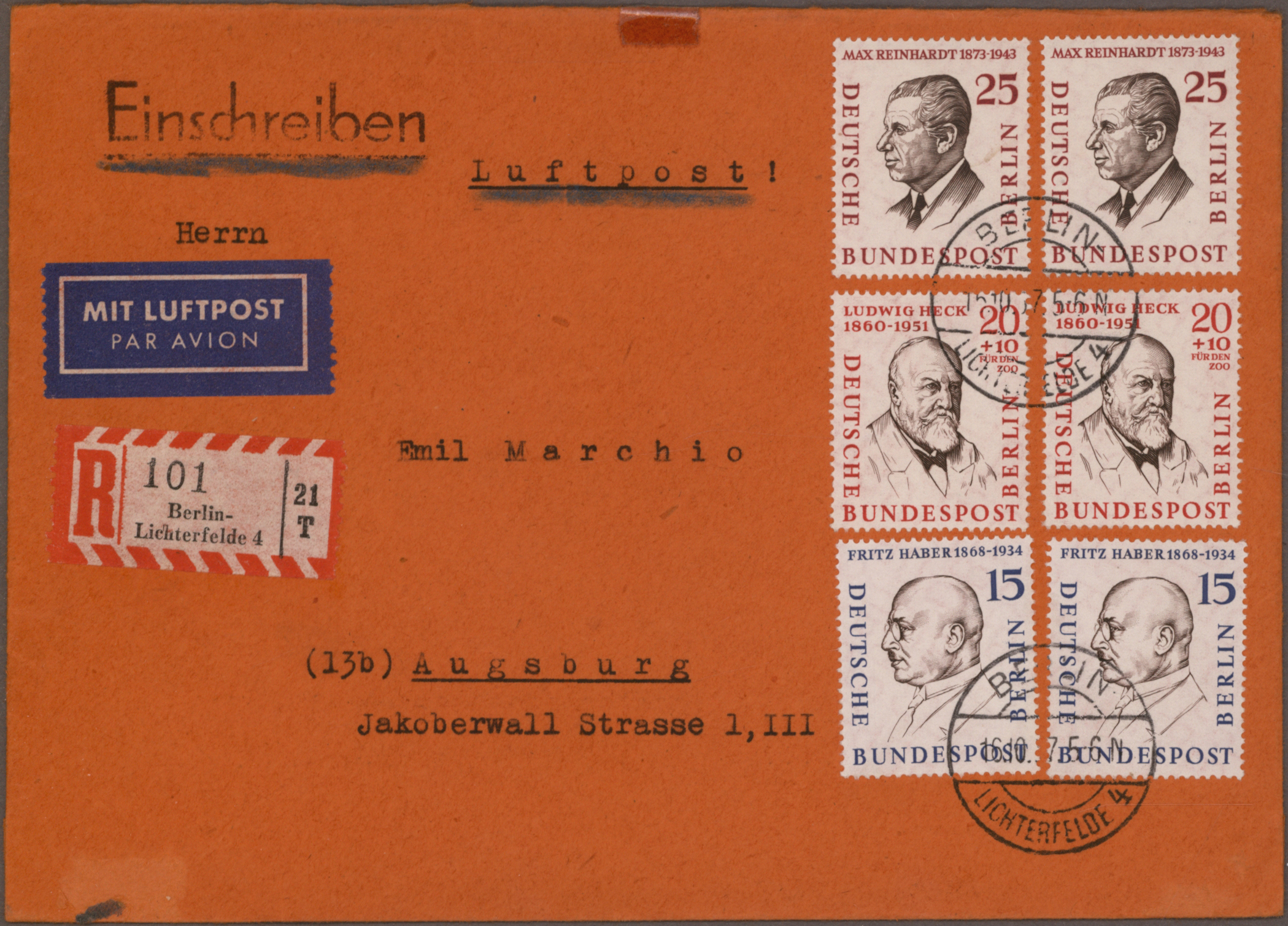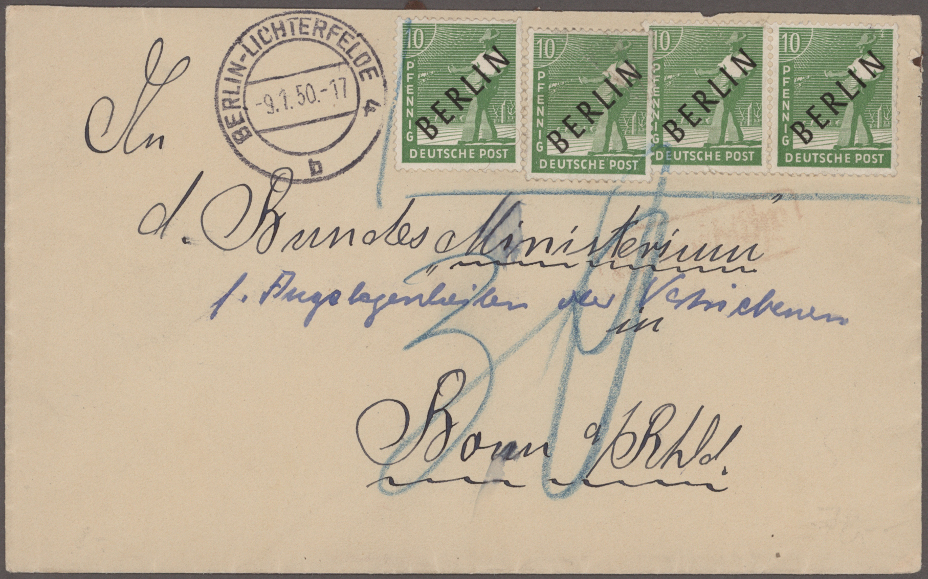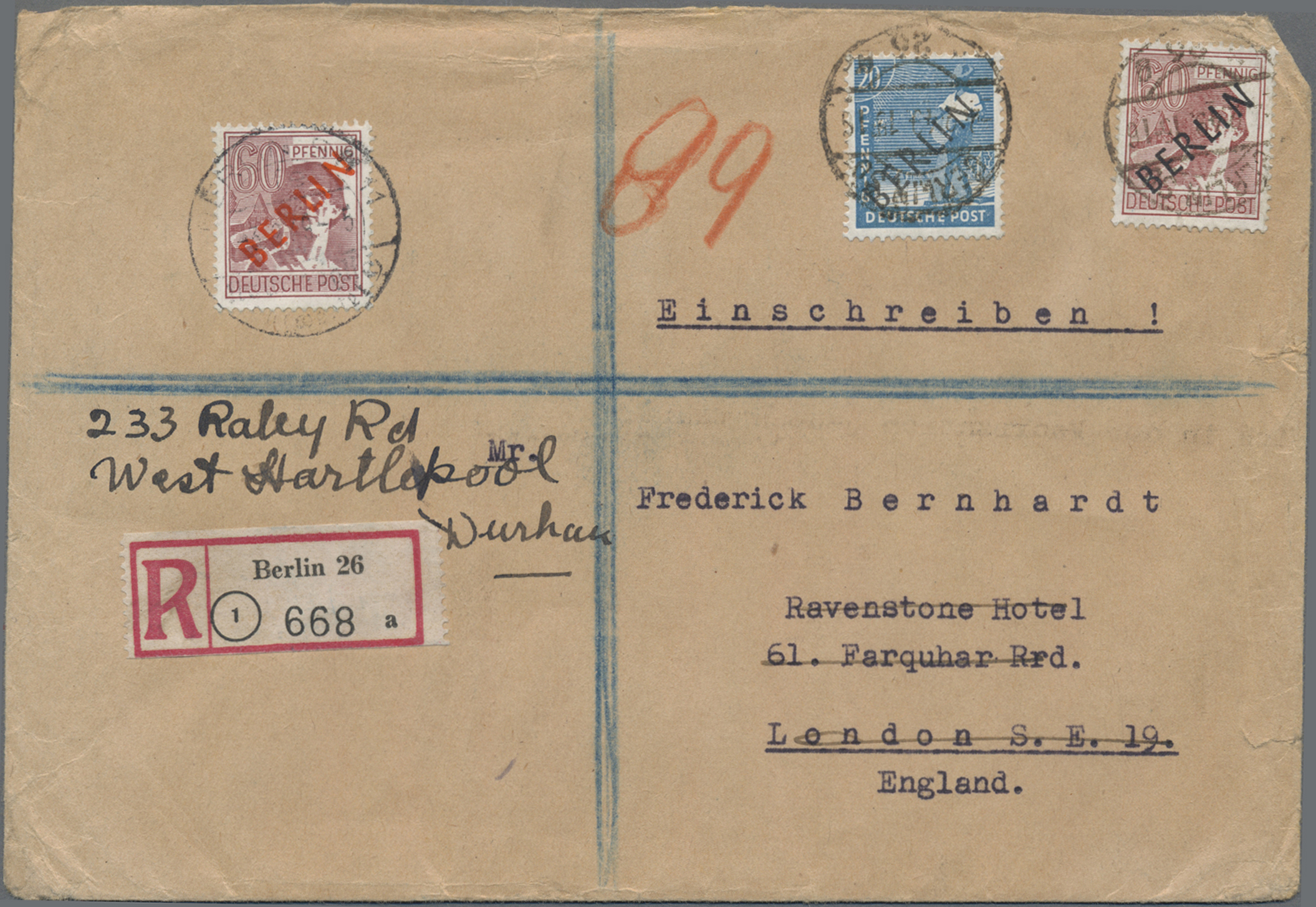 1948/1966, nette Partie, dabei Bund-Markenheftchen ab Heuss, Berlin mit zehn Belegen, u.a. Mischfrankatur Schwarz-/Rotaufdruck auf R-Brief der 2.Gewichtsstufe 3.2.49 nach London.
