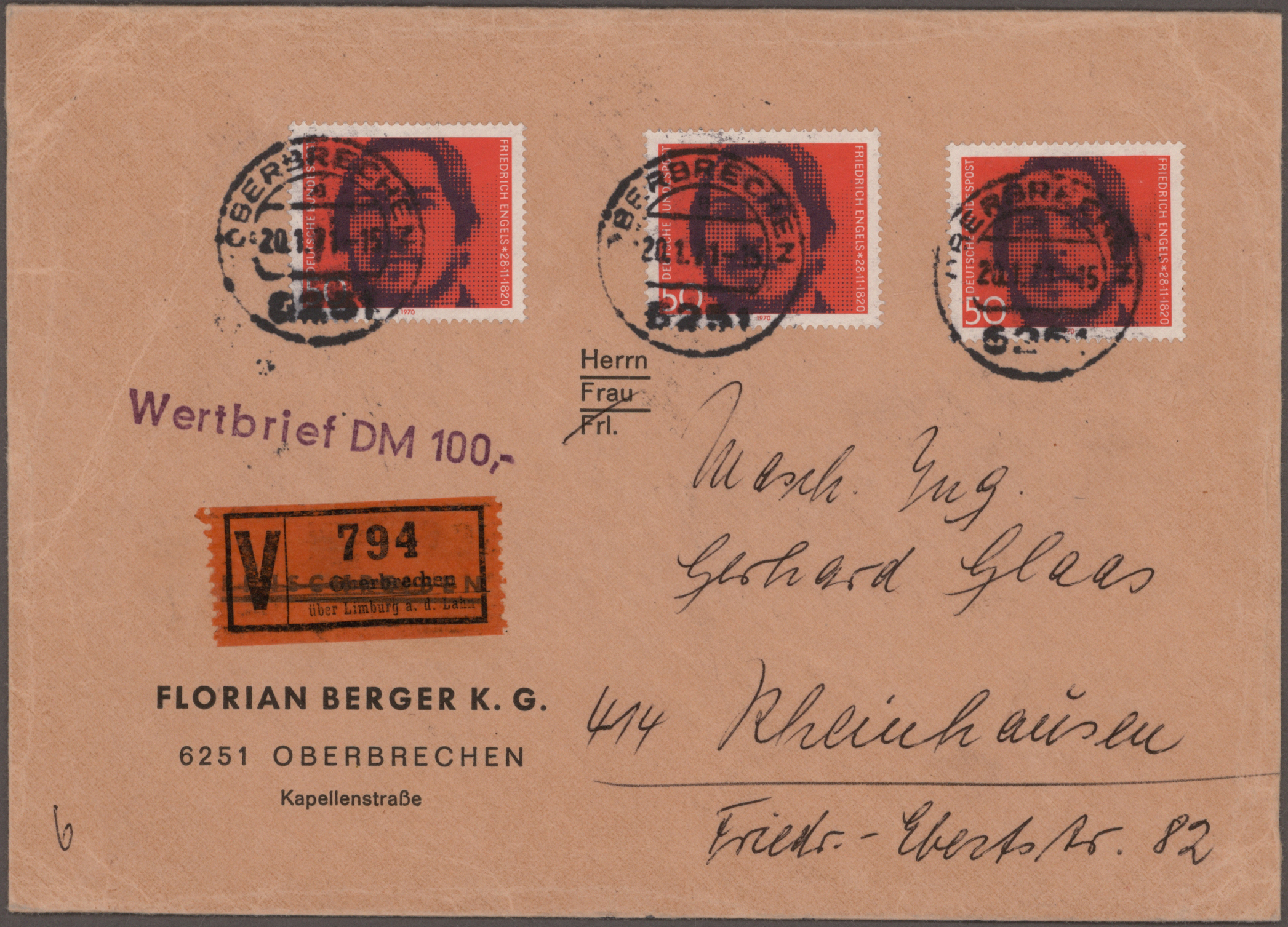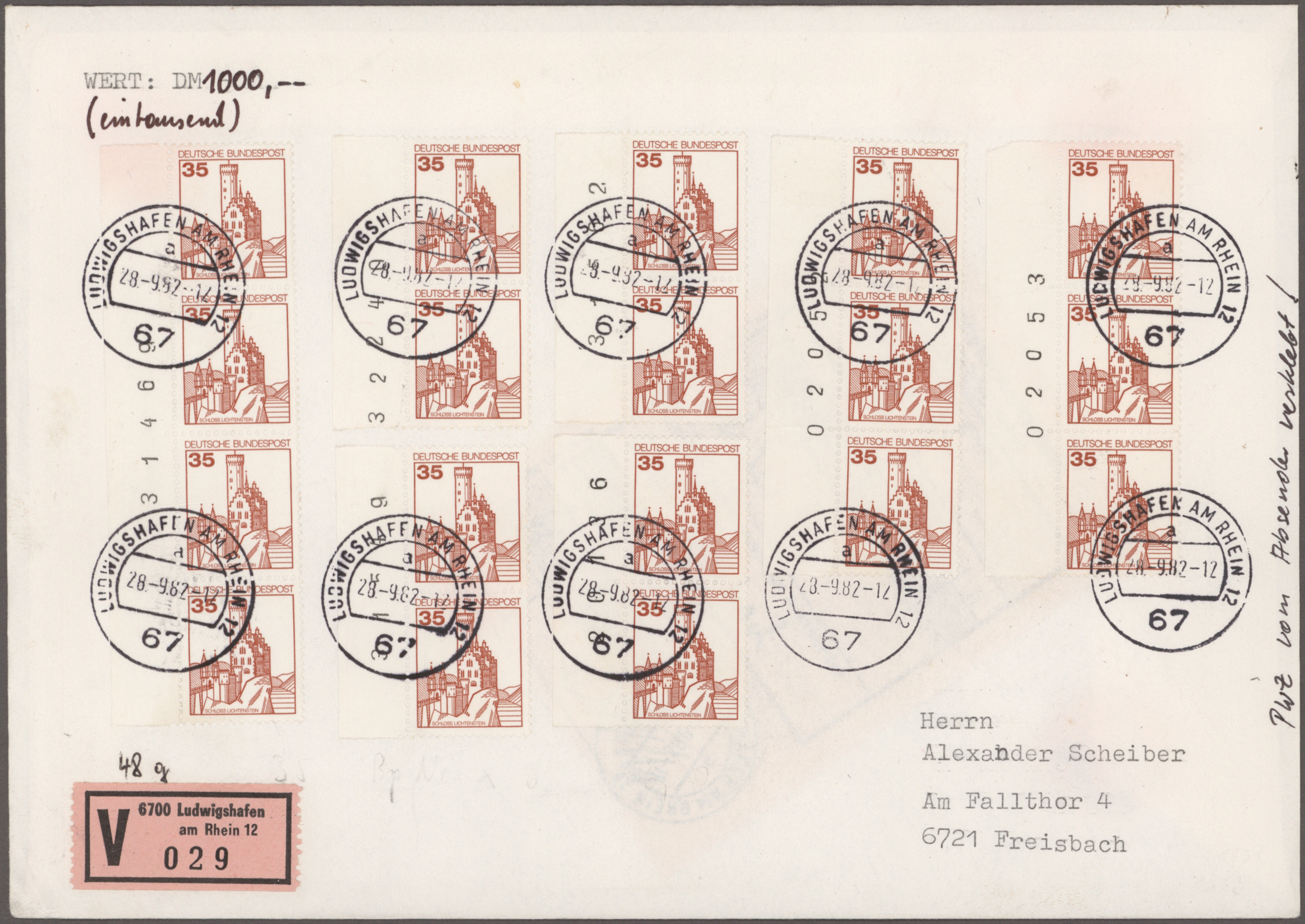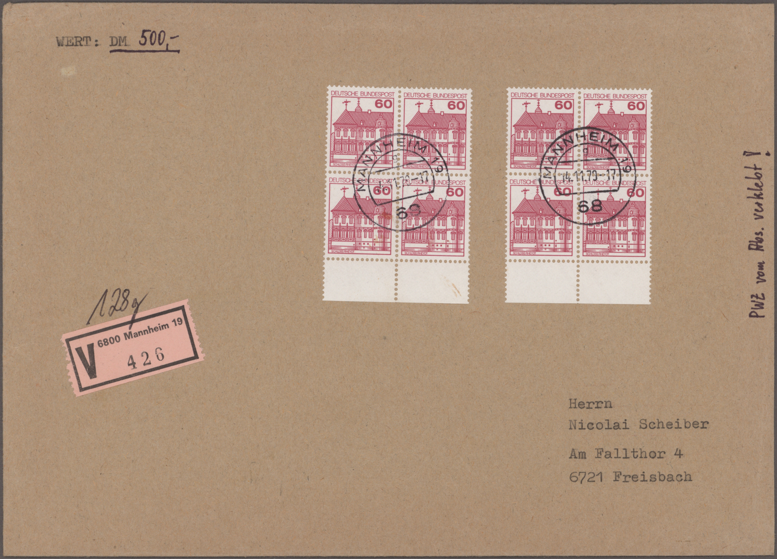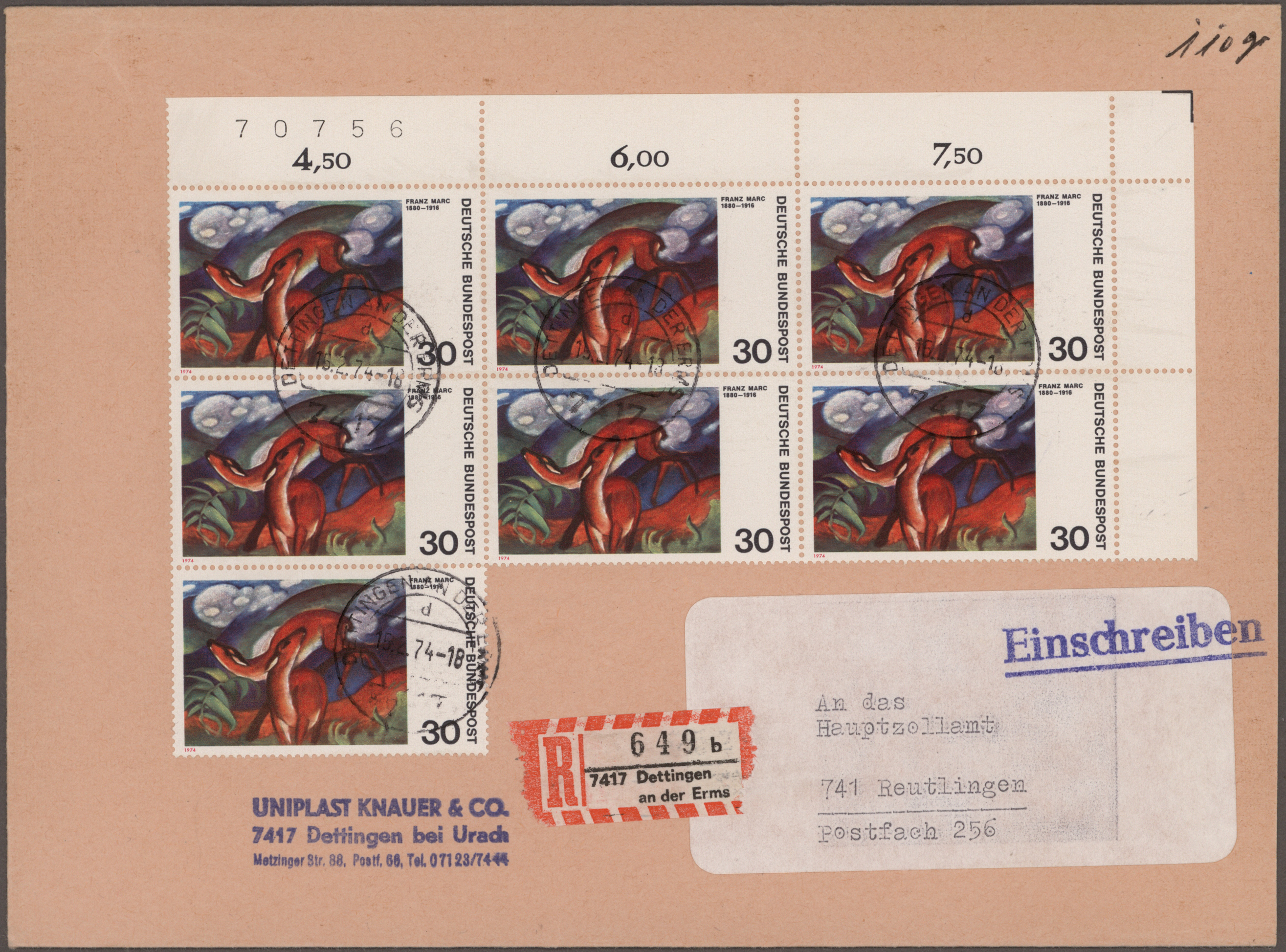 1948/2014 (ca.), interessanter Posten von ungefähr 110 Belegen Bund(ca. 97 St.) und Berlin(13 St.) in beschrifteten Loshüllen mit guten und besseren Einzel-, Mehrfach-, Vielfach- und Mischfrankaturen sowie vielen verschiedenen Verwendungen, Destinationen und Besonderheiten. Spannende Partie für den Spezialisten, auch zum Detaillieren geeignet!