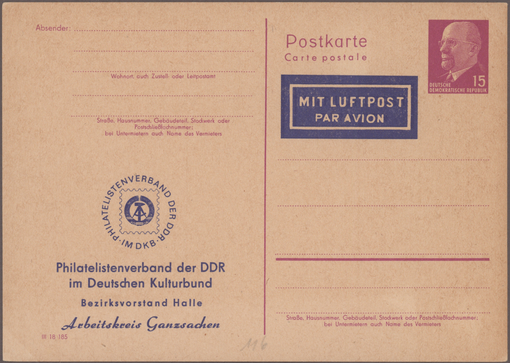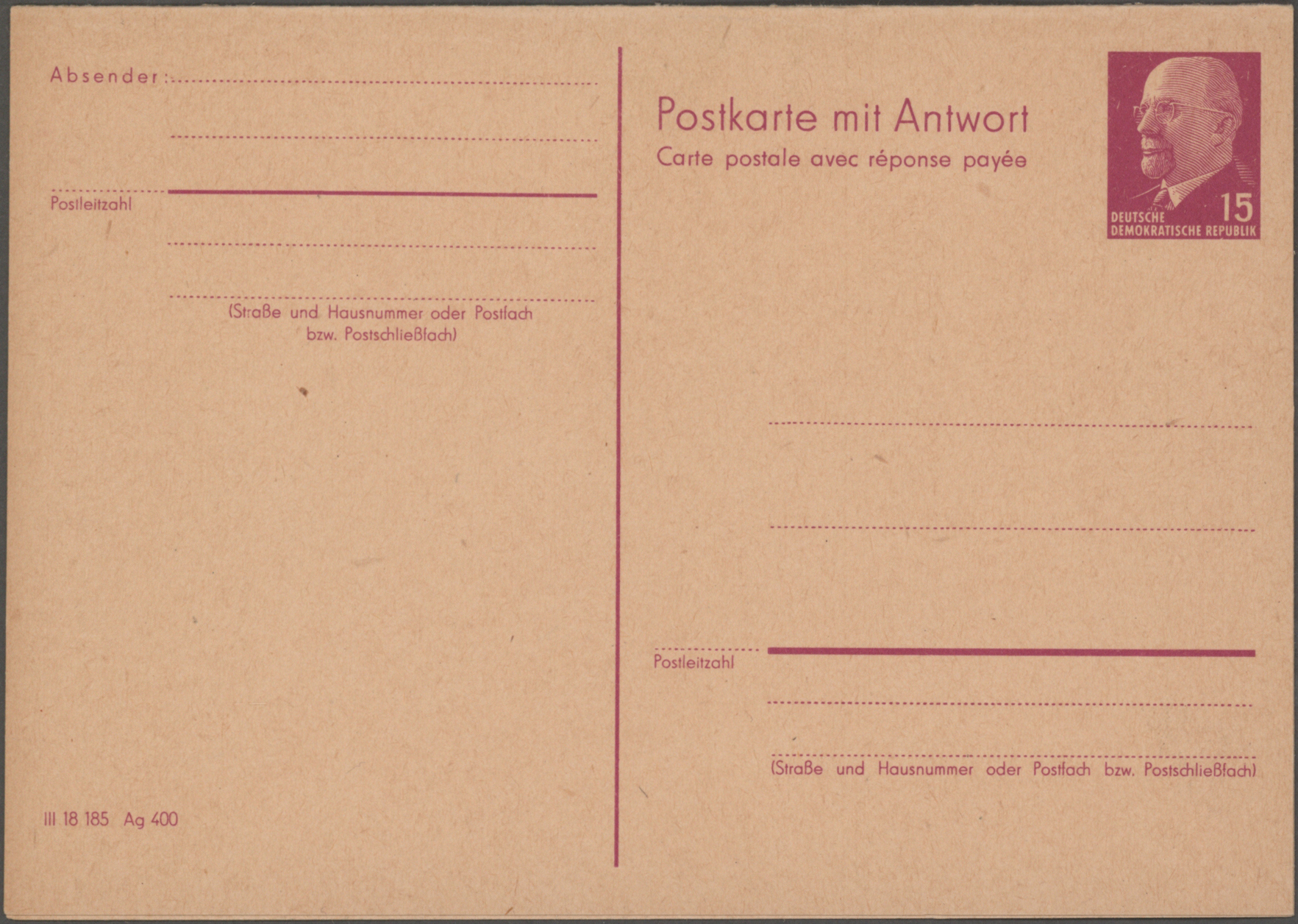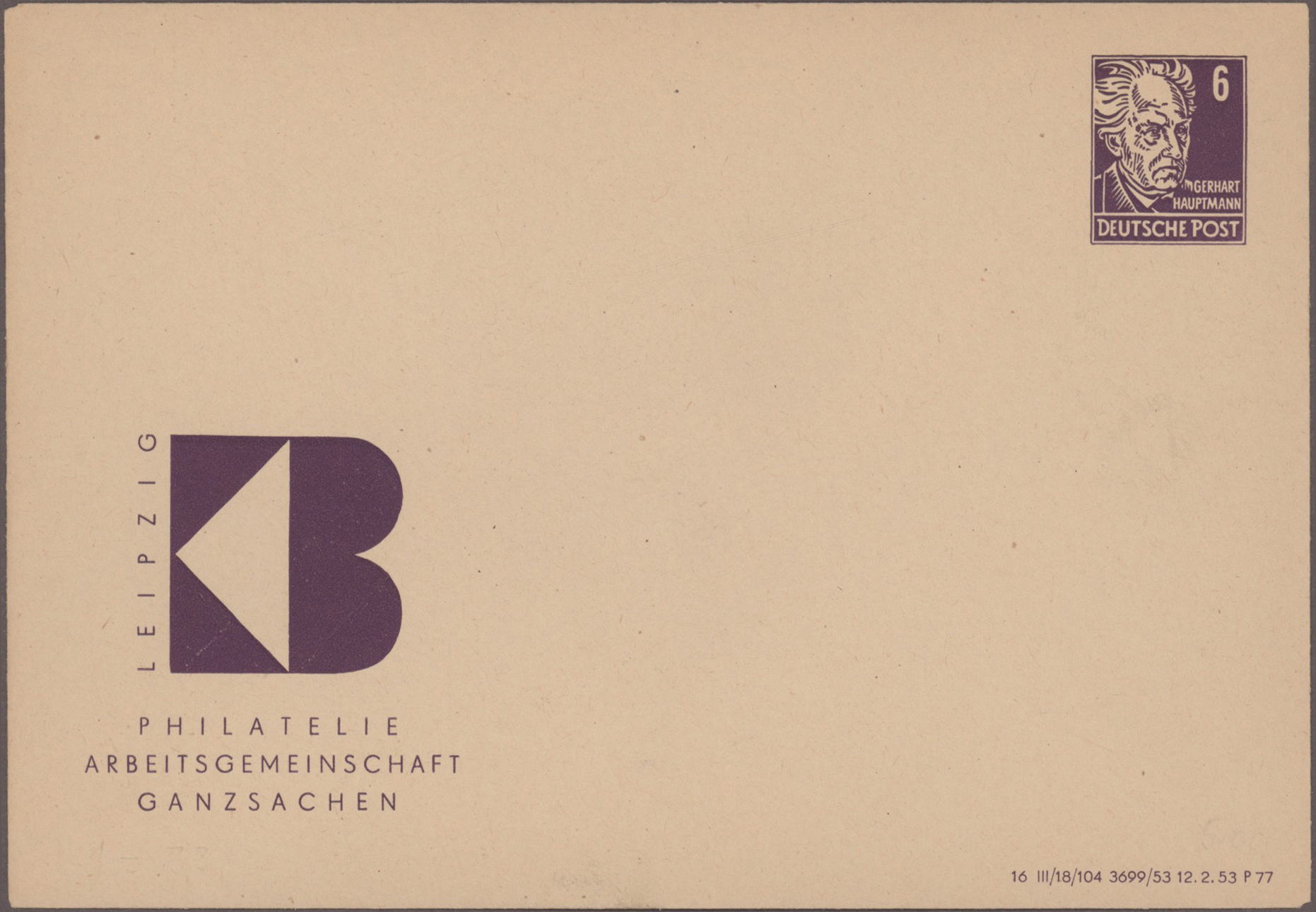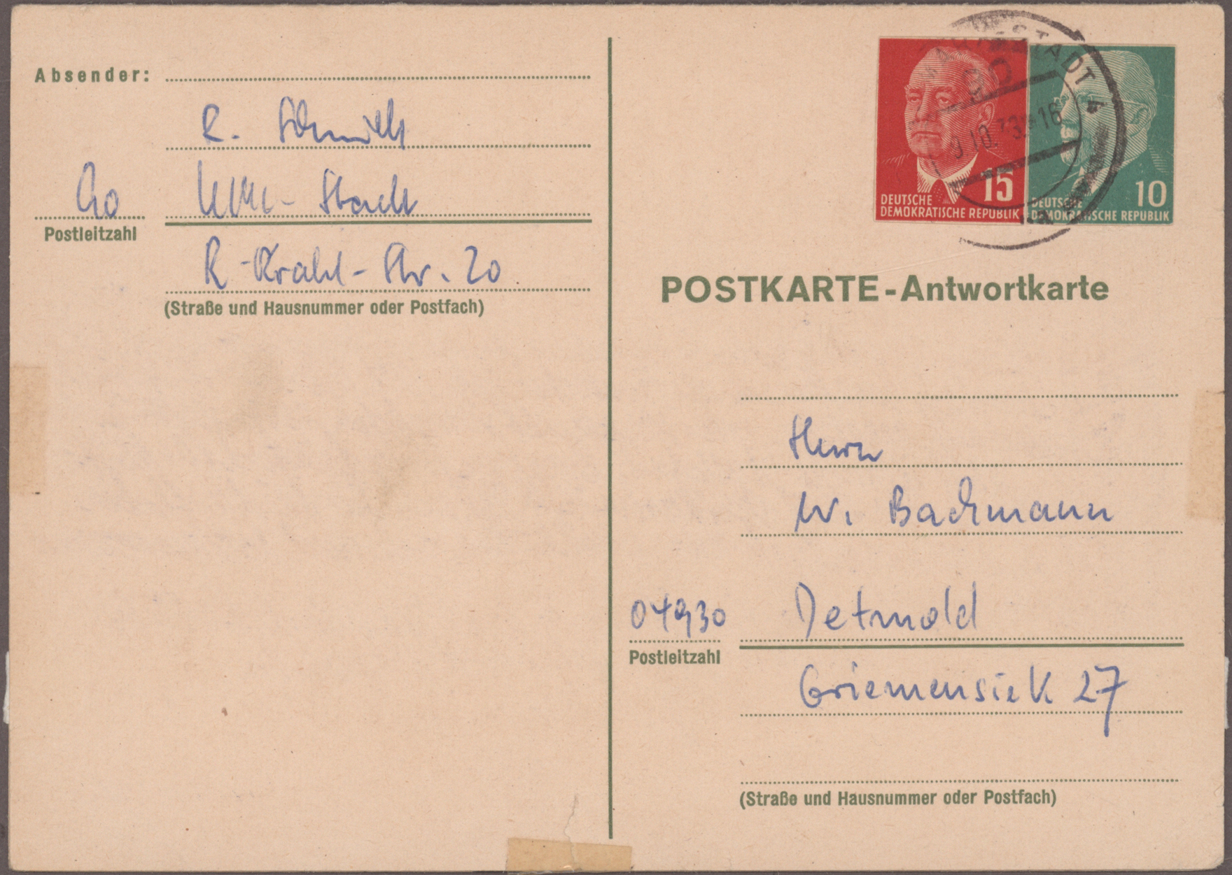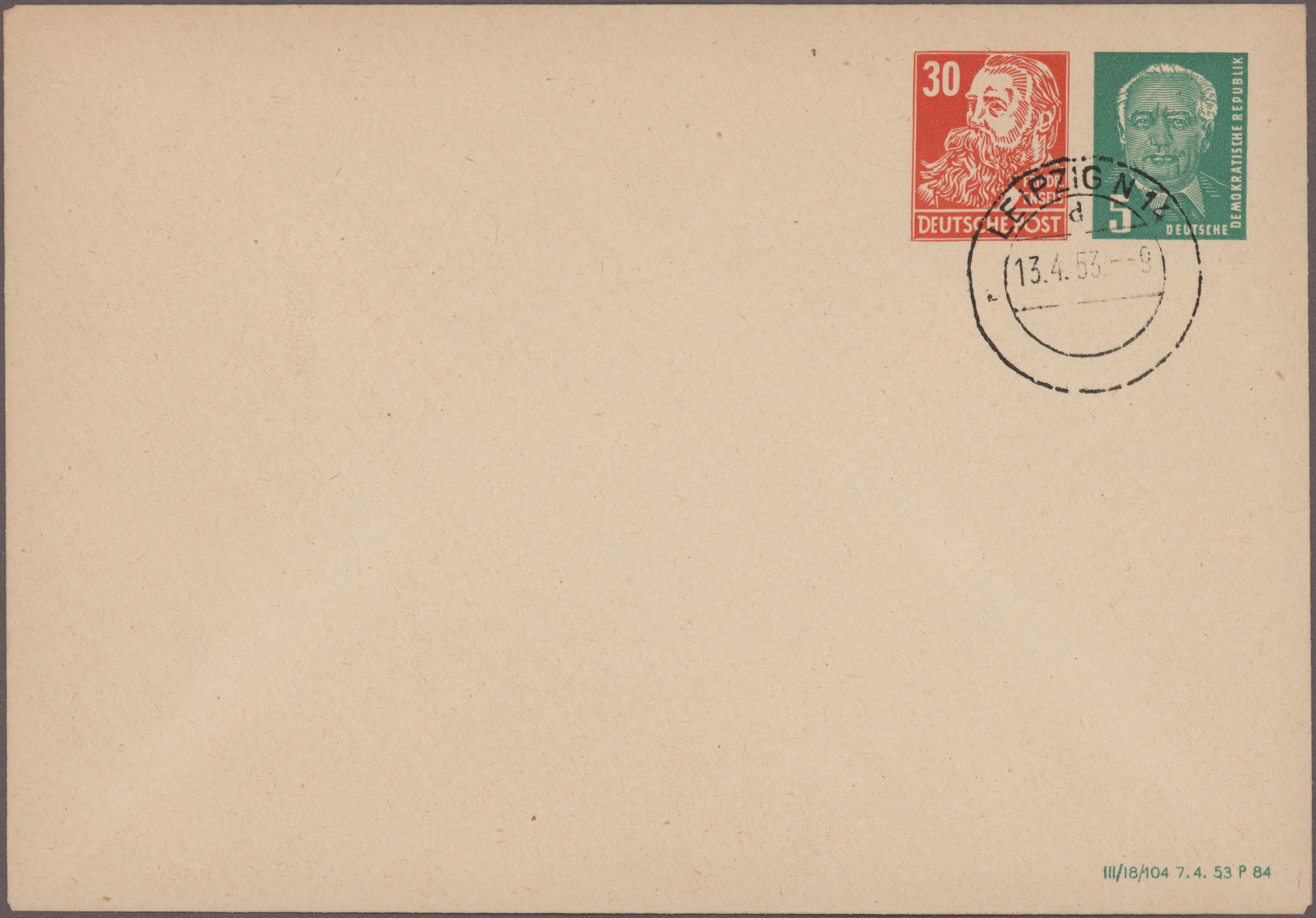 1949/1991, vielseitiger Bestand von über 630 Ganzsachen mit Karten, Antwortkarten und Umschlägen, gebraucht/ungebraucht/blanko gestempelt, dabei etliche Zusatzfrankaturen, auch GAA, R-SbPA, Privat-GA/private Zudrucke, Luftpost, Muster, verschiedene Cachet-Stempel "Weltfestspiele 1951", P 86 mit Aufdruck "3" über "1" der Wertziffer (Probedruck-Umwertung 1990 ??) etc. Sehr interessanter Bestand für den Spezialisten!