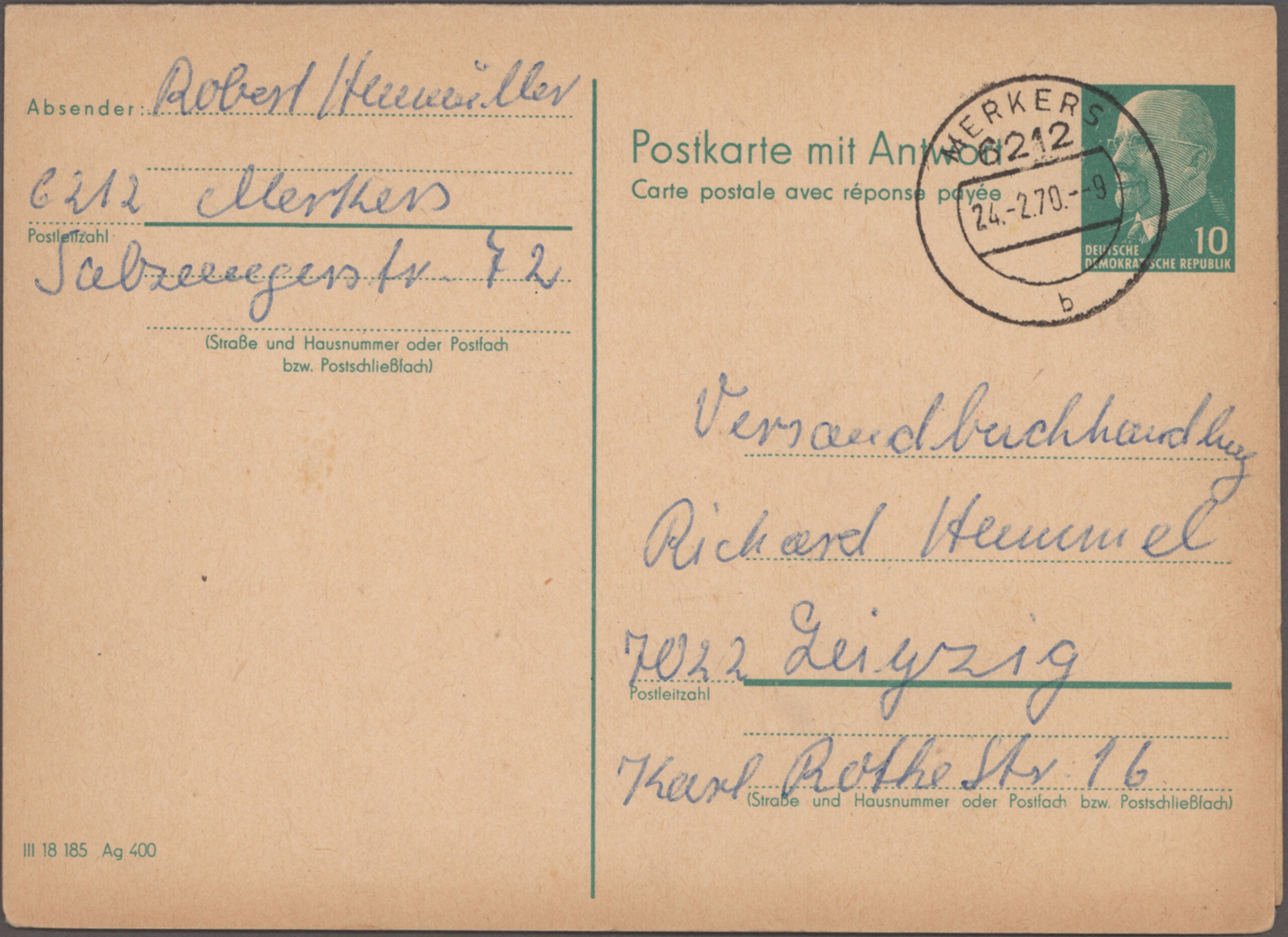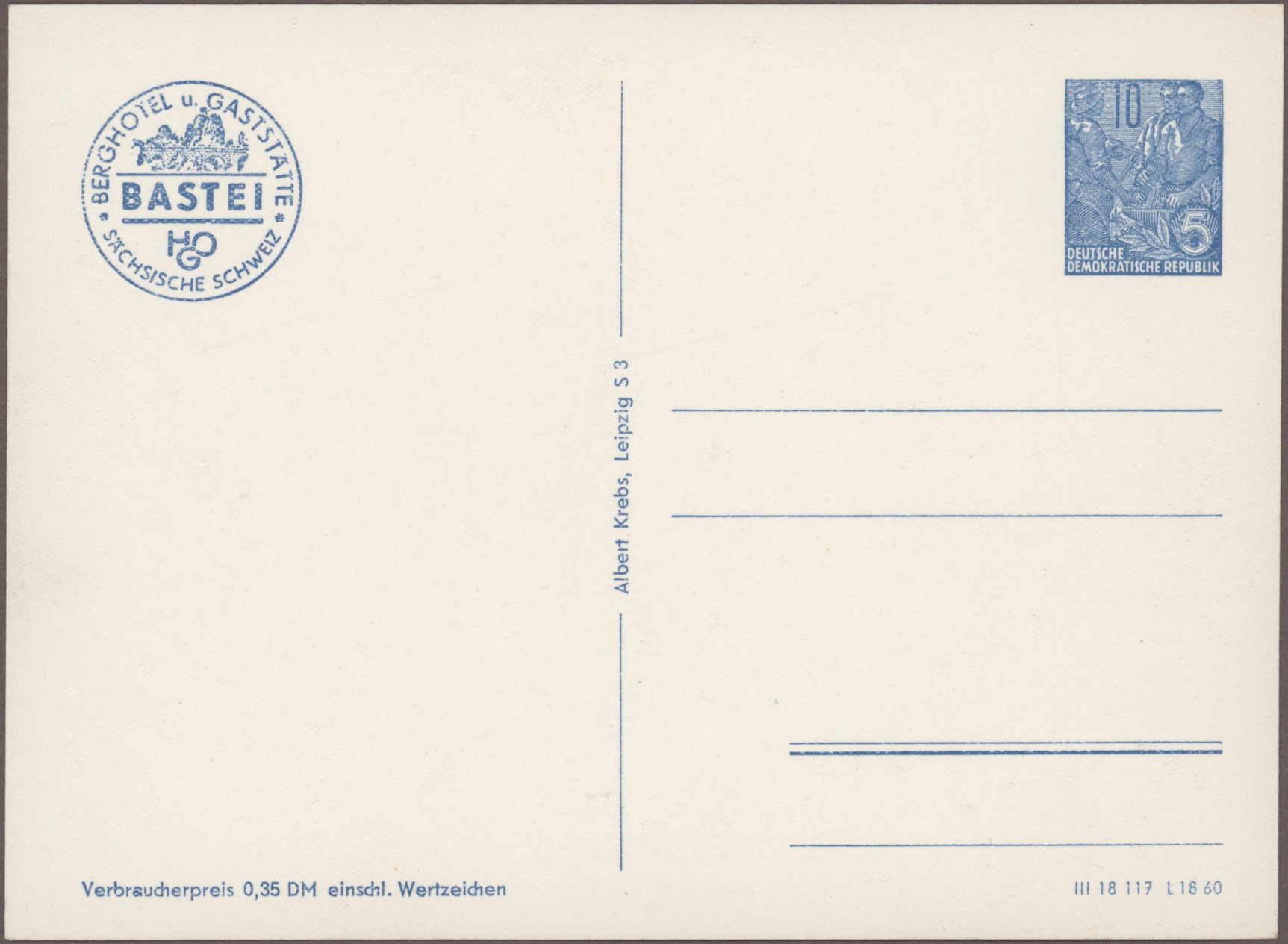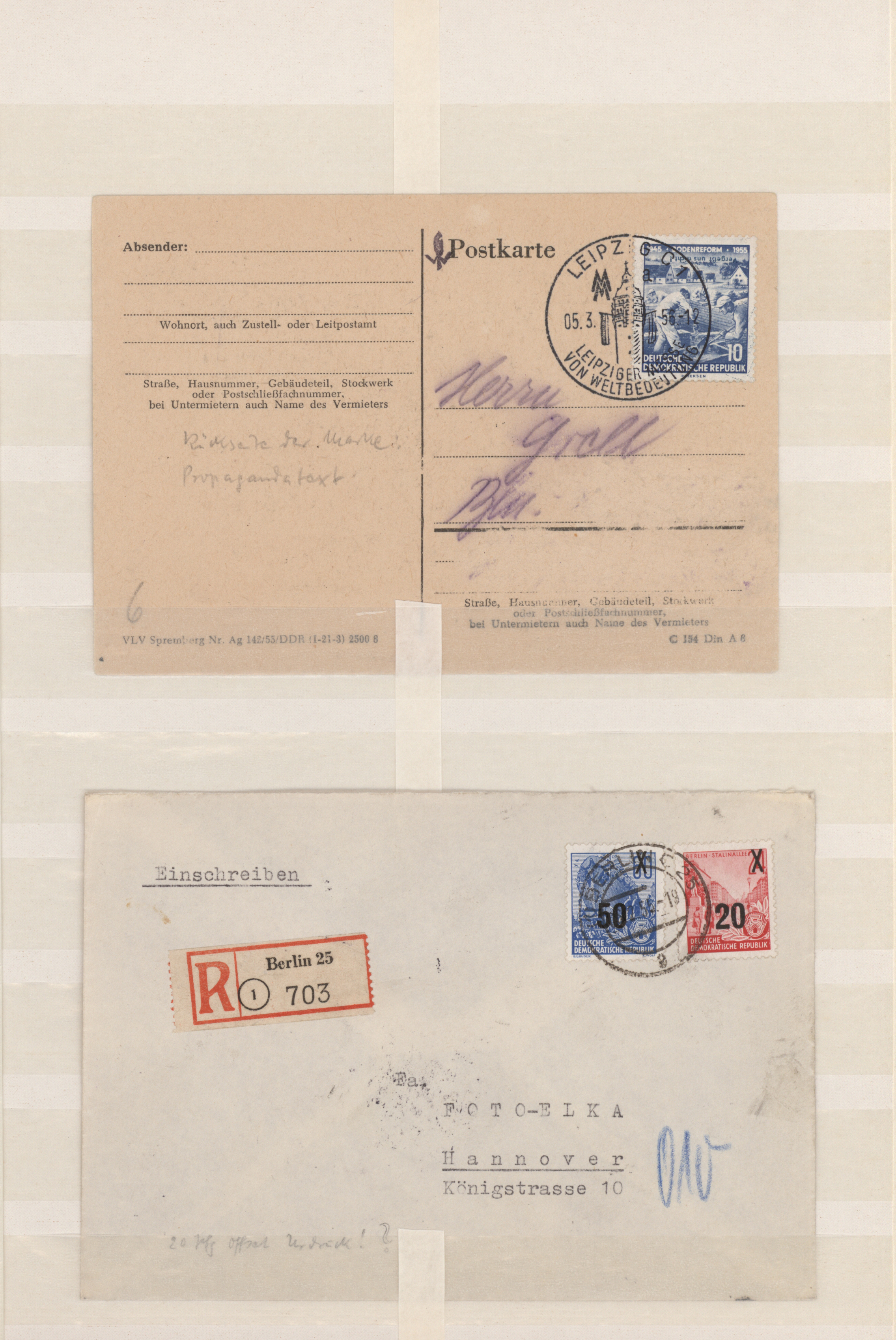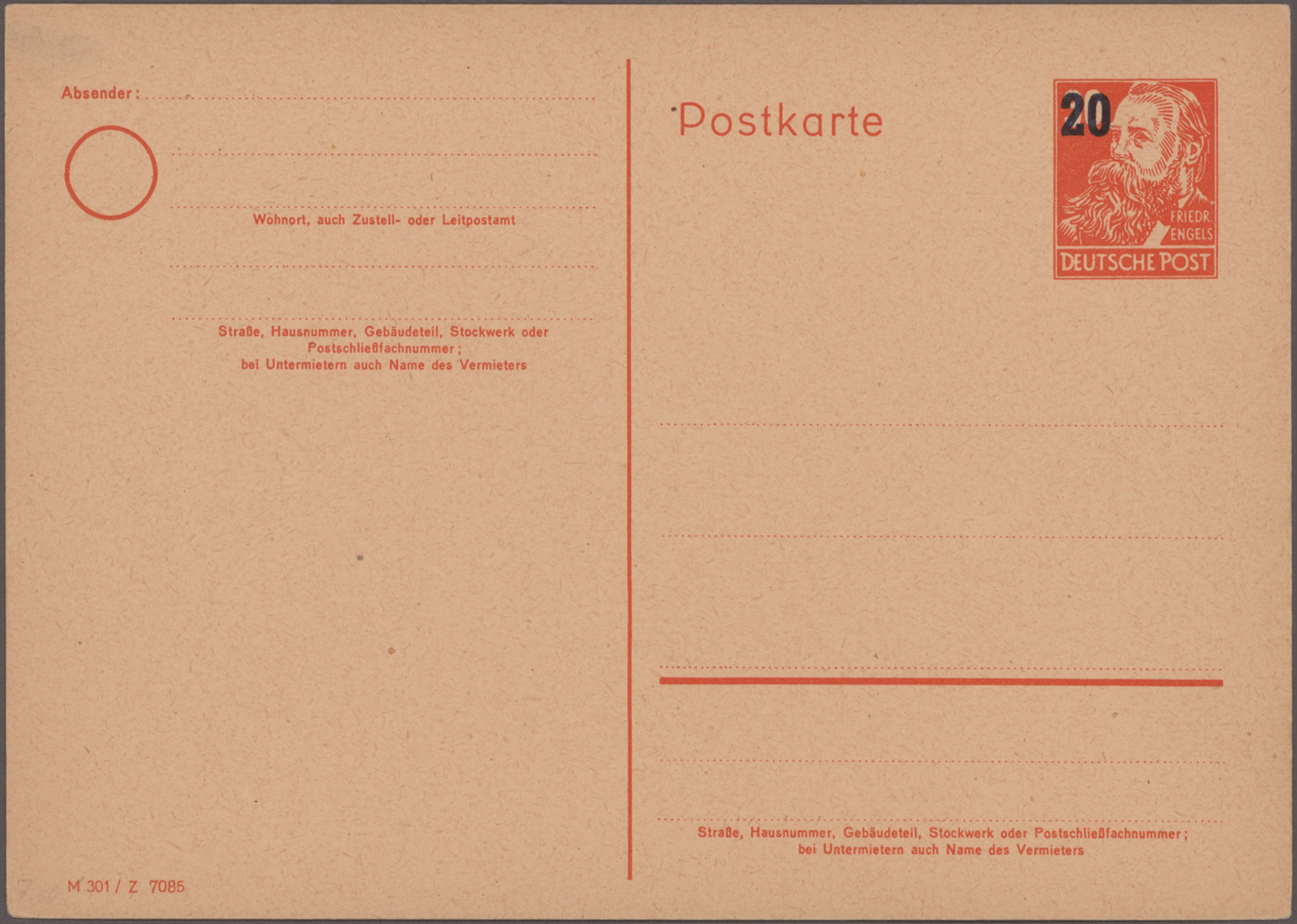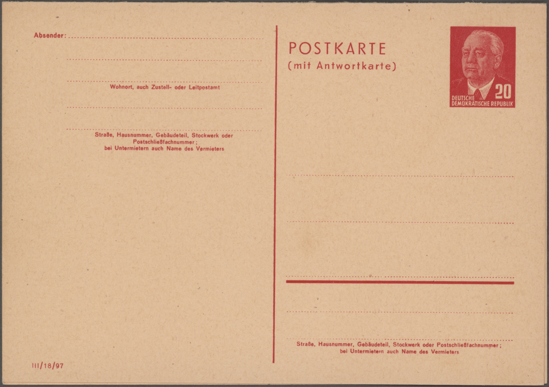 1949/1991, vielseitiger Bestand von über 630 Ganzsachen mit Karten, Antwortkarten und Umschlägen, gebraucht/ungebraucht/blanko gestempelt, dabei etliche Zusatzfrankaturen, auch GAA, R-SbPA, Privat-GA/private Zudrucke, Luftpost, Muster, verschiedene Cachet-Stempel "Weltfestspiele 1951", P 86 mit Aufdruck "3" über "1" der Wertziffer (Probedruck-Umwertung 1990 ??) etc. Sehr interessanter Bestand für den Spezialisten!