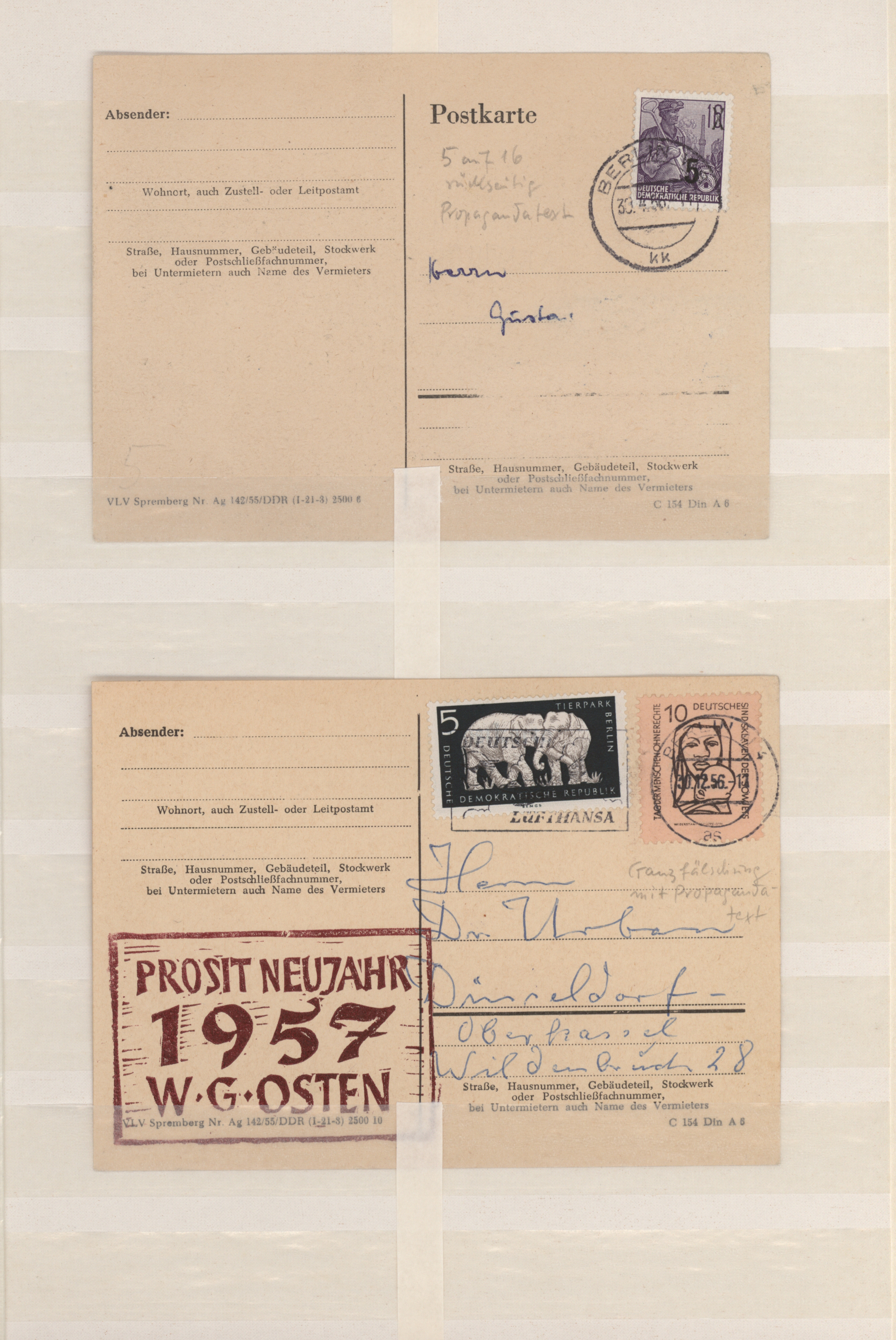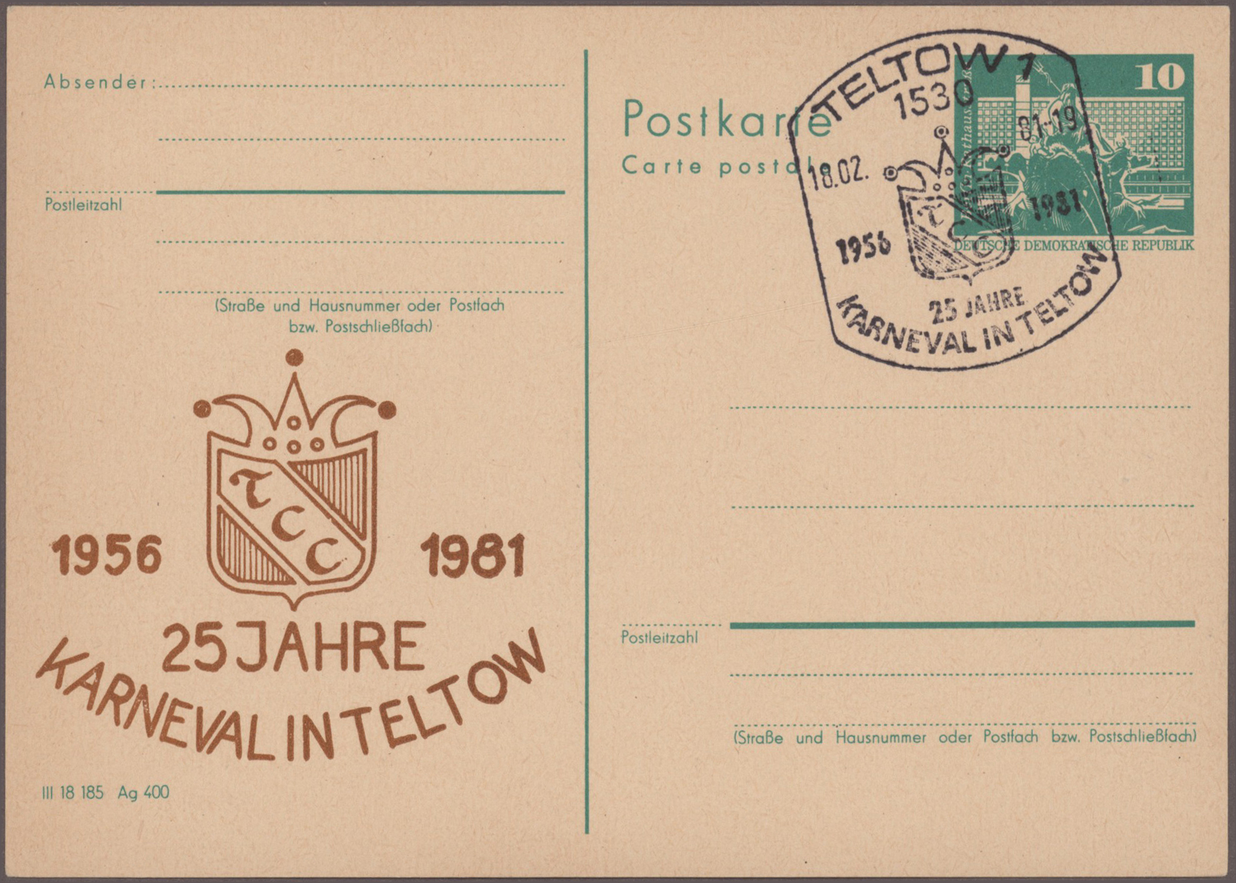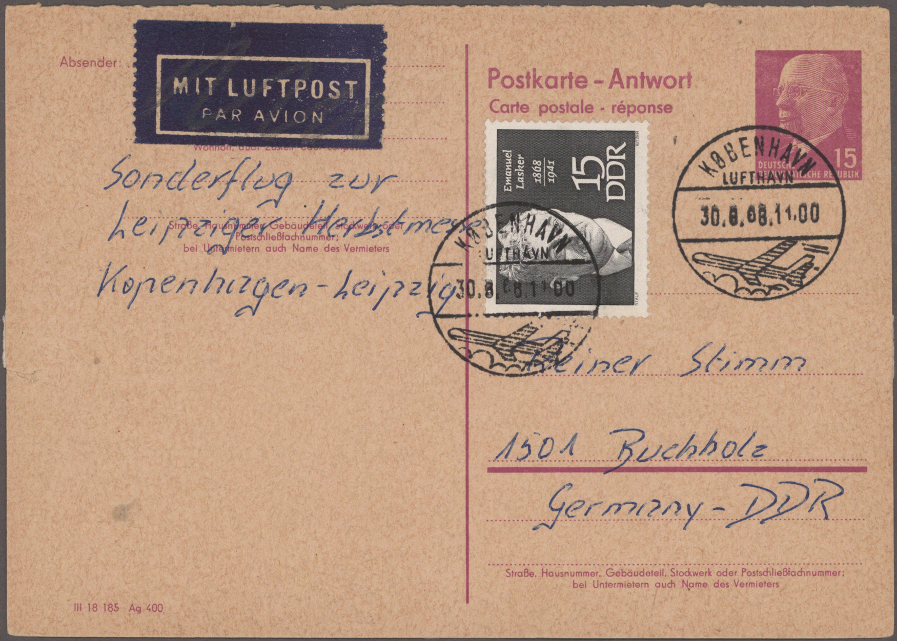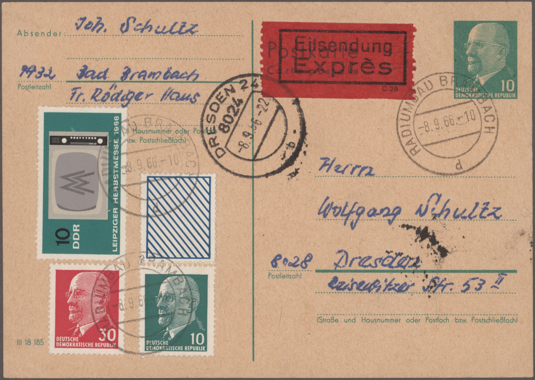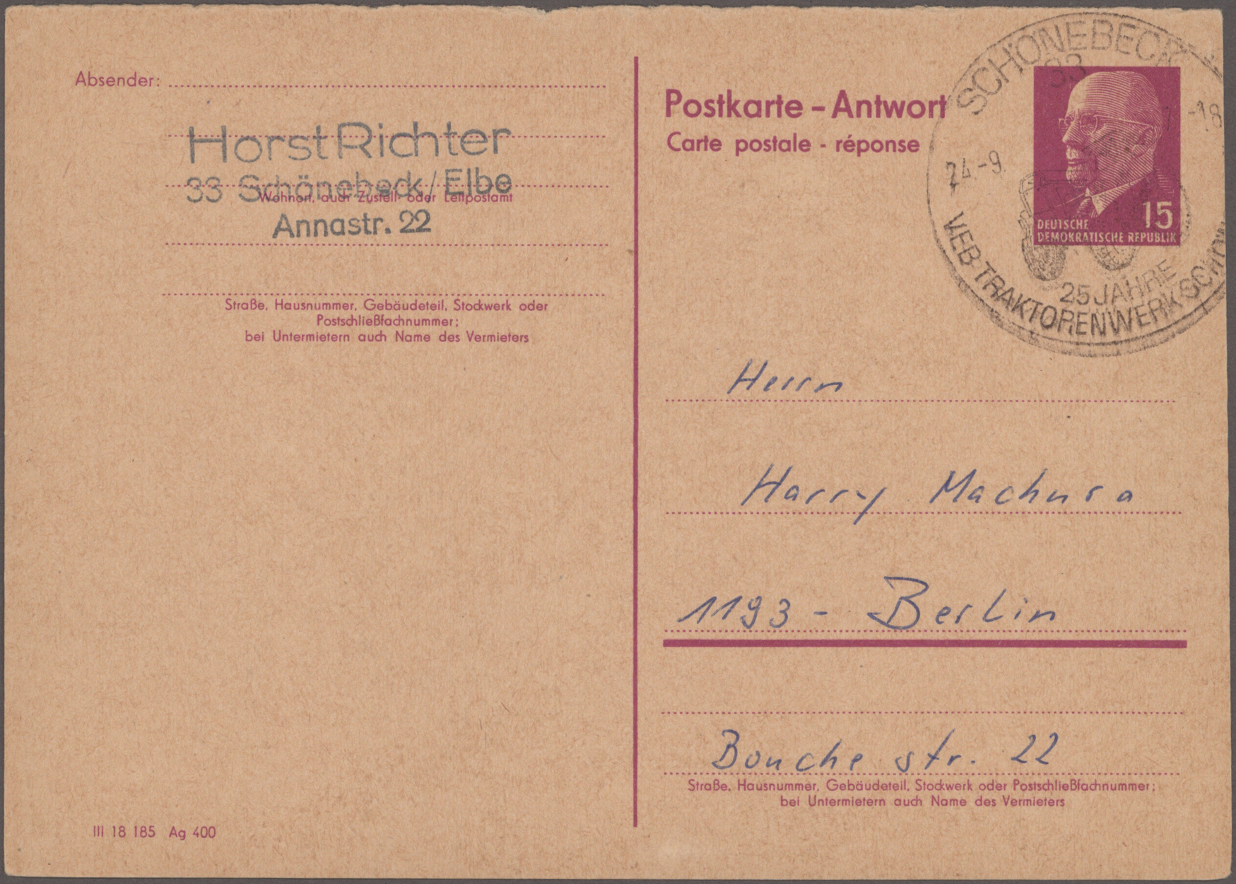 1949/1991, vielseitiger Bestand von über 630 Ganzsachen mit Karten, Antwortkarten und Umschlägen, gebraucht/ungebraucht/blanko gestempelt, dabei etliche Zusatzfrankaturen, auch GAA, R-SbPA, Privat-GA/private Zudrucke, Luftpost, Muster, verschiedene Cachet-Stempel "Weltfestspiele 1951", P 86 mit Aufdruck "3" über "1" der Wertziffer (Probedruck-Umwertung 1990 ??) etc. Sehr interessanter Bestand für den Spezialisten!