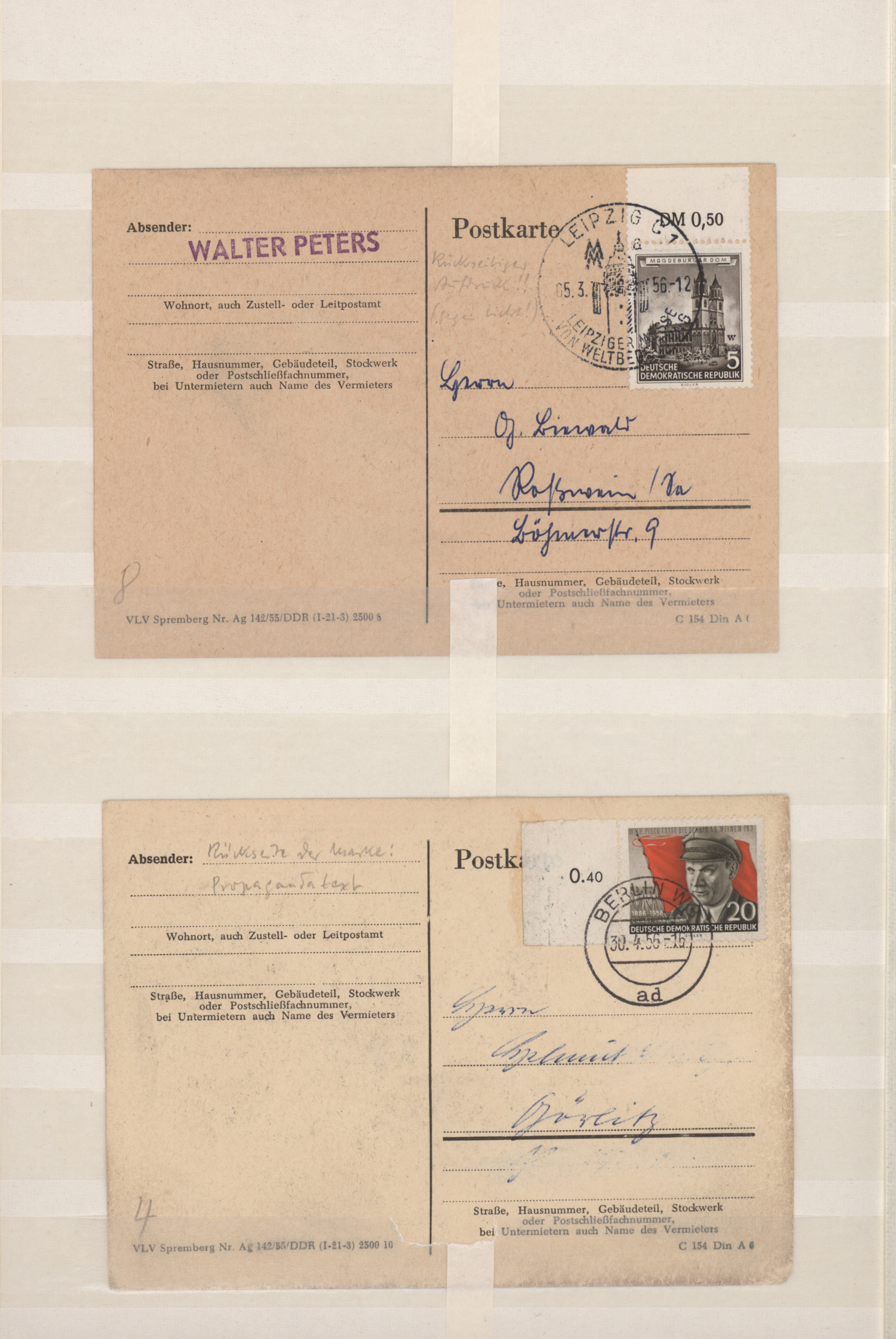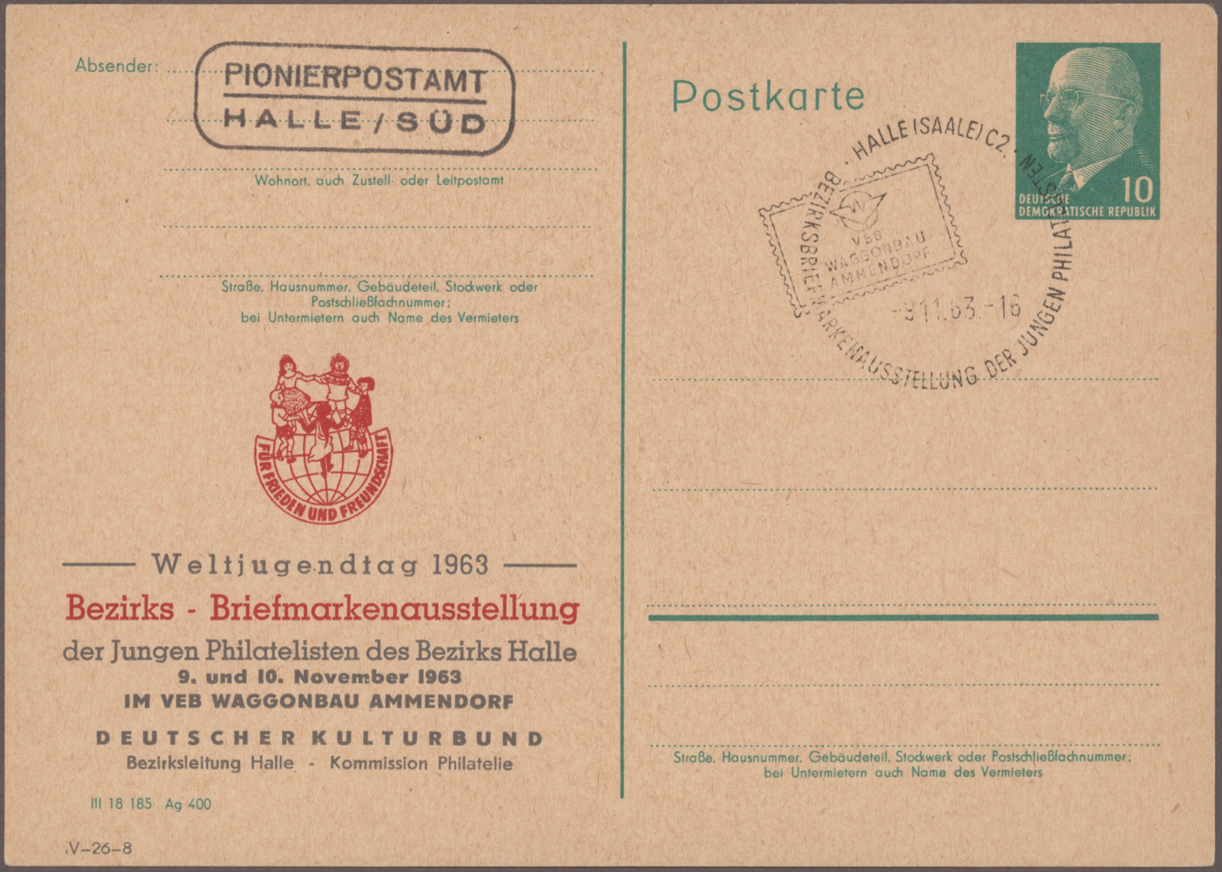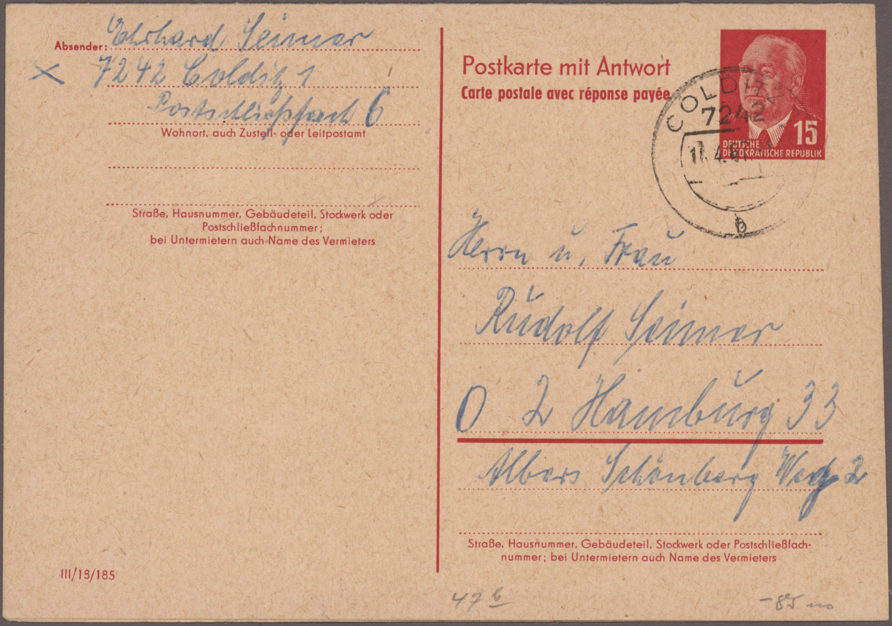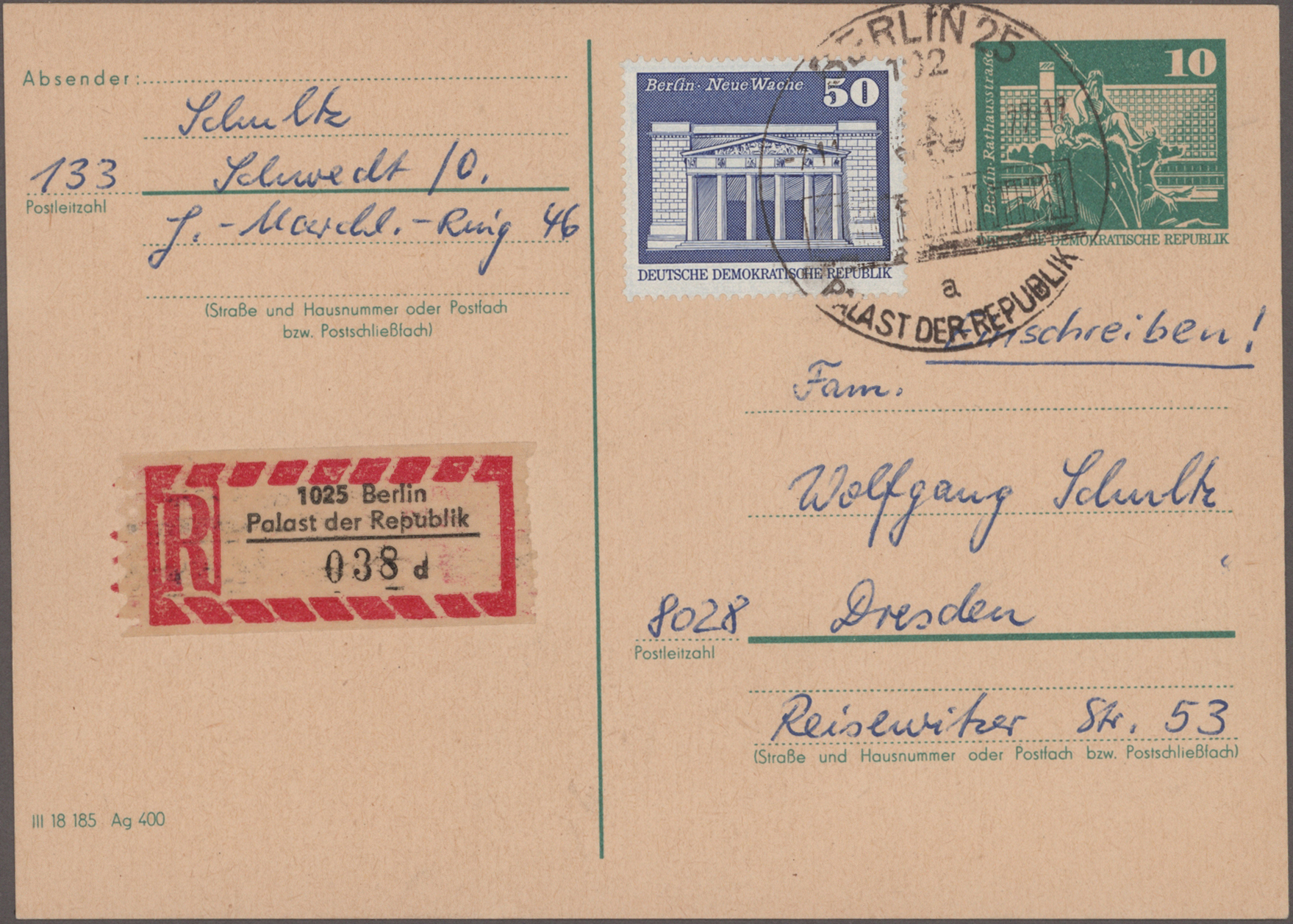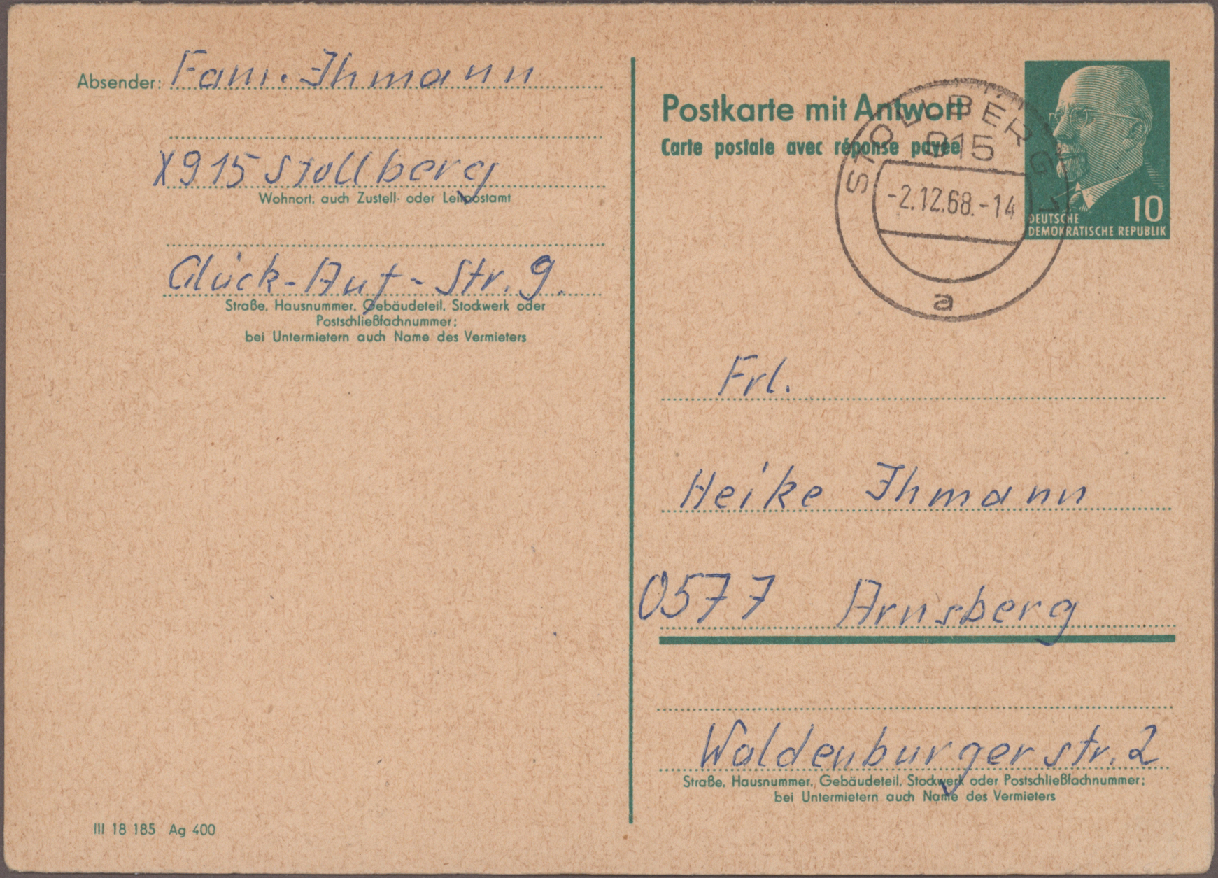 1949/1991, vielseitiger Bestand von über 630 Ganzsachen mit Karten, Antwortkarten und Umschlägen, gebraucht/ungebraucht/blanko gestempelt, dabei etliche Zusatzfrankaturen, auch GAA, R-SbPA, Privat-GA/private Zudrucke, Luftpost, Muster, verschiedene Cachet-Stempel "Weltfestspiele 1951", P 86 mit Aufdruck "3" über "1" der Wertziffer (Probedruck-Umwertung 1990 ??) etc. Sehr interessanter Bestand für den Spezialisten!