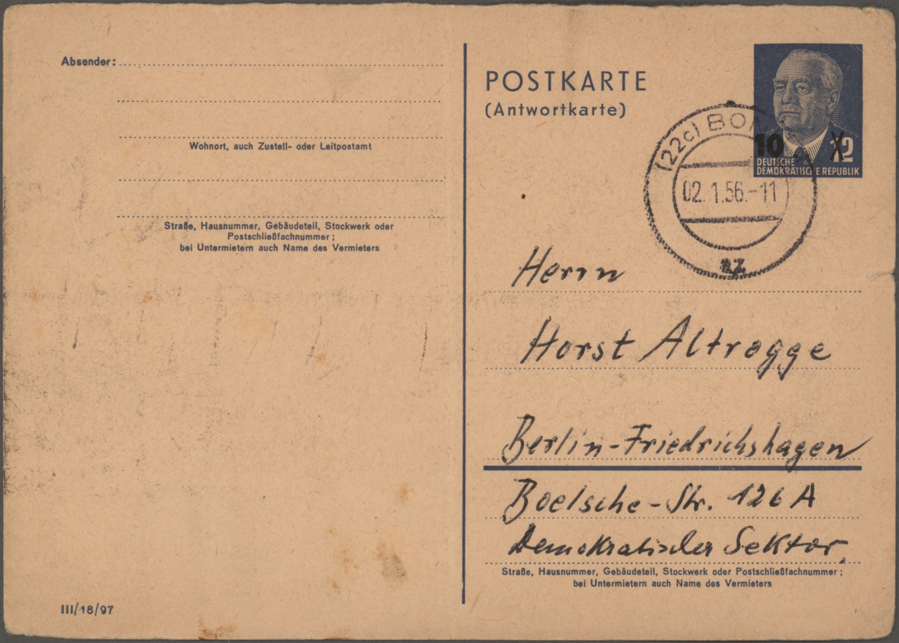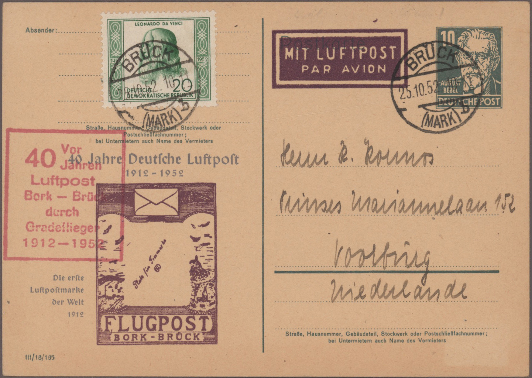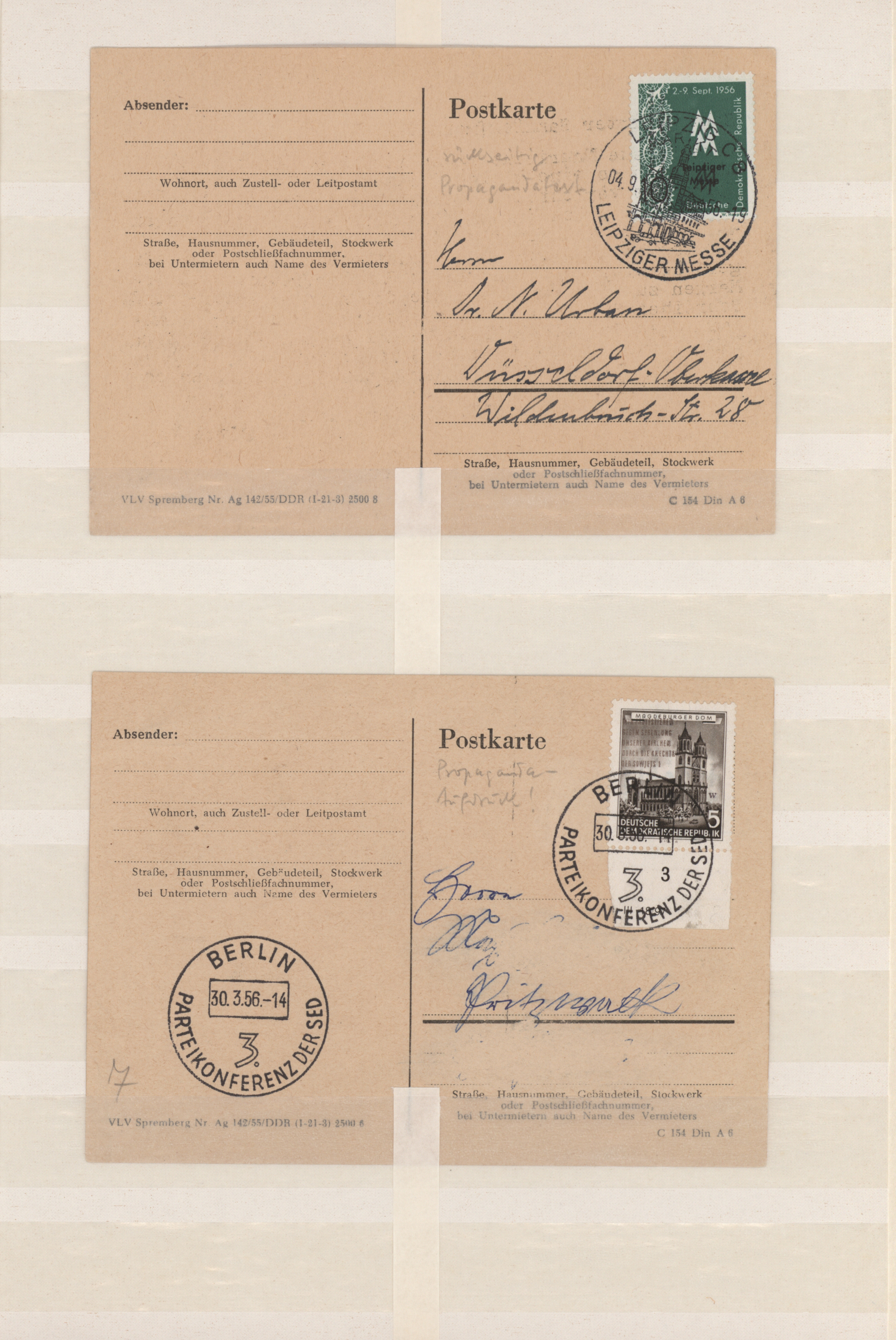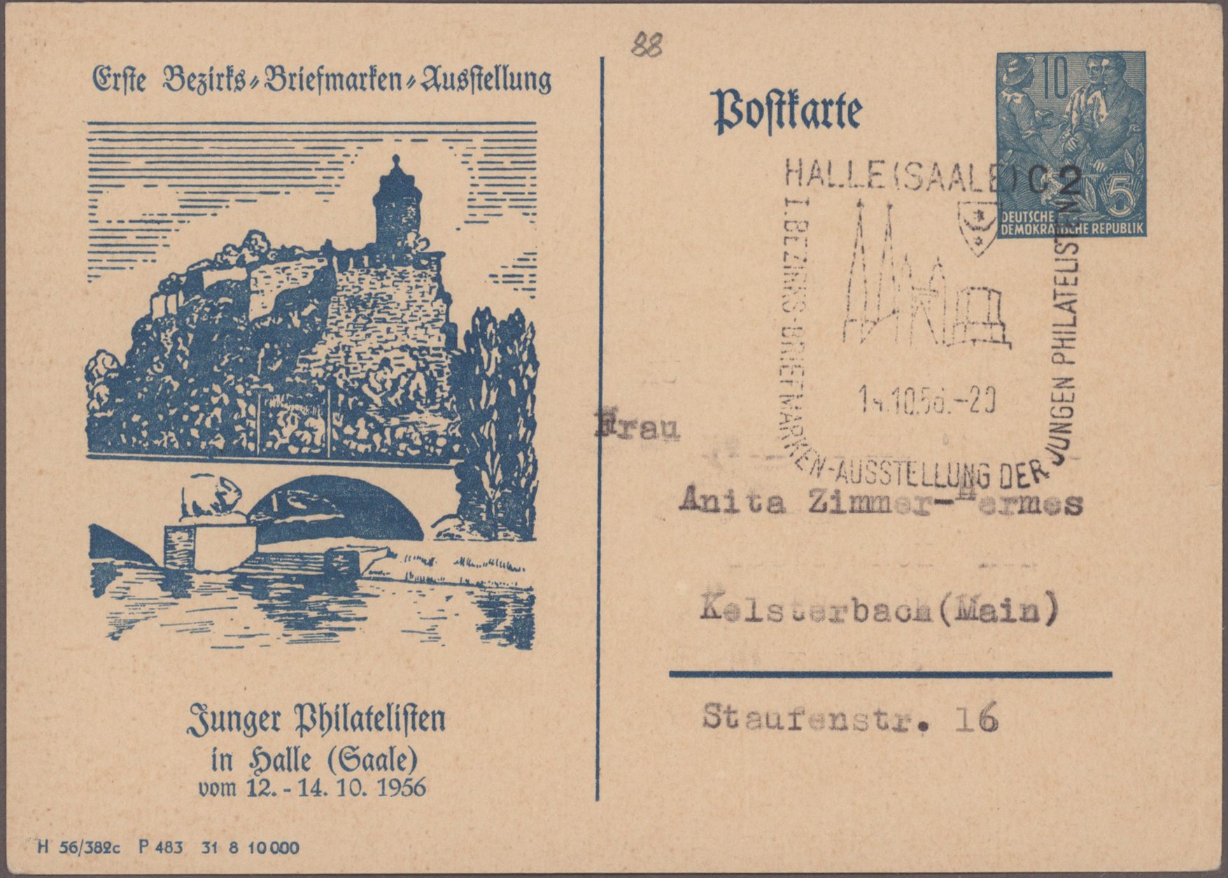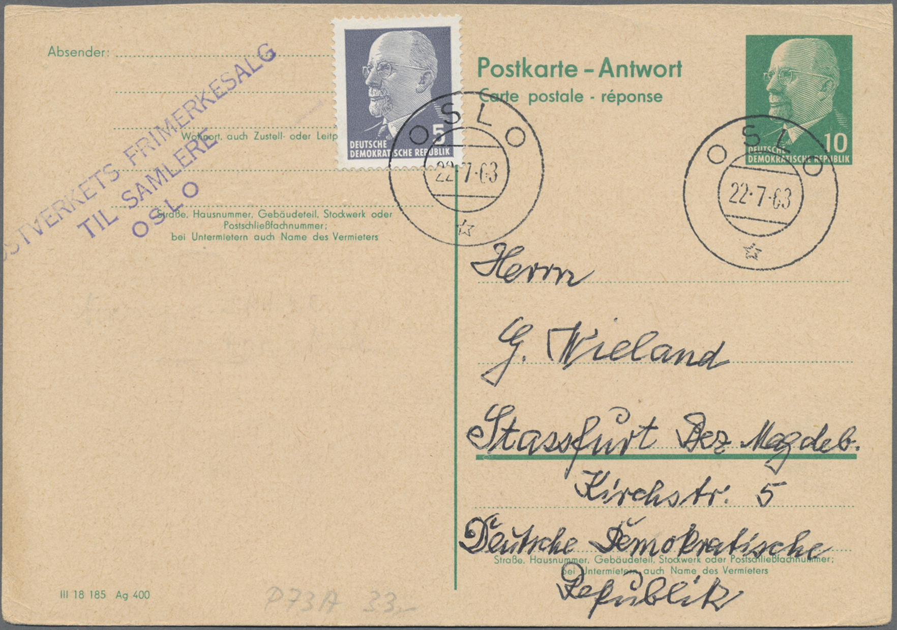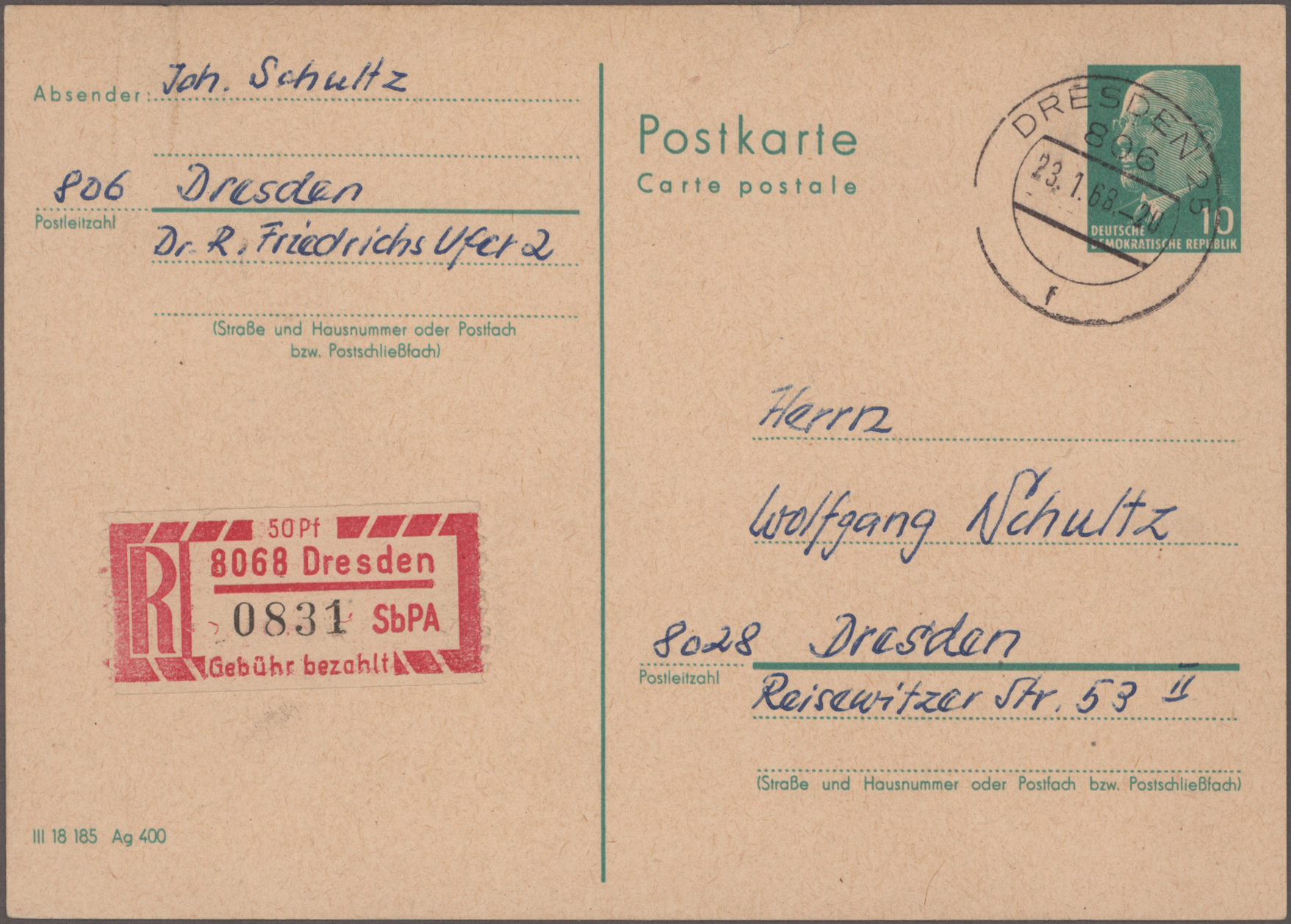 1949/1991, vielseitiger Bestand von über 630 Ganzsachen mit Karten, Antwortkarten und Umschlägen, gebraucht/ungebraucht/blanko gestempelt, dabei etliche Zusatzfrankaturen, auch GAA, R-SbPA, Privat-GA/private Zudrucke, Luftpost, Muster, verschiedene Cachet-Stempel "Weltfestspiele 1951", P 86 mit Aufdruck "3" über "1" der Wertziffer (Probedruck-Umwertung 1990 ??) etc. Sehr interessanter Bestand für den Spezialisten!