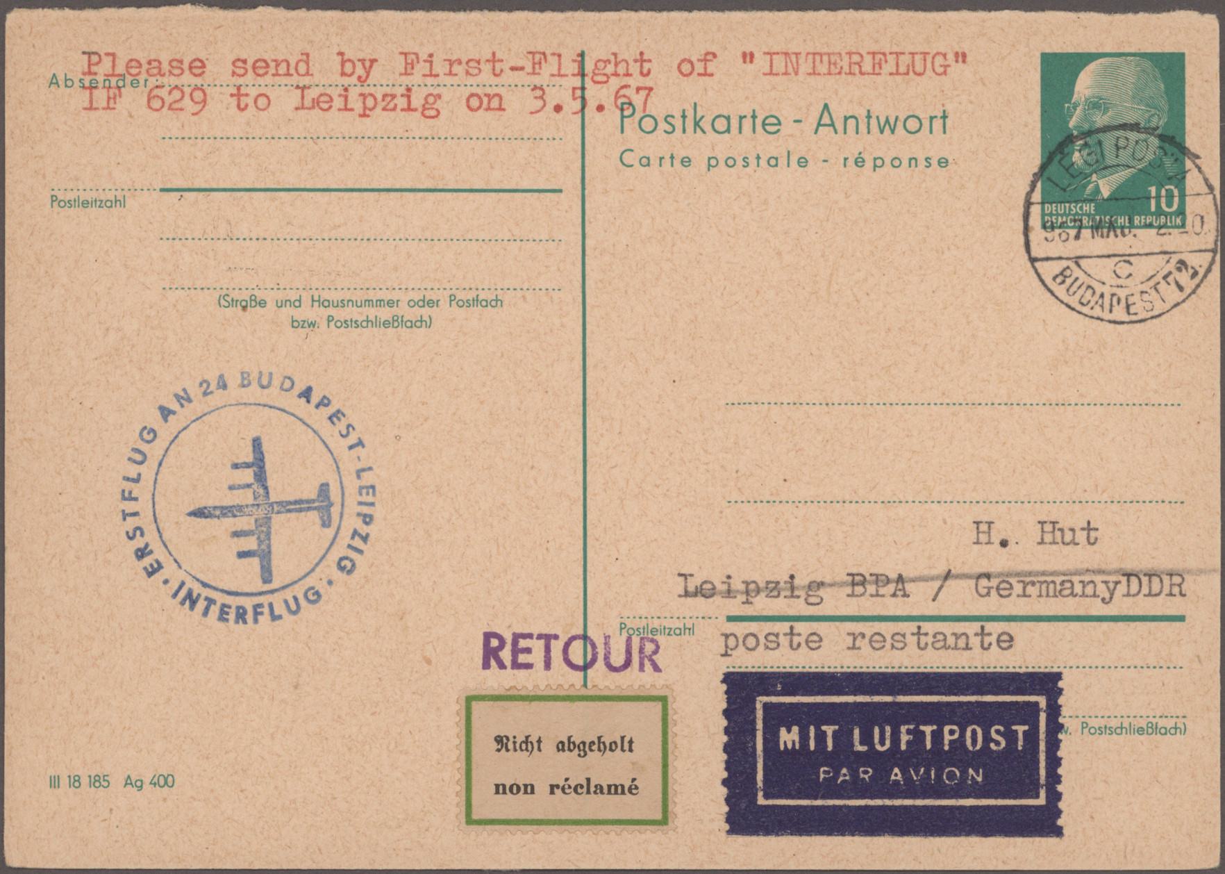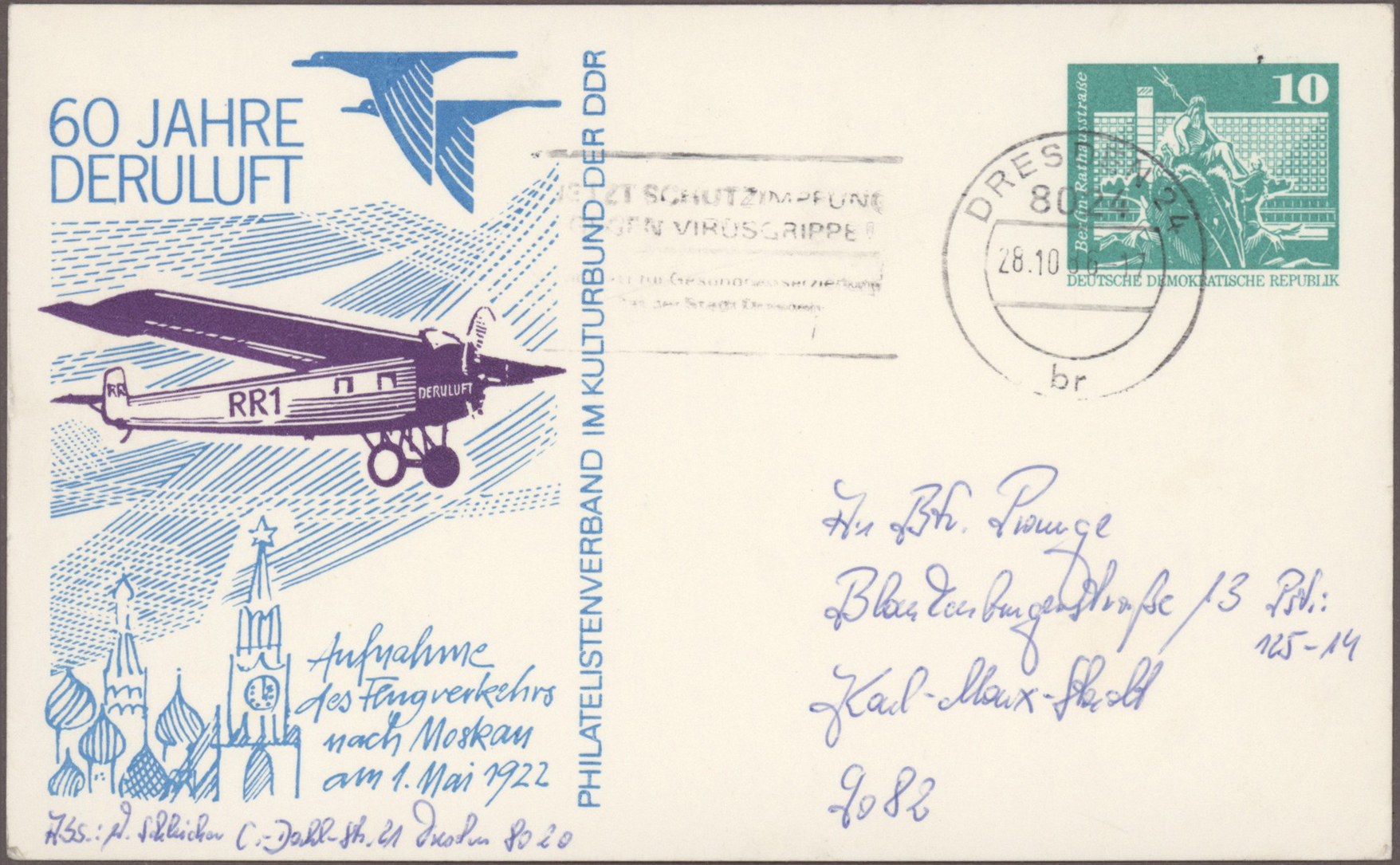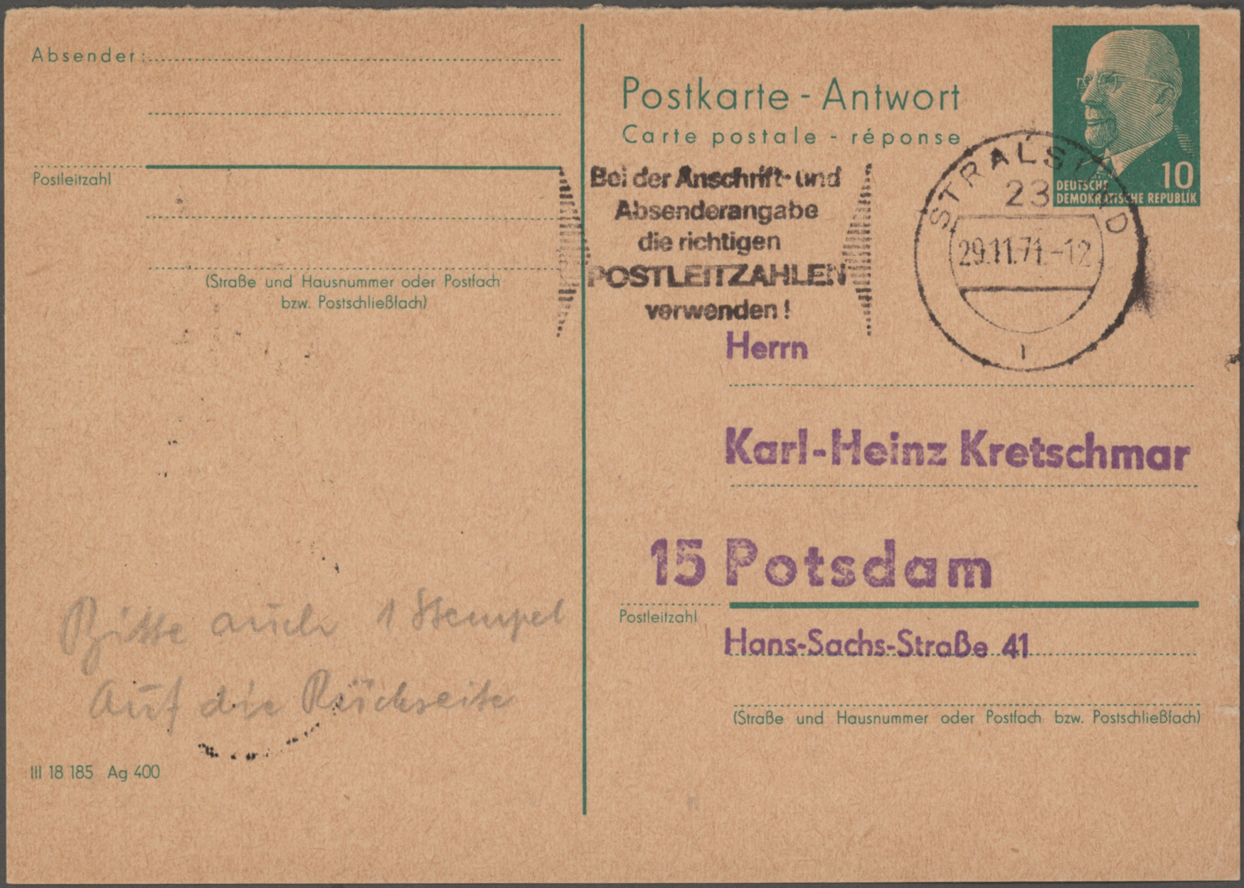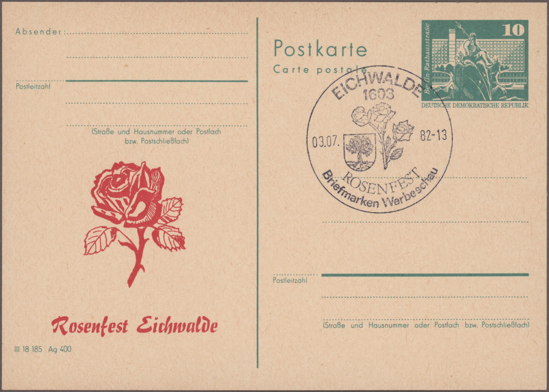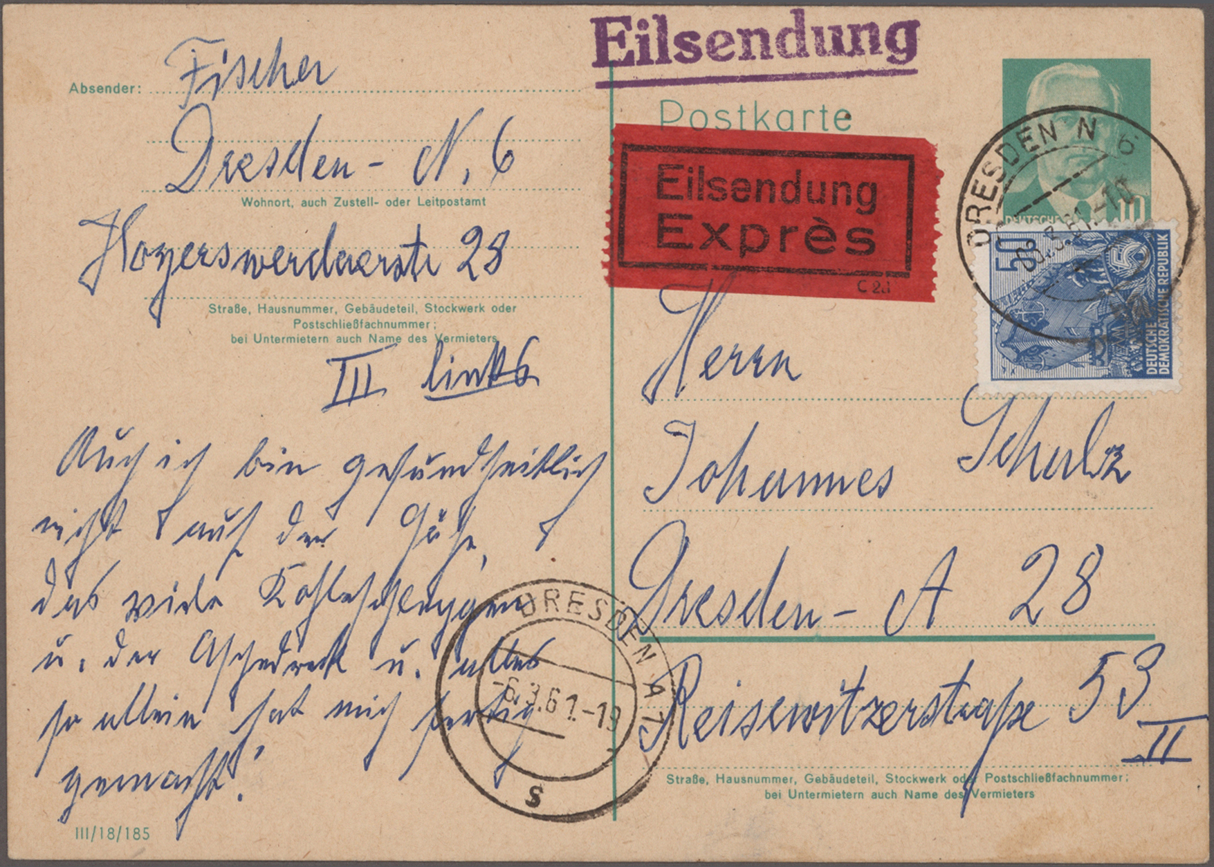 1949/1991, vielseitiger Bestand von über 630 Ganzsachen mit Karten, Antwortkarten und Umschlägen, gebraucht/ungebraucht/blanko gestempelt, dabei etliche Zusatzfrankaturen, auch GAA, R-SbPA, Privat-GA/private Zudrucke, Luftpost, Muster, verschiedene Cachet-Stempel "Weltfestspiele 1951", P 86 mit Aufdruck "3" über "1" der Wertziffer (Probedruck-Umwertung 1990 ??) etc. Sehr interessanter Bestand für den Spezialisten!