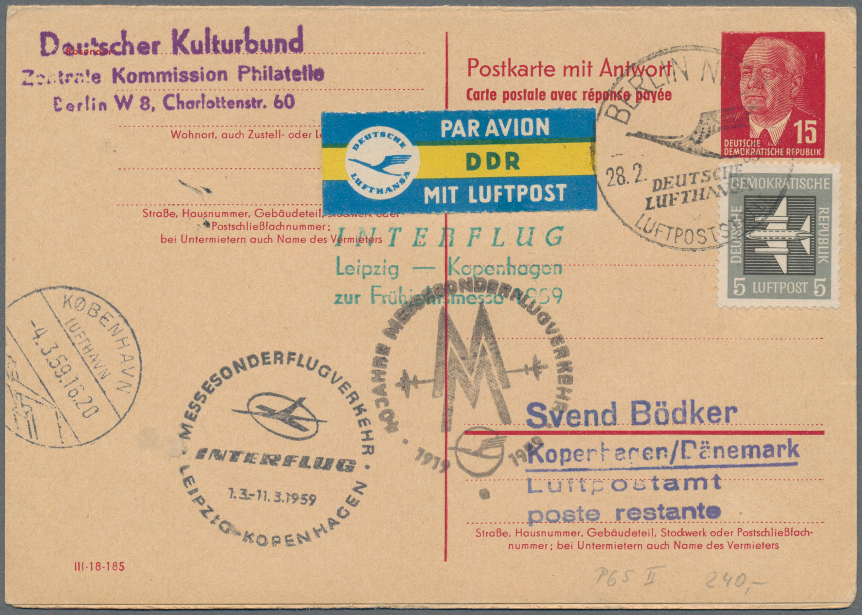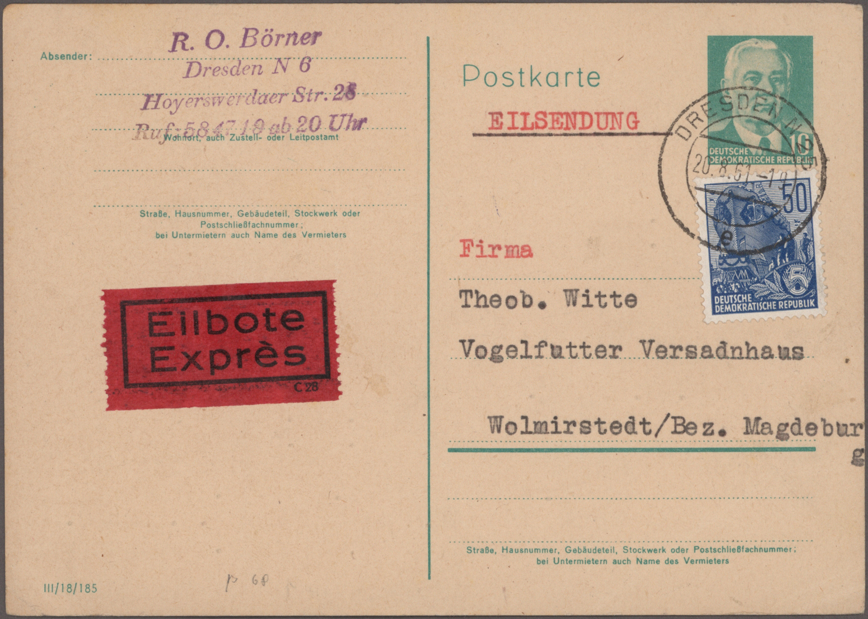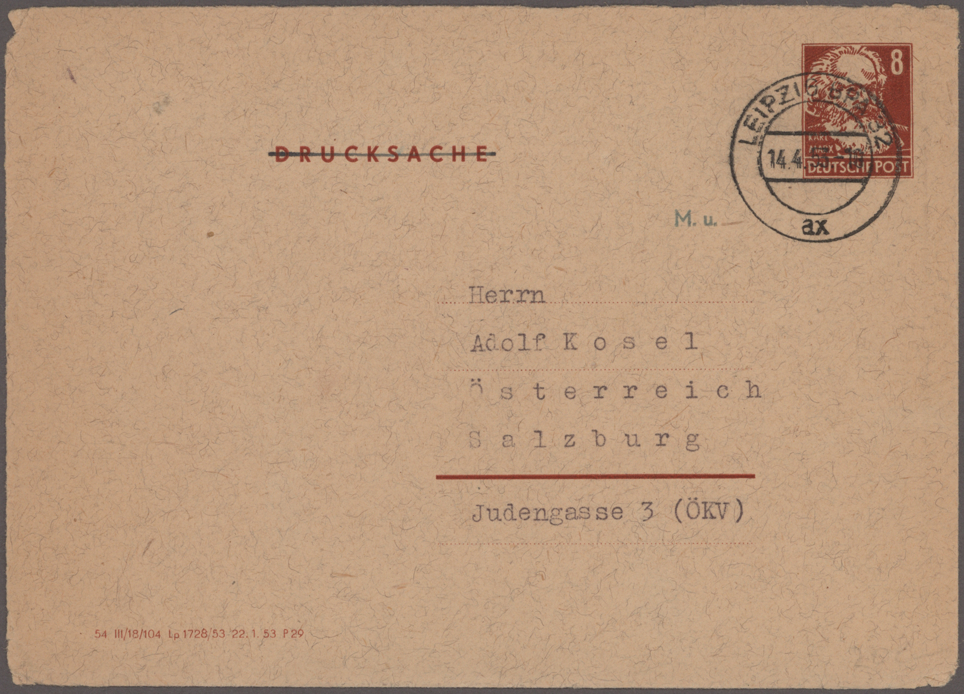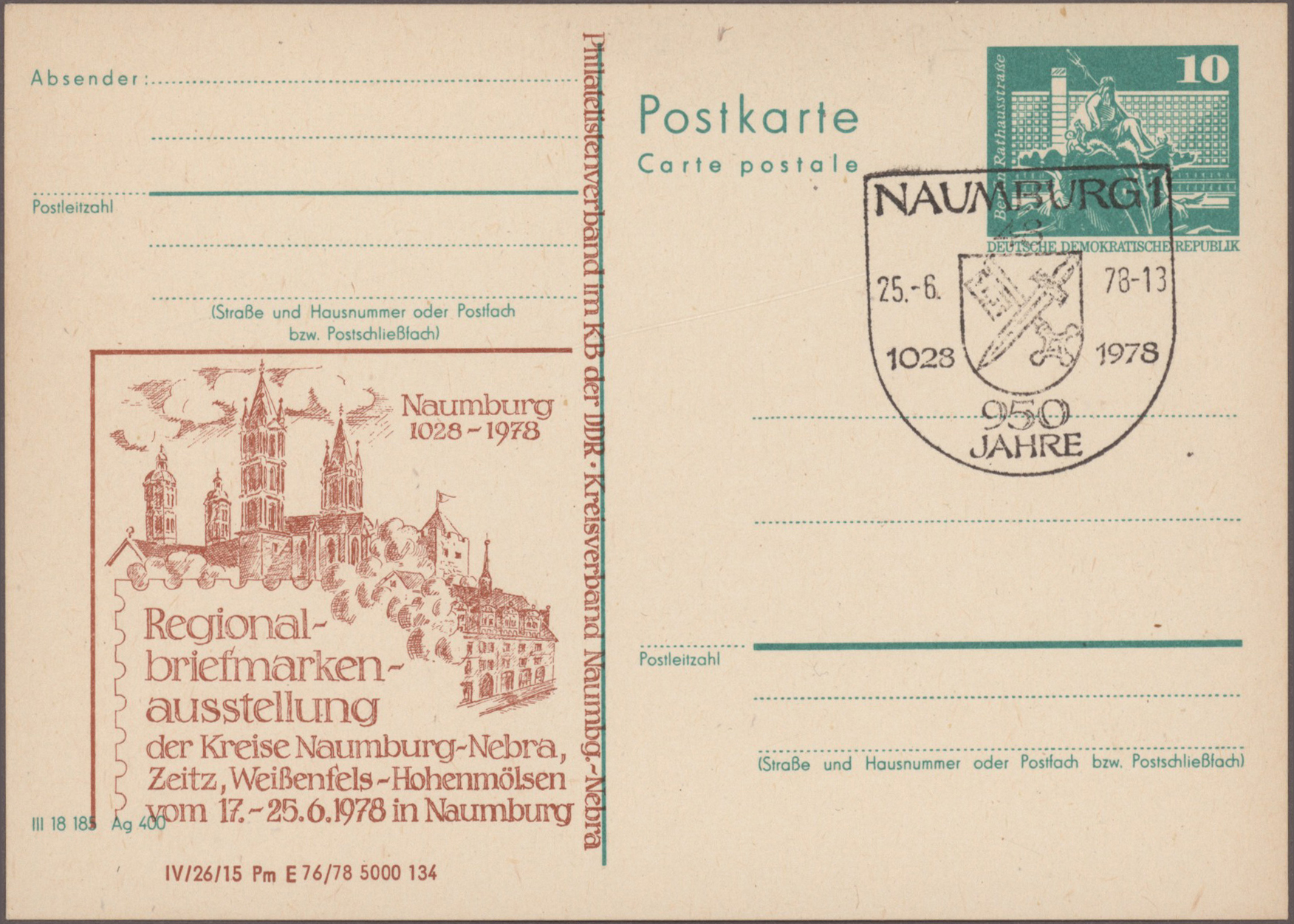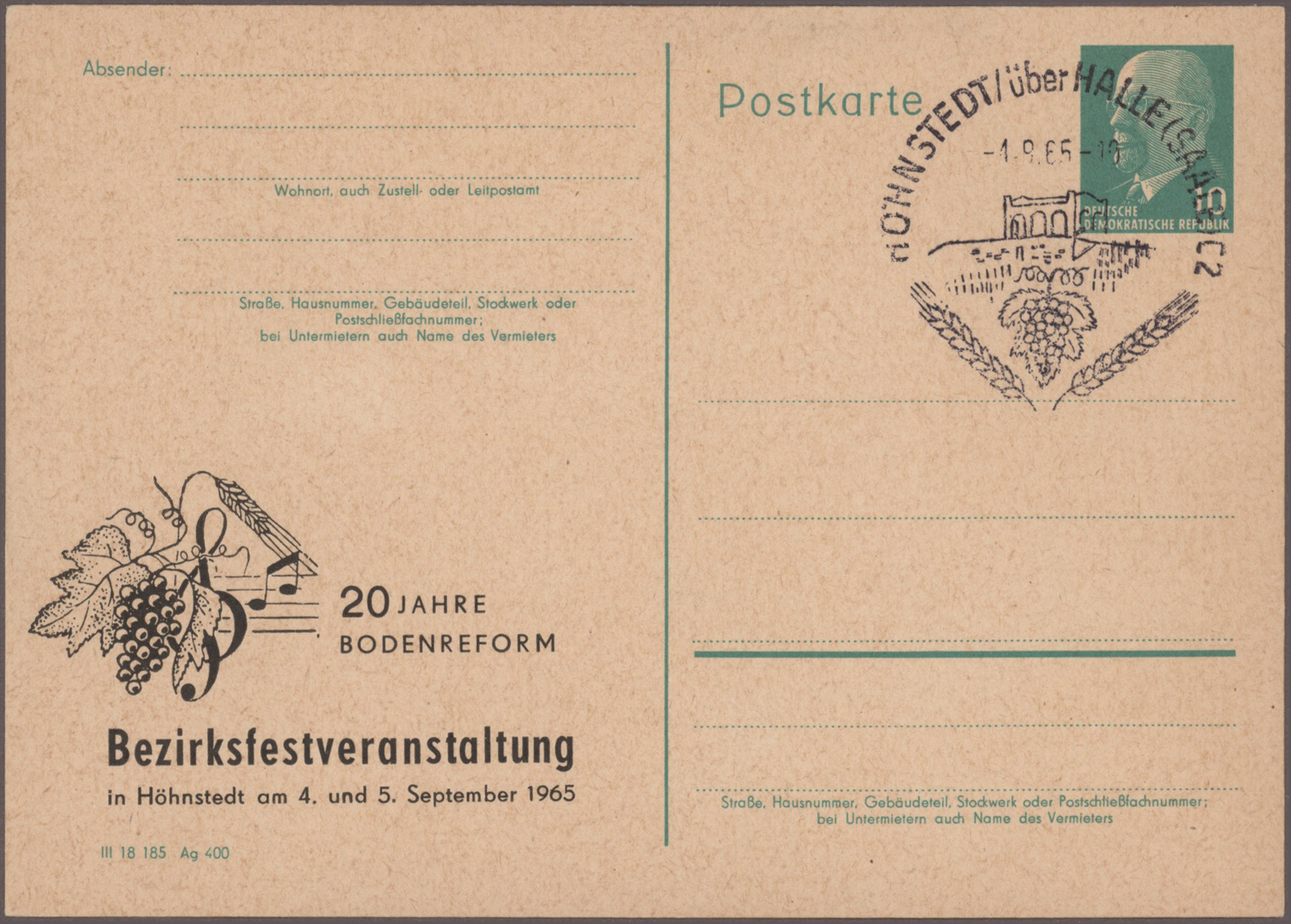 1949/1991, vielseitiger Bestand von über 630 Ganzsachen mit Karten, Antwortkarten und Umschlägen, gebraucht/ungebraucht/blanko gestempelt, dabei etliche Zusatzfrankaturen, auch GAA, R-SbPA, Privat-GA/private Zudrucke, Luftpost, Muster, verschiedene Cachet-Stempel "Weltfestspiele 1951", P 86 mit Aufdruck "3" über "1" der Wertziffer (Probedruck-Umwertung 1990 ??) etc. Sehr interessanter Bestand für den Spezialisten!