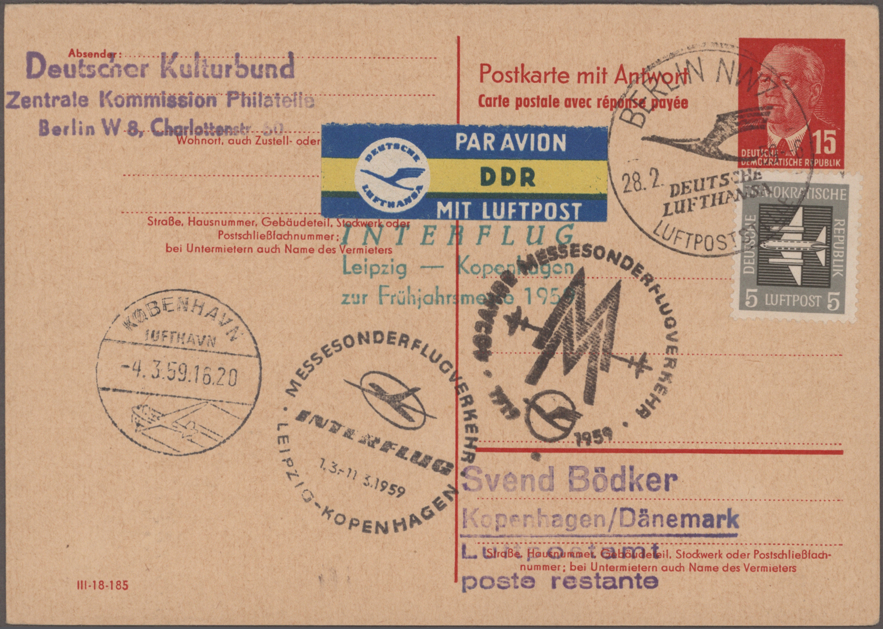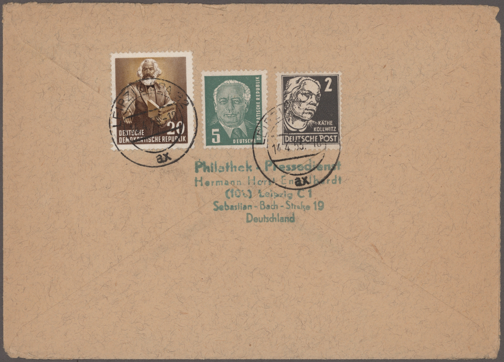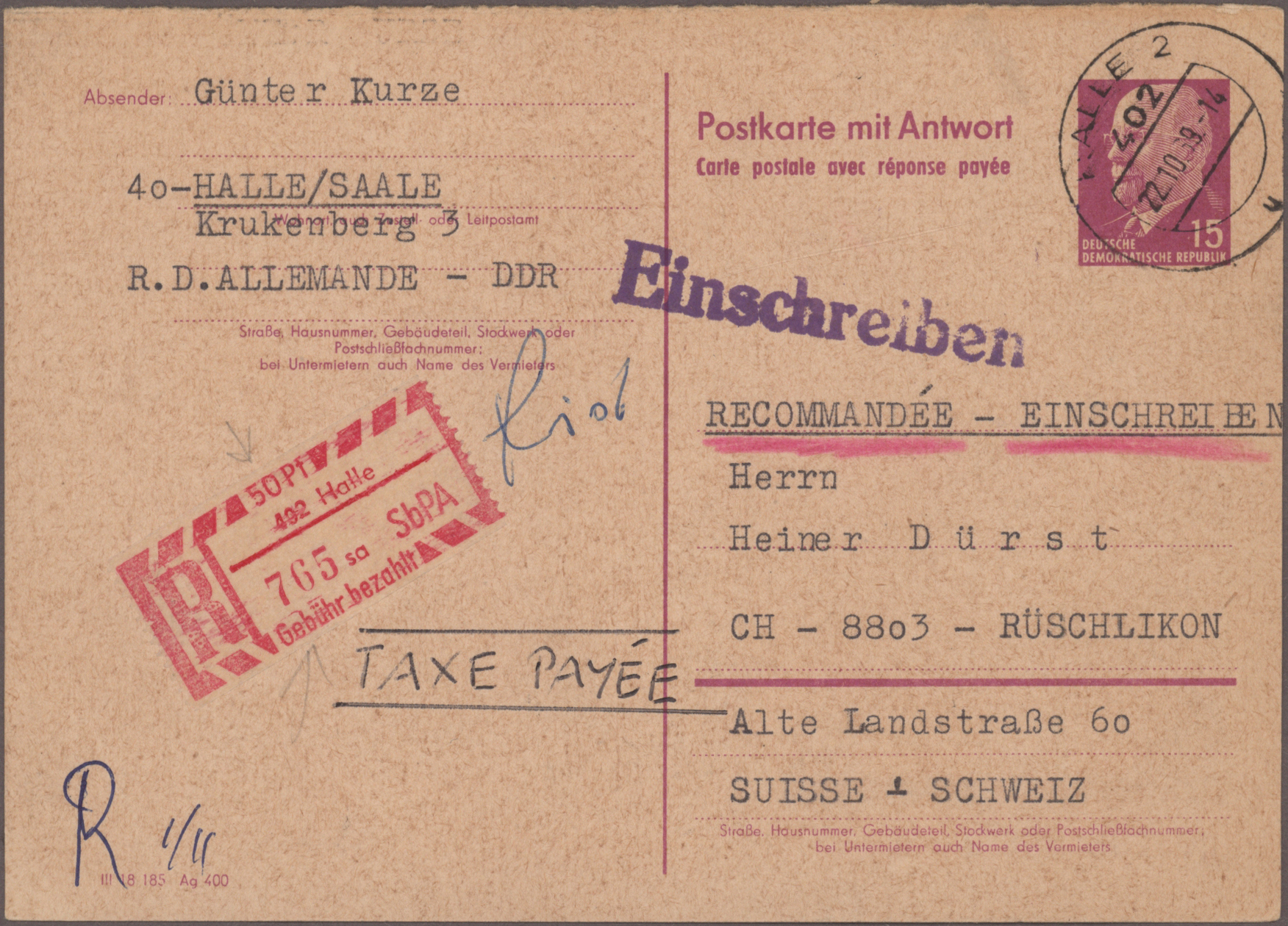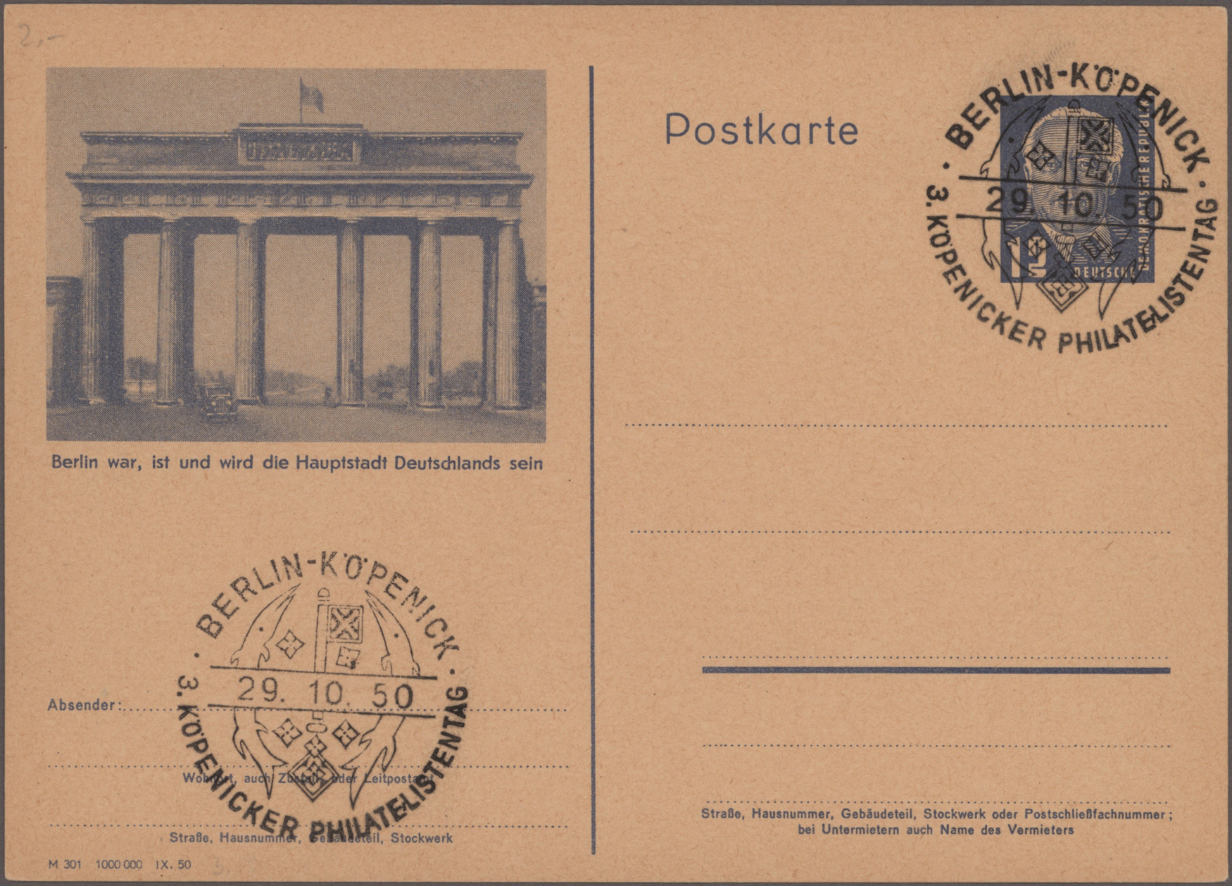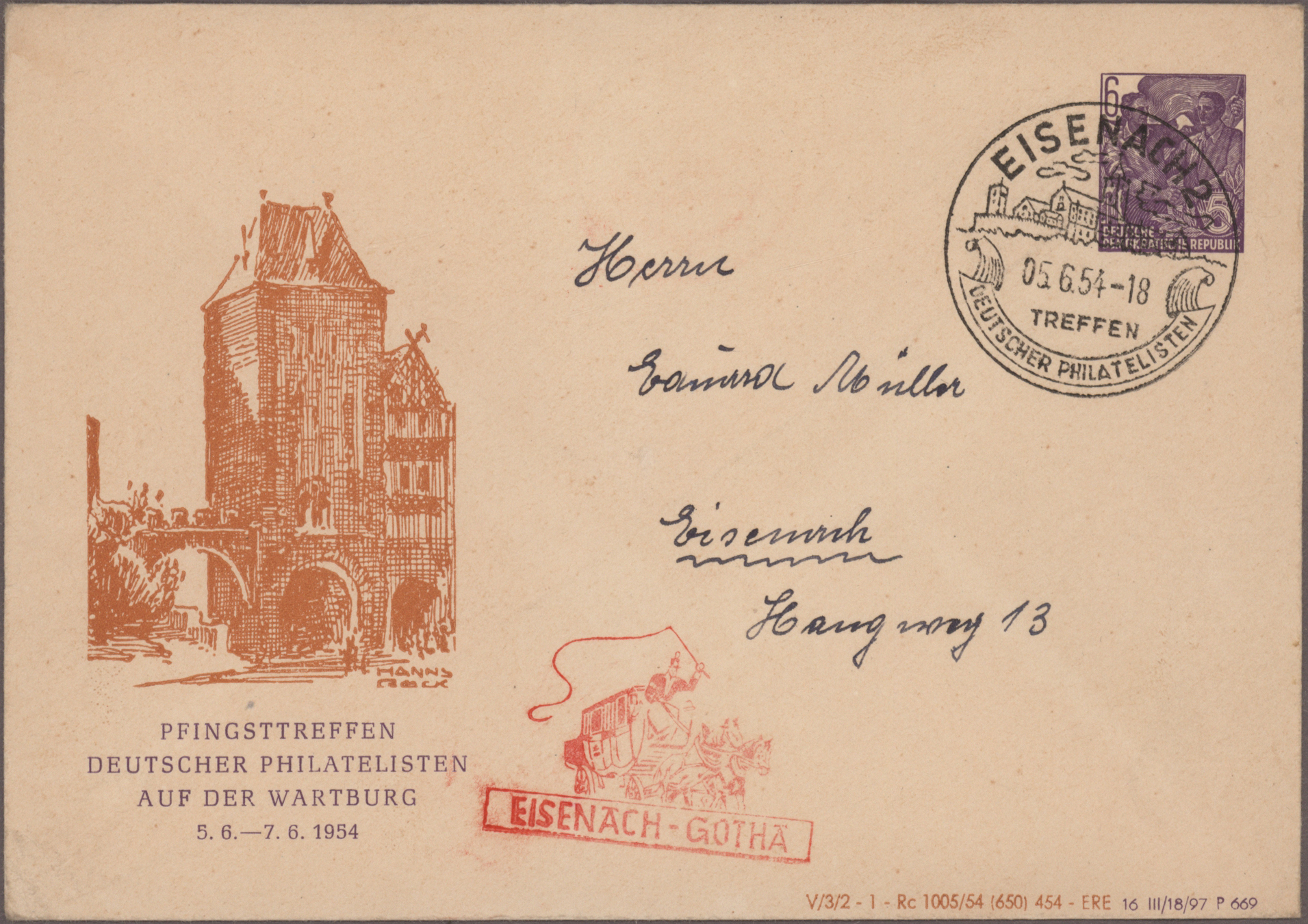 1949/1991, vielseitiger Bestand von über 630 Ganzsachen mit Karten, Antwortkarten und Umschlägen, gebraucht/ungebraucht/blanko gestempelt, dabei etliche Zusatzfrankaturen, auch GAA, R-SbPA, Privat-GA/private Zudrucke, Luftpost, Muster, verschiedene Cachet-Stempel "Weltfestspiele 1951", P 86 mit Aufdruck "3" über "1" der Wertziffer (Probedruck-Umwertung 1990 ??) etc. Sehr interessanter Bestand für den Spezialisten!