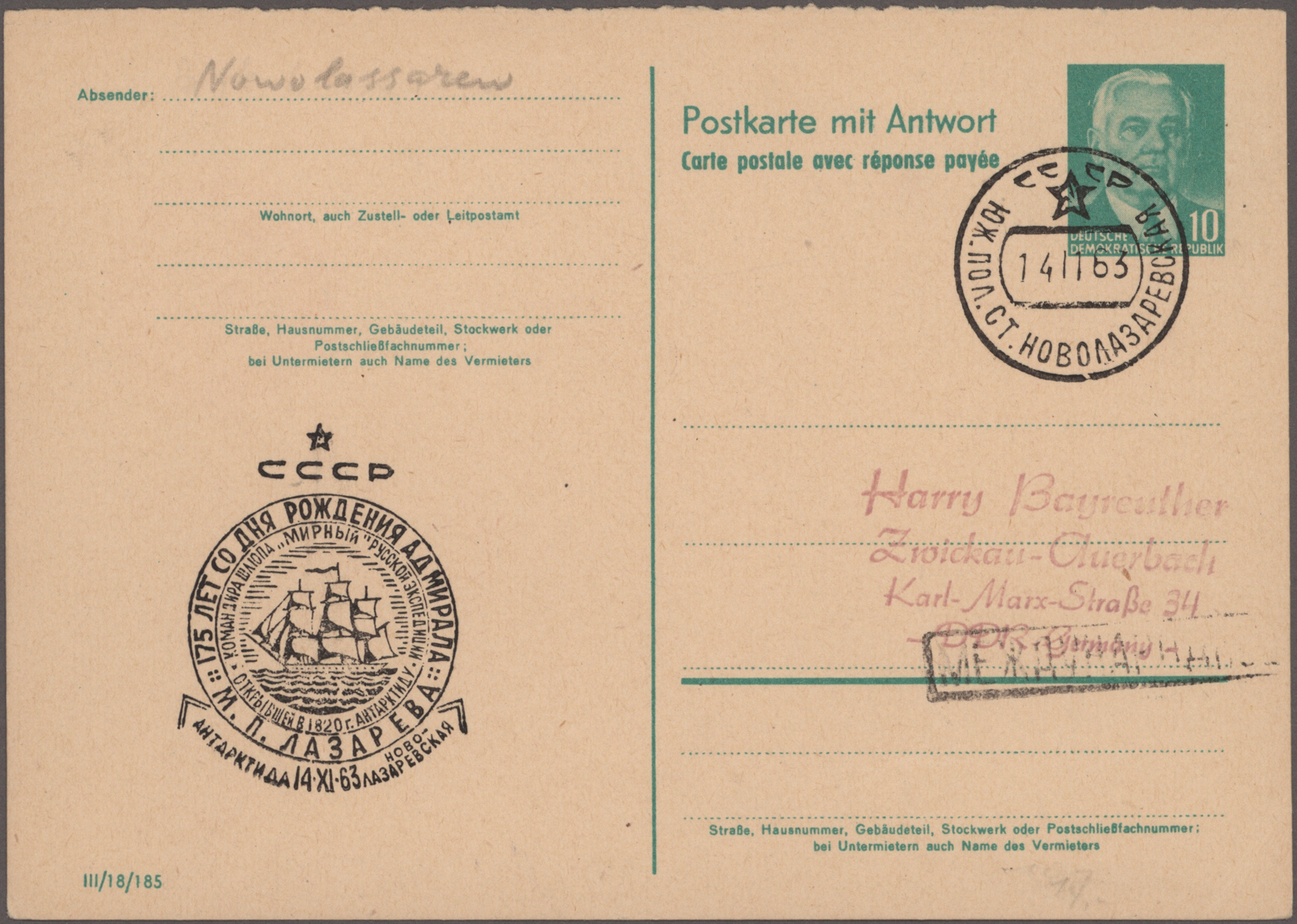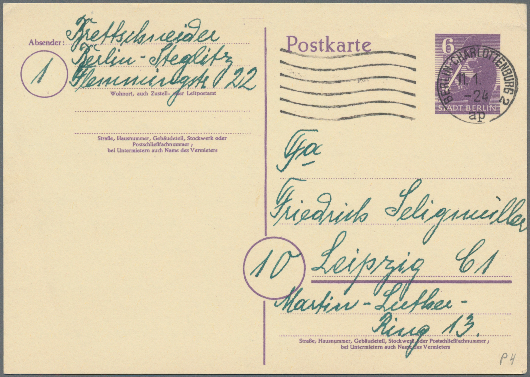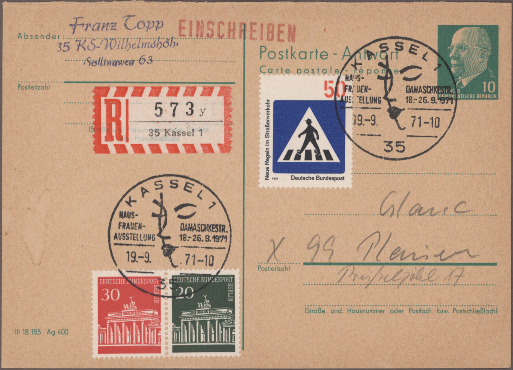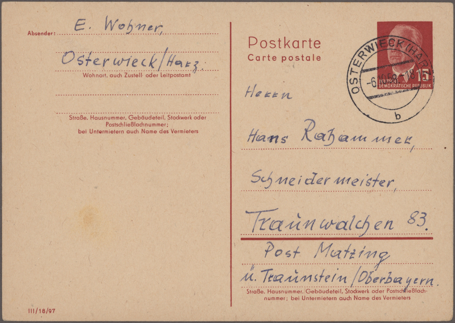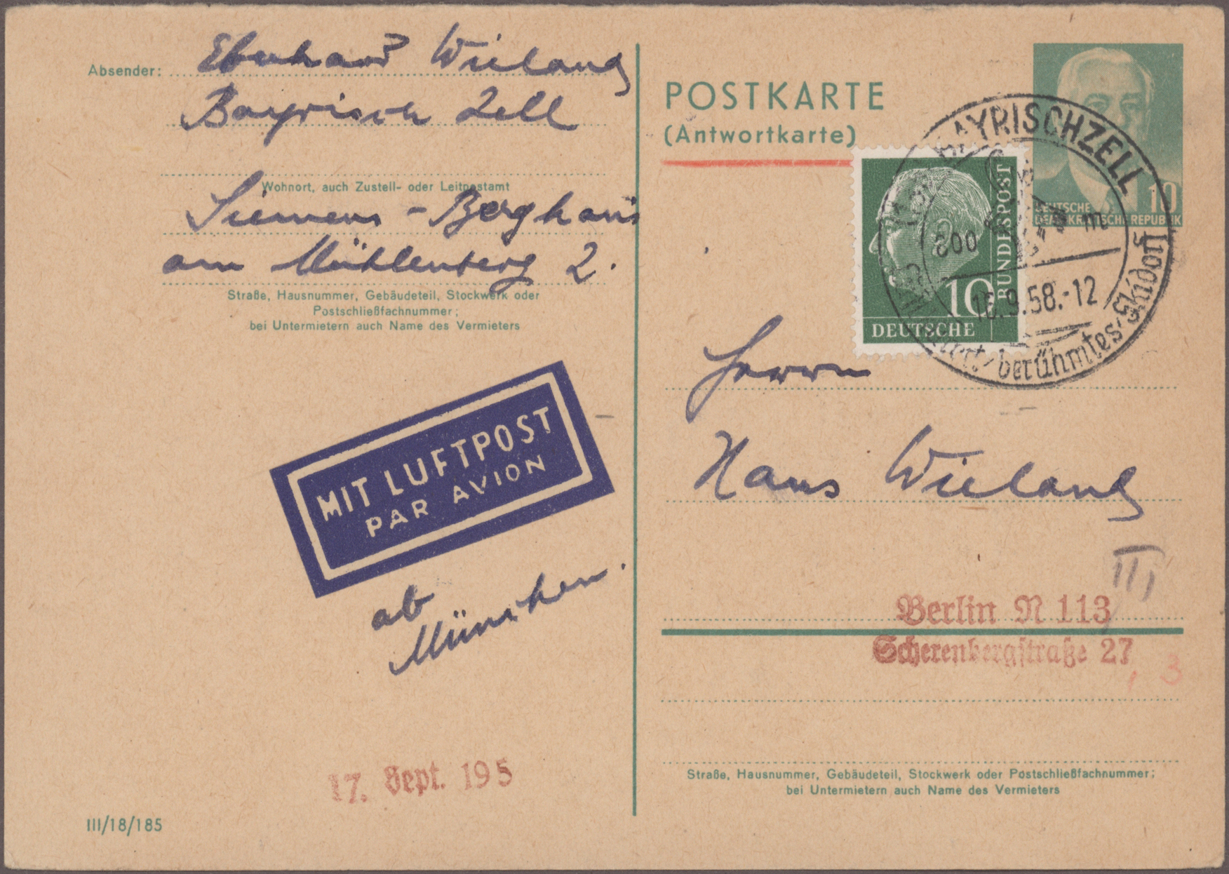 1949/1991, vielseitiger Bestand von über 630 Ganzsachen mit Karten, Antwortkarten und Umschlägen, gebraucht/ungebraucht/blanko gestempelt, dabei etliche Zusatzfrankaturen, auch GAA, R-SbPA, Privat-GA/private Zudrucke, Luftpost, Muster, verschiedene Cachet-Stempel "Weltfestspiele 1951", P 86 mit Aufdruck "3" über "1" der Wertziffer (Probedruck-Umwertung 1990 ??) etc. Sehr interessanter Bestand für den Spezialisten!
