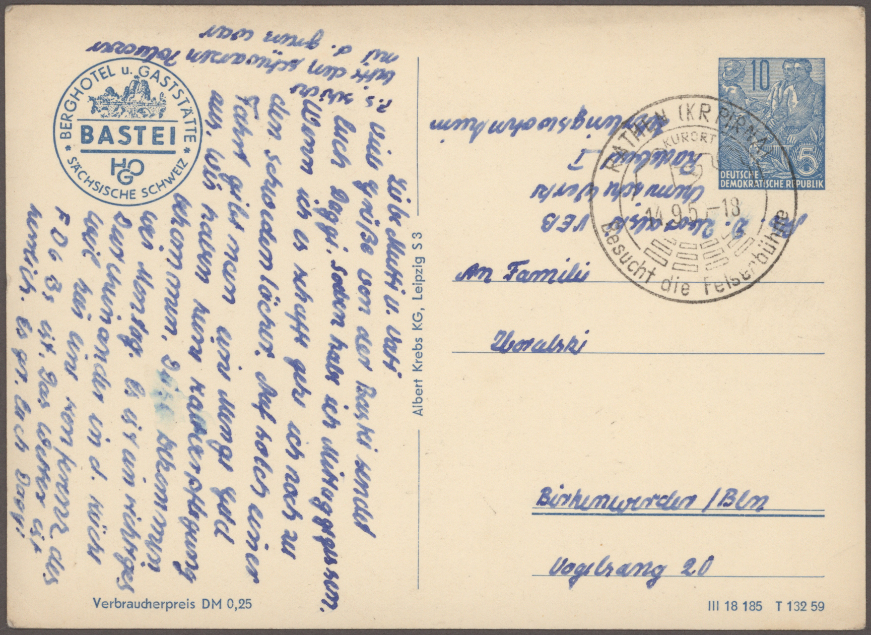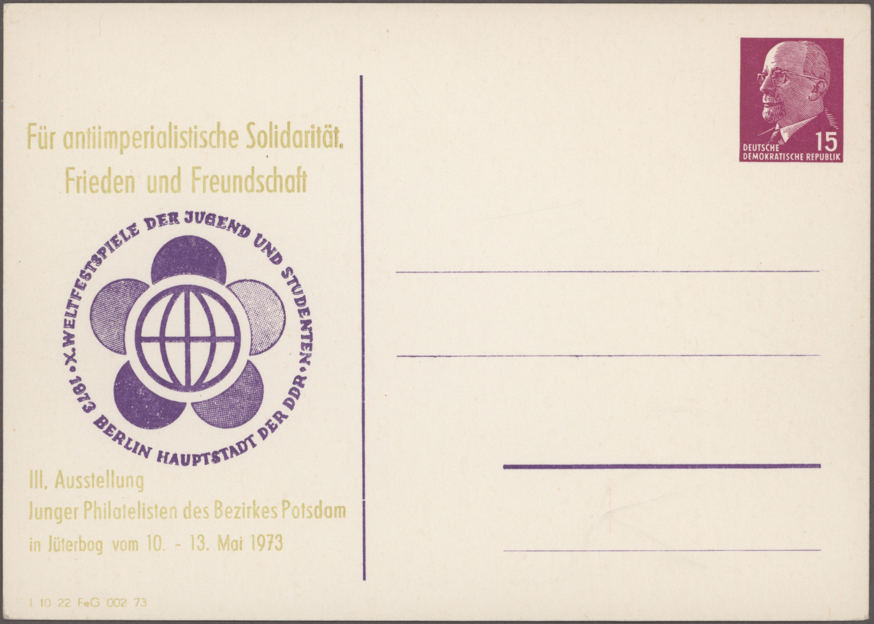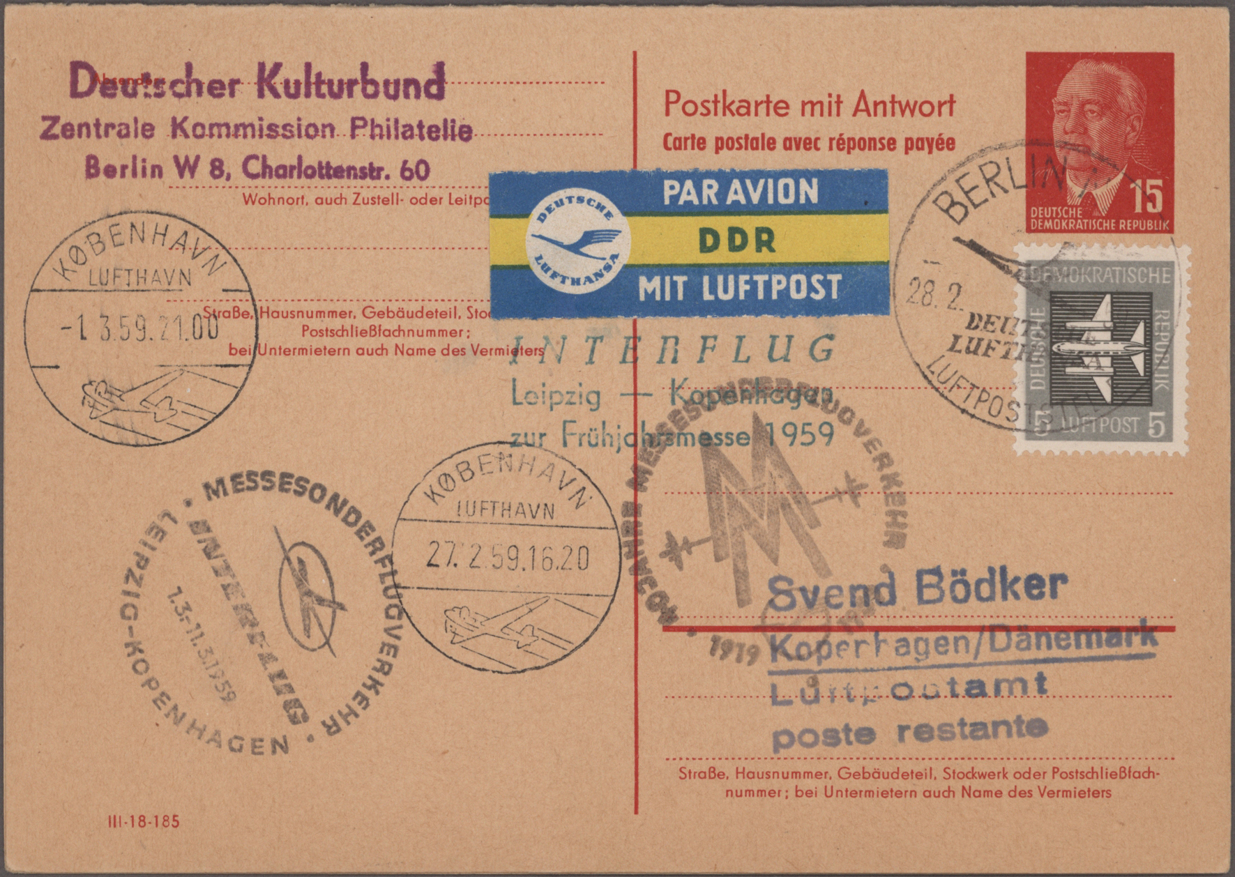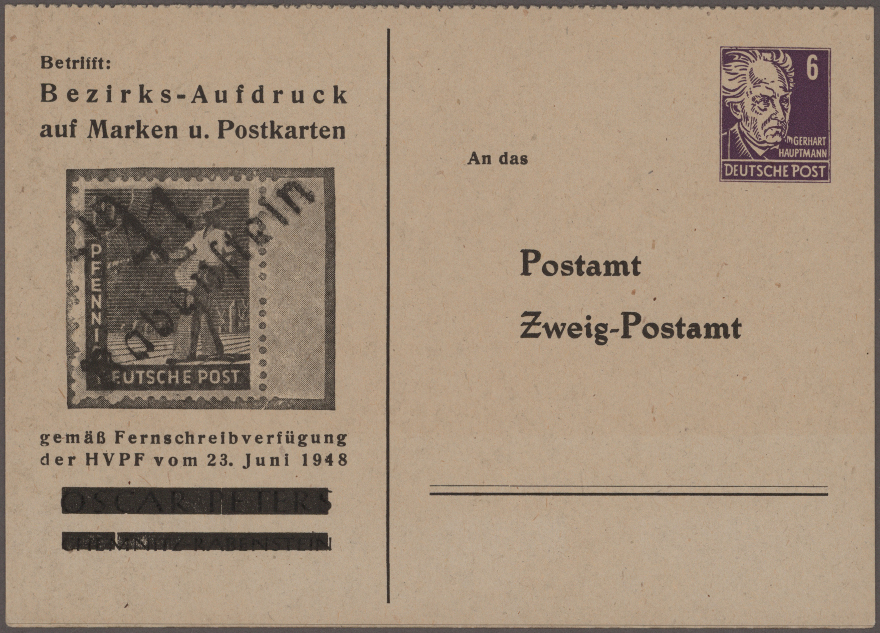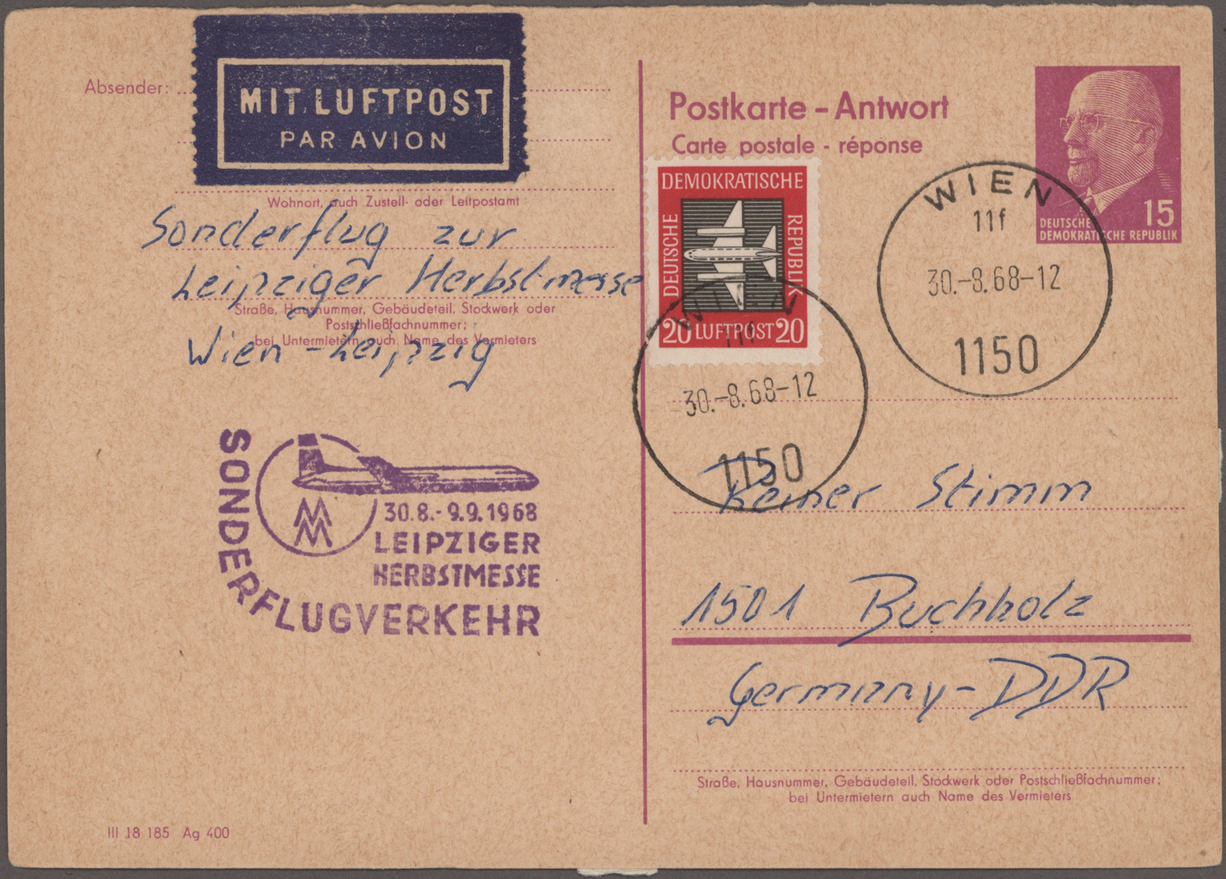 1949/1991, vielseitiger Bestand von über 630 Ganzsachen mit Karten, Antwortkarten und Umschlägen, gebraucht/ungebraucht/blanko gestempelt, dabei etliche Zusatzfrankaturen, auch GAA, R-SbPA, Privat-GA/private Zudrucke, Luftpost, Muster, verschiedene Cachet-Stempel "Weltfestspiele 1951", P 86 mit Aufdruck "3" über "1" der Wertziffer (Probedruck-Umwertung 1990 ??) etc. Sehr interessanter Bestand für den Spezialisten!
