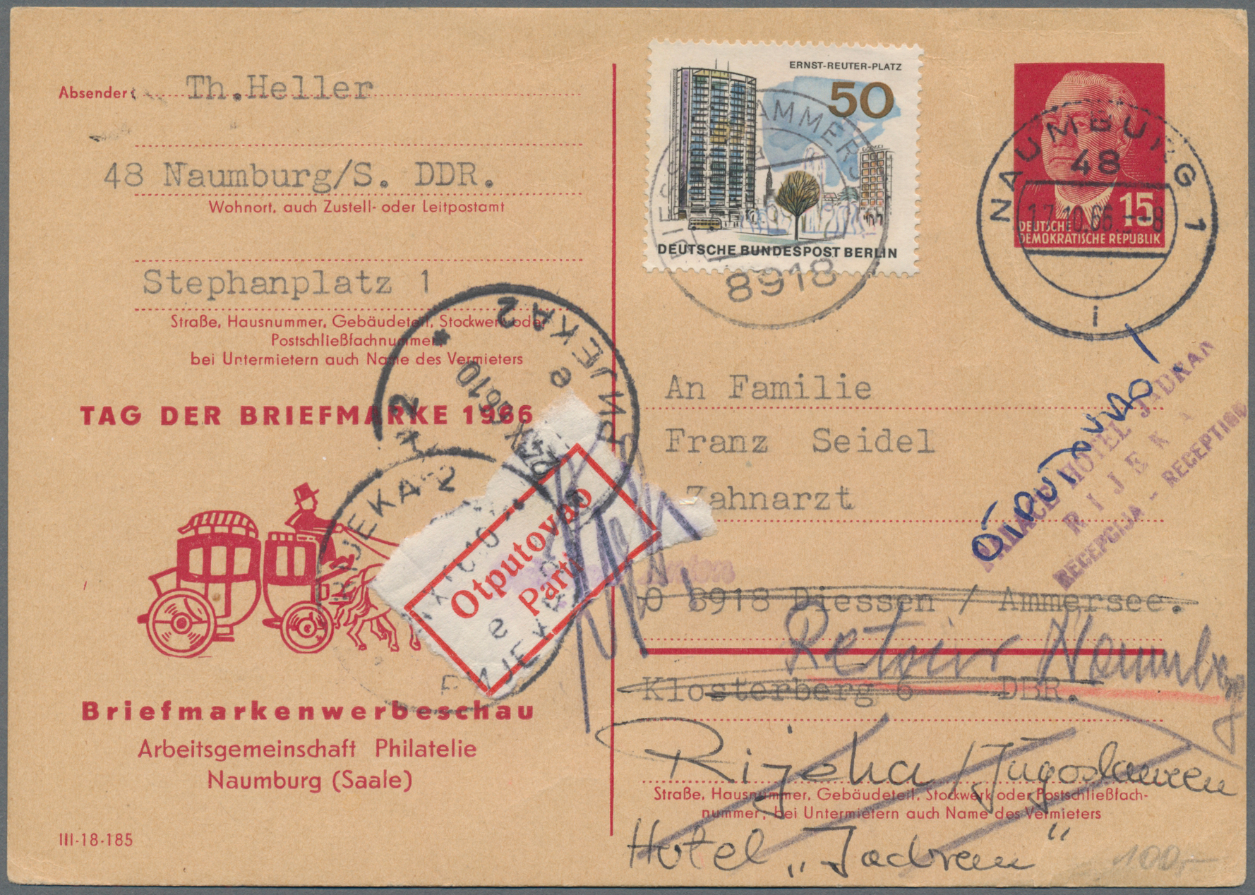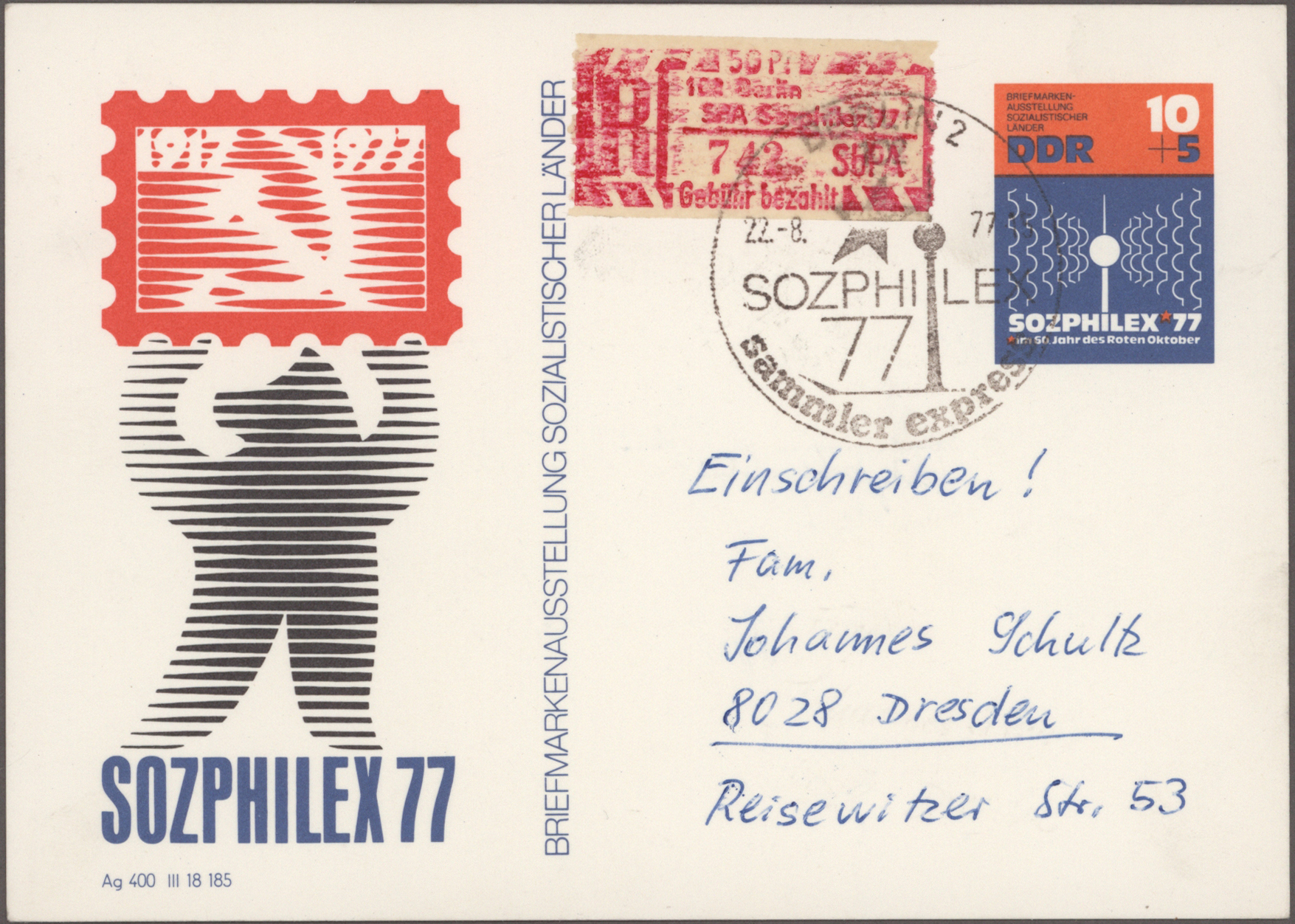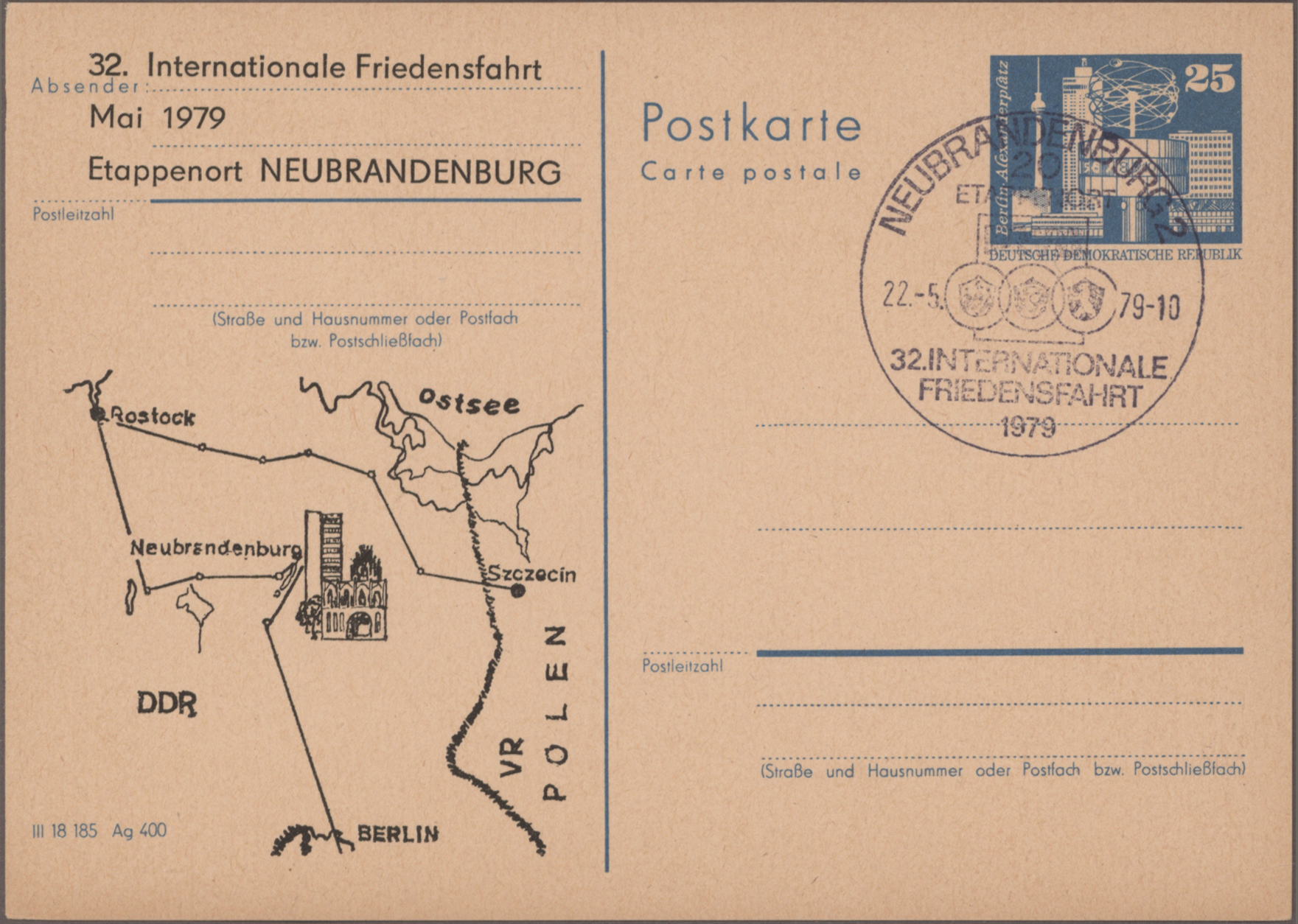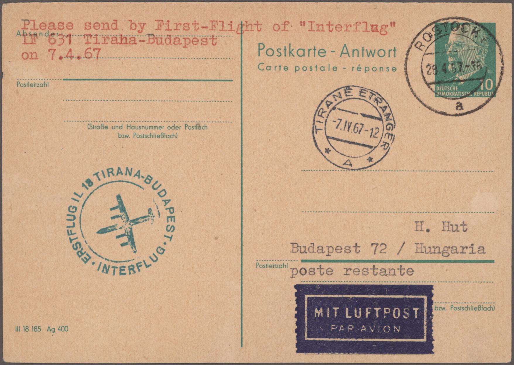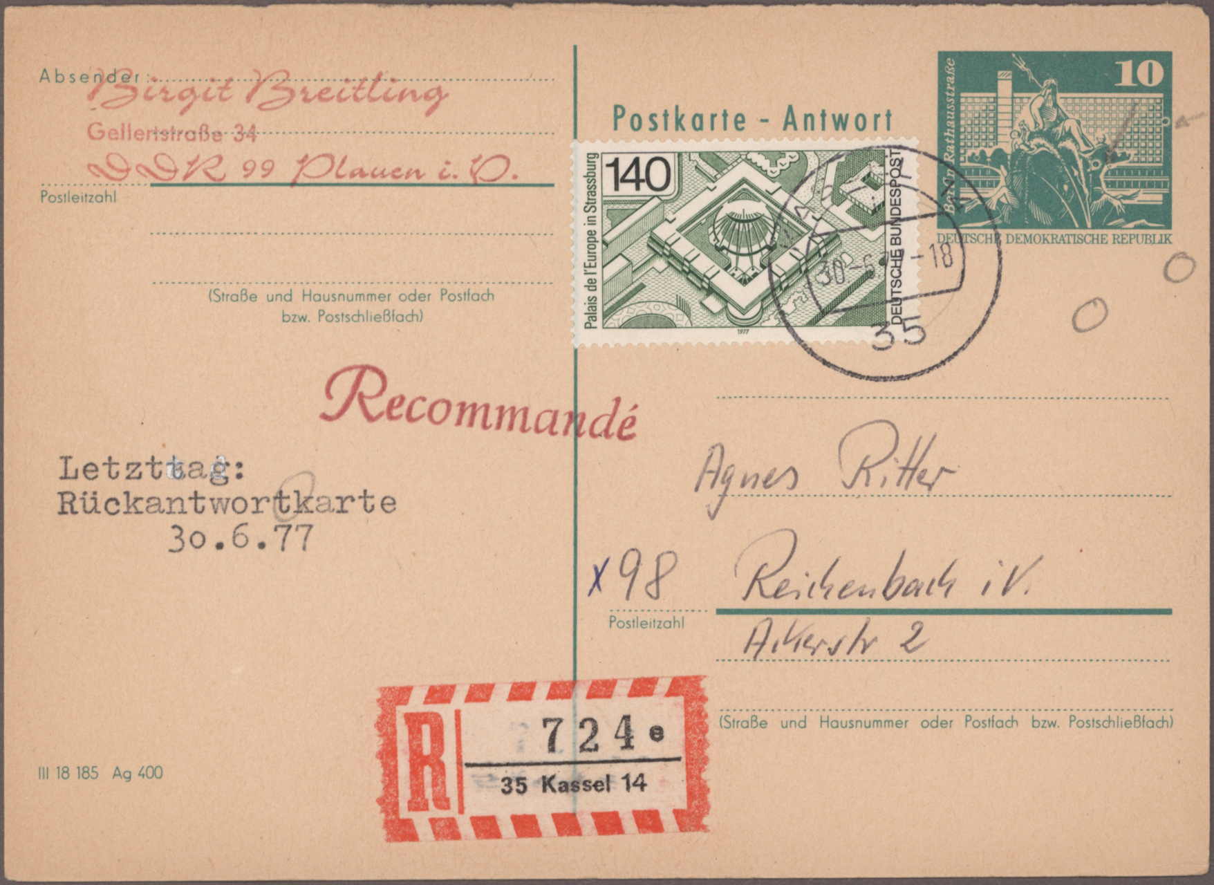 1949/1991, vielseitiger Bestand von über 630 Ganzsachen mit Karten, Antwortkarten und Umschlägen, gebraucht/ungebraucht/blanko gestempelt, dabei etliche Zusatzfrankaturen, auch GAA, R-SbPA, Privat-GA/private Zudrucke, Luftpost, Muster, verschiedene Cachet-Stempel "Weltfestspiele 1951", P 86 mit Aufdruck "3" über "1" der Wertziffer (Probedruck-Umwertung 1990 ??) etc. Sehr interessanter Bestand für den Spezialisten!