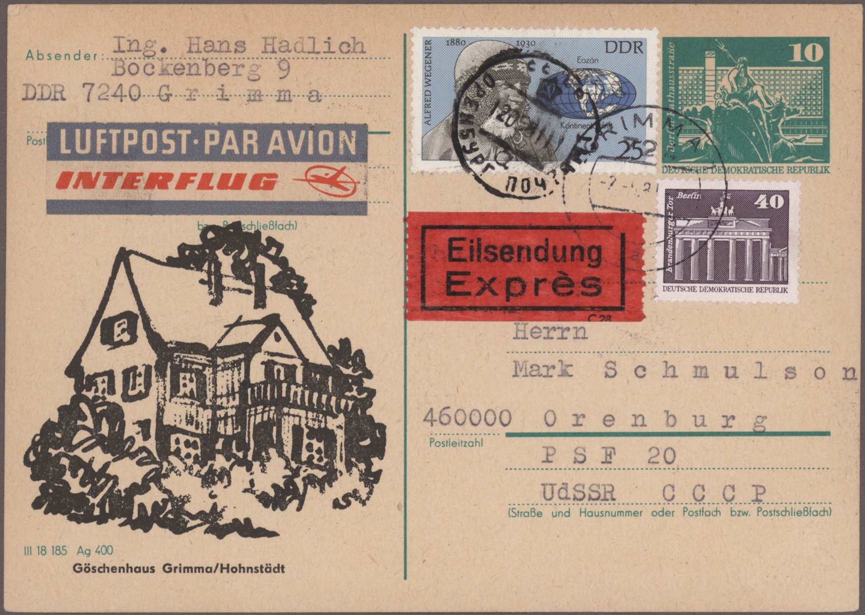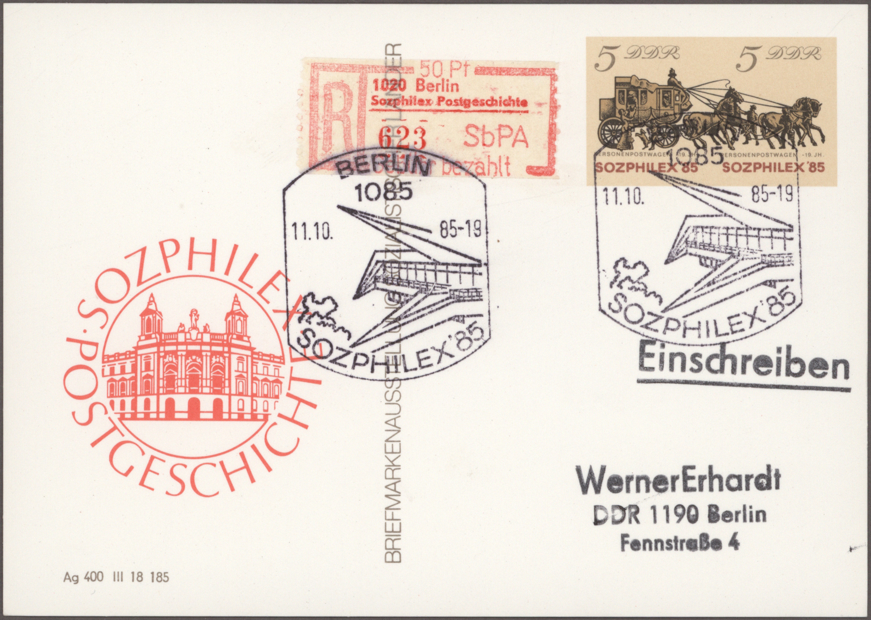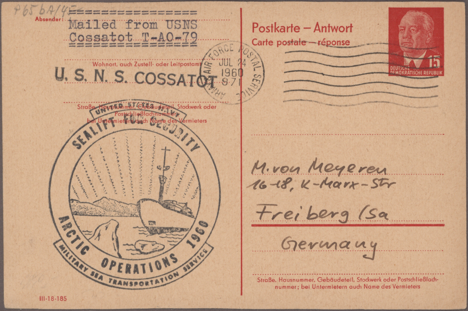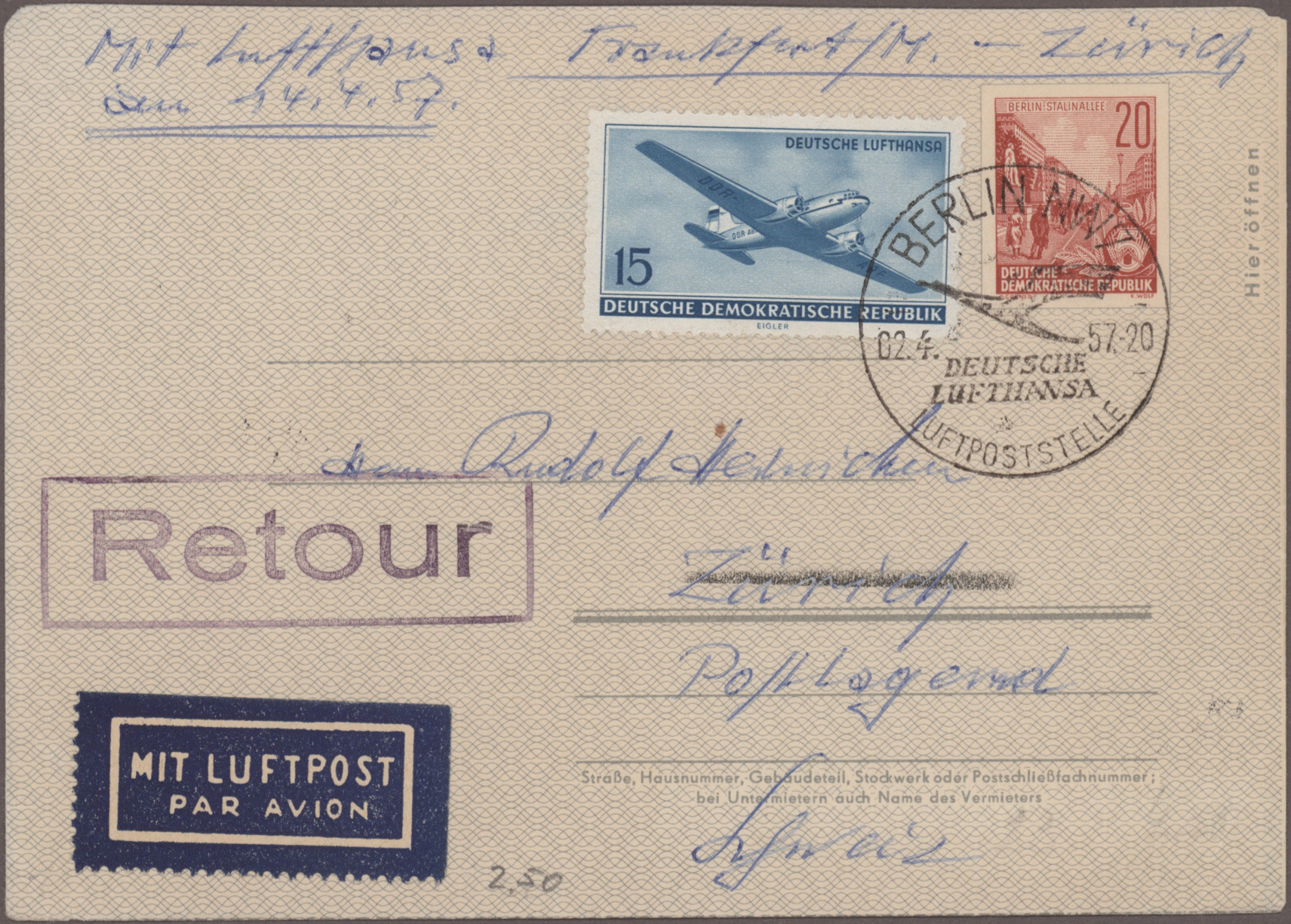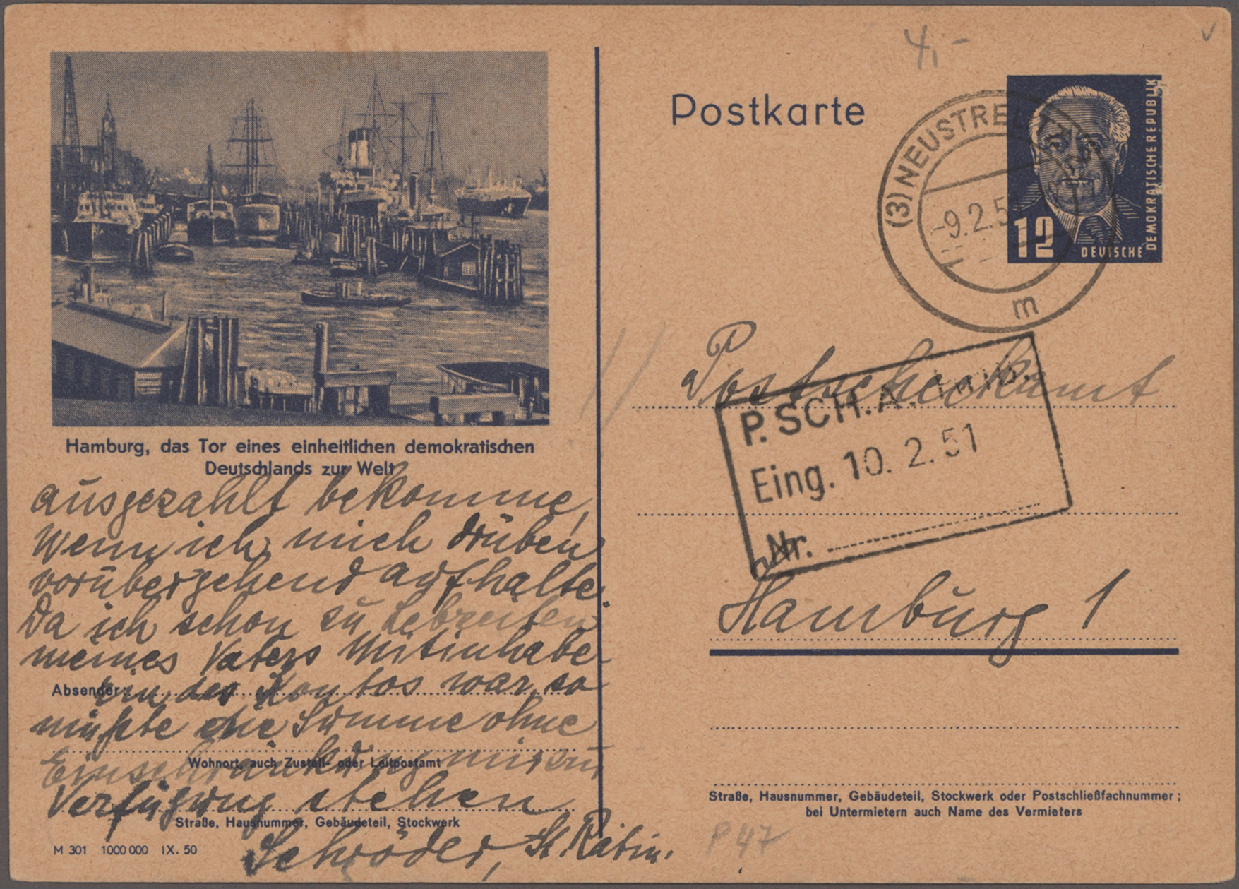 1949/1991, vielseitiger Bestand von über 630 Ganzsachen mit Karten, Antwortkarten und Umschlägen, gebraucht/ungebraucht/blanko gestempelt, dabei etliche Zusatzfrankaturen, auch GAA, R-SbPA, Privat-GA/private Zudrucke, Luftpost, Muster, verschiedene Cachet-Stempel "Weltfestspiele 1951", P 86 mit Aufdruck "3" über "1" der Wertziffer (Probedruck-Umwertung 1990 ??) etc. Sehr interessanter Bestand für den Spezialisten!