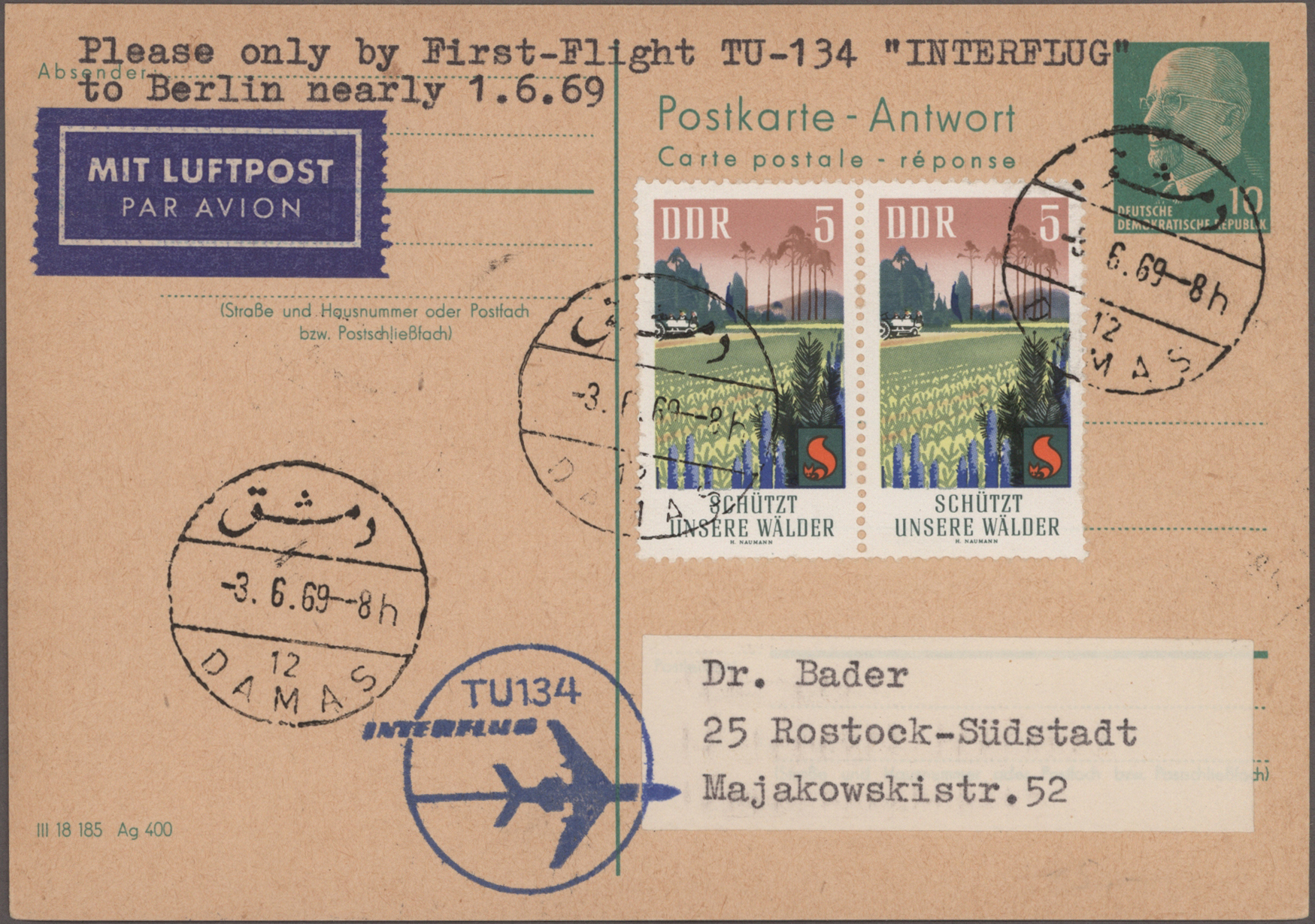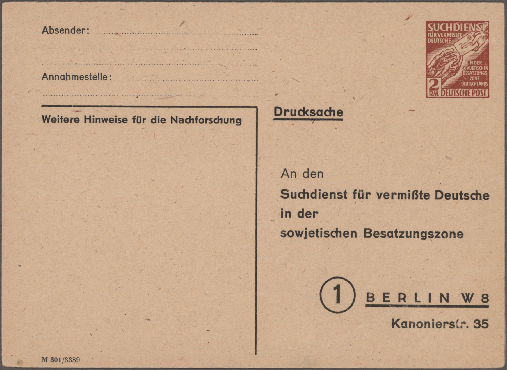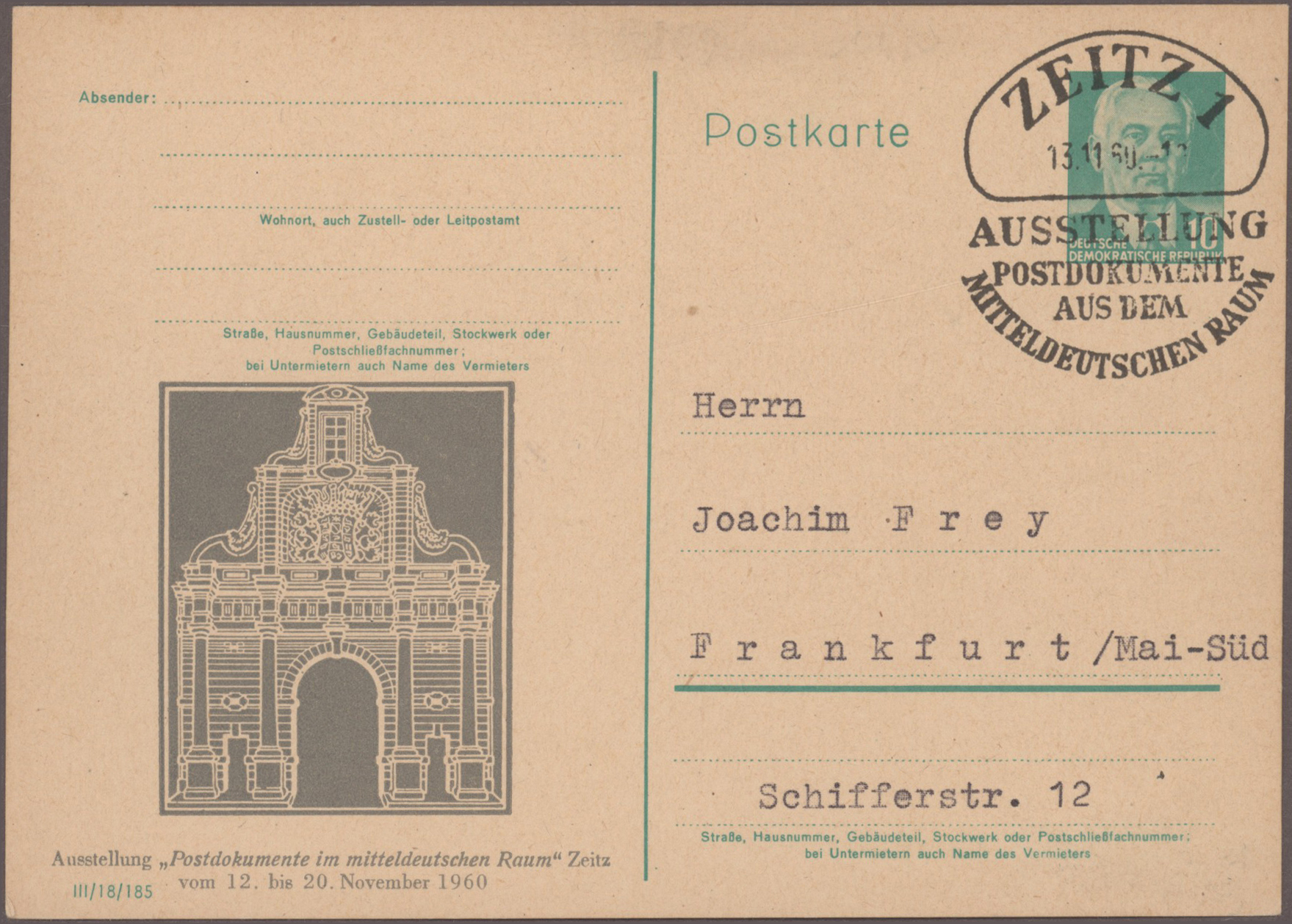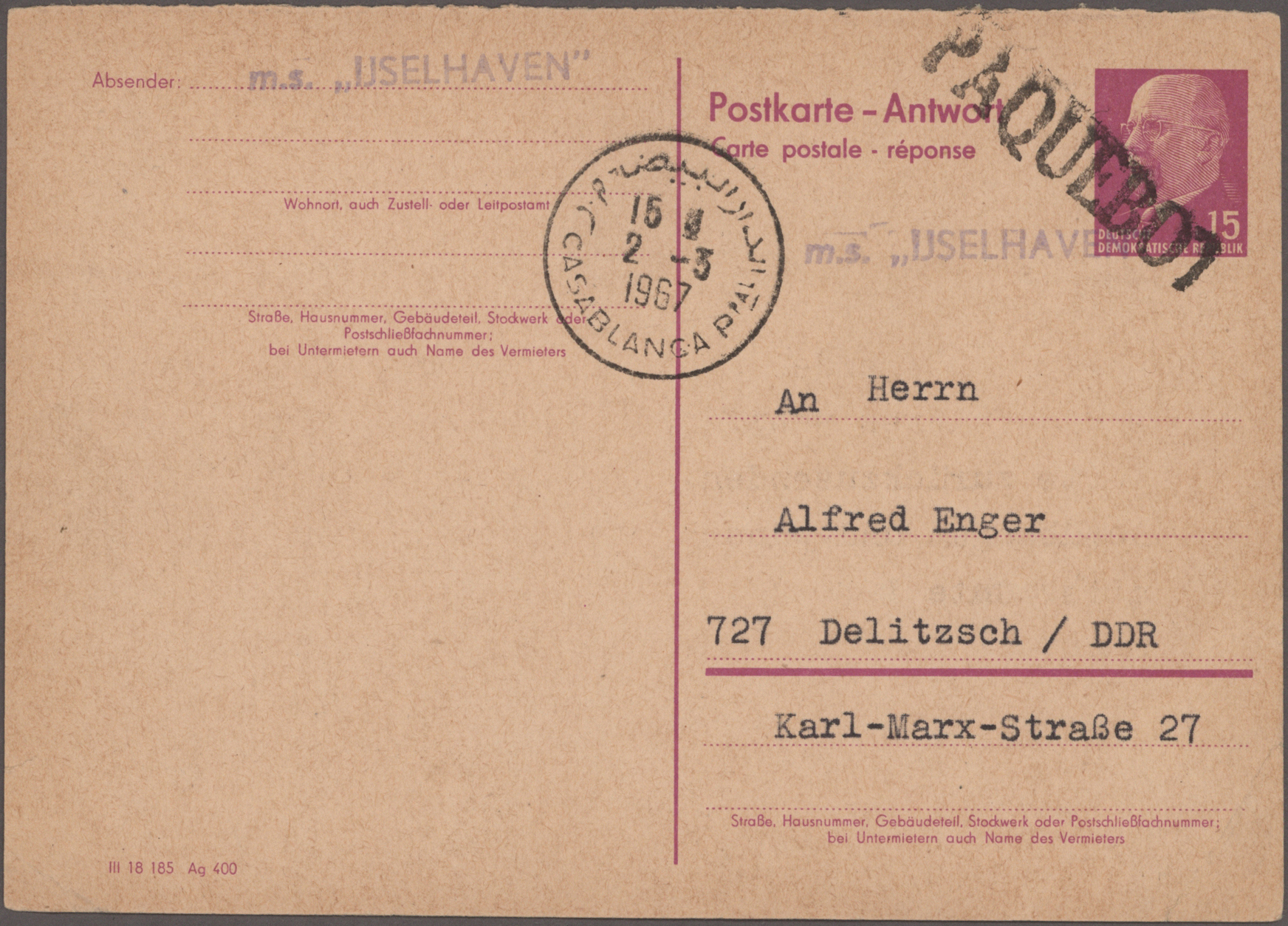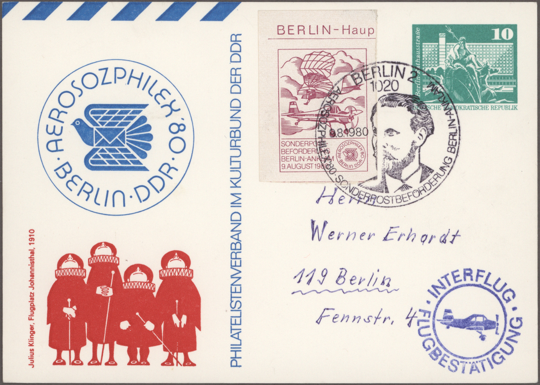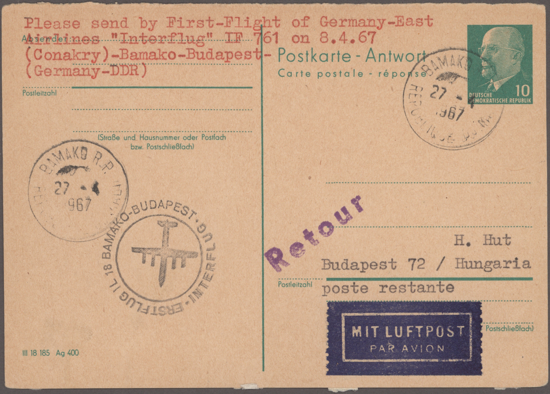 1949/1991, vielseitiger Bestand von über 630 Ganzsachen mit Karten, Antwortkarten und Umschlägen, gebraucht/ungebraucht/blanko gestempelt, dabei etliche Zusatzfrankaturen, auch GAA, R-SbPA, Privat-GA/private Zudrucke, Luftpost, Muster, verschiedene Cachet-Stempel "Weltfestspiele 1951", P 86 mit Aufdruck "3" über "1" der Wertziffer (Probedruck-Umwertung 1990 ??) etc. Sehr interessanter Bestand für den Spezialisten!