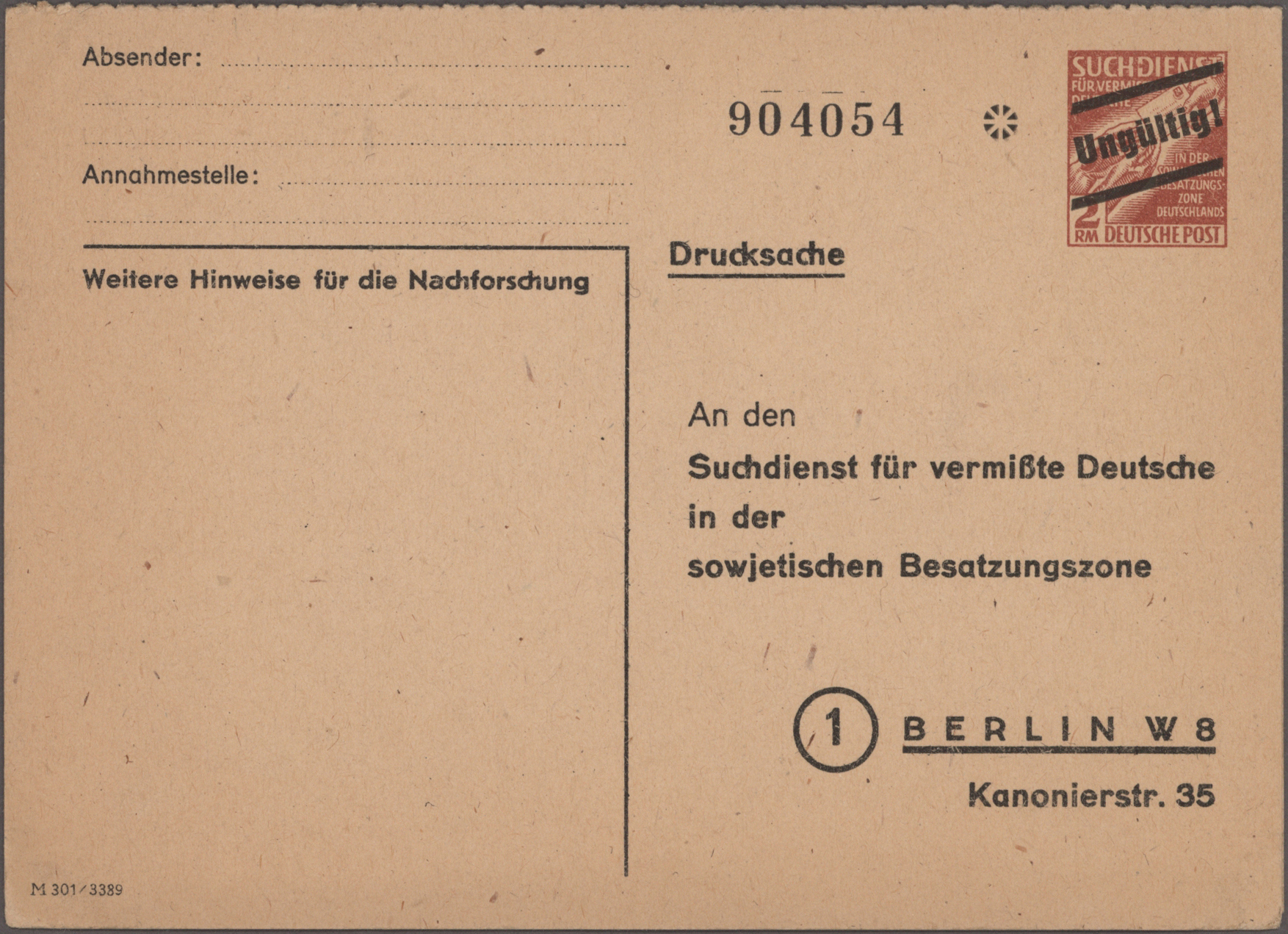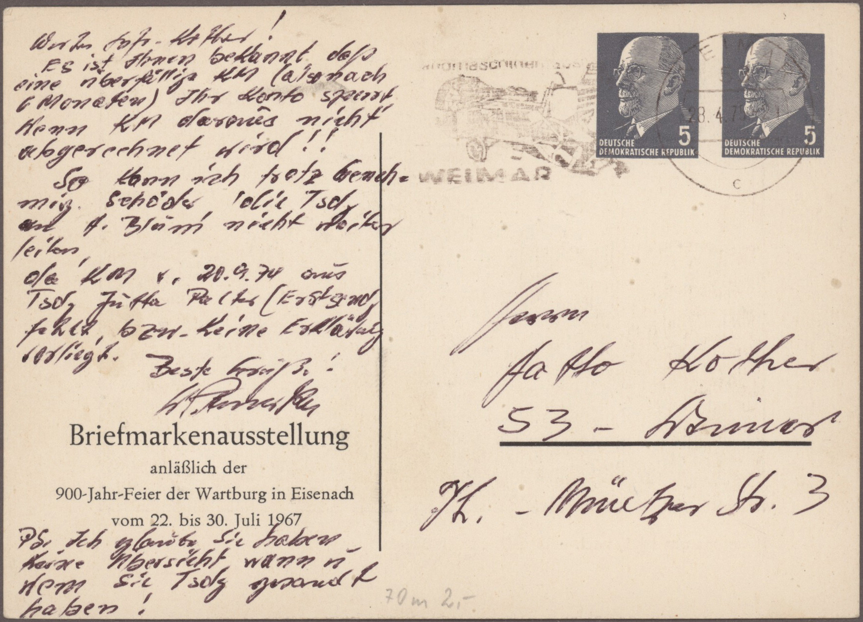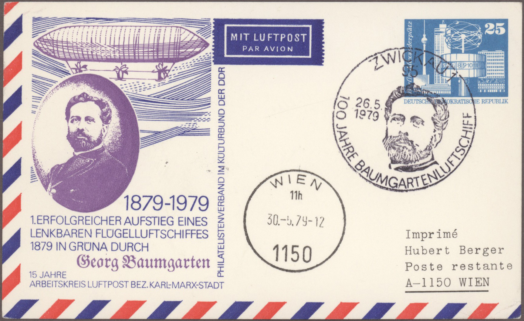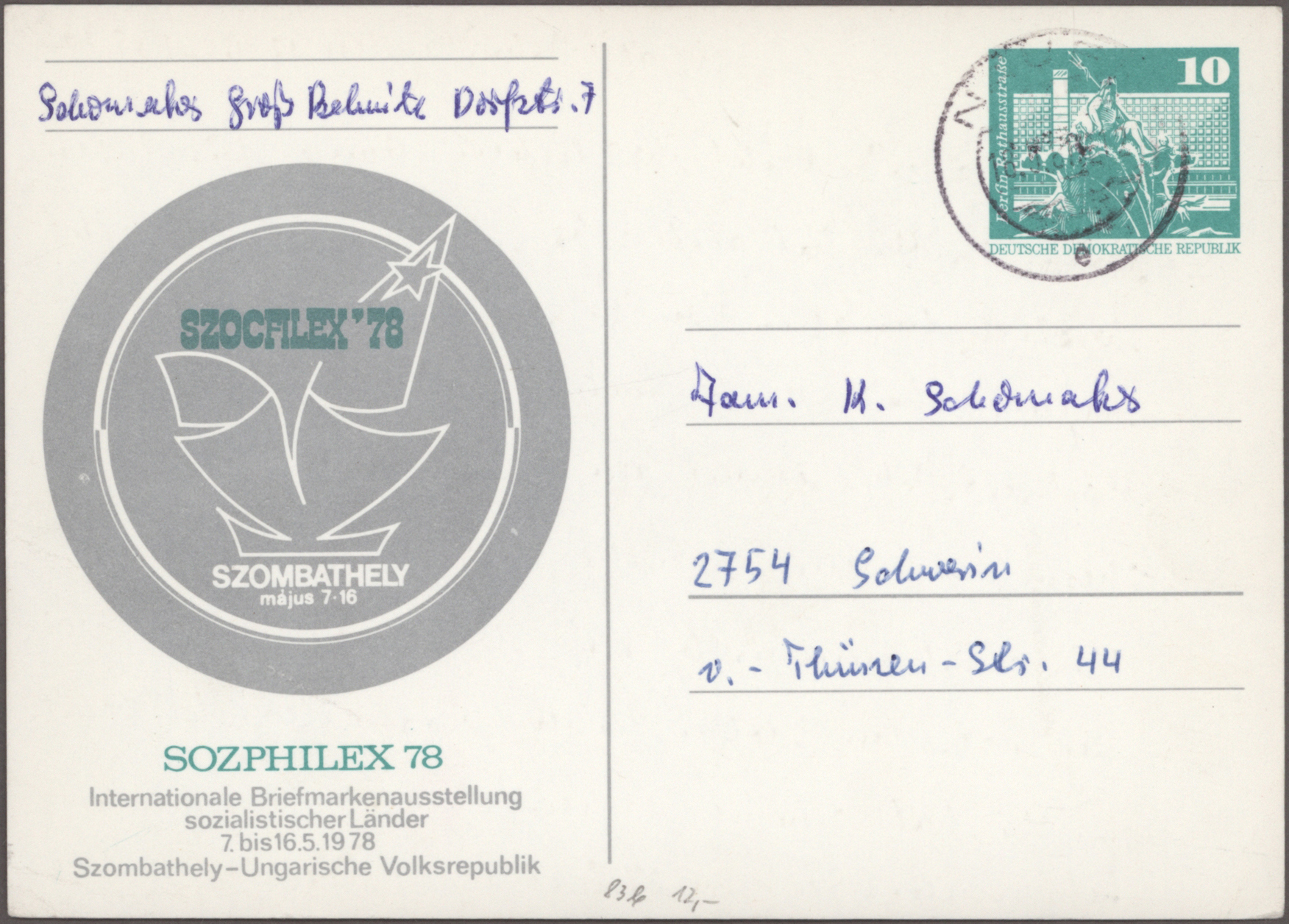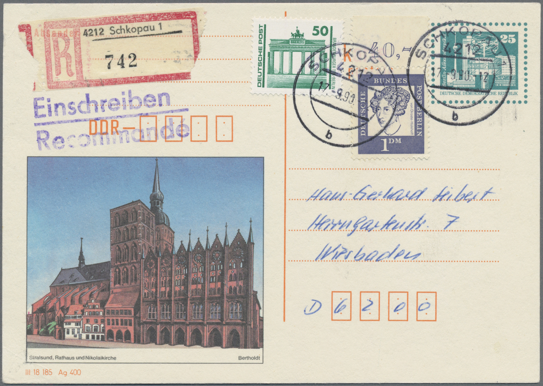 1949/1991, vielseitiger Bestand von über 630 Ganzsachen mit Karten, Antwortkarten und Umschlägen, gebraucht/ungebraucht/blanko gestempelt, dabei etliche Zusatzfrankaturen, auch GAA, R-SbPA, Privat-GA/private Zudrucke, Luftpost, Muster, verschiedene Cachet-Stempel "Weltfestspiele 1951", P 86 mit Aufdruck "3" über "1" der Wertziffer (Probedruck-Umwertung 1990 ??) etc. Sehr interessanter Bestand für den Spezialisten!
