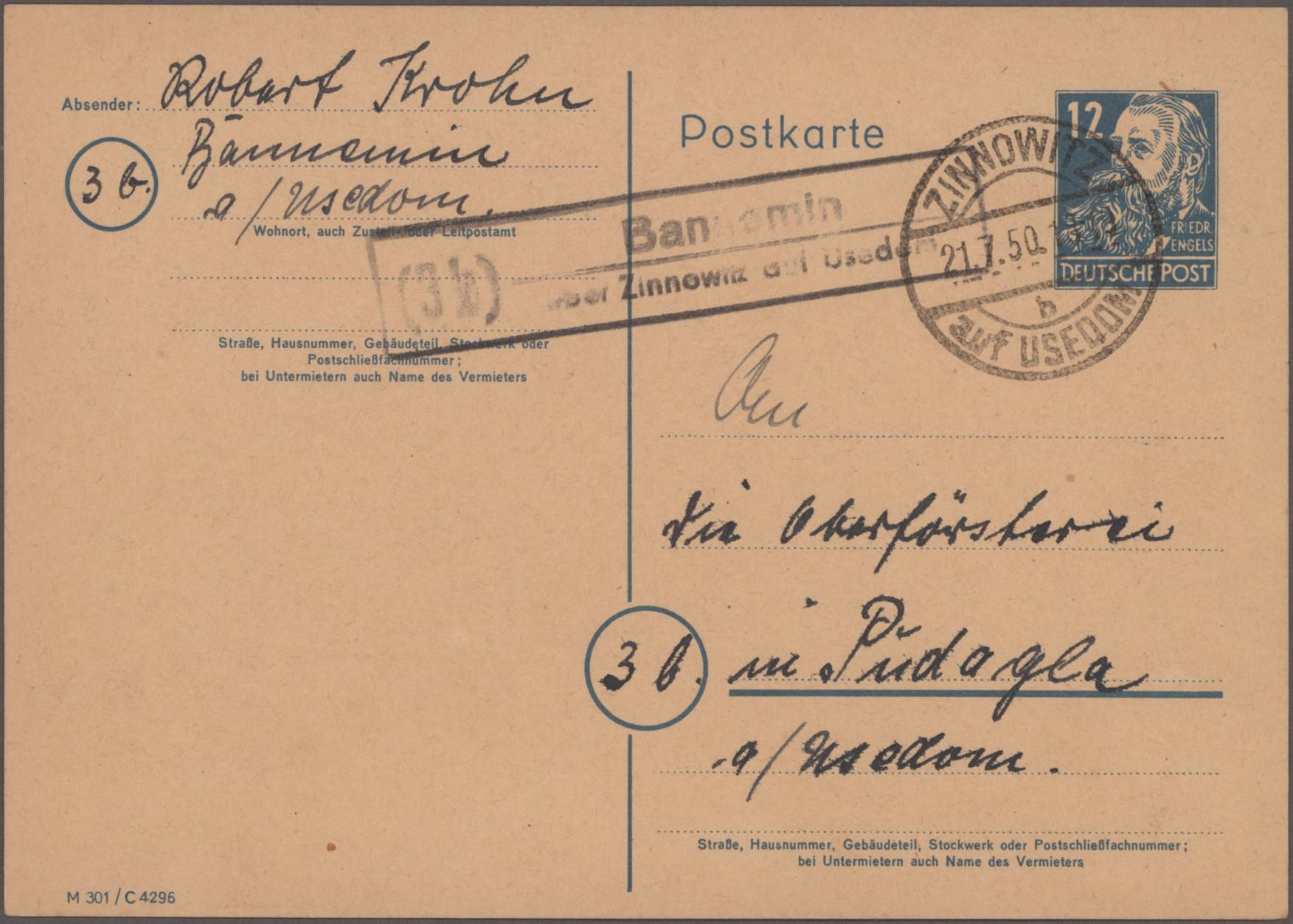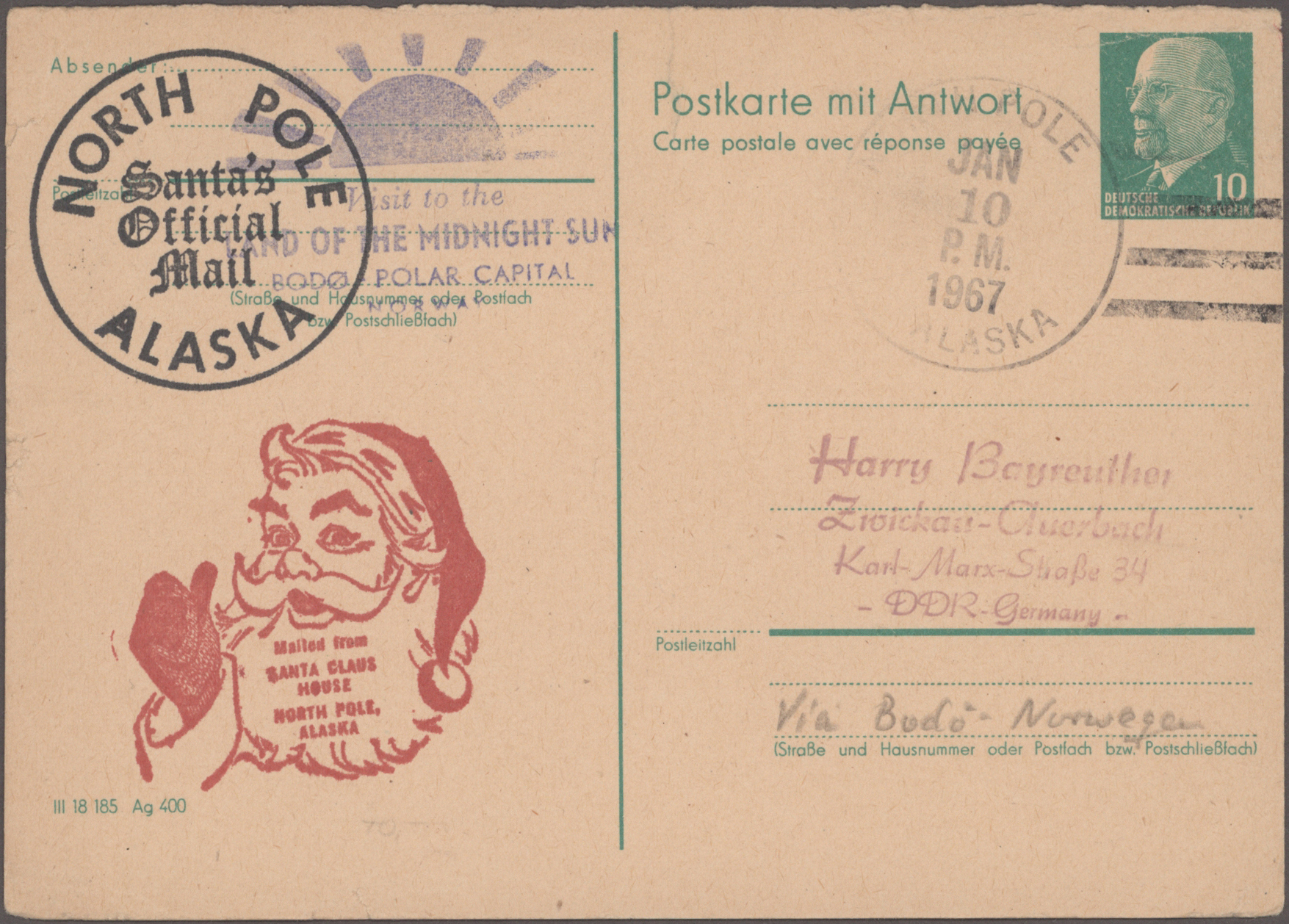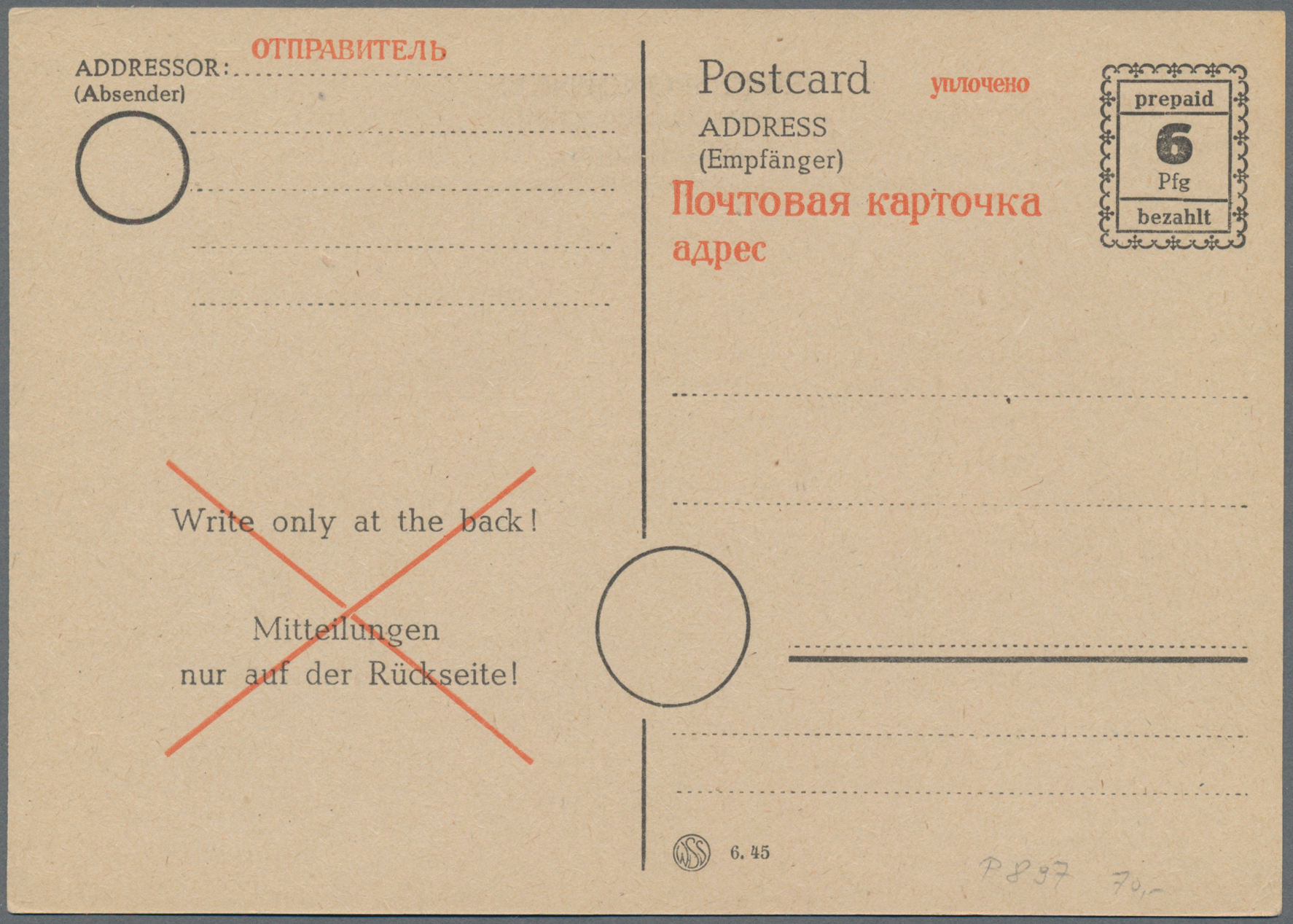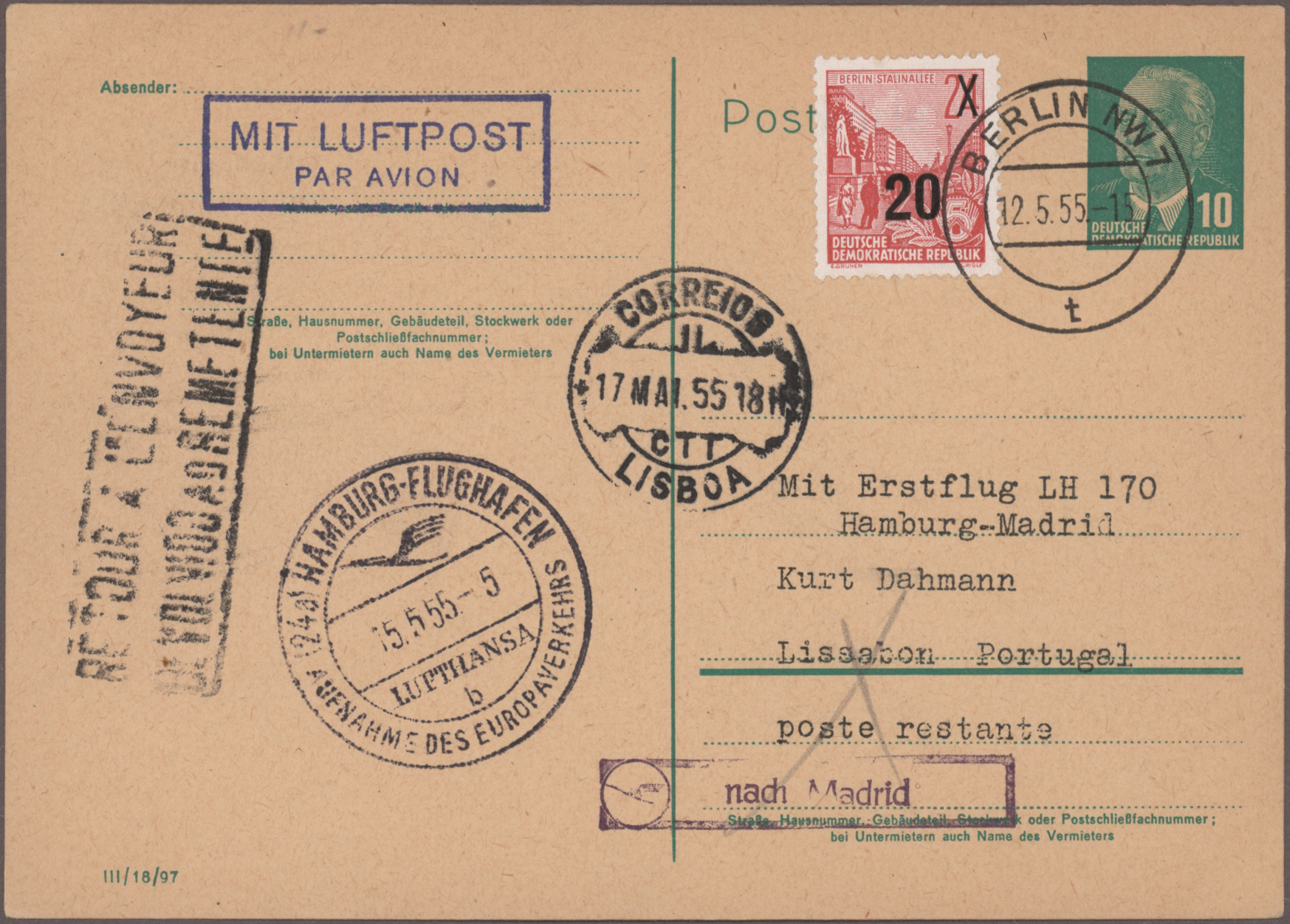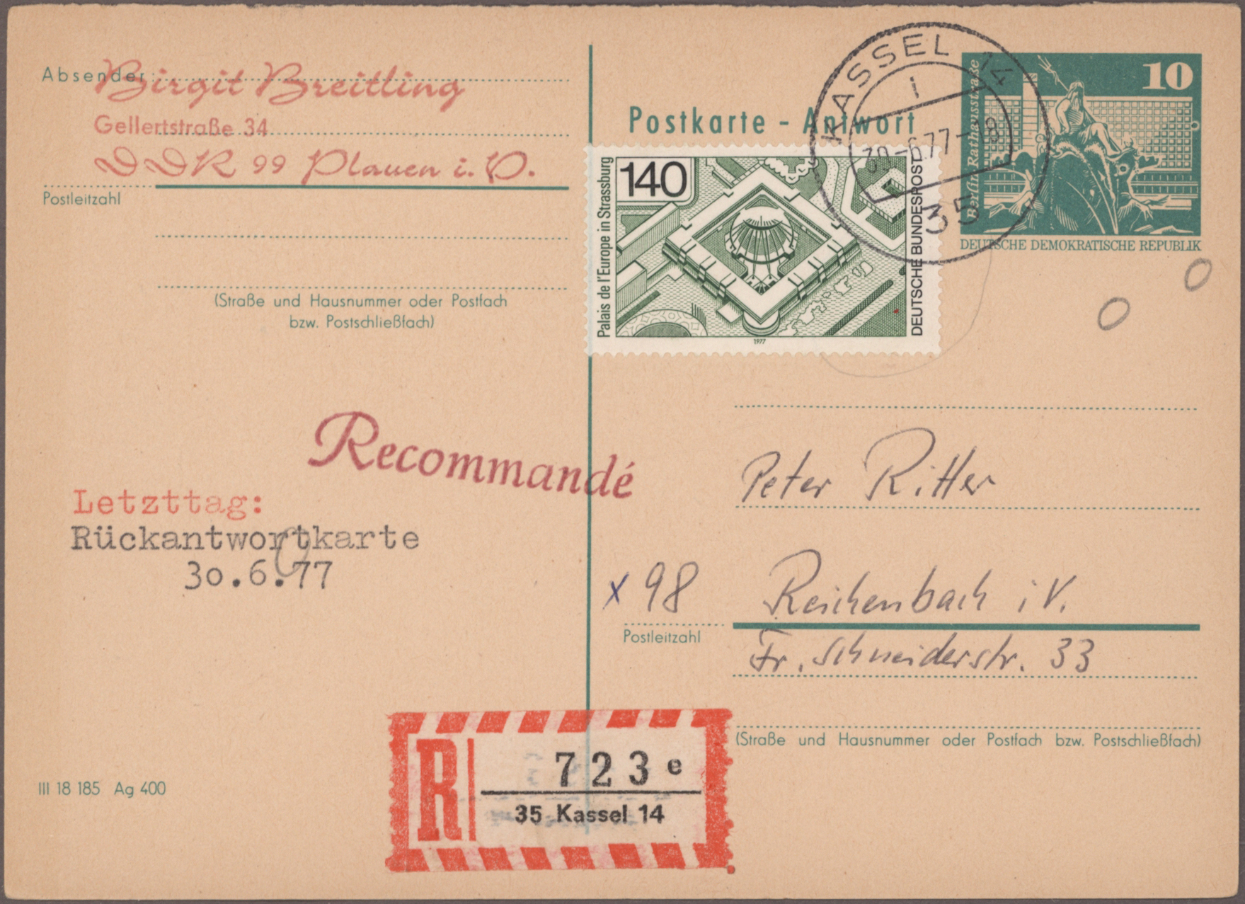 1949/1991, vielseitiger Bestand von über 630 Ganzsachen mit Karten, Antwortkarten und Umschlägen, gebraucht/ungebraucht/blanko gestempelt, dabei etliche Zusatzfrankaturen, auch GAA, R-SbPA, Privat-GA/private Zudrucke, Luftpost, Muster, verschiedene Cachet-Stempel "Weltfestspiele 1951", P 86 mit Aufdruck "3" über "1" der Wertziffer (Probedruck-Umwertung 1990 ??) etc. Sehr interessanter Bestand für den Spezialisten!
