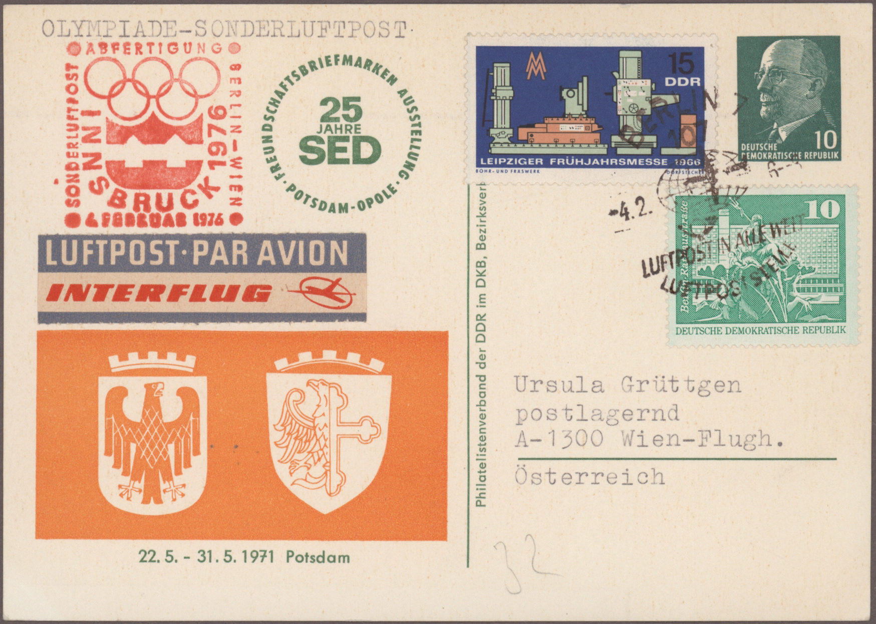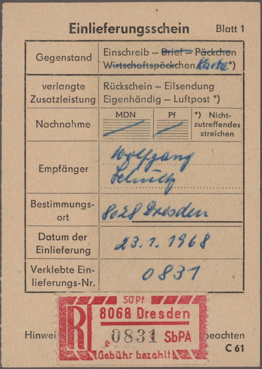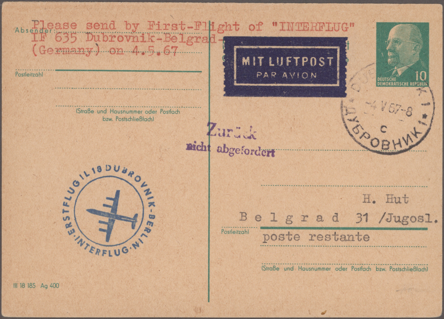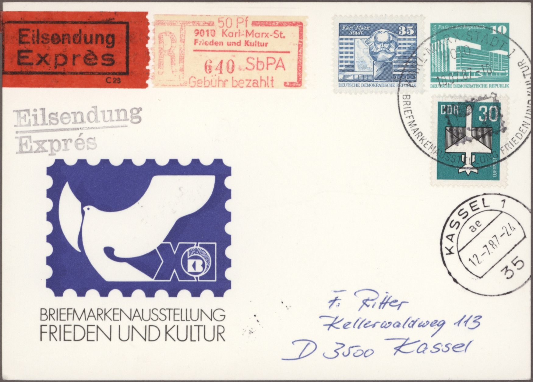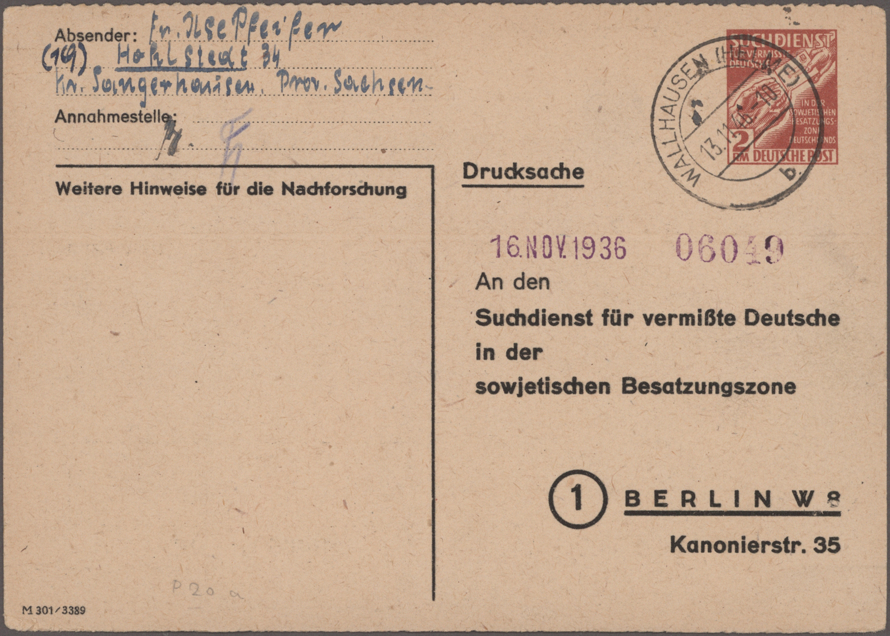1949/1991, vielseitiger Bestand von über 630 Ganzsachen mit Karten, Antwortkarten und Umschlägen, gebraucht/ungebraucht/blanko gestempelt, dabei etliche Zusatzfrankaturen, auch GAA, R-SbPA, Privat-GA/private Zudrucke, Luftpost, Muster, verschiedene Cachet-Stempel "Weltfestspiele 1951", P 86 mit Aufdruck "3" über "1" der Wertziffer (Probedruck-Umwertung 1990 ??) etc. Sehr interessanter Bestand für den Spezialisten!