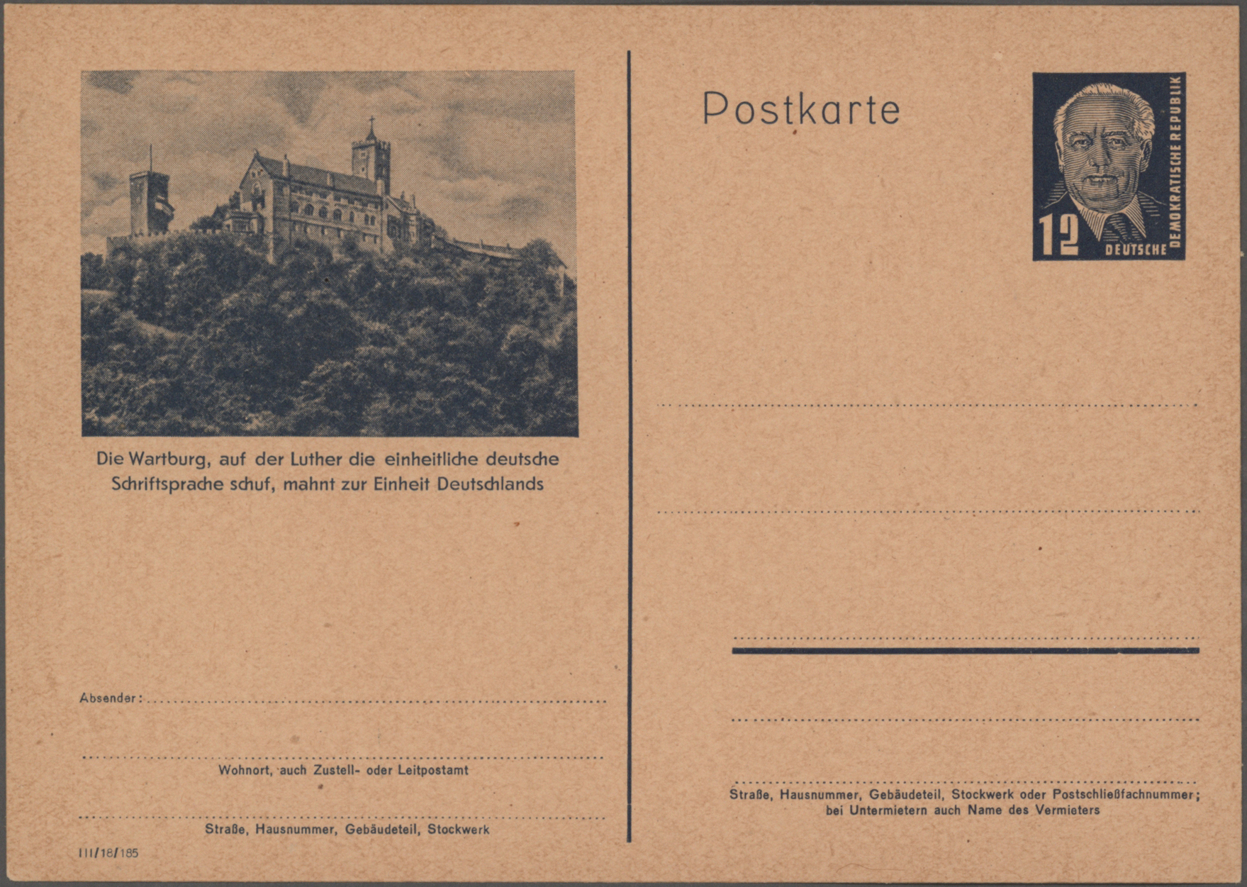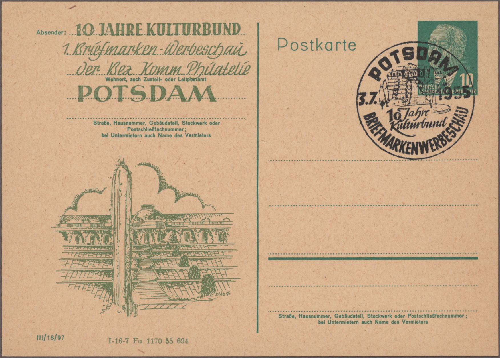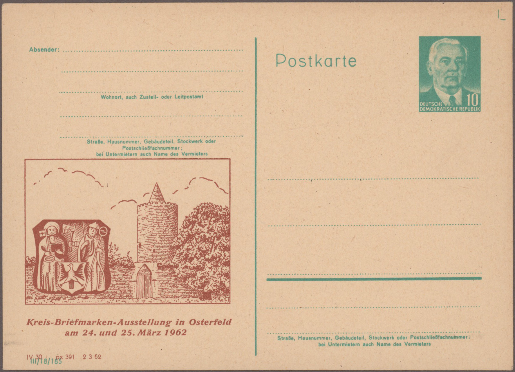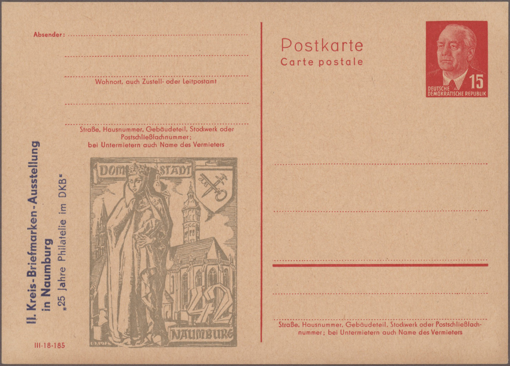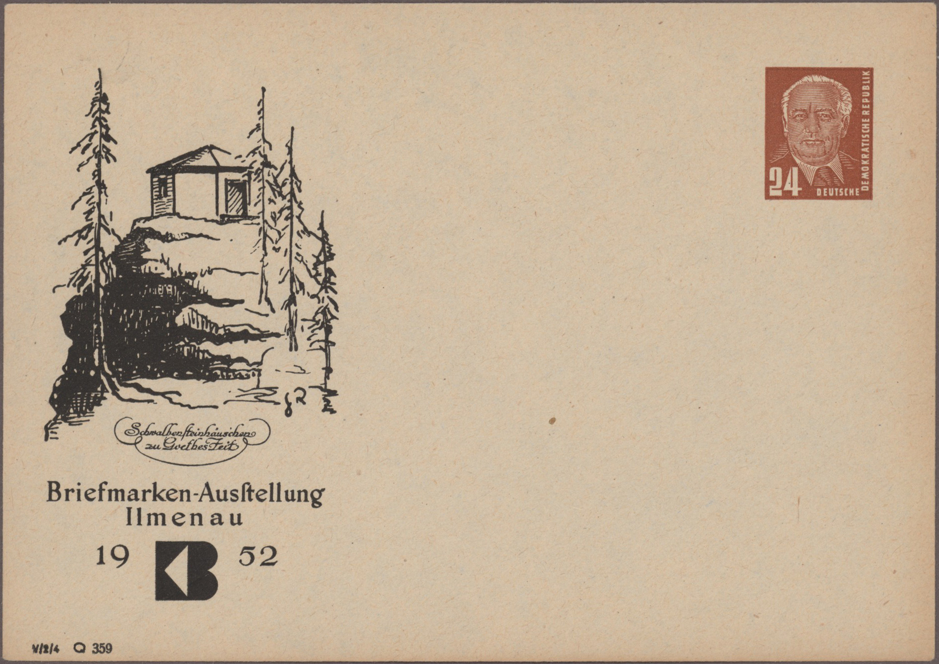 1952/1990, umfangreiche Sammlung von ca. 760 Privat-Ganzsachen (Karten und Umschläge), meist ungebraucht bzw. blanko gestempelt, dabei ca. 116 frühe Ganzsachen (meist Köpfe/Fünfjahrplan), ca. 209 Stück Ulbricht, ca. 247 Stück 10 Pfg. Große Bauwerke, ca. 59 Stück 25 Pfg. Große Bauwerke, ca. 88 Stück 10 Pfg. Kleine Bauwerke, alles in guter Vielfalt gesammelt, auch etliche Ansichtskarten-Ganzsachen, usw. Ein empfehlenswertes Objekt in durchweg sauberer Erhaltung!