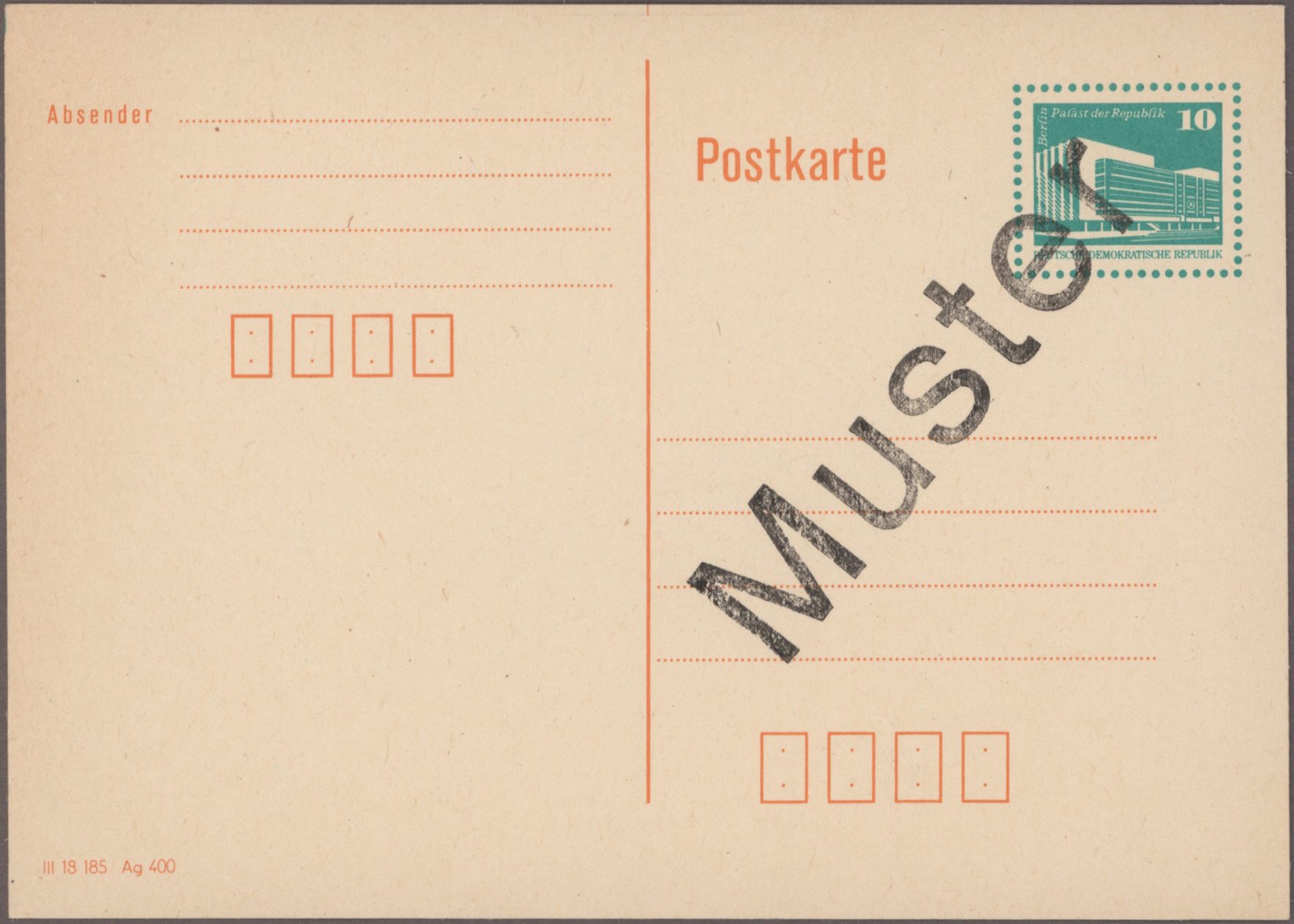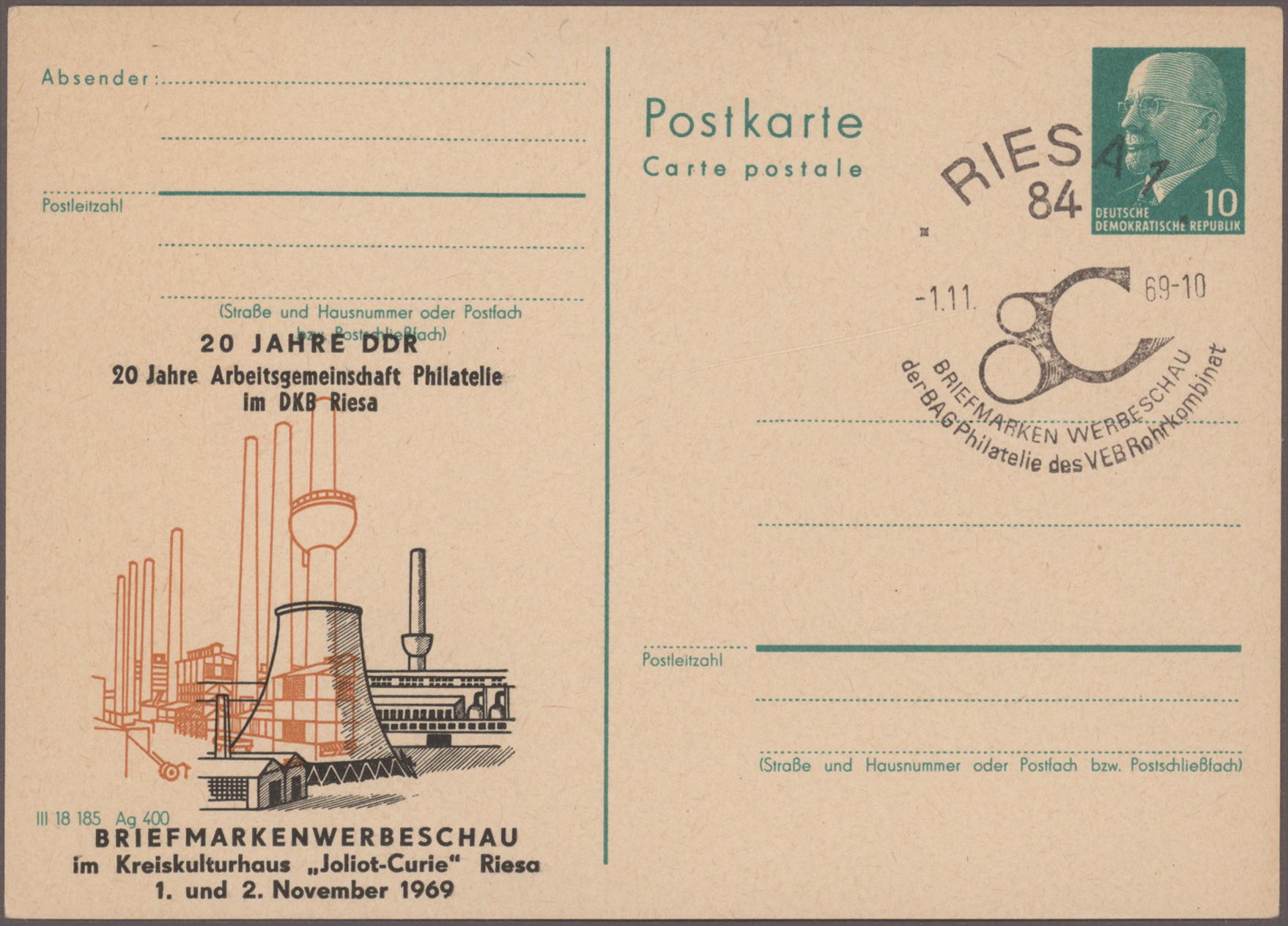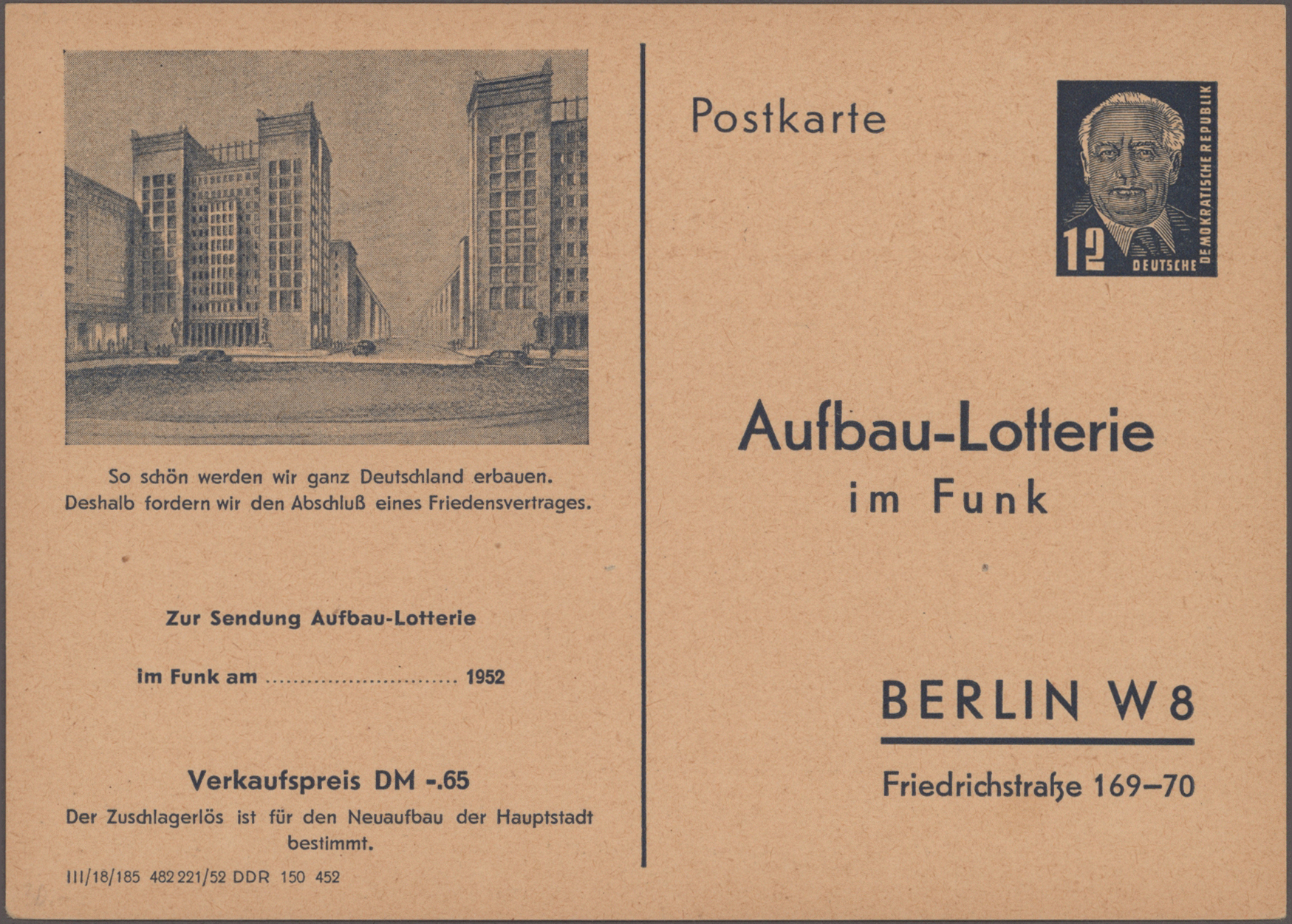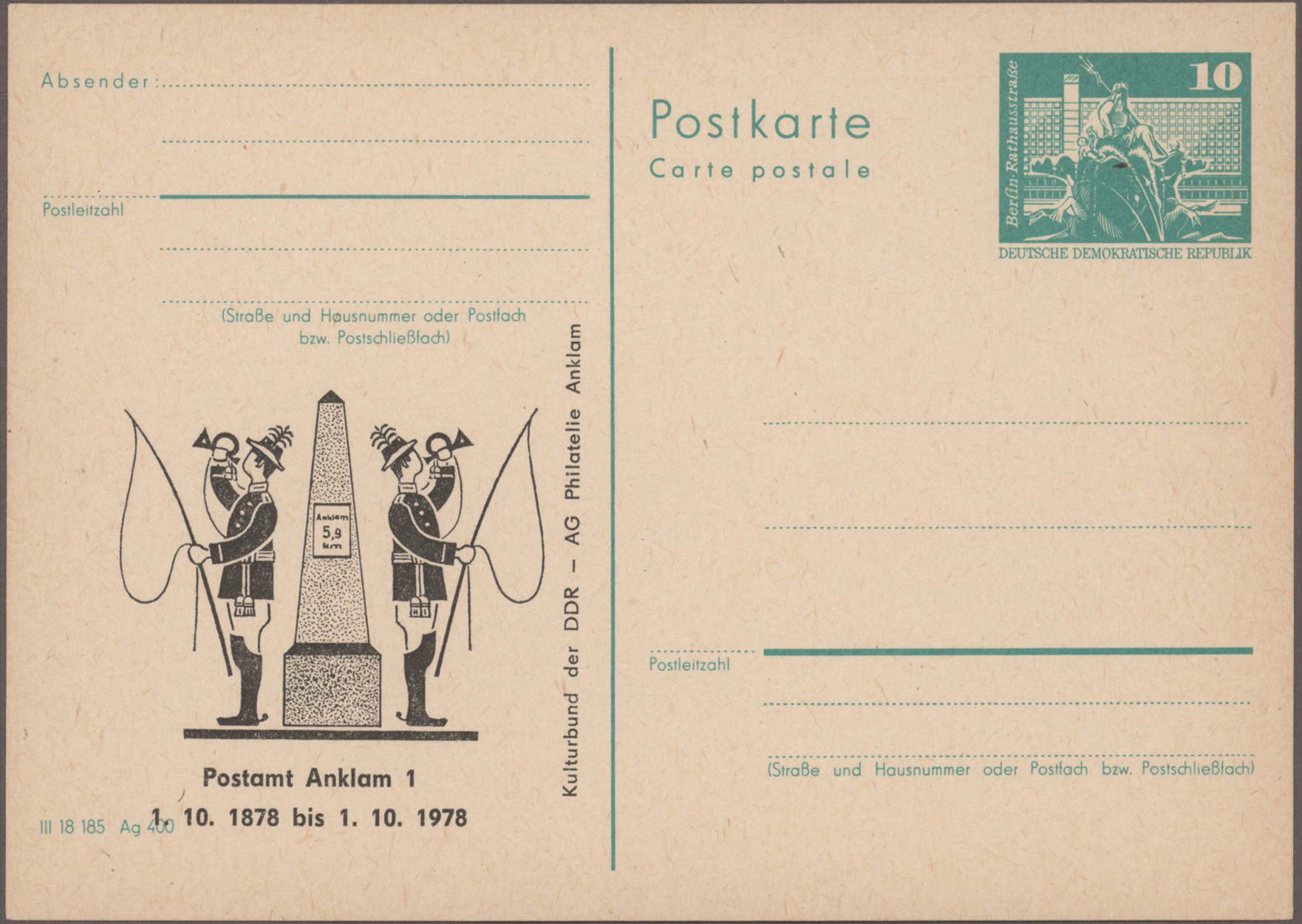 1952/1990, umfangreiche Sammlung von ca. 760 Privat-Ganzsachen (Karten und Umschläge), meist ungebraucht bzw. blanko gestempelt, dabei ca. 116 frühe Ganzsachen (meist Köpfe/Fünfjahrplan), ca. 209 Stück Ulbricht, ca. 247 Stück 10 Pfg. Große Bauwerke, ca. 59 Stück 25 Pfg. Große Bauwerke, ca. 88 Stück 10 Pfg. Kleine Bauwerke, alles in guter Vielfalt gesammelt, auch etliche Ansichtskarten-Ganzsachen, usw. Ein empfehlenswertes Objekt in durchweg sauberer Erhaltung!