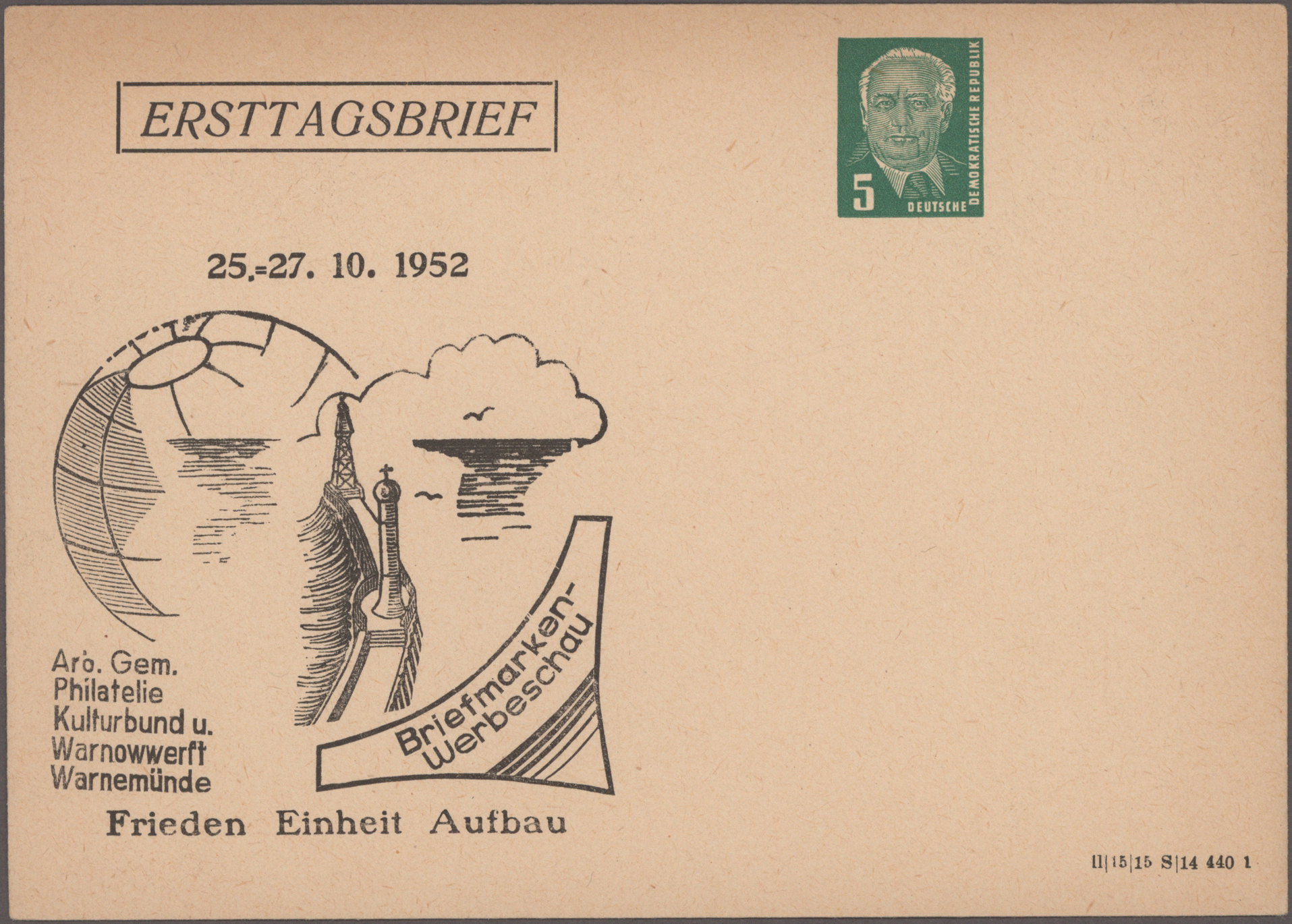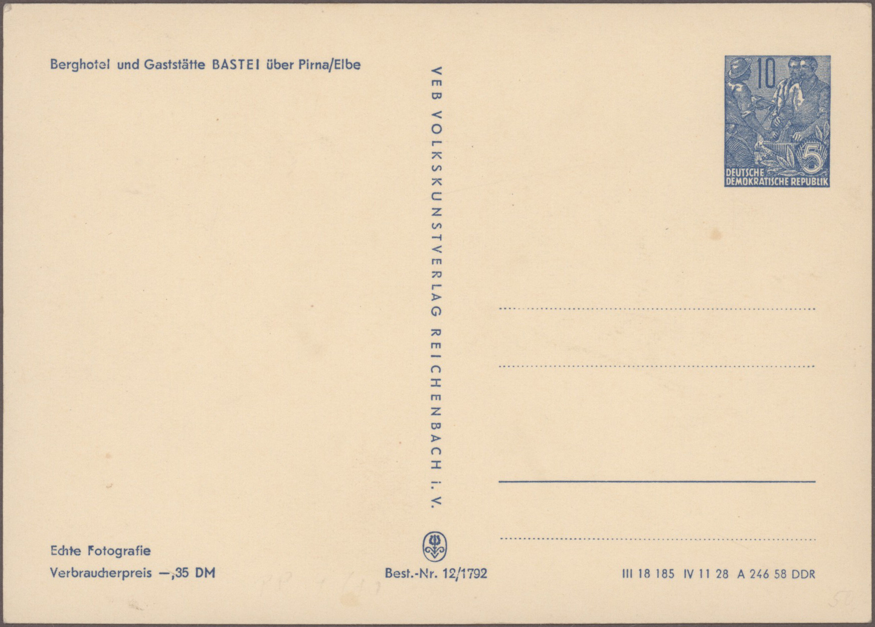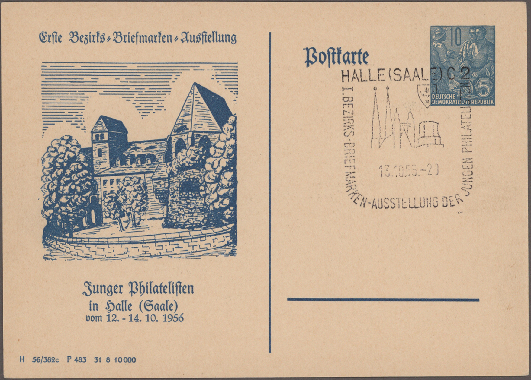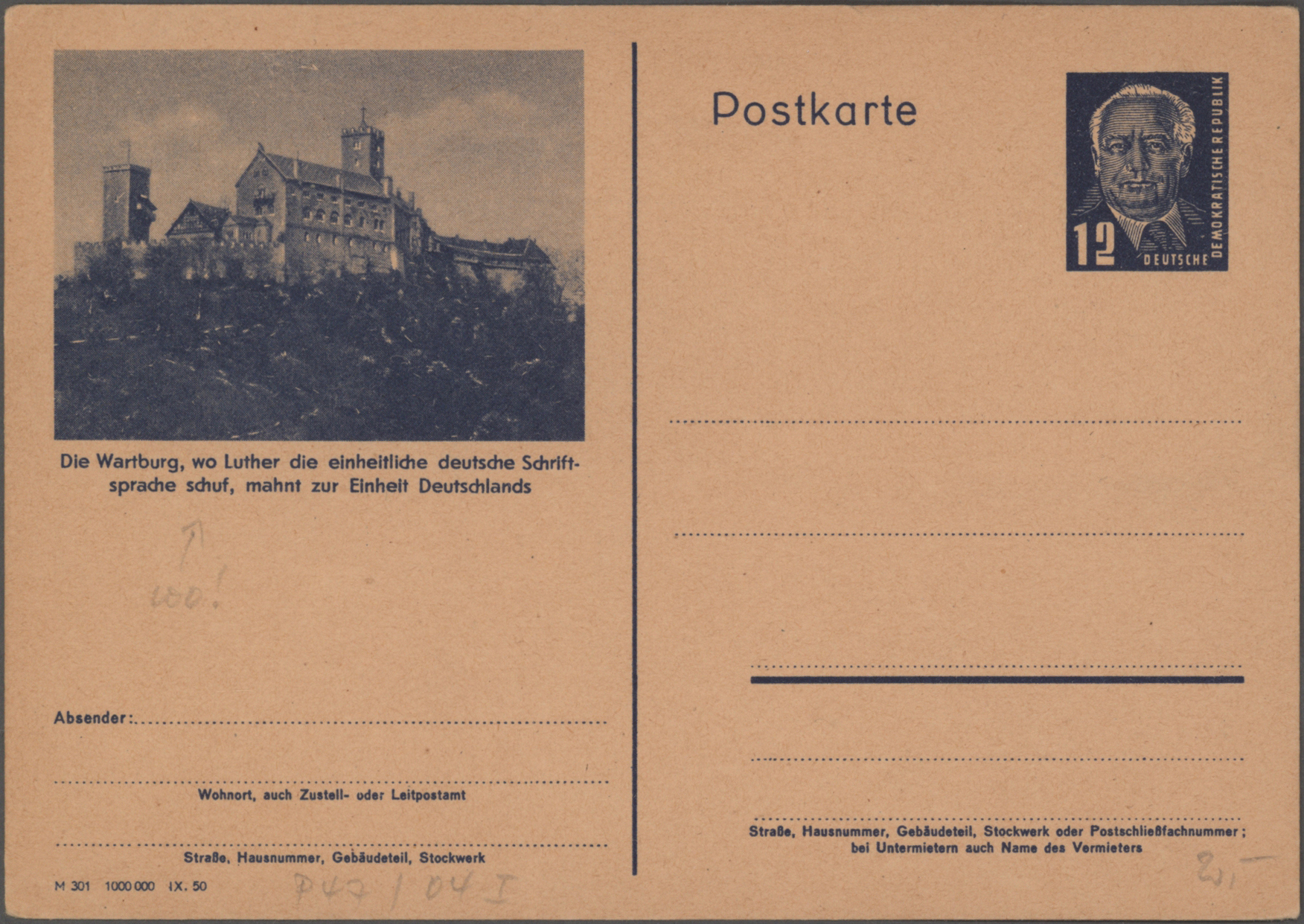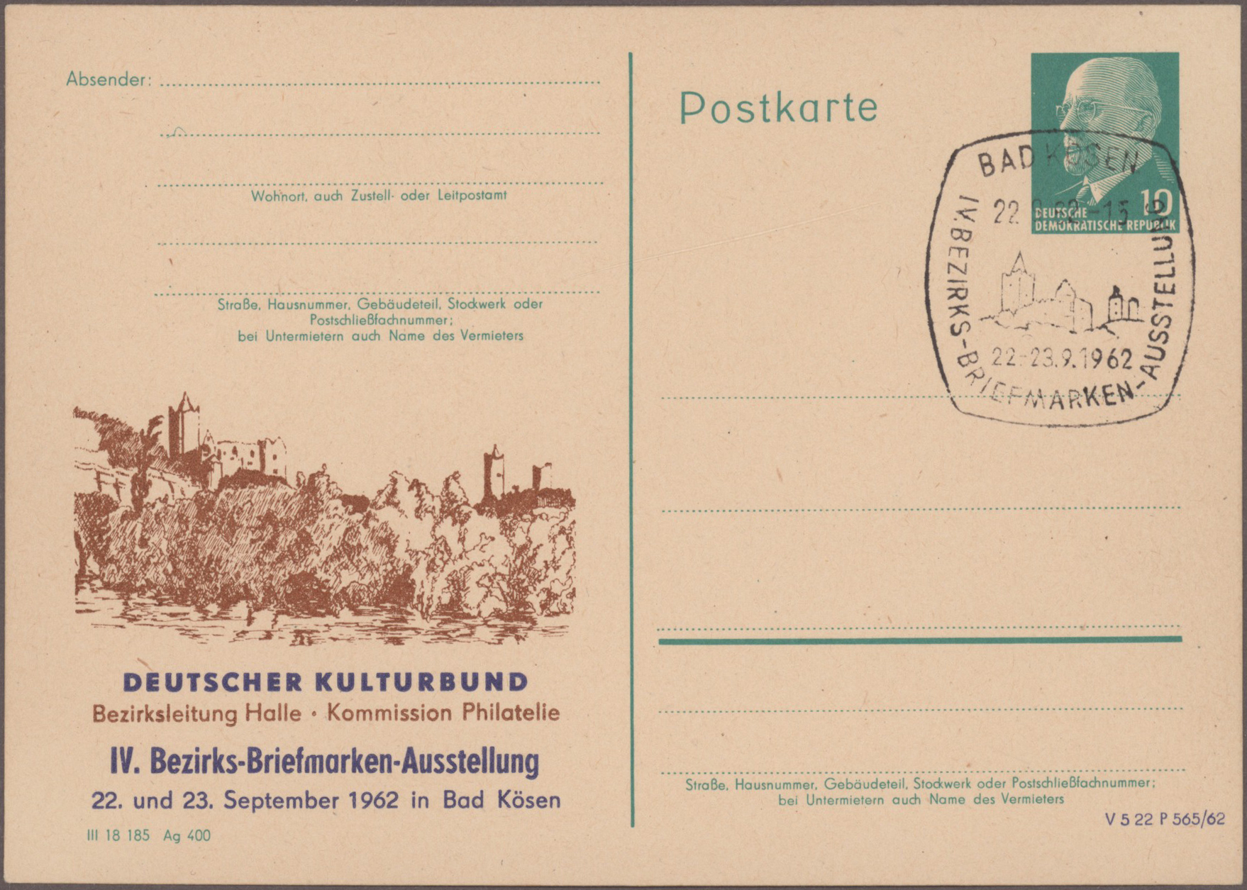 1952/1990, umfangreiche Sammlung von ca. 760 Privat-Ganzsachen (Karten und Umschläge), meist ungebraucht bzw. blanko gestempelt, dabei ca. 116 frühe Ganzsachen (meist Köpfe/Fünfjahrplan), ca. 209 Stück Ulbricht, ca. 247 Stück 10 Pfg. Große Bauwerke, ca. 59 Stück 25 Pfg. Große Bauwerke, ca. 88 Stück 10 Pfg. Kleine Bauwerke, alles in guter Vielfalt gesammelt, auch etliche Ansichtskarten-Ganzsachen, usw. Ein empfehlenswertes Objekt in durchweg sauberer Erhaltung!