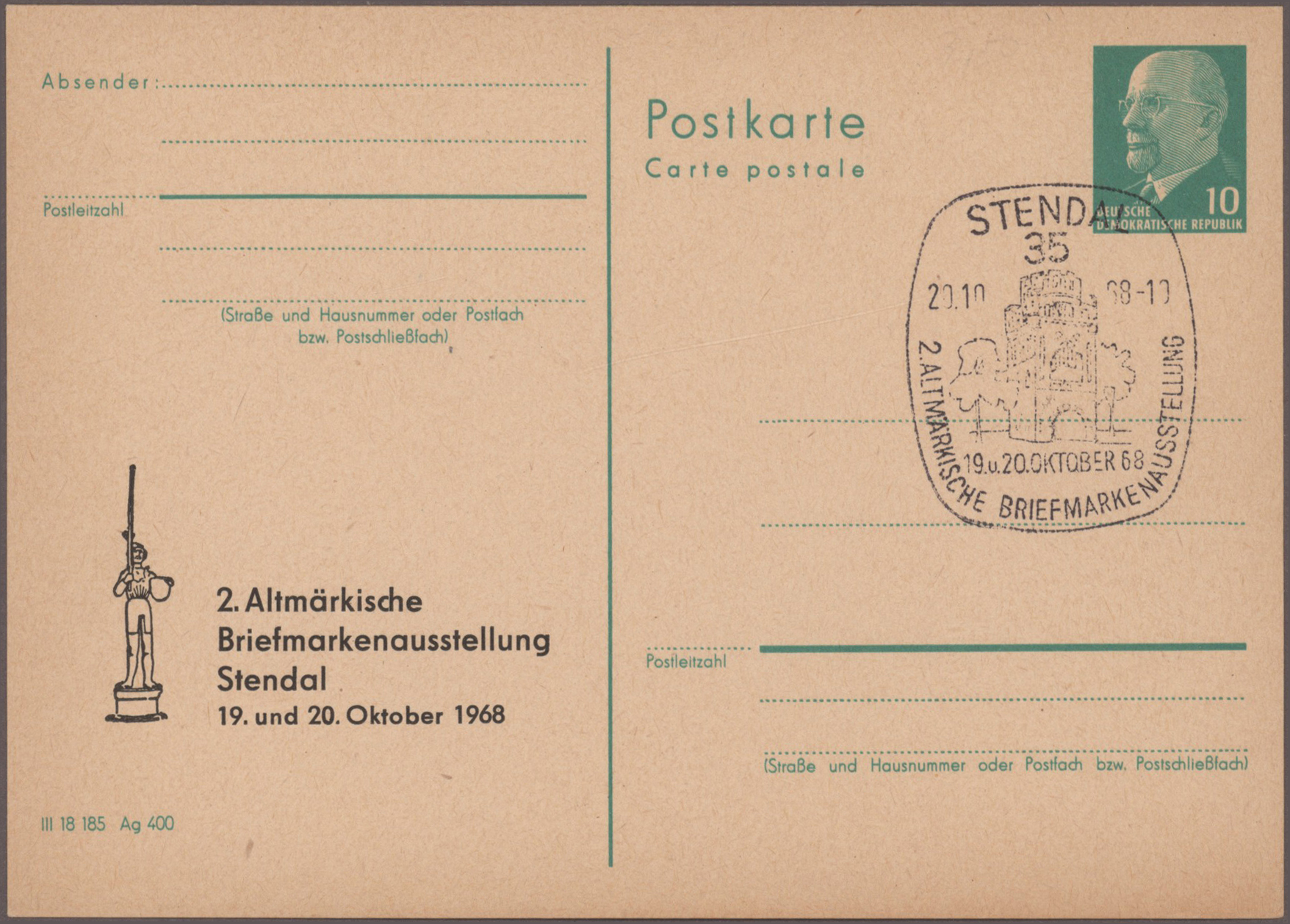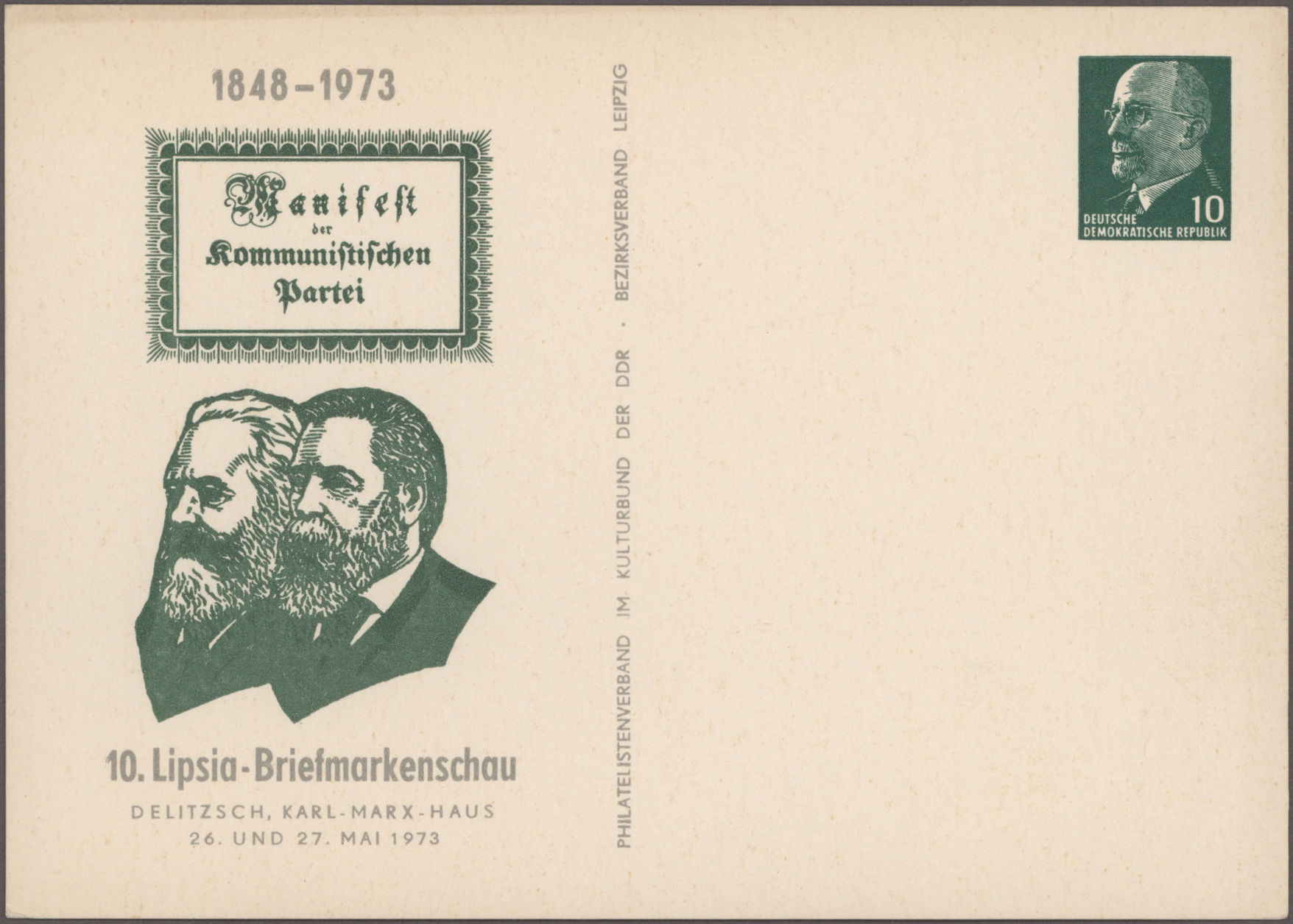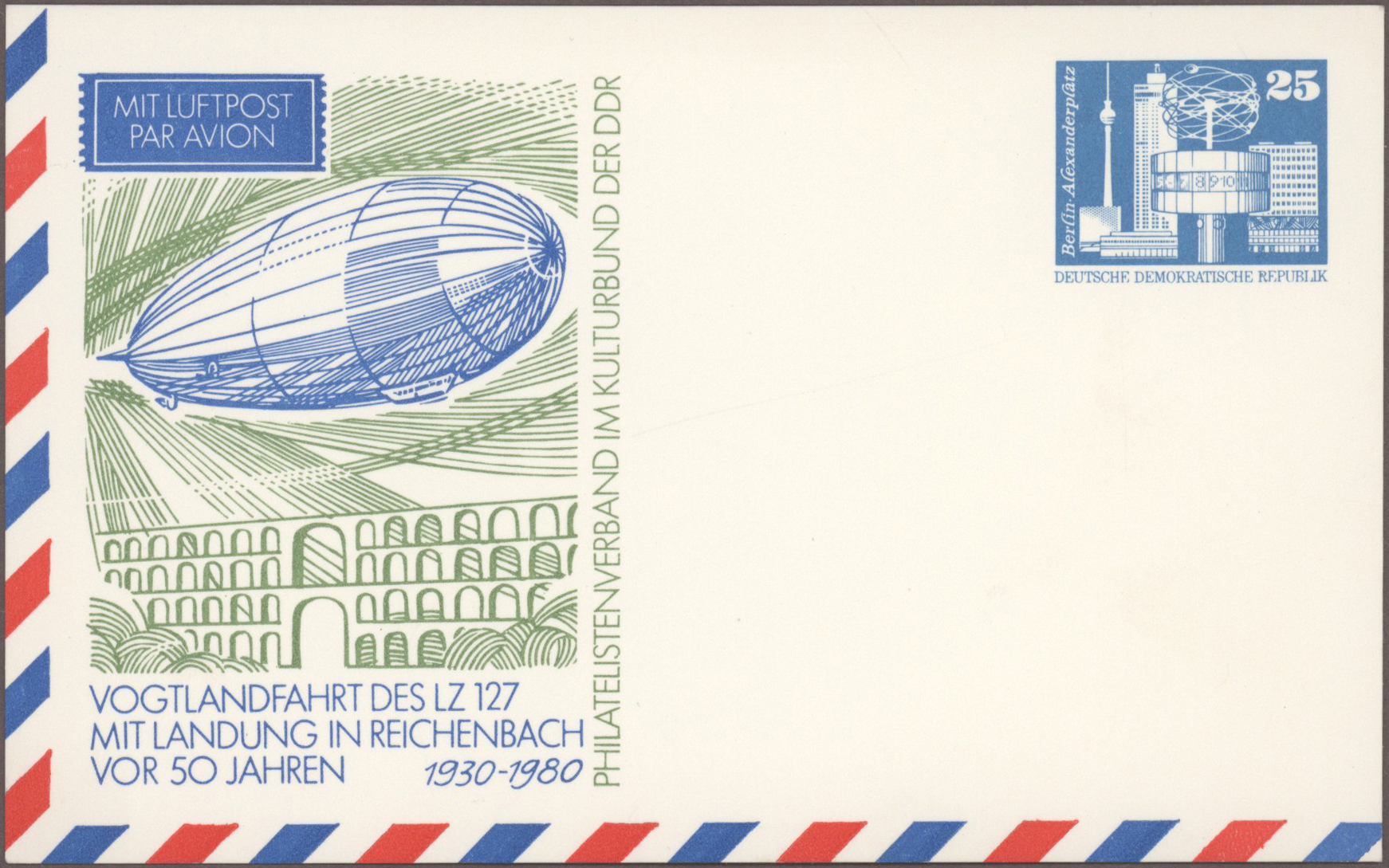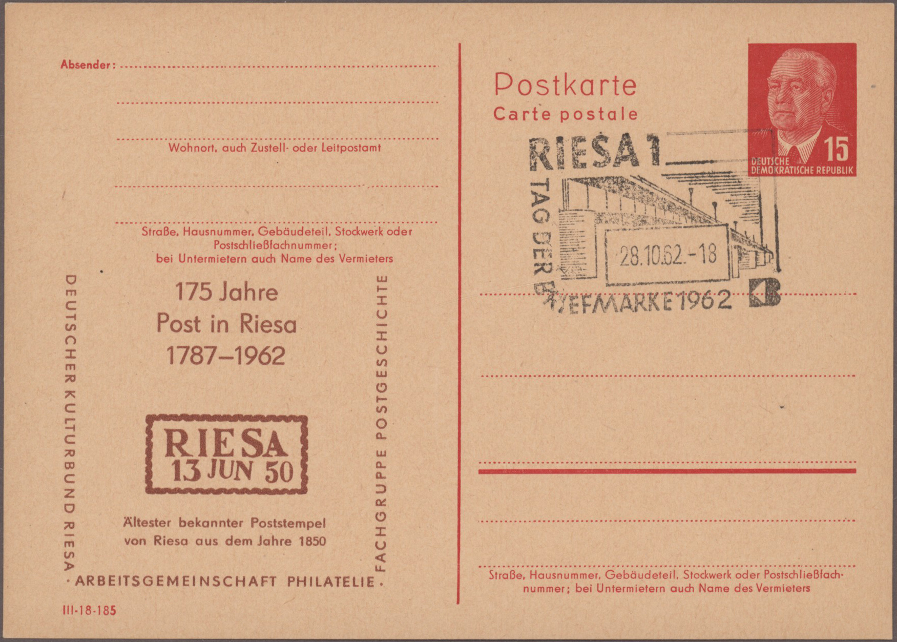 1952/1990, umfangreiche Sammlung von ca. 760 Privat-Ganzsachen (Karten und Umschläge), meist ungebraucht bzw. blanko gestempelt, dabei ca. 116 frühe Ganzsachen (meist Köpfe/Fünfjahrplan), ca. 209 Stück Ulbricht, ca. 247 Stück 10 Pfg. Große Bauwerke, ca. 59 Stück 25 Pfg. Große Bauwerke, ca. 88 Stück 10 Pfg. Kleine Bauwerke, alles in guter Vielfalt gesammelt, auch etliche Ansichtskarten-Ganzsachen, usw. Ein empfehlenswertes Objekt in durchweg sauberer Erhaltung!