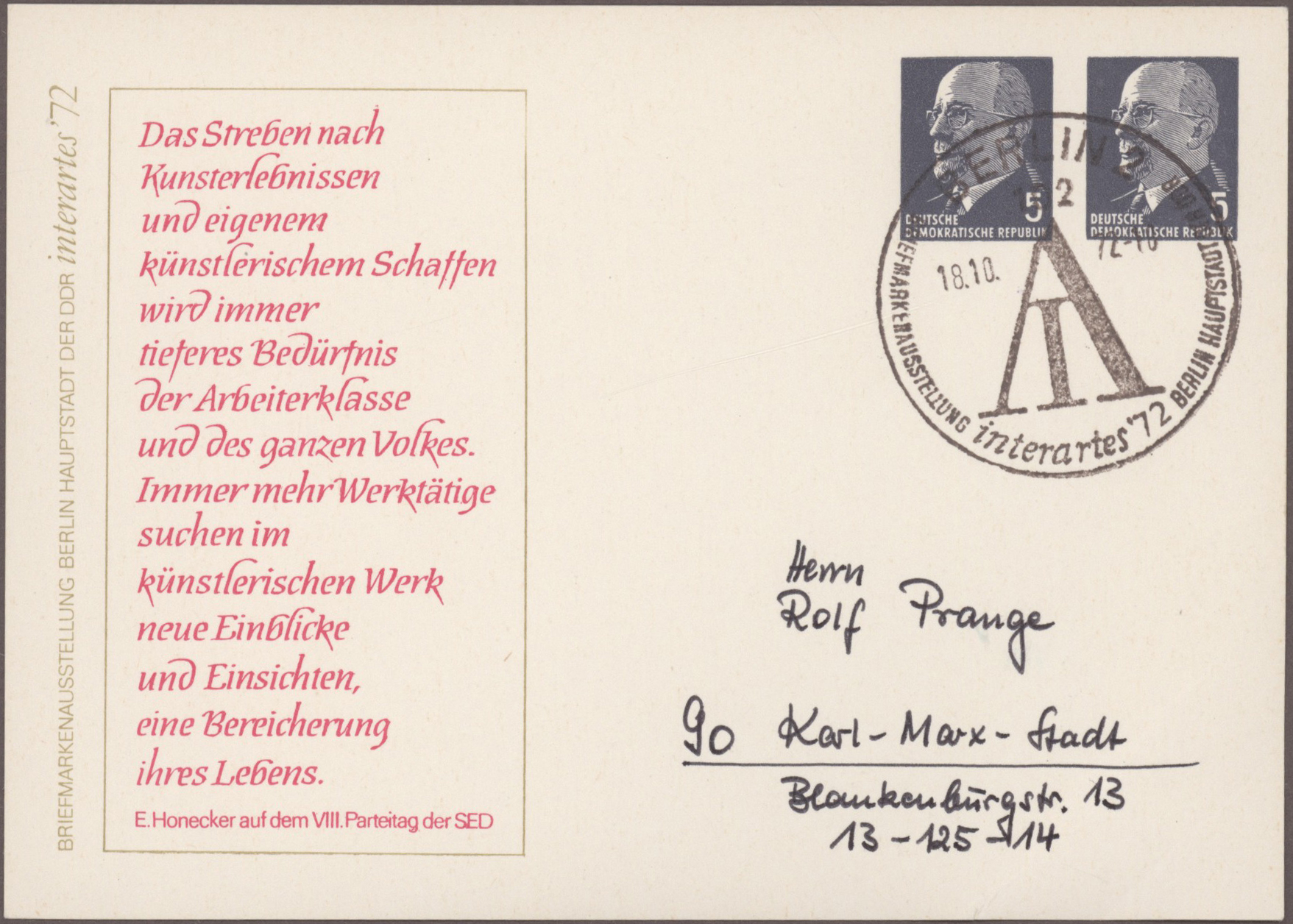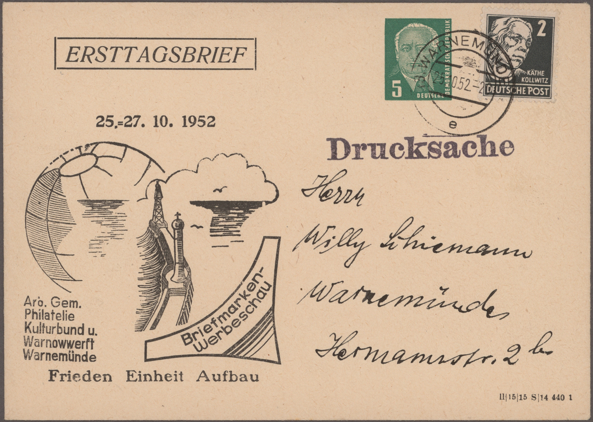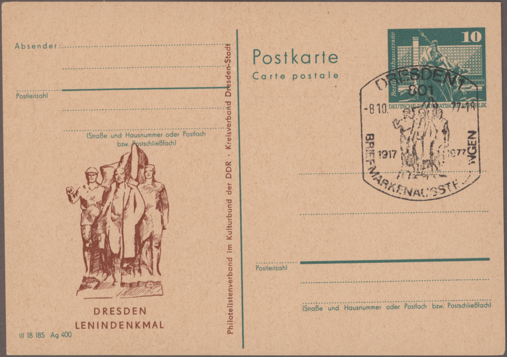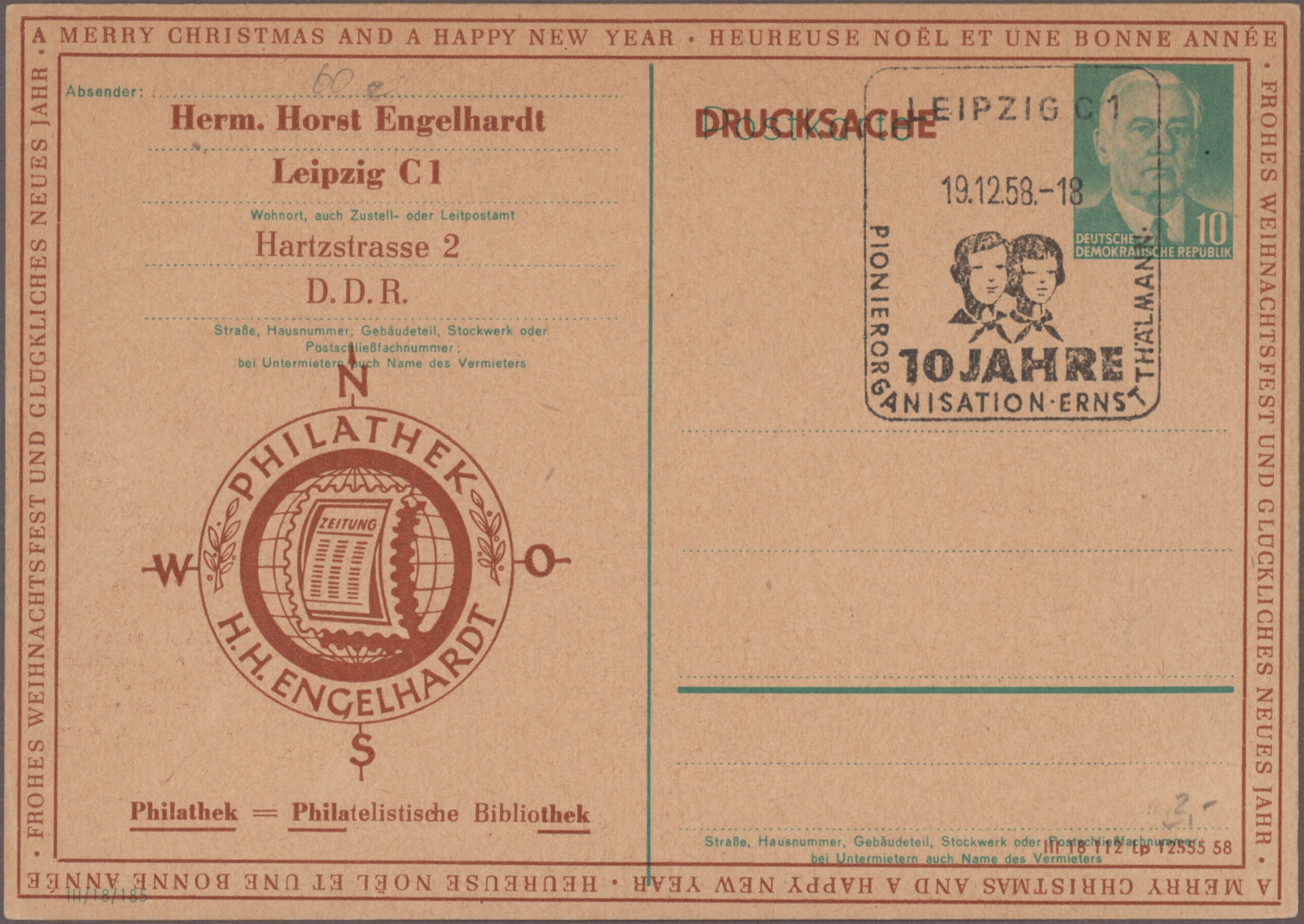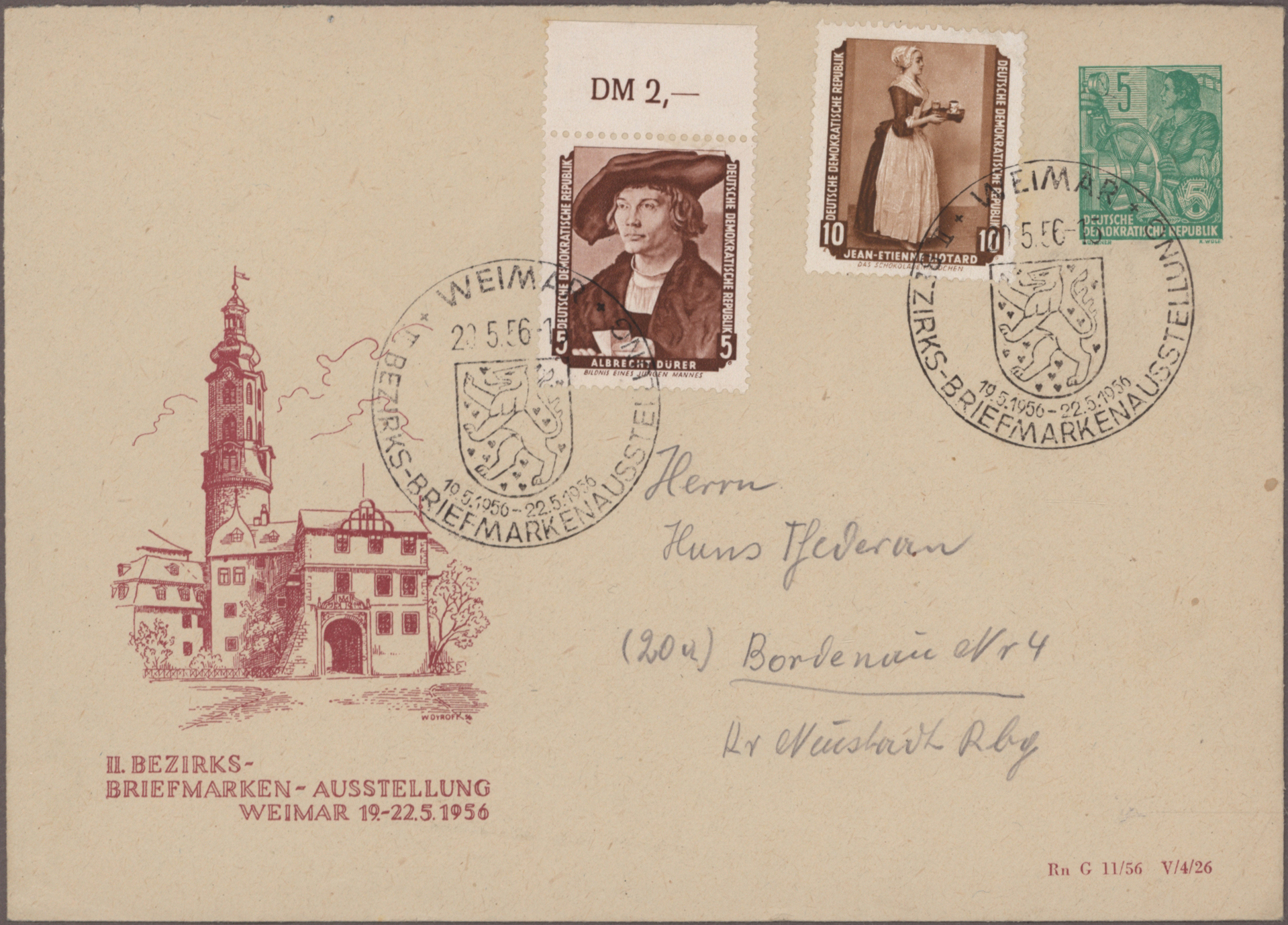 1952/1990, umfangreiche Sammlung von ca. 760 Privat-Ganzsachen (Karten und Umschläge), meist ungebraucht bzw. blanko gestempelt, dabei ca. 116 frühe Ganzsachen (meist Köpfe/Fünfjahrplan), ca. 209 Stück Ulbricht, ca. 247 Stück 10 Pfg. Große Bauwerke, ca. 59 Stück 25 Pfg. Große Bauwerke, ca. 88 Stück 10 Pfg. Kleine Bauwerke, alles in guter Vielfalt gesammelt, auch etliche Ansichtskarten-Ganzsachen, usw. Ein empfehlenswertes Objekt in durchweg sauberer Erhaltung!