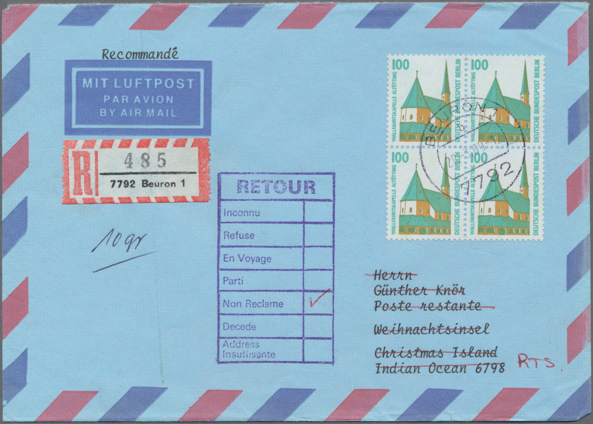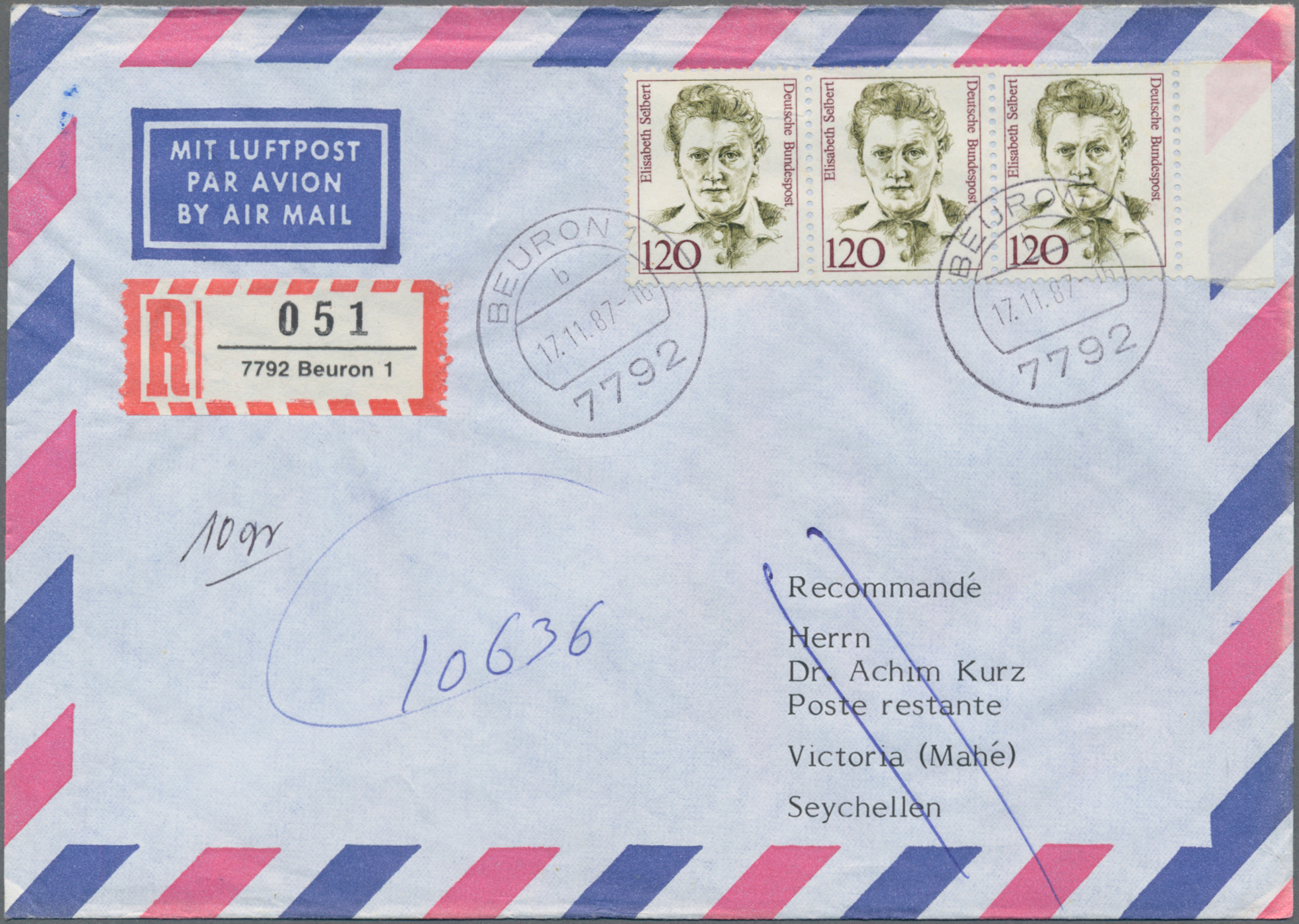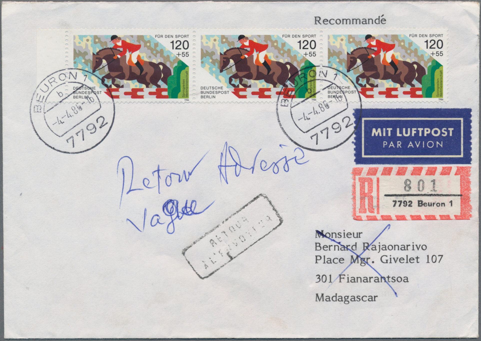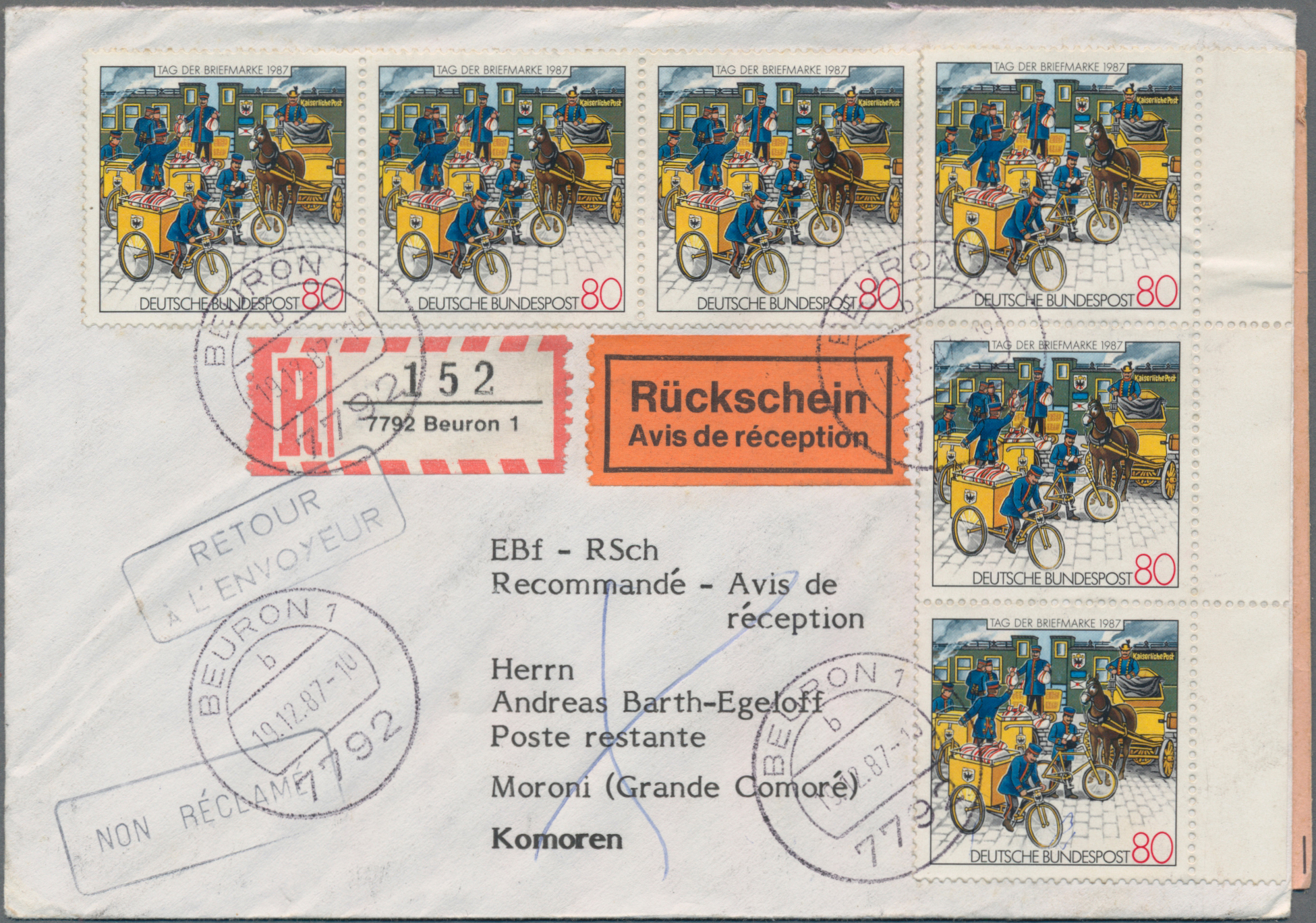 1986/1989, Post in den Indischen Ozean (Mauritius, Seychellen, Malediven, Komoren, etc.), Partie von zwölf R-Briefen, meist per Luftpost, teils Rückschein, dabei interessante Mehrfachfrankaturen, alle retour mit entsprechenden Behandlungsvermerken.