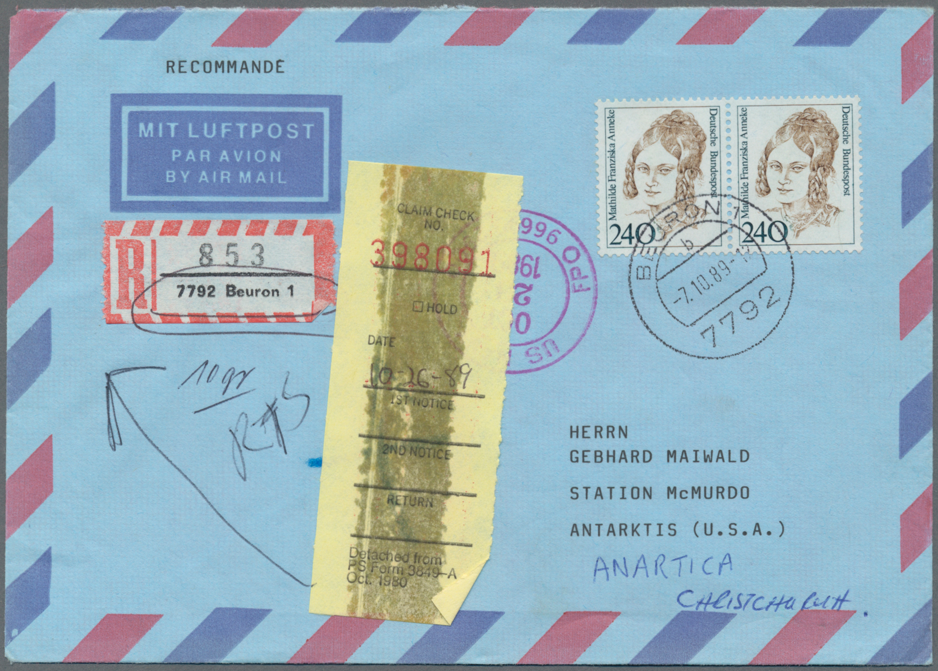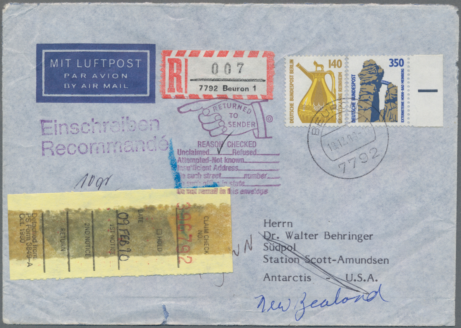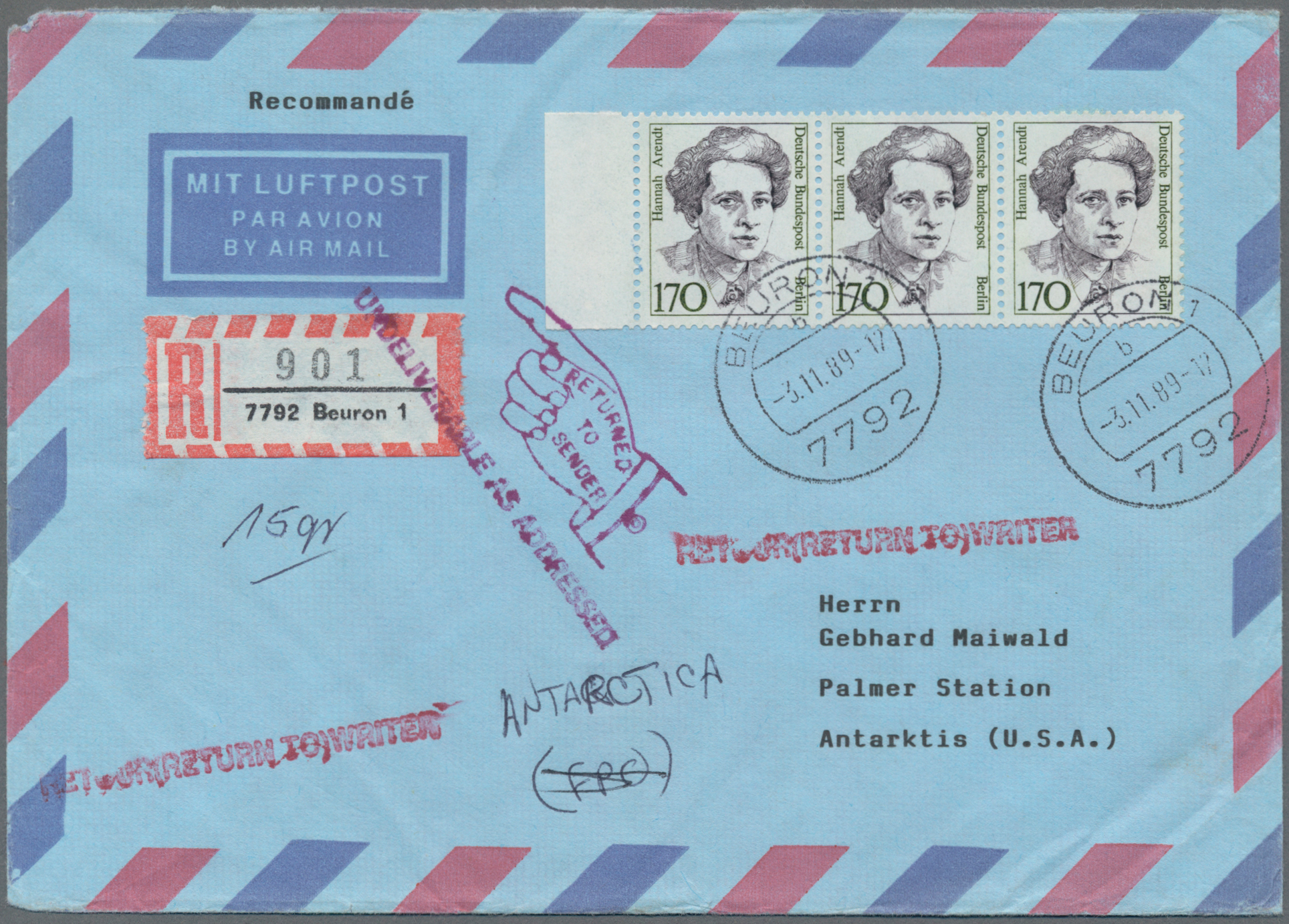 1987/1989, Post in die Antarktis/Falkland/Tristan da Chuna, Partie von 20 R-Briefen, bis auf einen alle per Luftpost, teils Rückschein, dabei interessante Mehrfachfrankaturen, alle retour mit entsprechenden Behandlungsvermerken.
